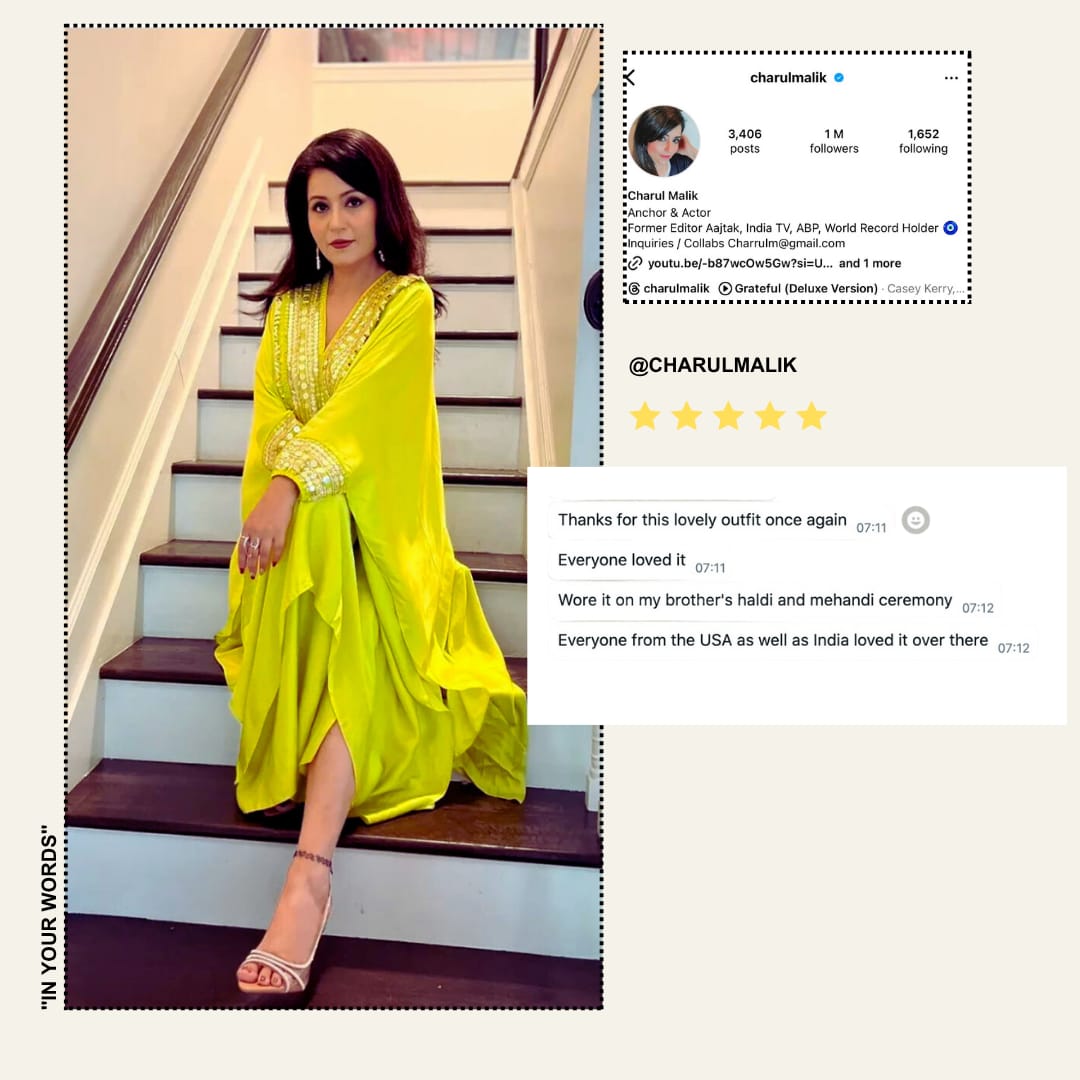 Thank you, Prahnaaya, for this stunning outfit that added so much grace and elegance to my special occasion. Your craftsmanship and attention to detail are truly remarkable. I felt comfortable wearing this. Grateful for your artistry.Loved it❤️❤️❤️❤️