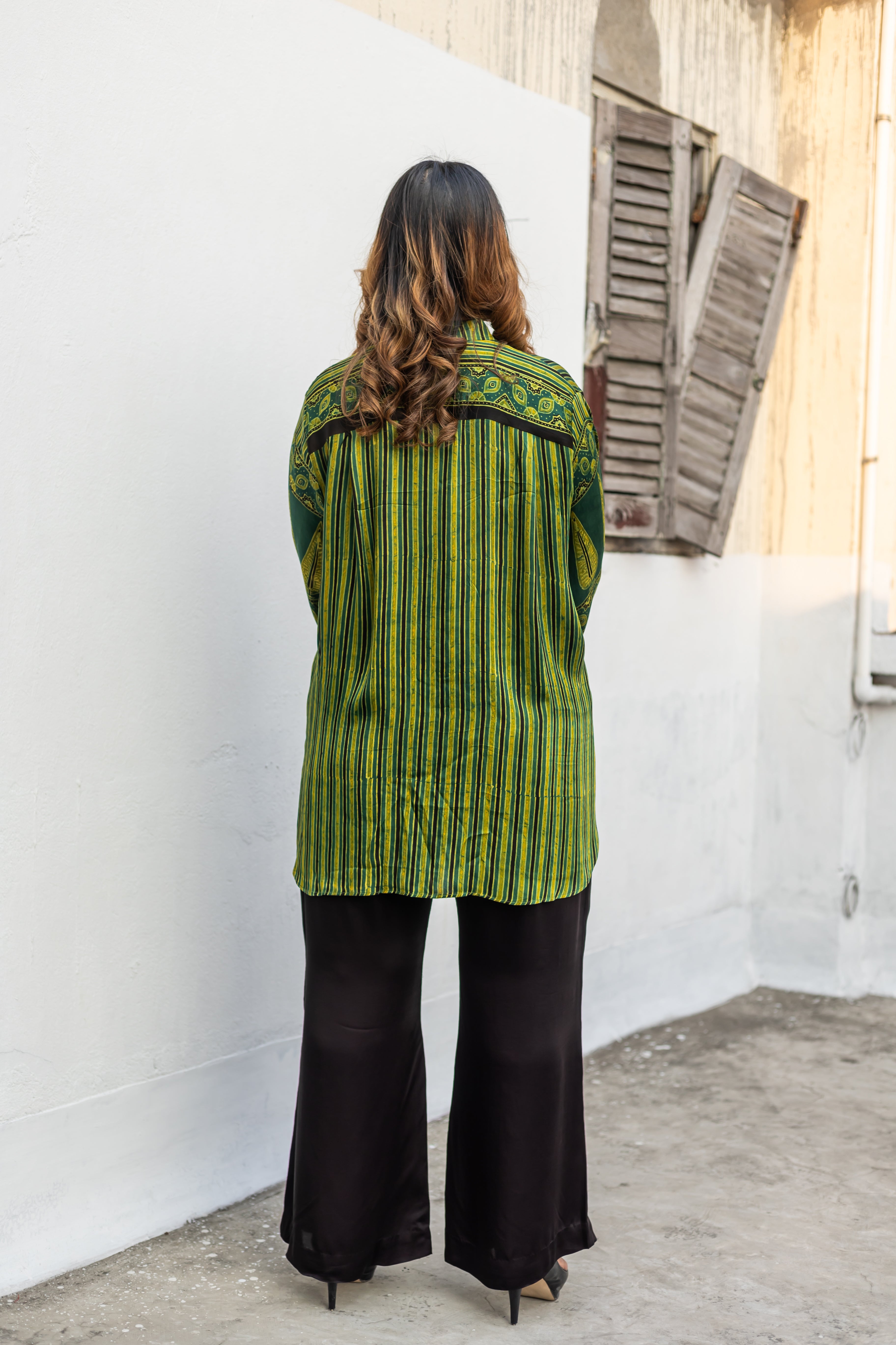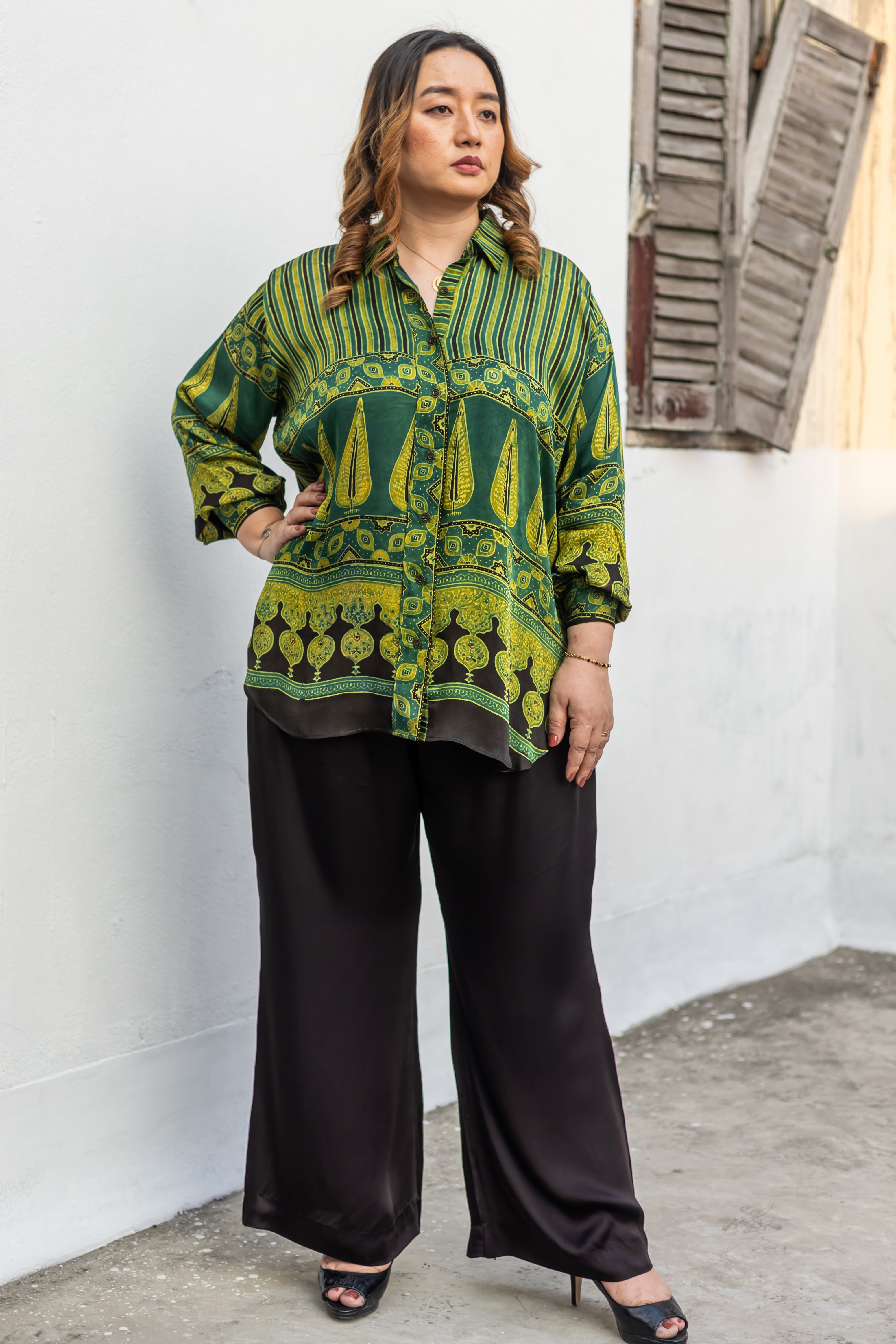 Organic Green ajrakh handblock printed satin hi-low shirt ,featuring distinctive prints on the front and back. Model height is 5'5"" and is wearing a size L-XL