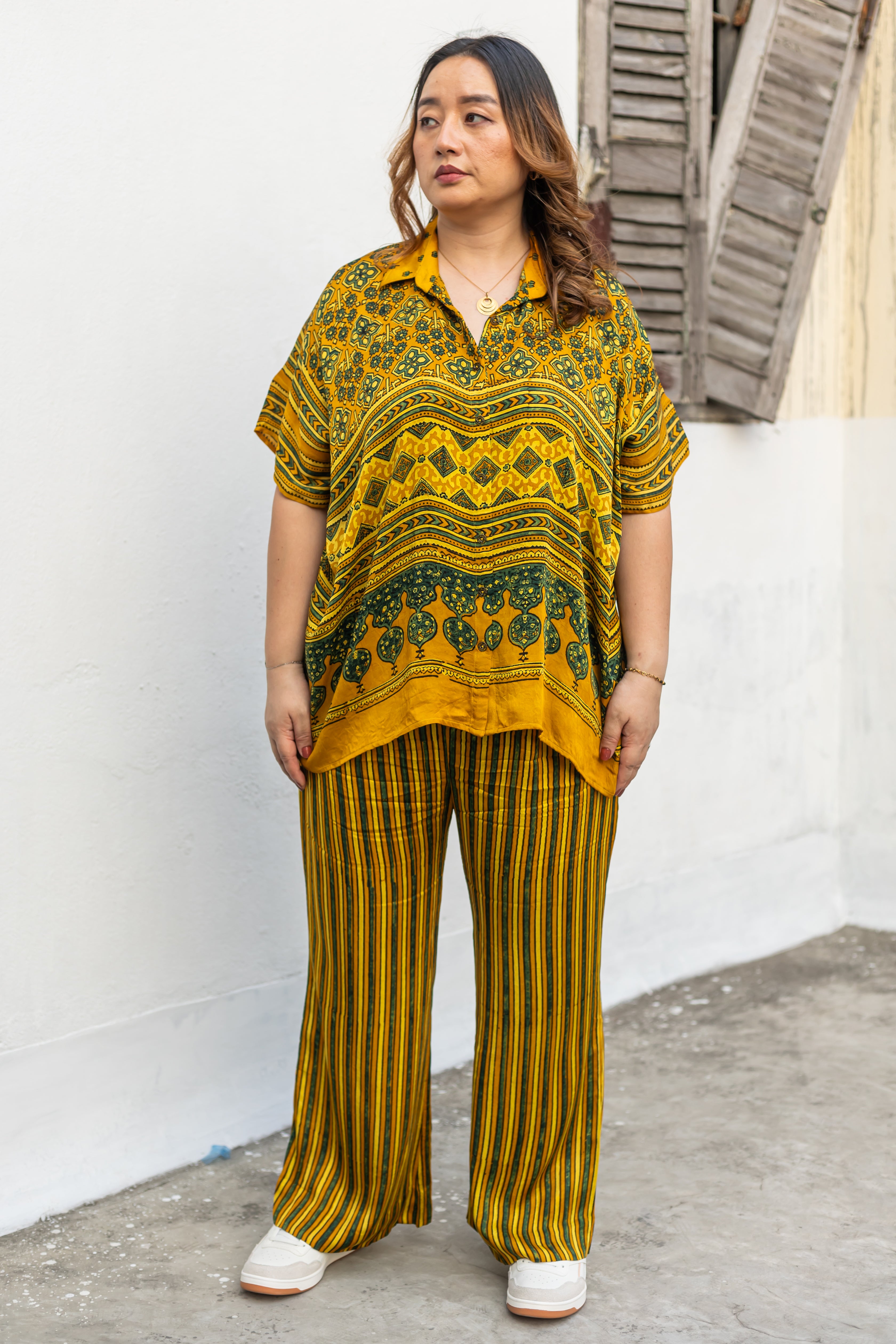 Mustard Yellow ajrakh hand block printed satin antifit shirt in mocha colour, featuring distinctive prints on the front and back. Model height is 5'5"" and is wearing a size L-XL