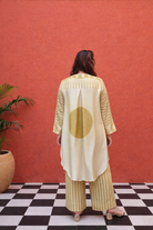 A coordinated soft mustard ajrakh handblock printed satin hi-low shirt with ajrakh stripes pants in relaxed fit Model height is 5'5"" and is wearing a size L-X