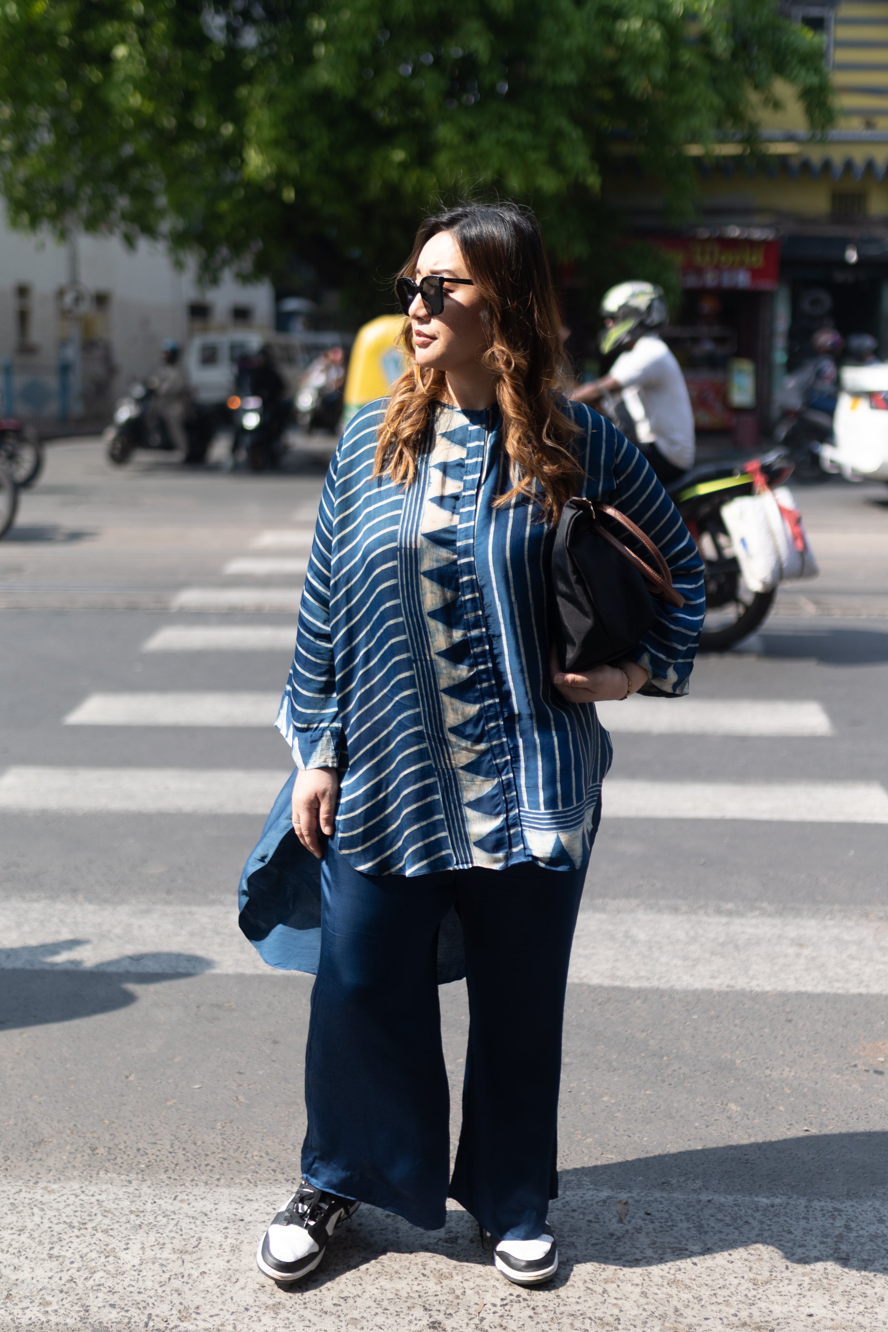 Blue striped long tunic with straight pants set