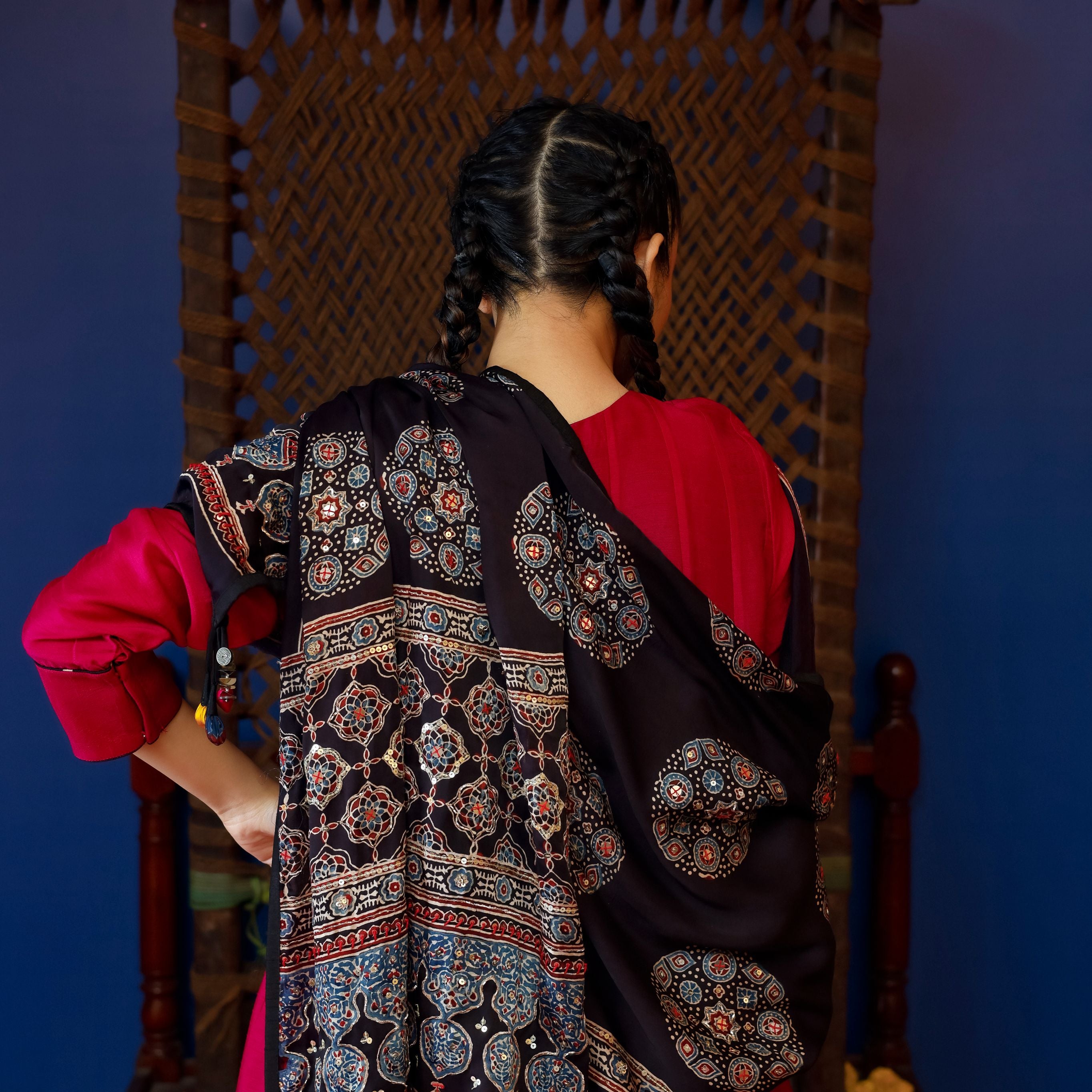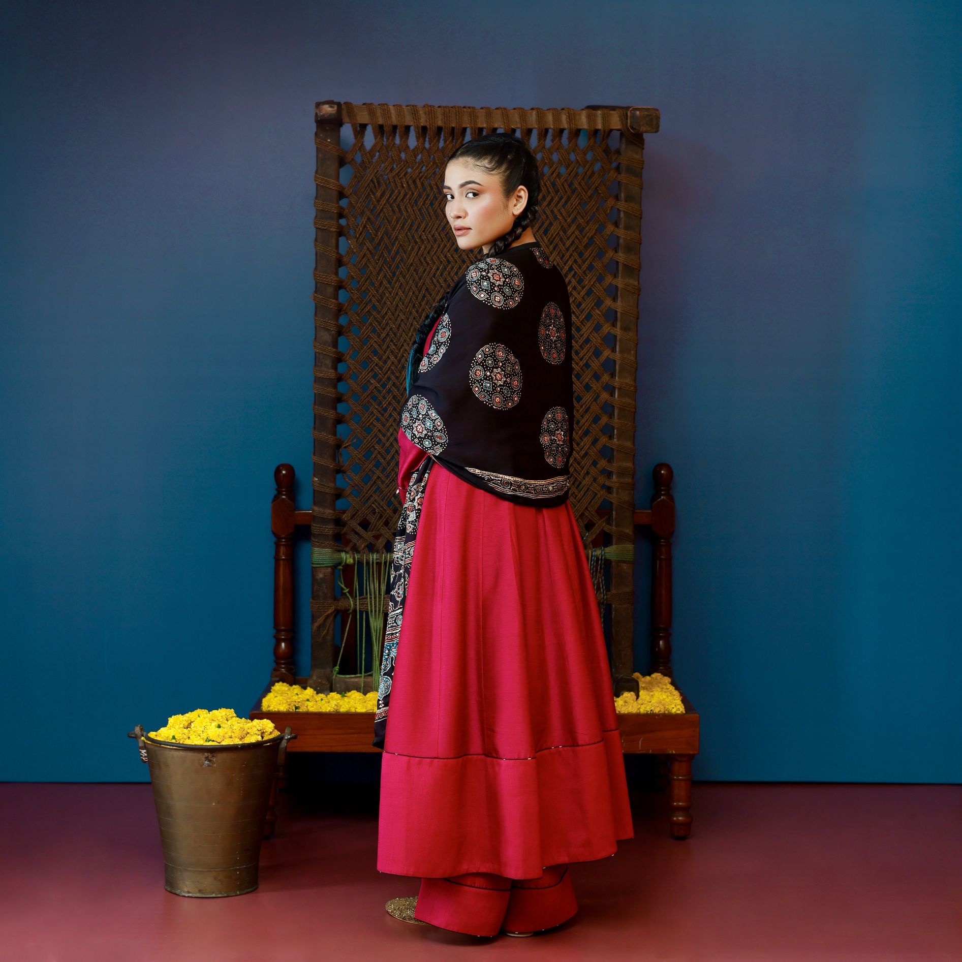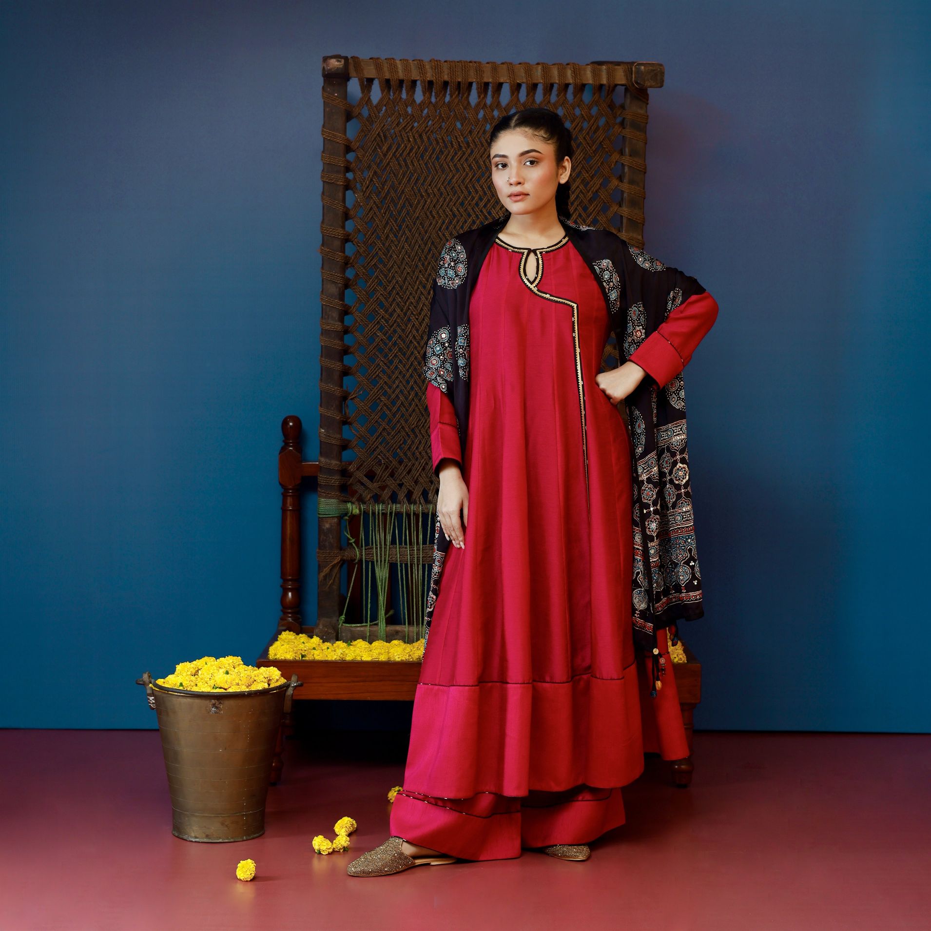 This pink long kali overlap style kurta set is paired with wide palazzo pants, offering a formal yet stylish look. The set is completed with hand embroidered Ajrakh dupatta,perfect for formal occasions or pre-wedding wear, this ensemble blends traditional detailing with modern design.
