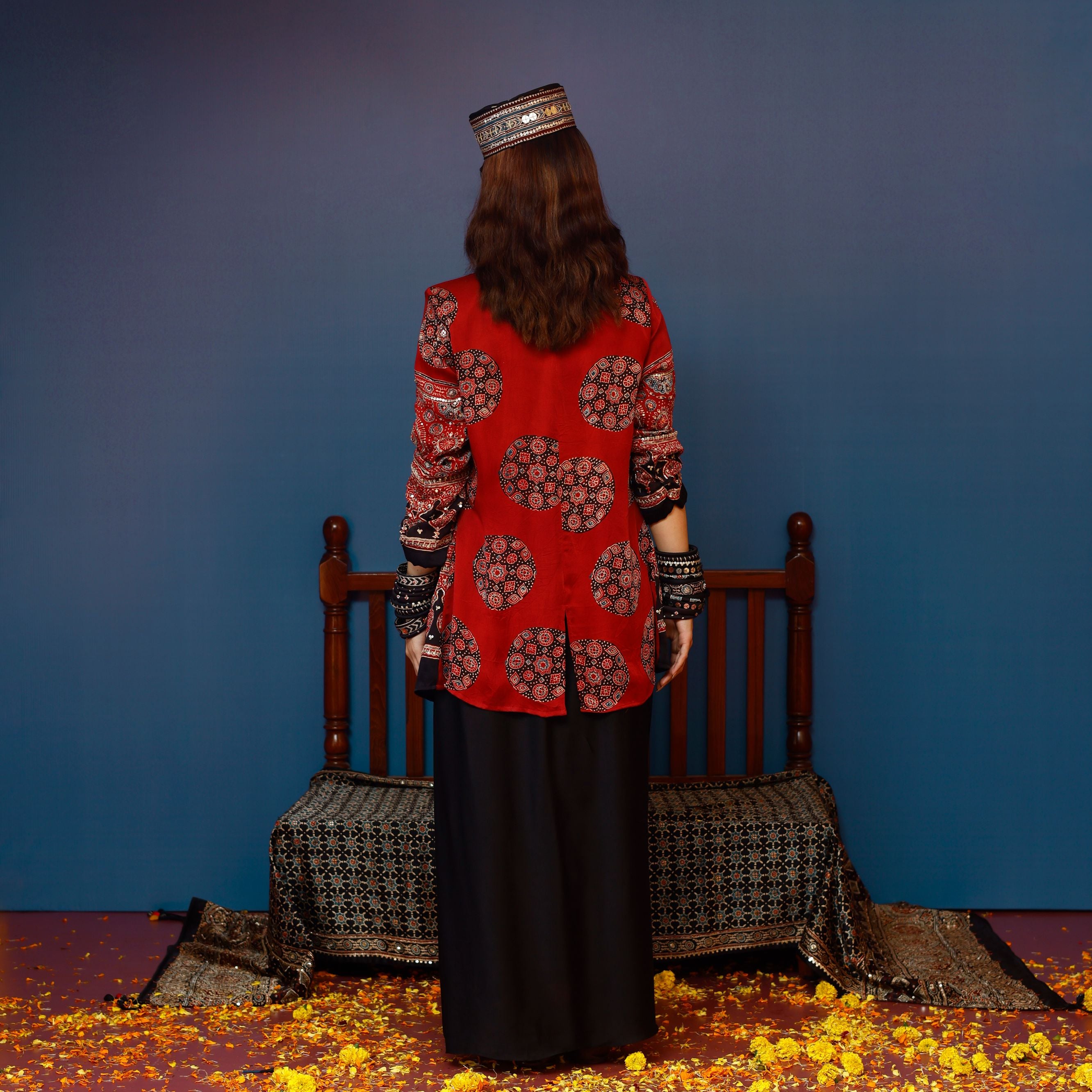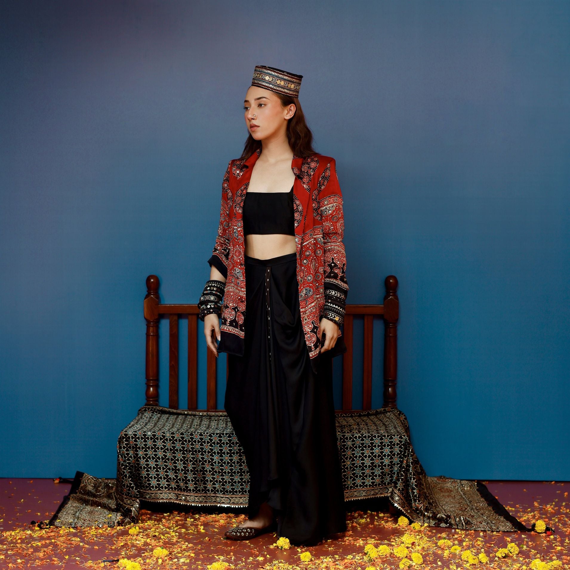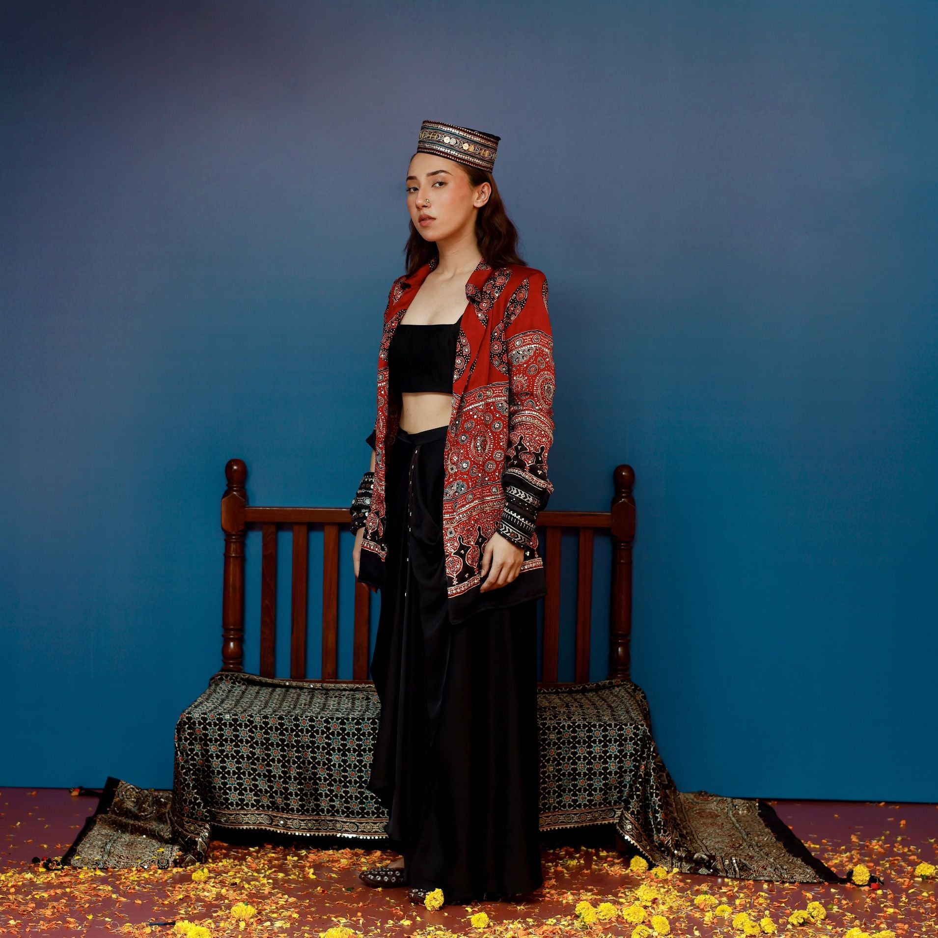 This exquisite Ajrakh hand-embroidered jacket in red is paired with a satin blouse and skirt, offering a perfect fusion of traditional and contemporary styles. The intricate Ajrakh embroidery adds a unique touch to the elegant satin pieces, making it ideal for all your Indo-western style needs