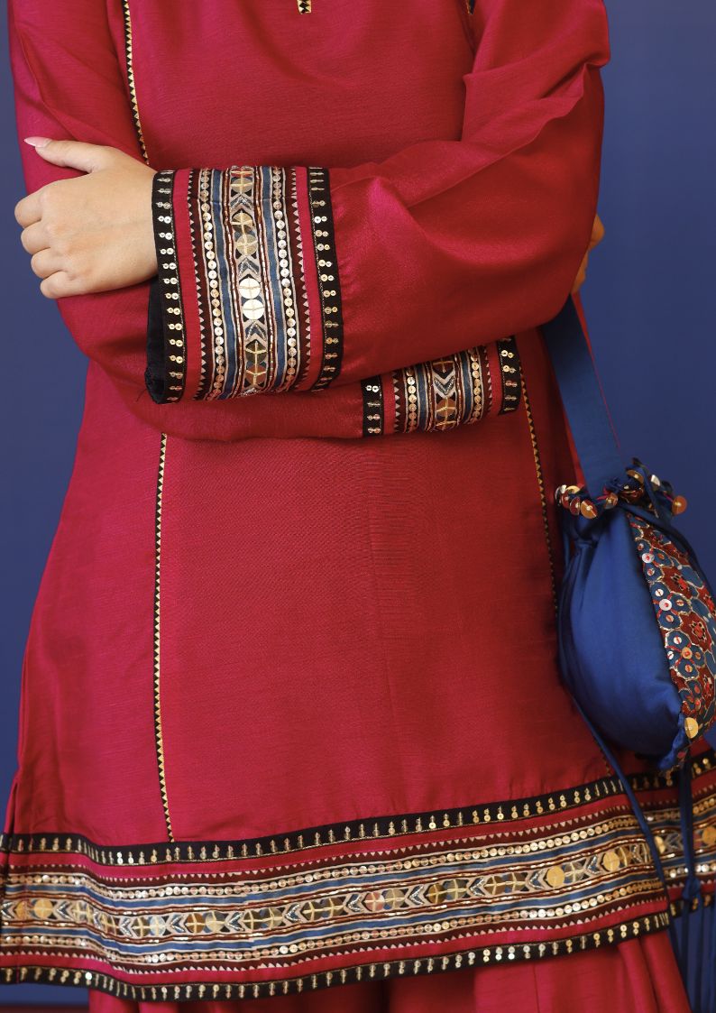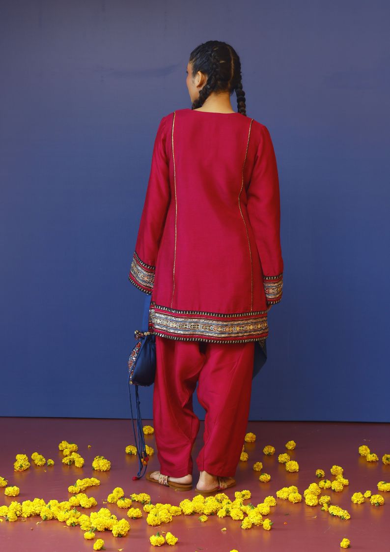 This pink wide-panel kurti set is paired with a Farsi Pakistani salwar, creating a graceful and traditional silhouette. Featuring an Ajrakh hand-embroidered border, this ensemble is perfect for pre-wedding & festive occasions.