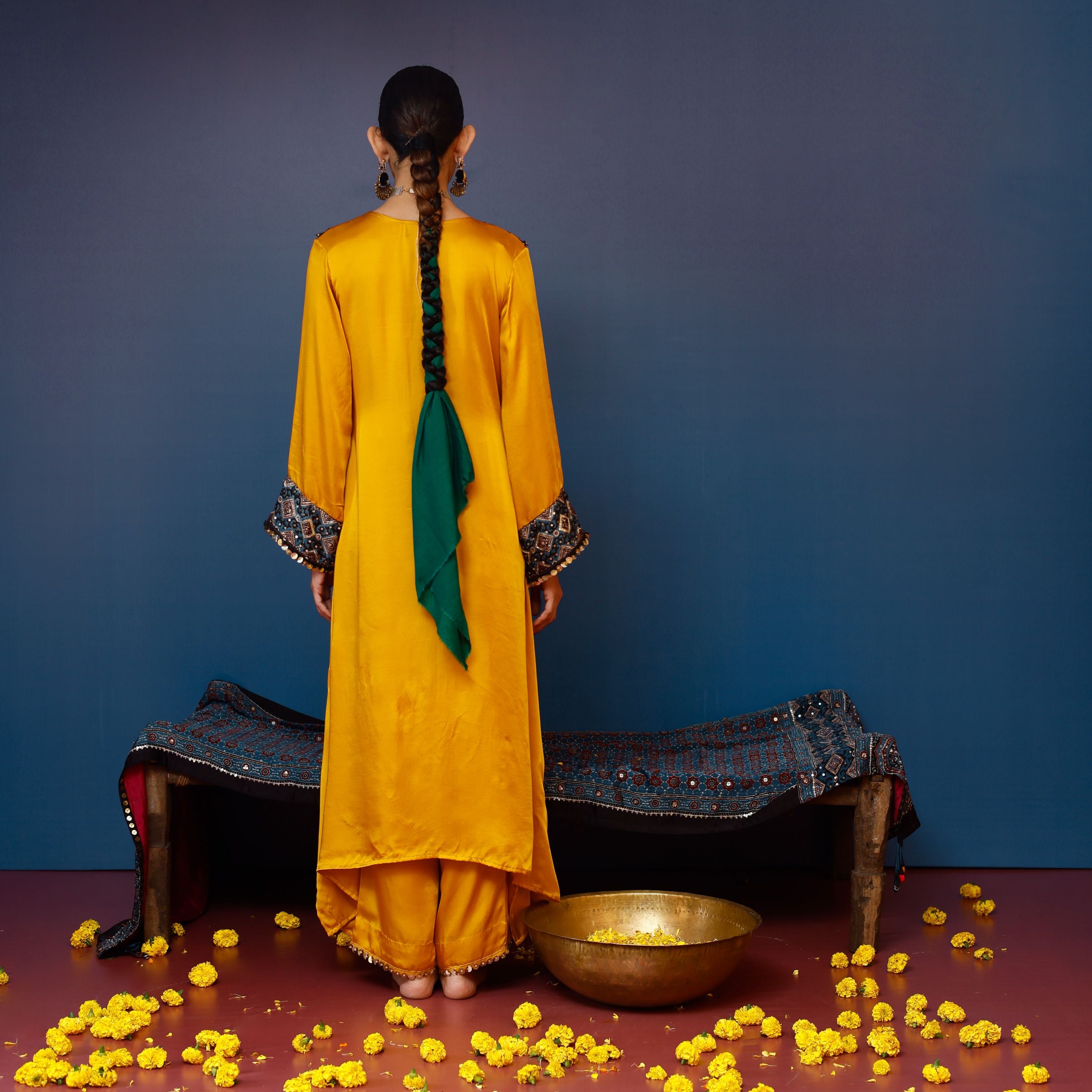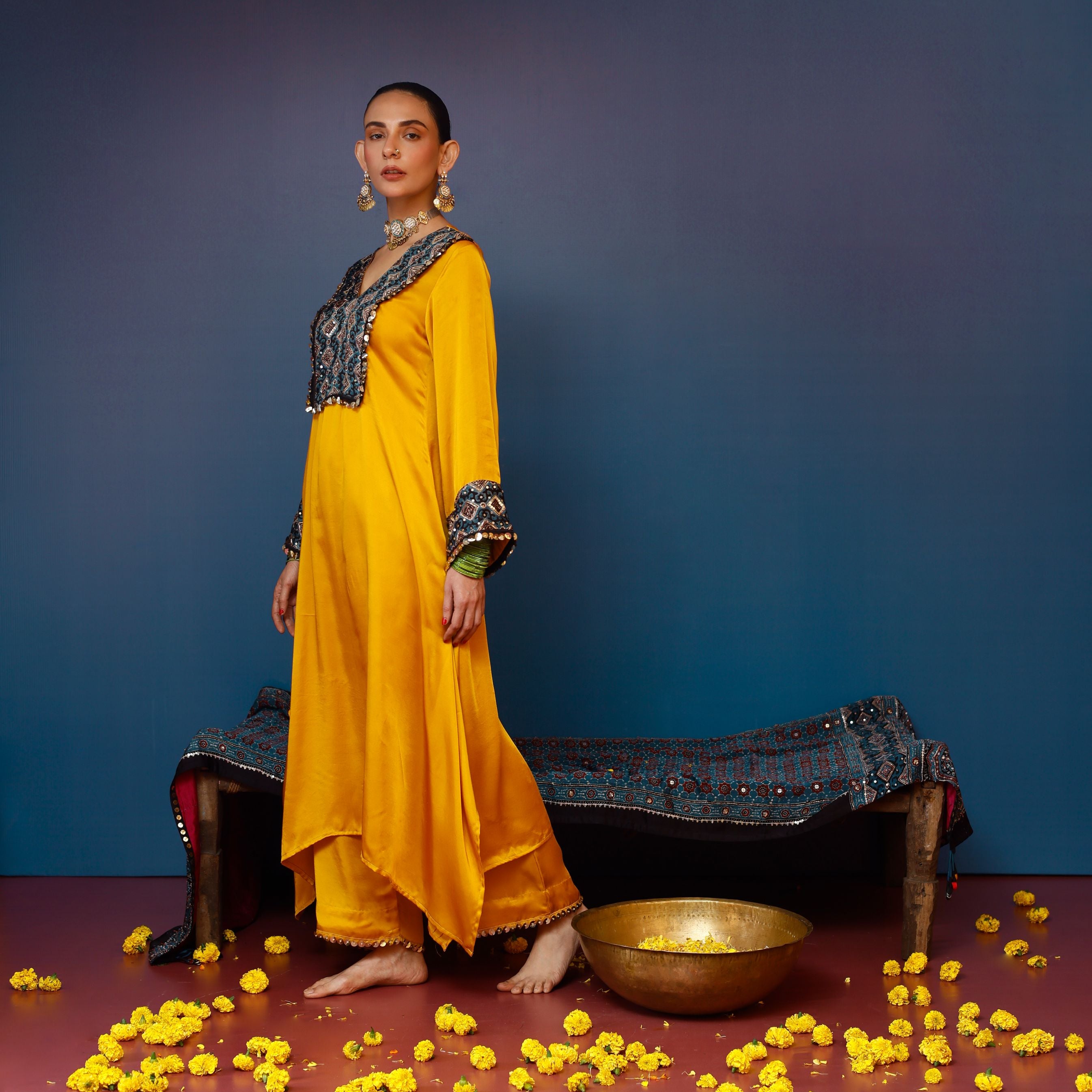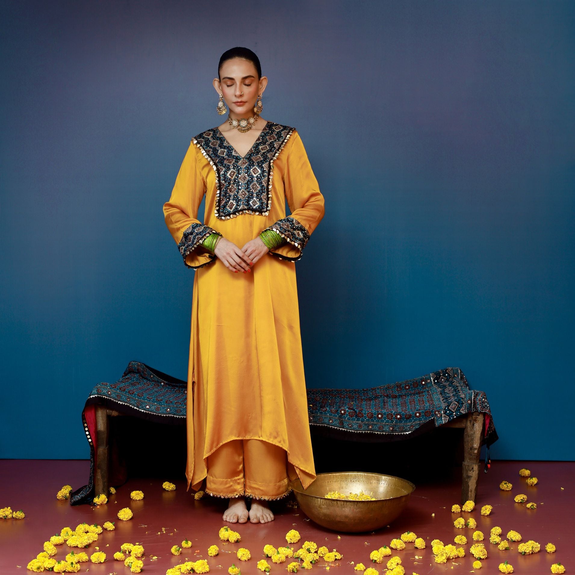 This mustard relaxed kurta set, paired with matching pants, is elevated with intricate Ajrakh hand-embroidered applique on the yoke and sleeves. The effortless design combines comfort with traditional craftsmanship, making it perfect for casual yet elegant wear