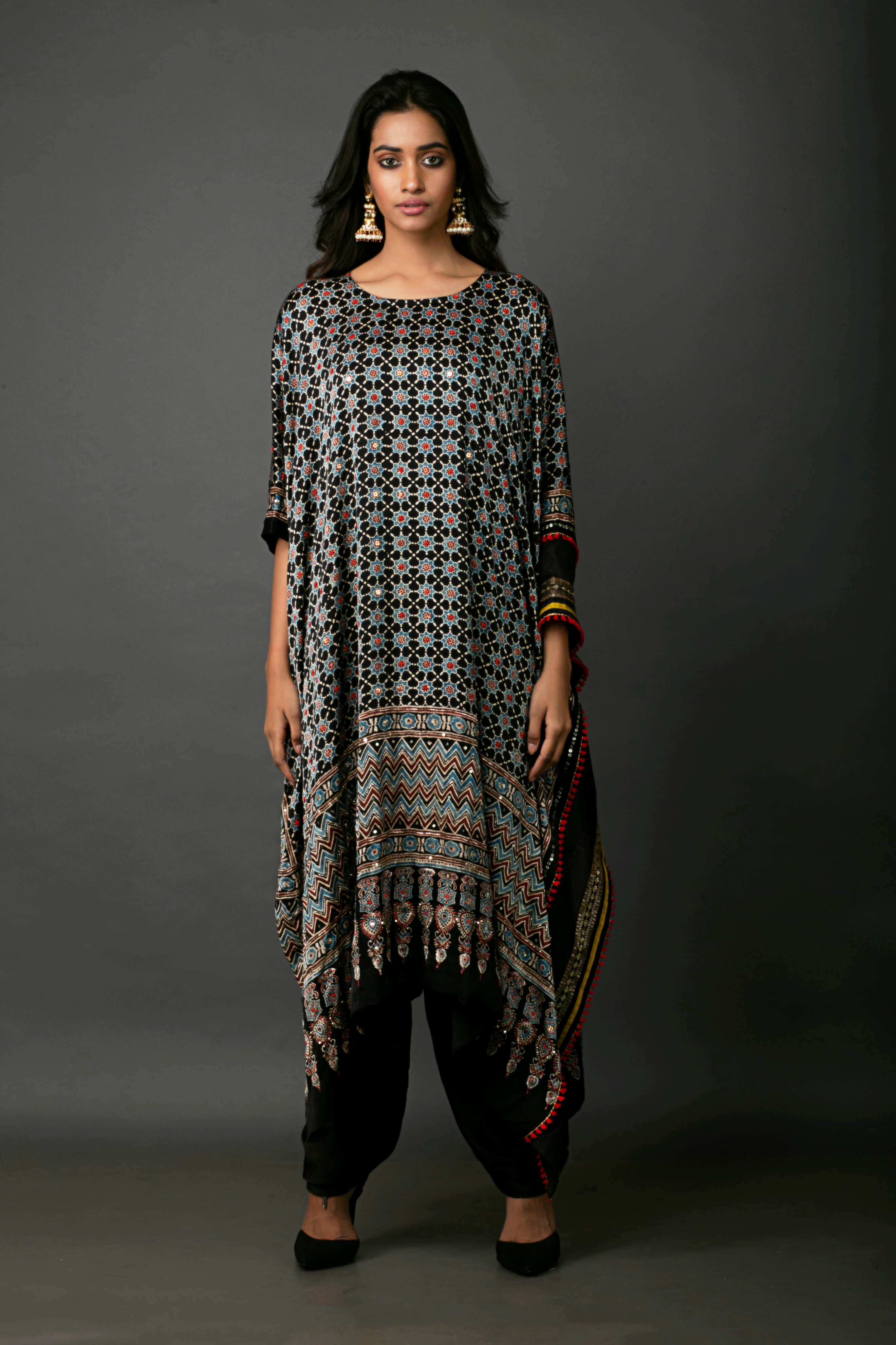Experience the perfect blend of tradition and comfort with our embroidered satin kaftan, featuring intricate handblocked ajrakh designs. This kaftan offers a relaxed, comfort fit, ensuring easy movement. It comes with a matching salwar to complete the look. Ideal for casual and formal occasions, this set combines style and versatility.