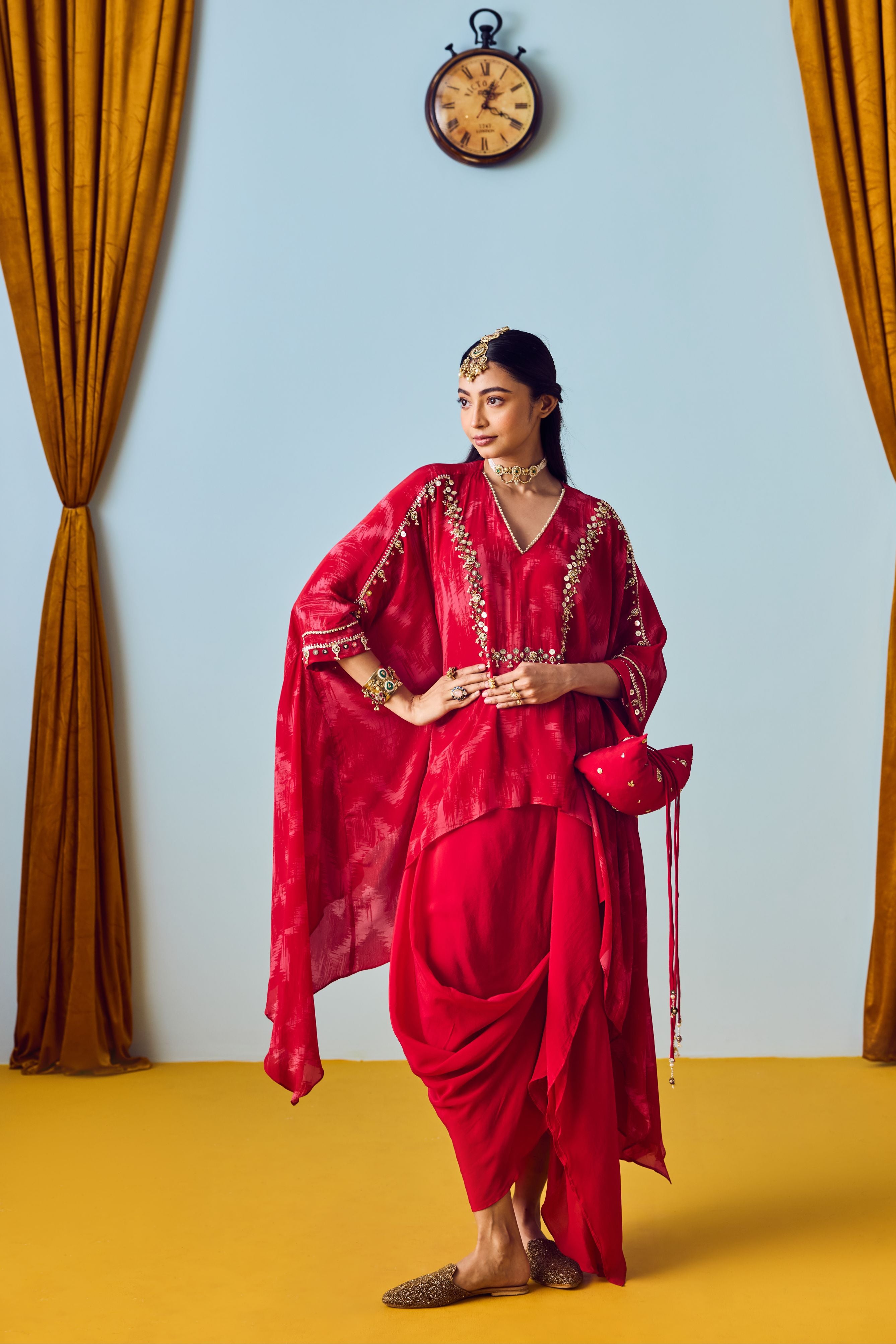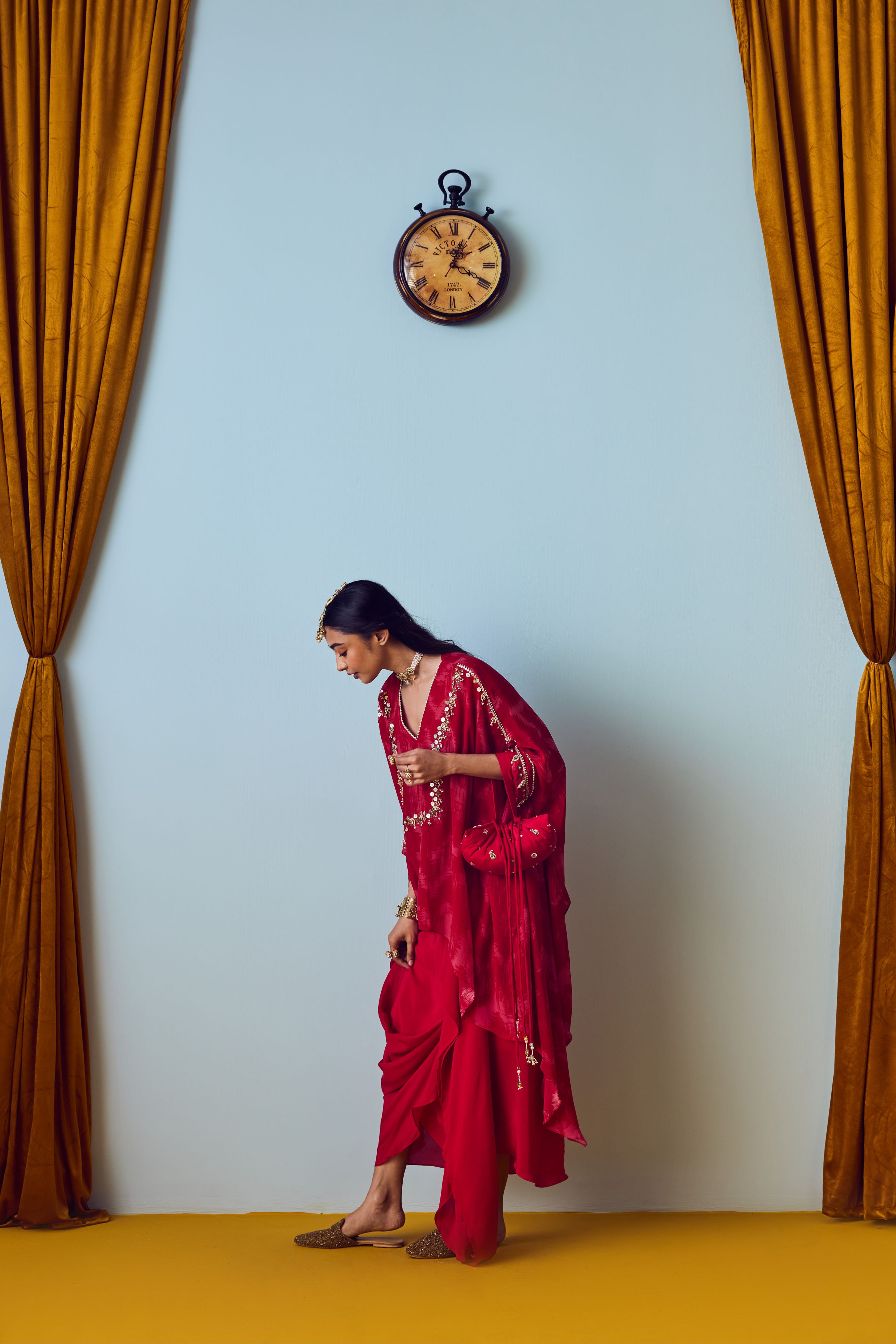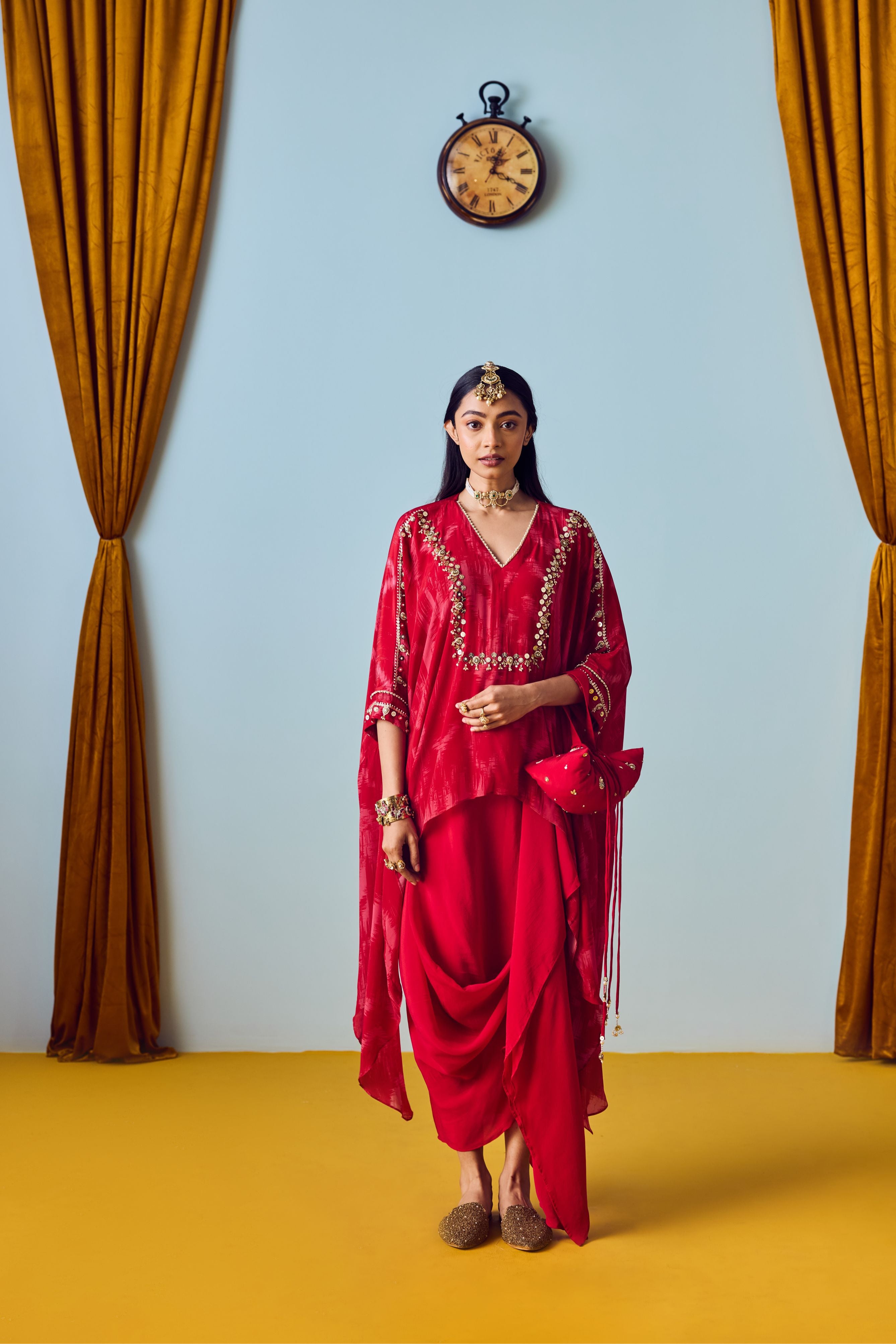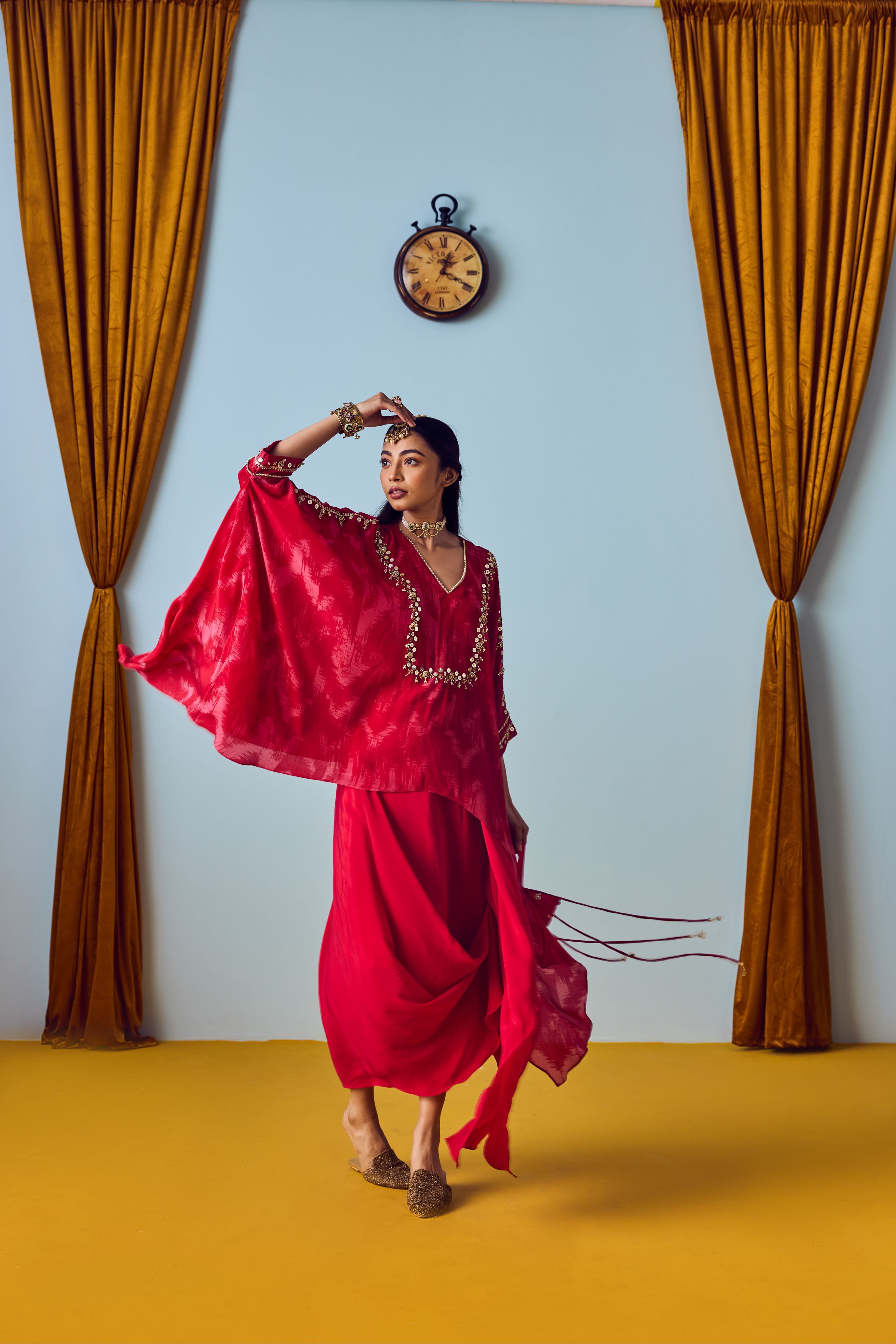 Raso Red Hand-Embroidered Kaftan Tunic with Draped Skirt Set