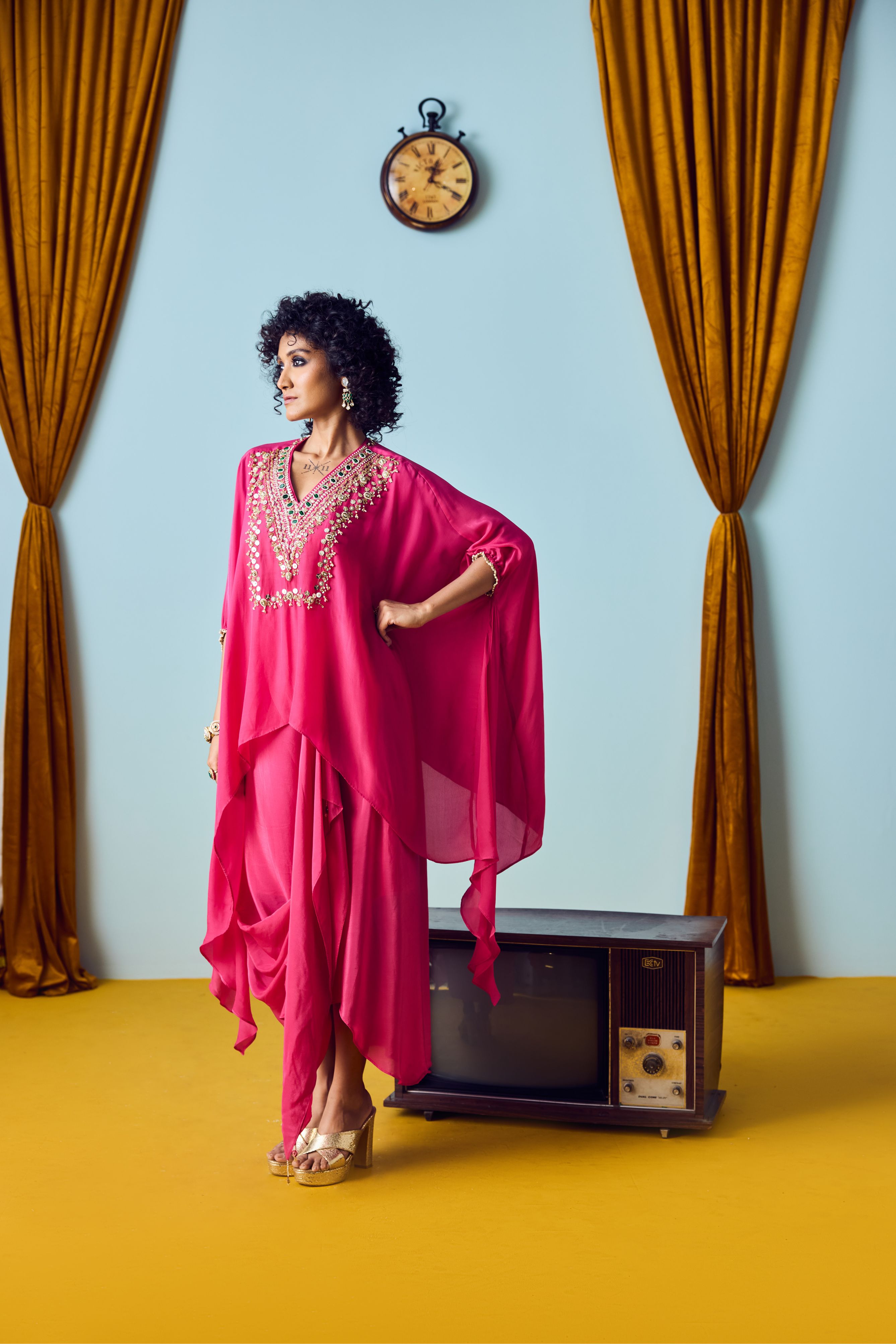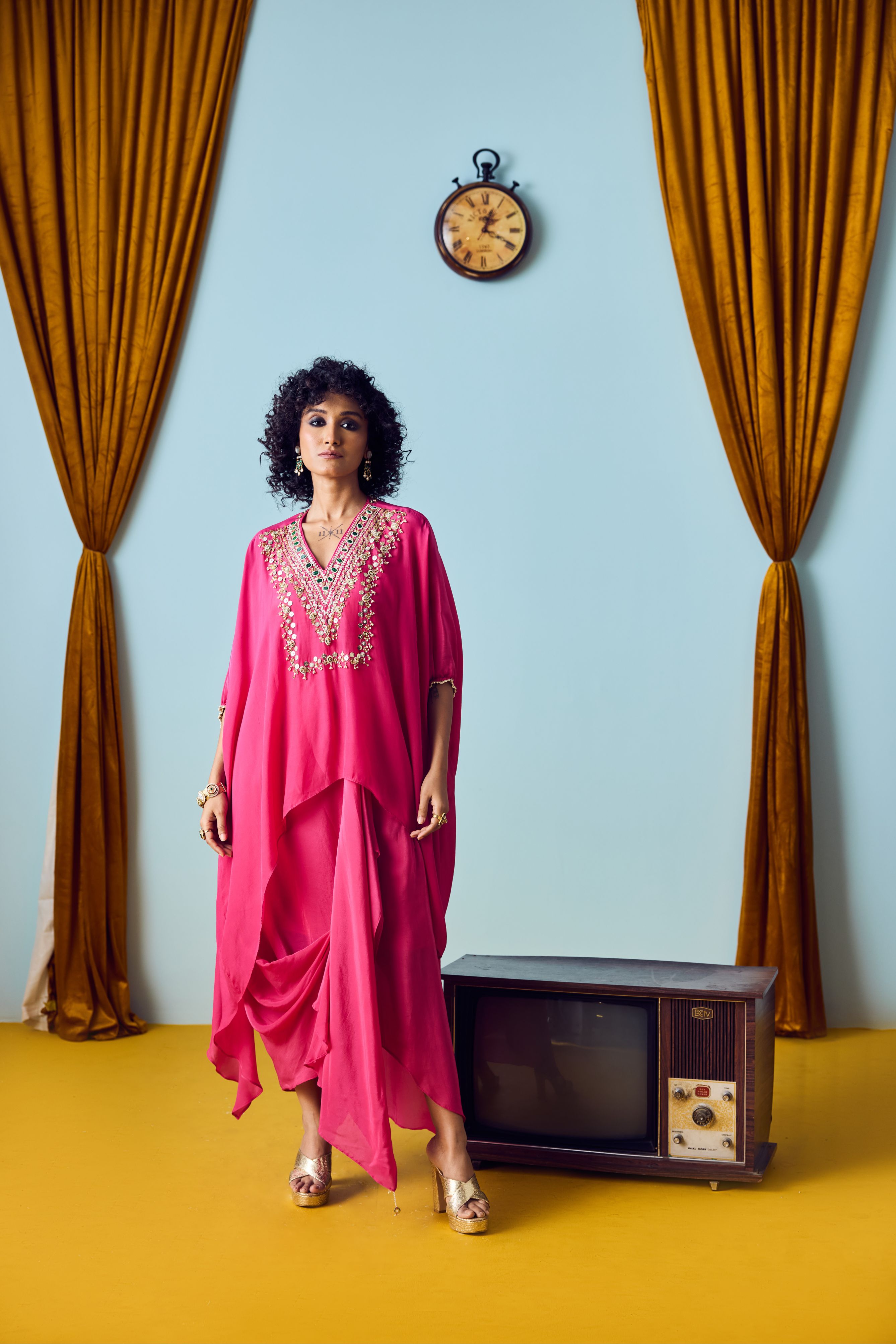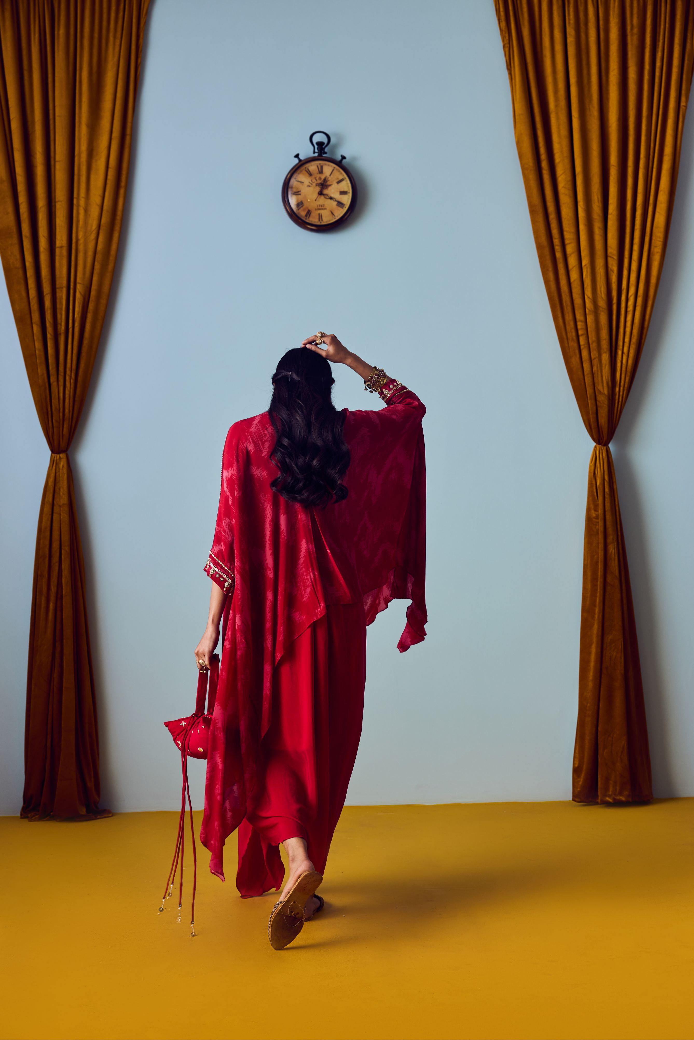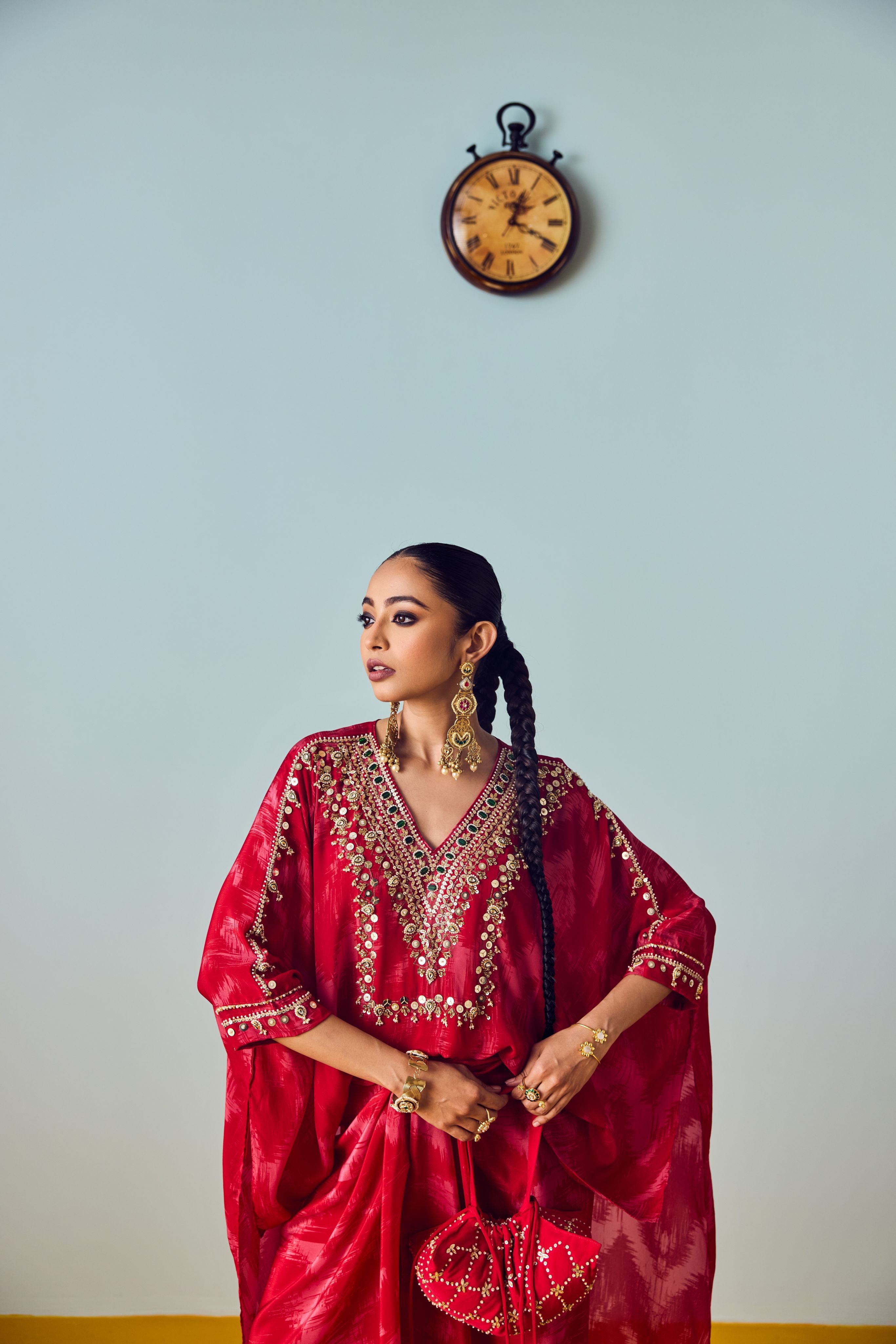 Raso Red Hand-Embroidered Kaftan Tunic with Draped Skirt Set