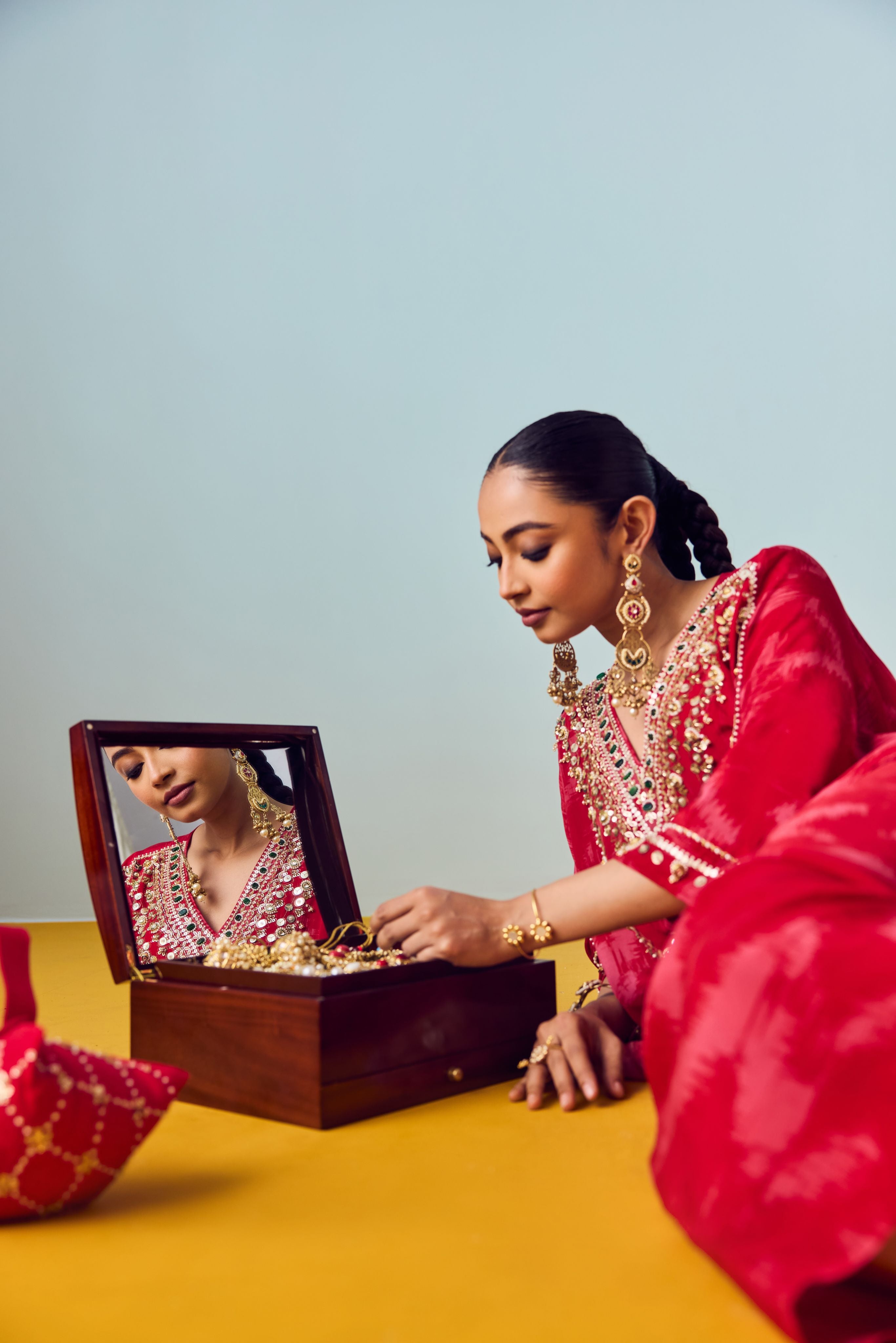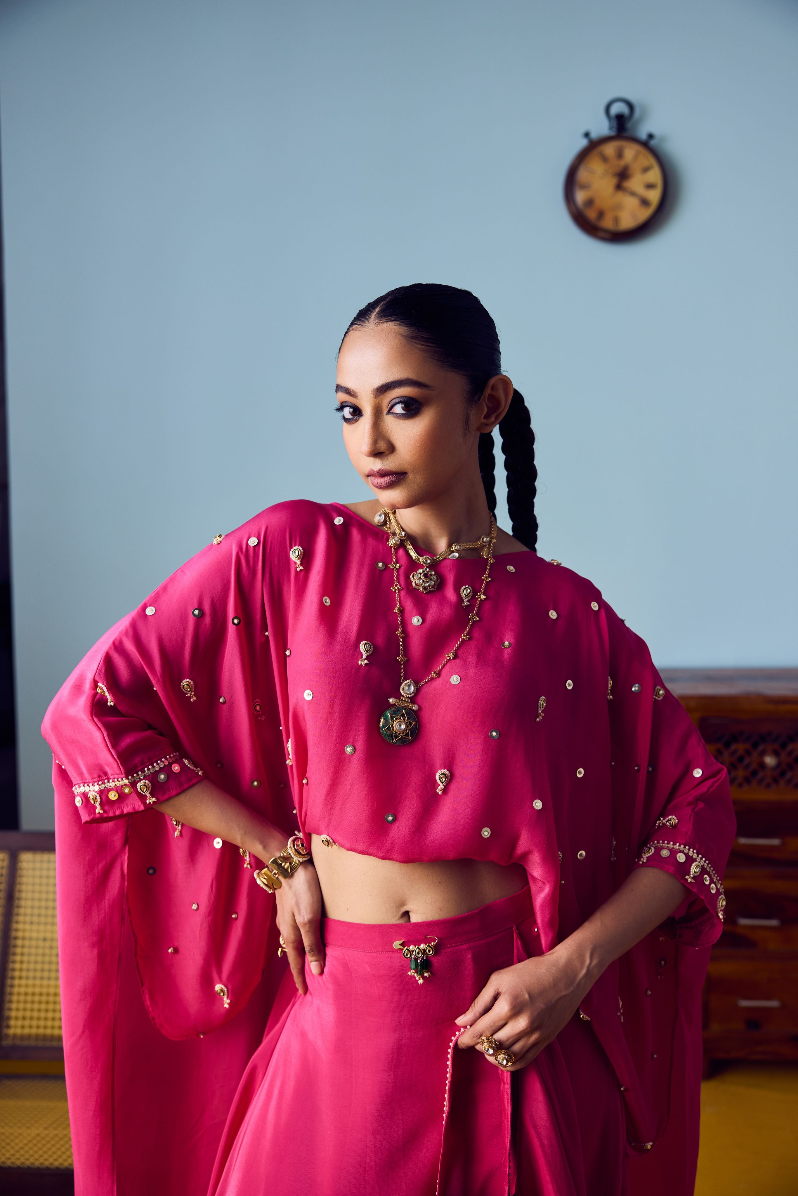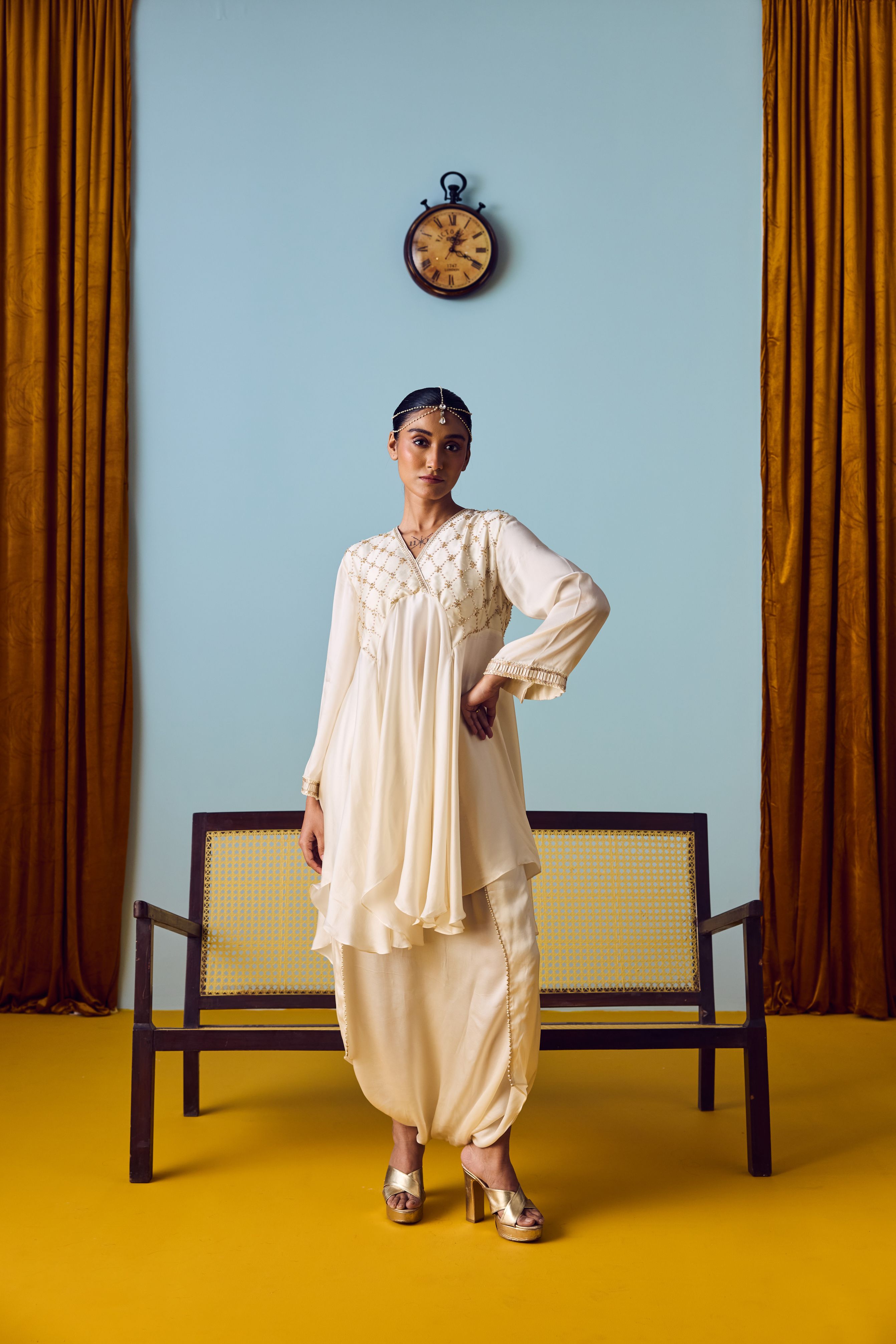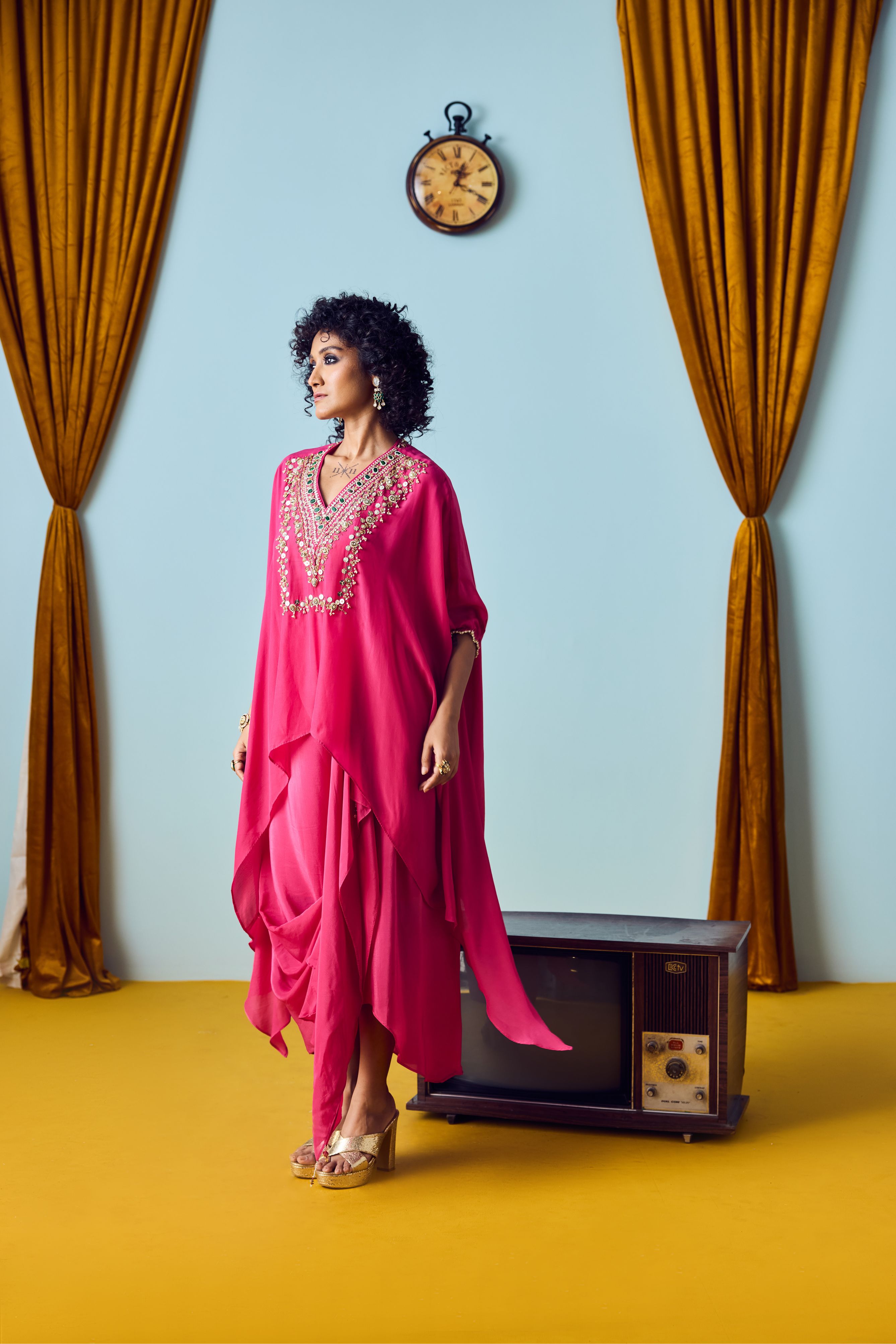 Raso Red Hand-Embroidered Kaftan Tunic with Draped Skirt Set
