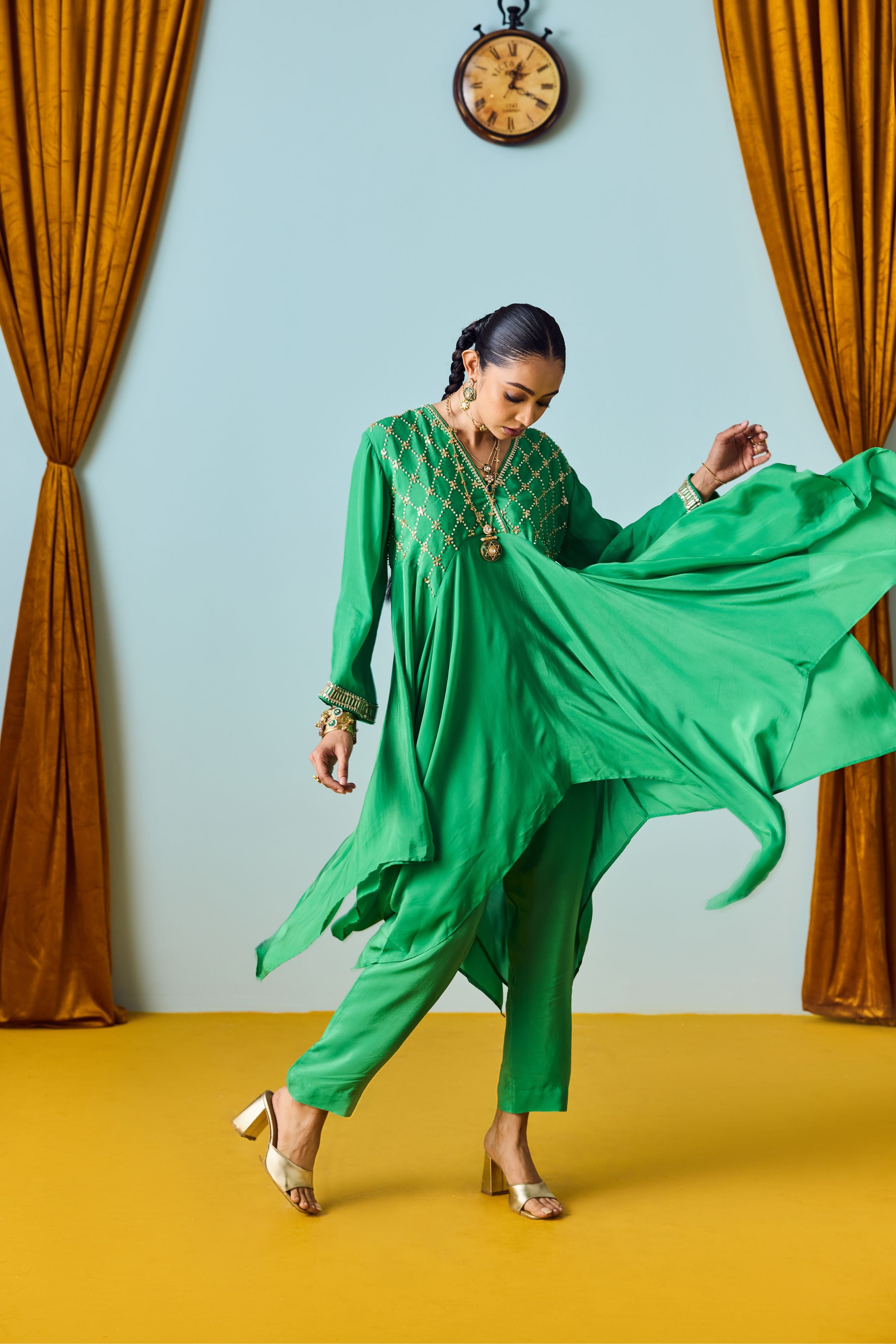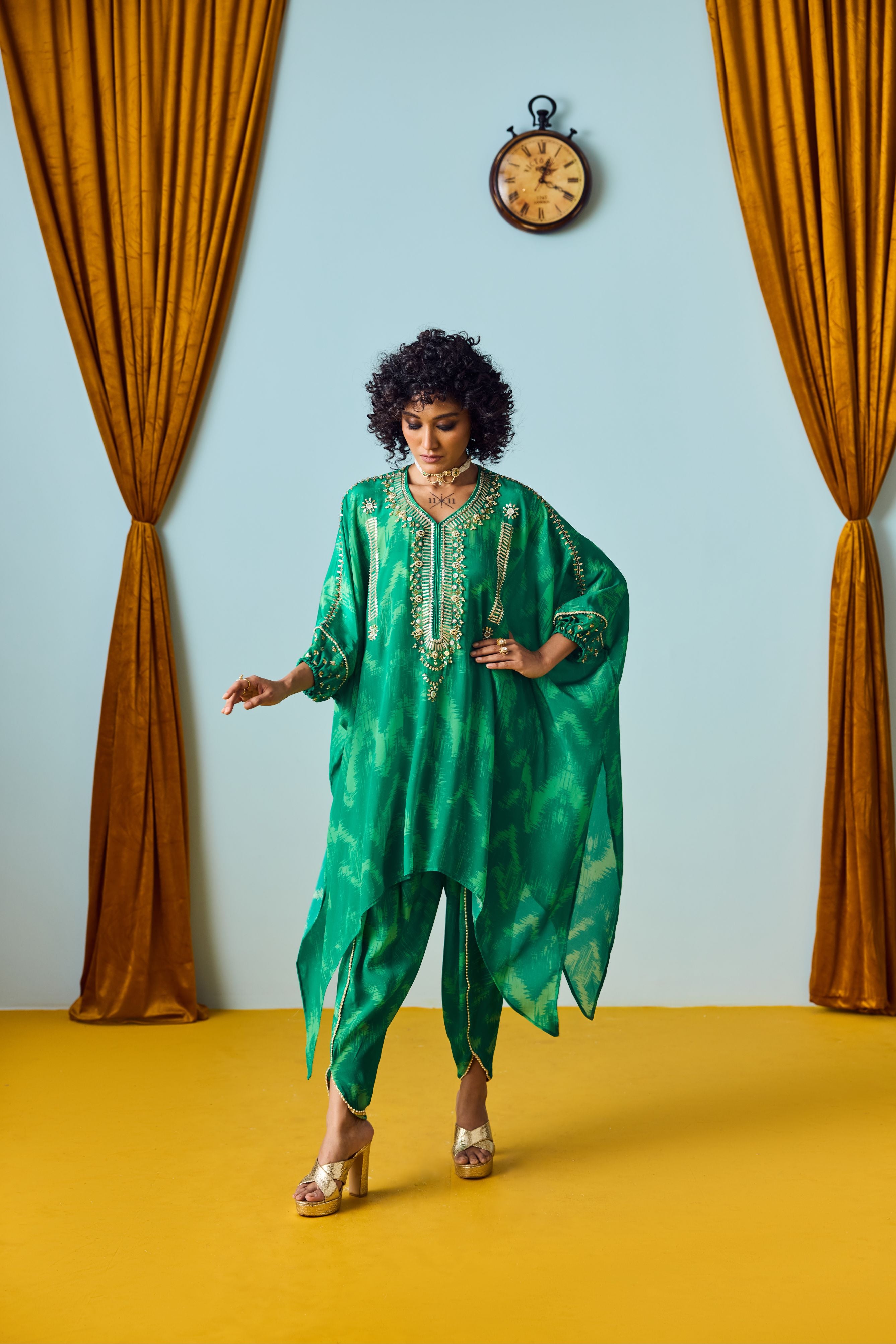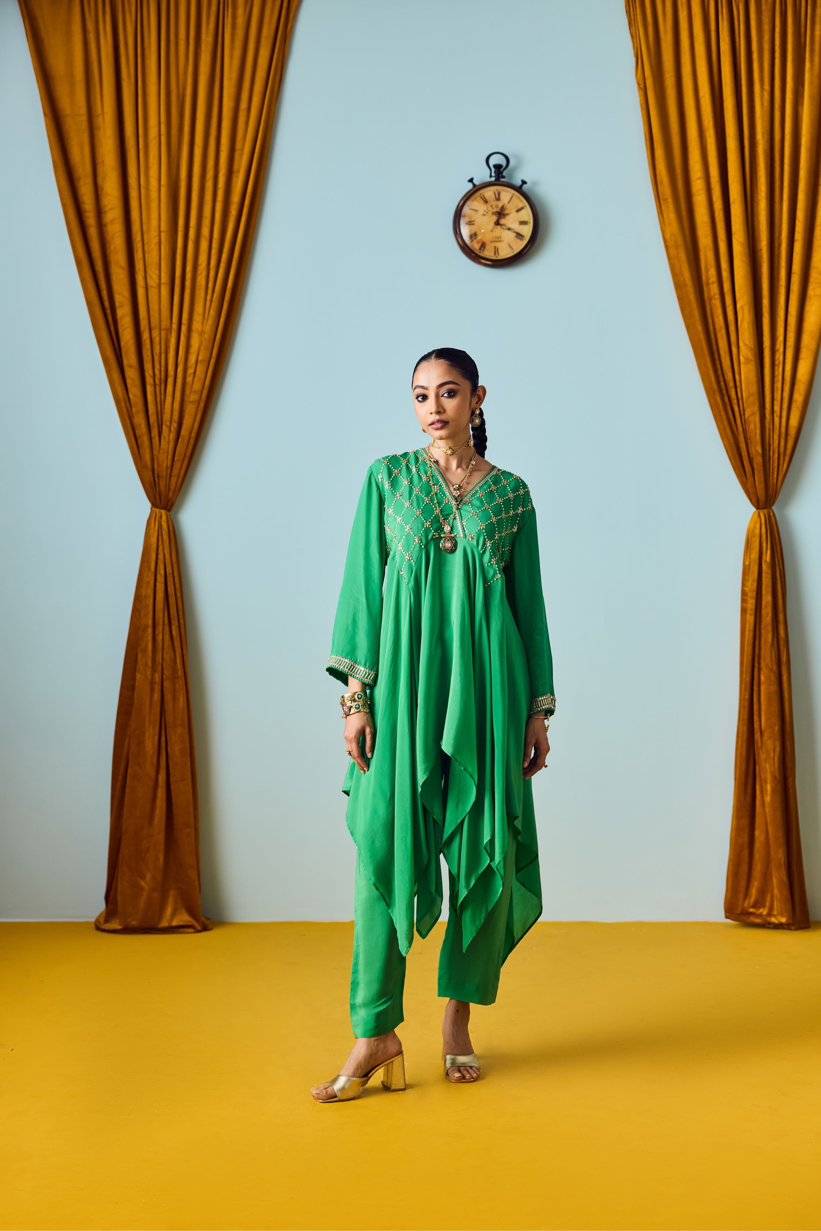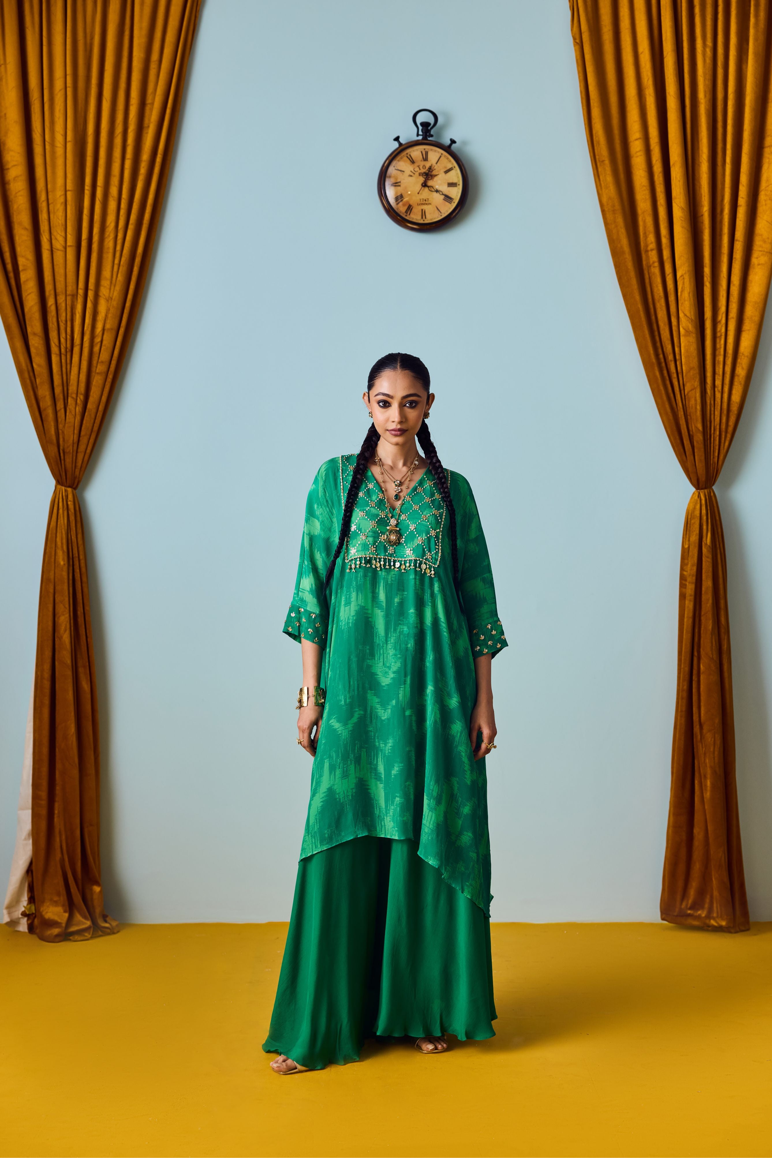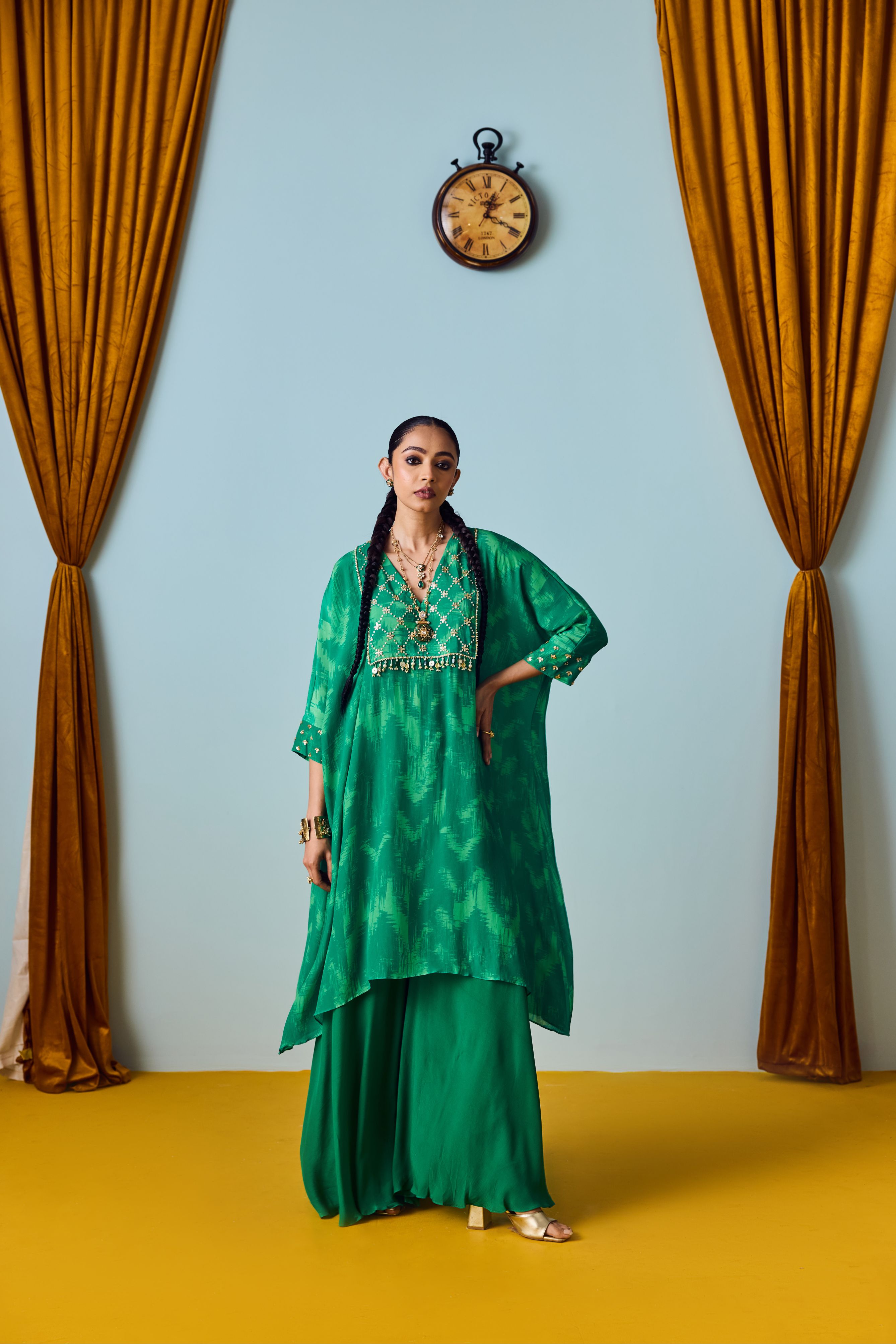 Maia Coral Green Hand-Embroidered Kaftan Kurta with Flared Palazzo Set