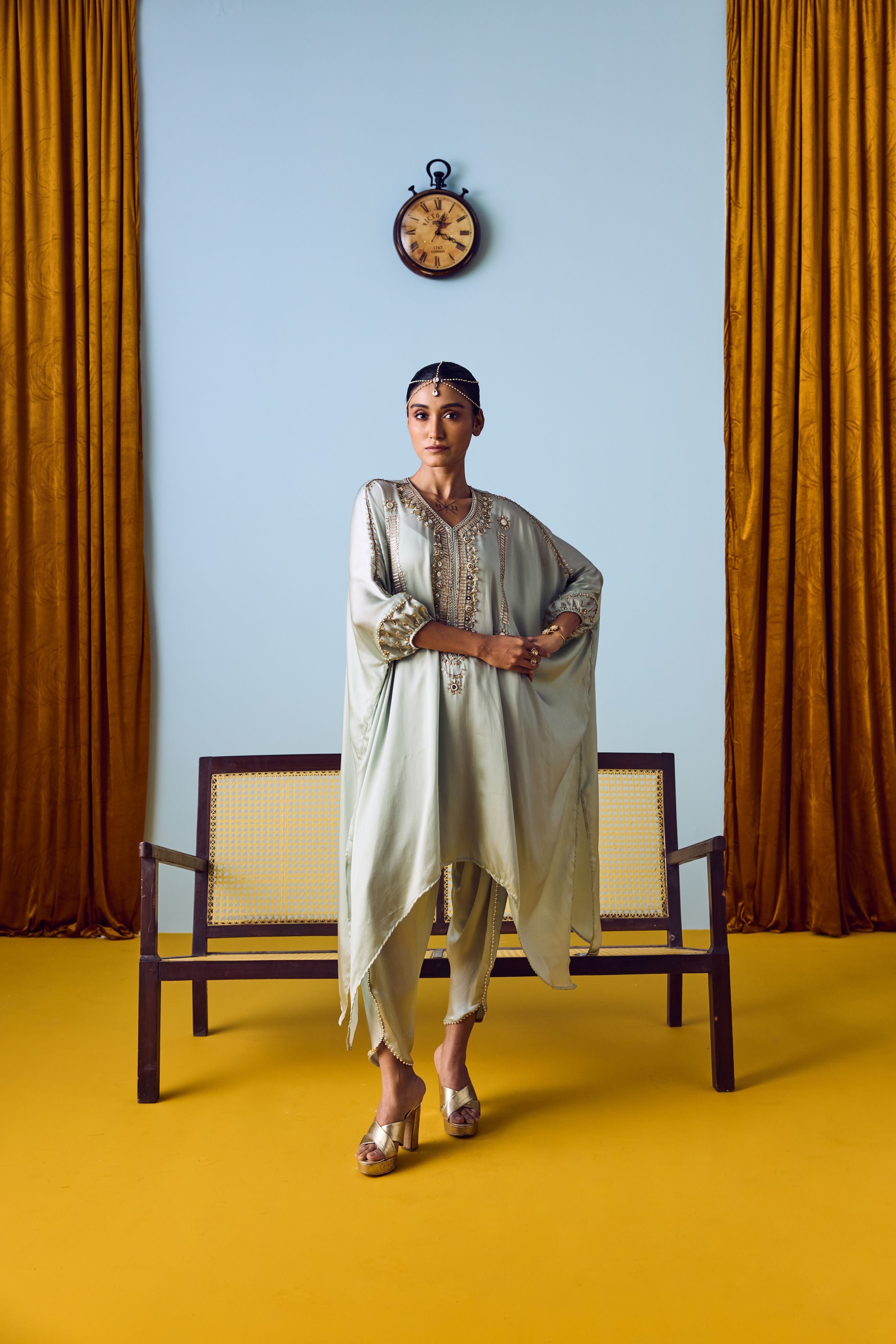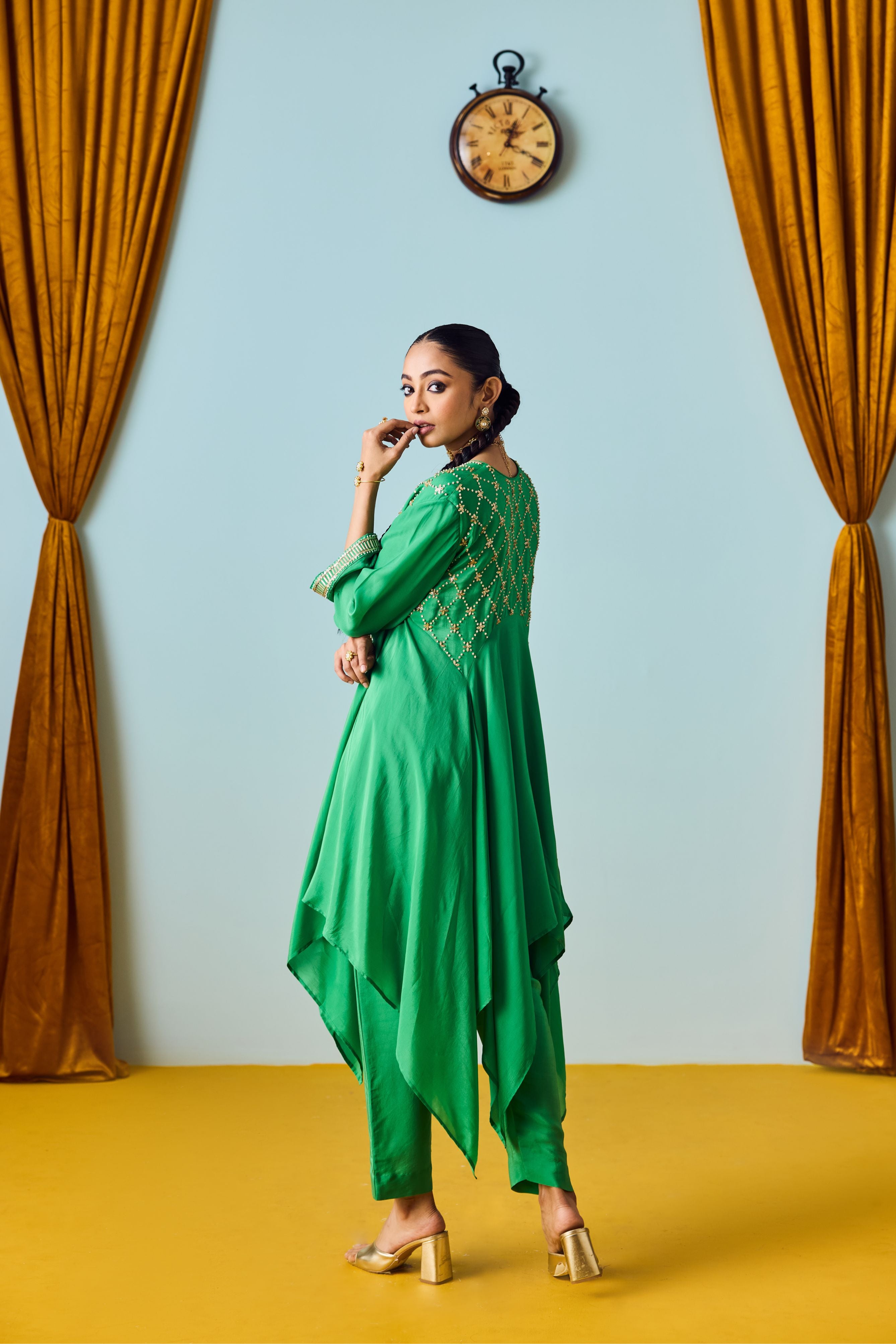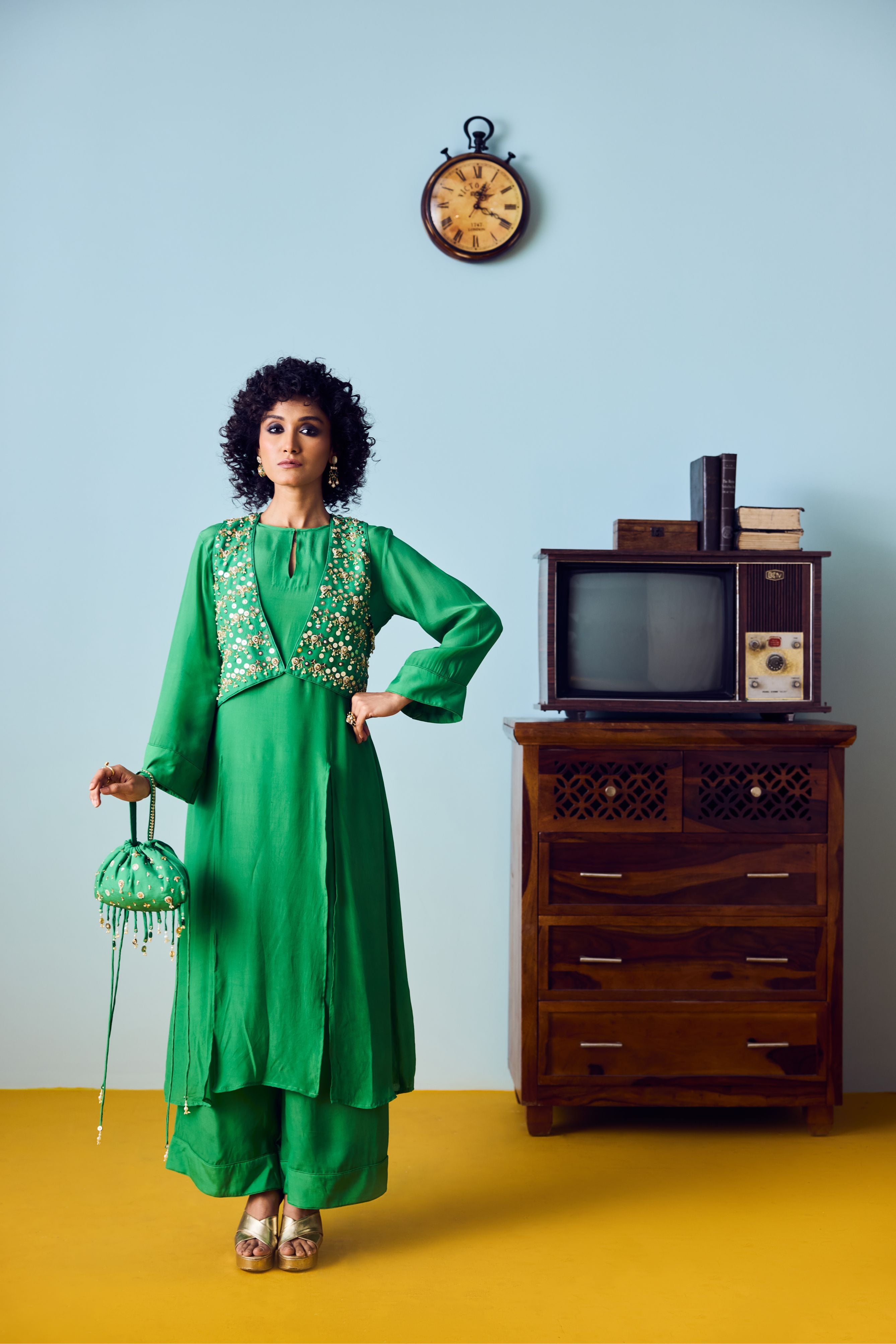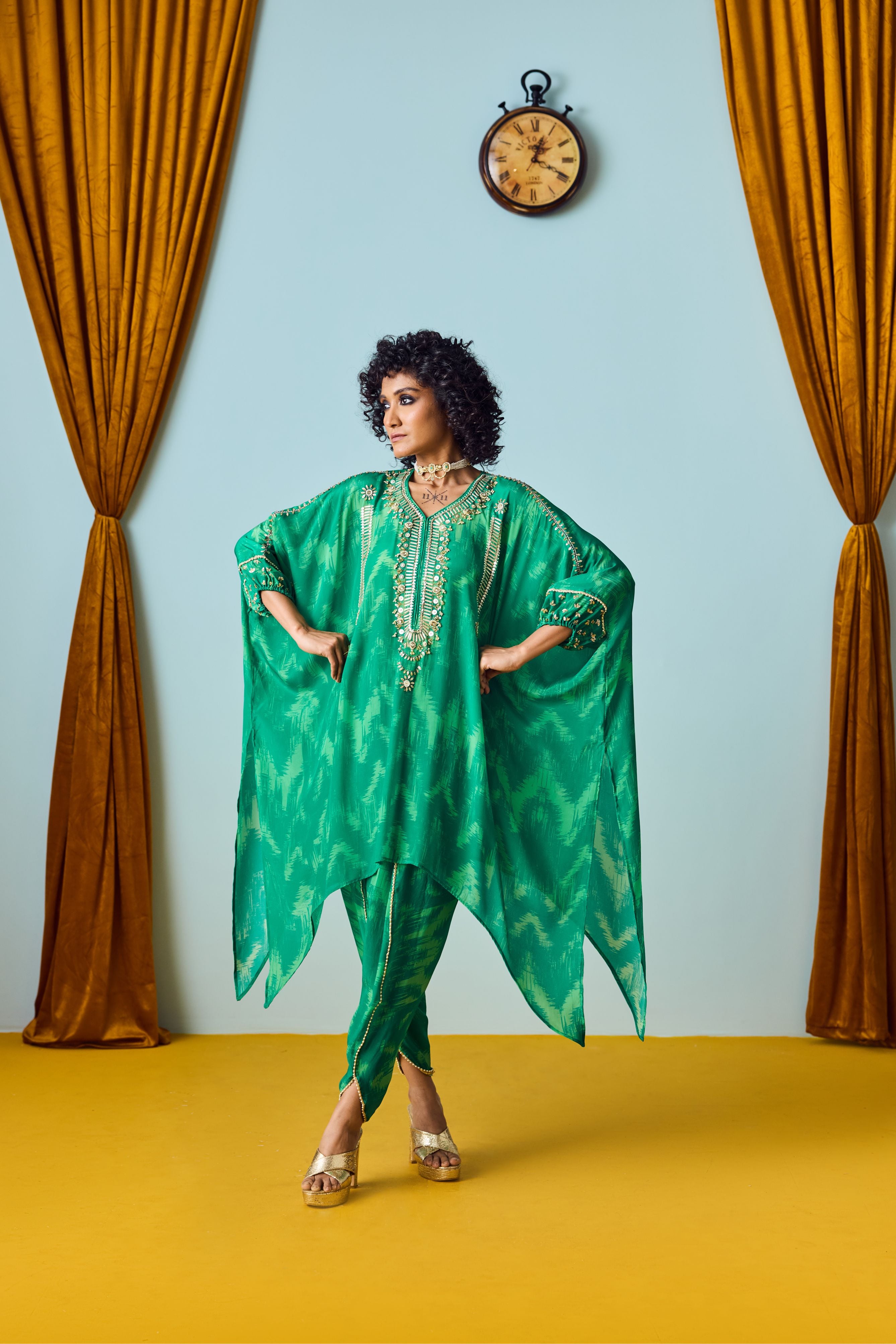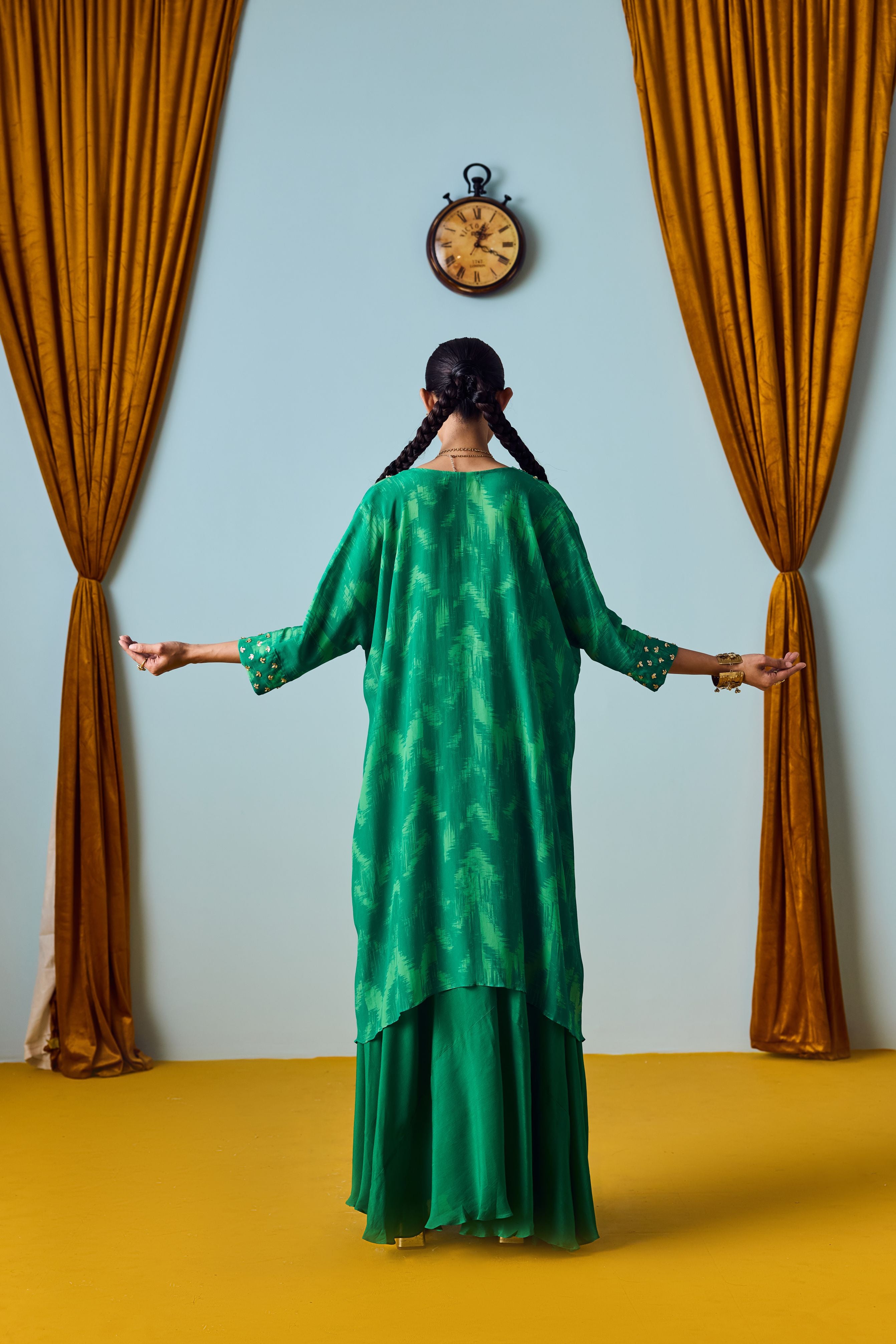 Maia Coral Green Hand-Embroidered Kaftan Kurta with Flared Palazzo Set