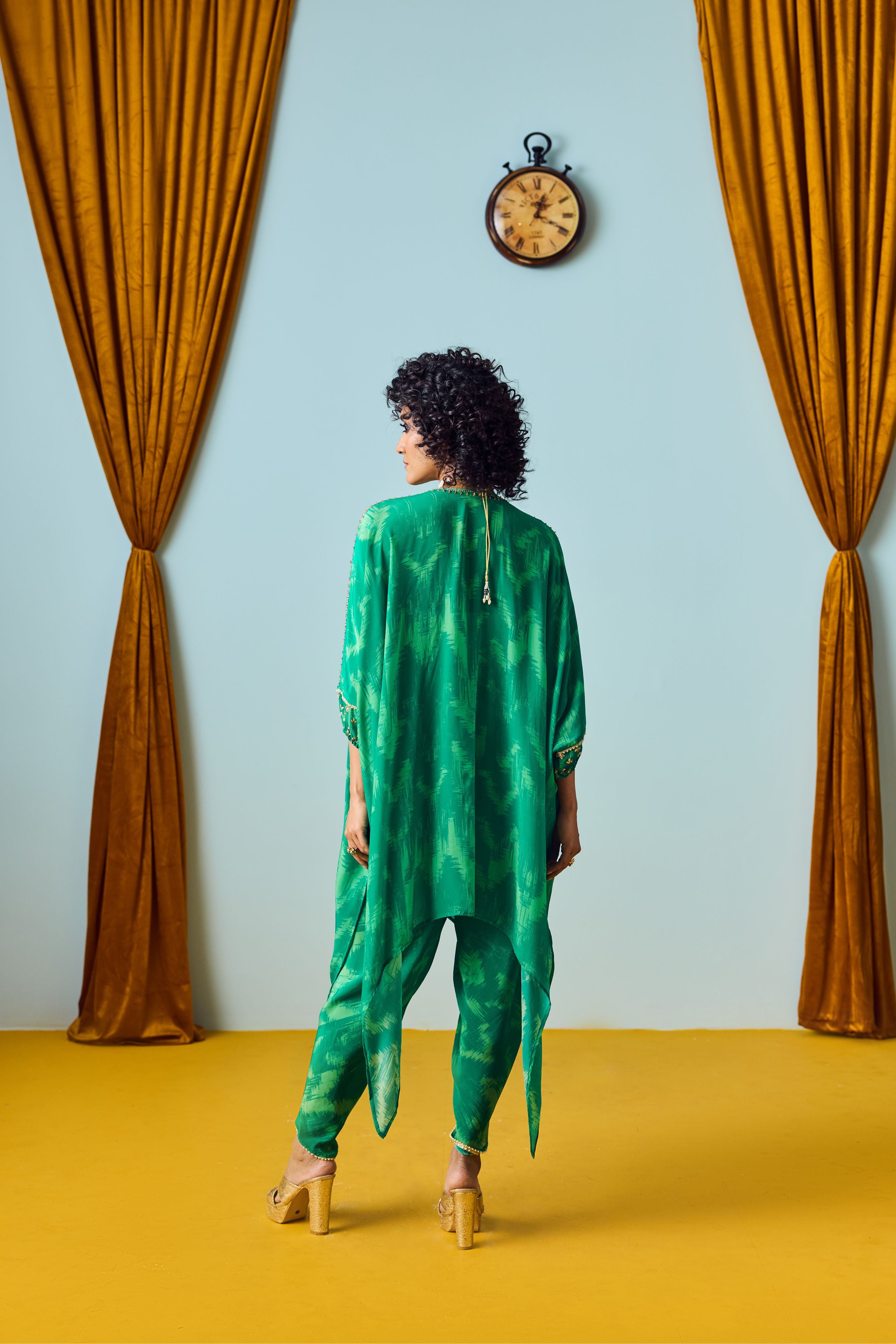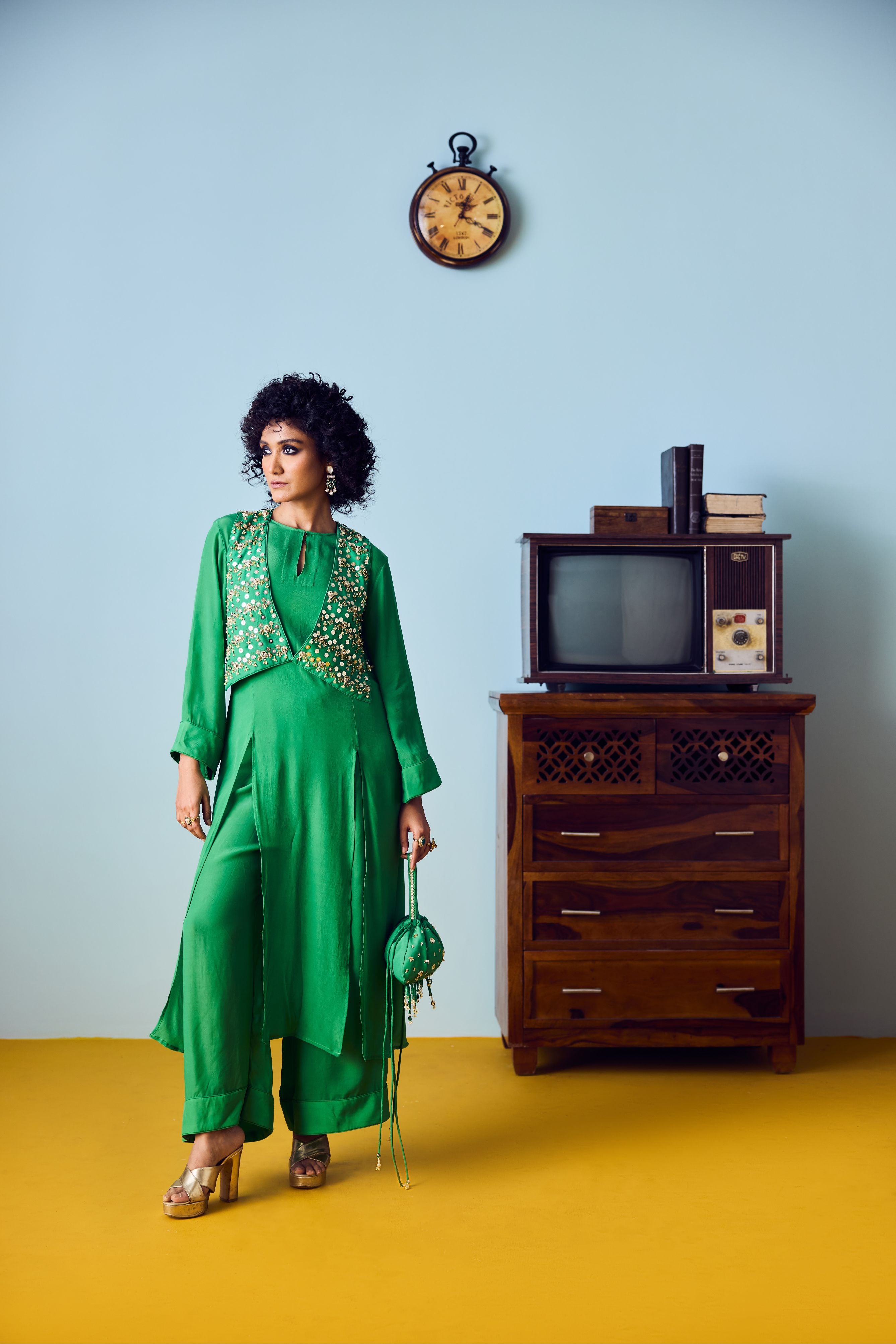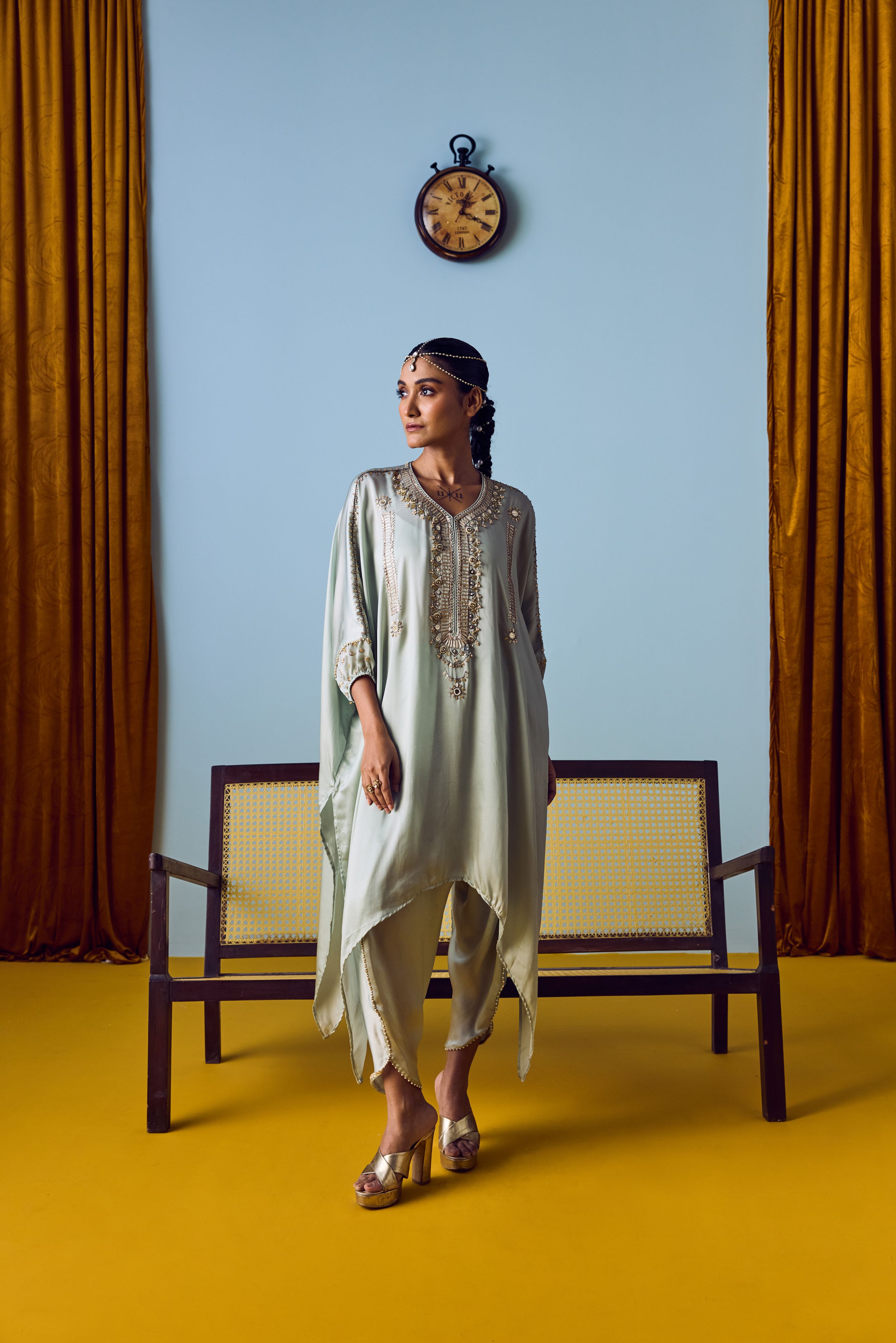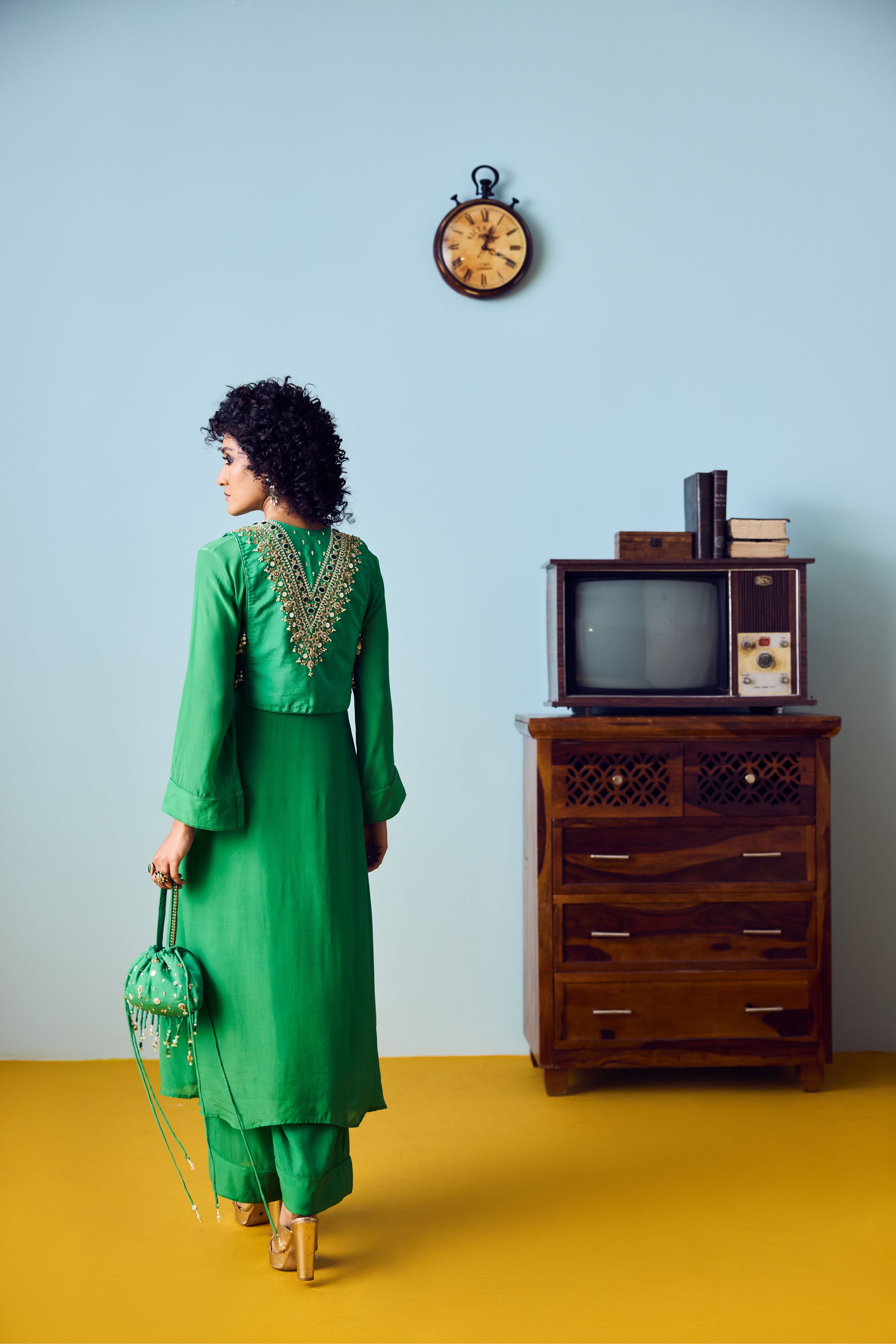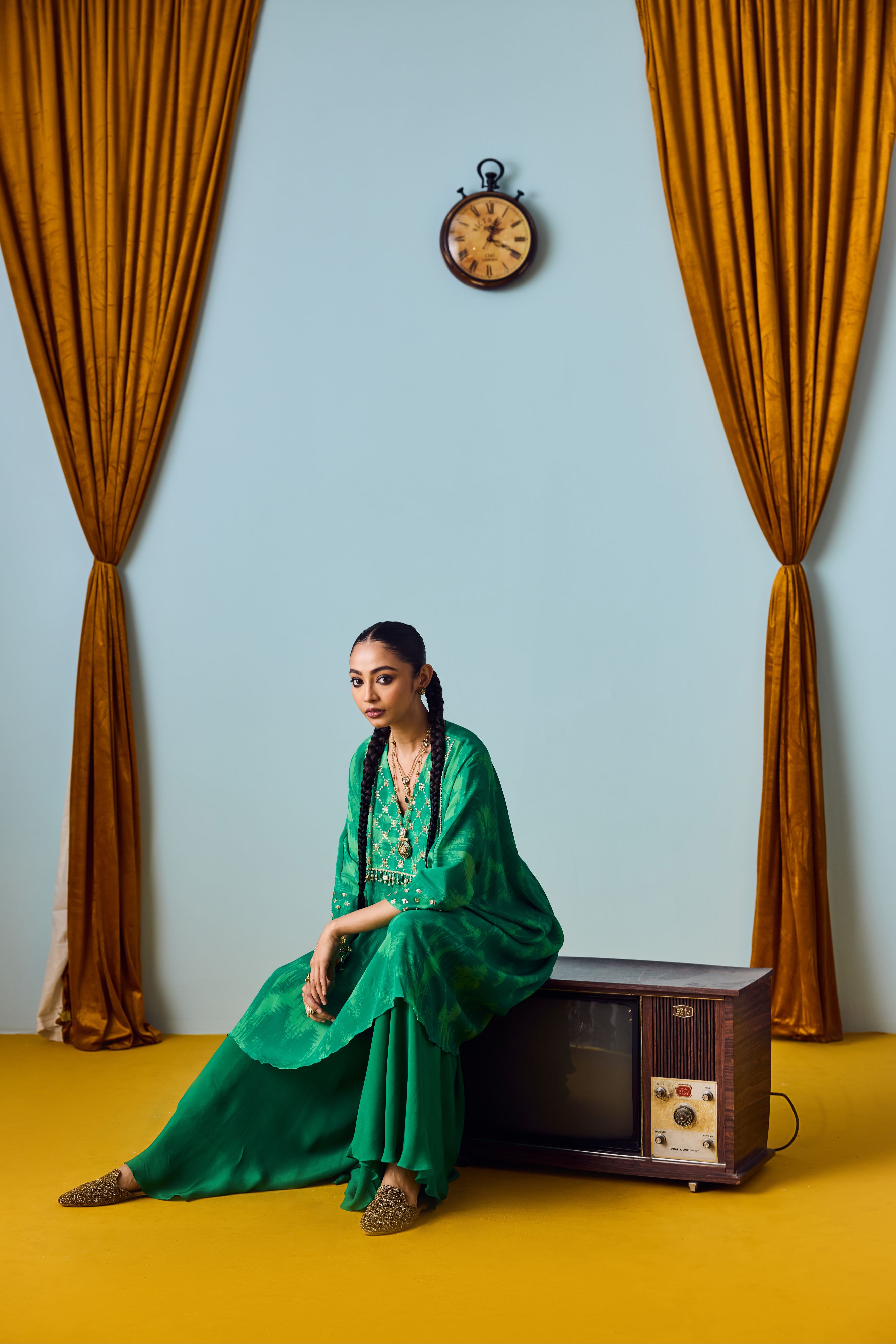 Maia Coral Green Hand-Embroidered Kaftan Kurta with Flared Palazzo Set