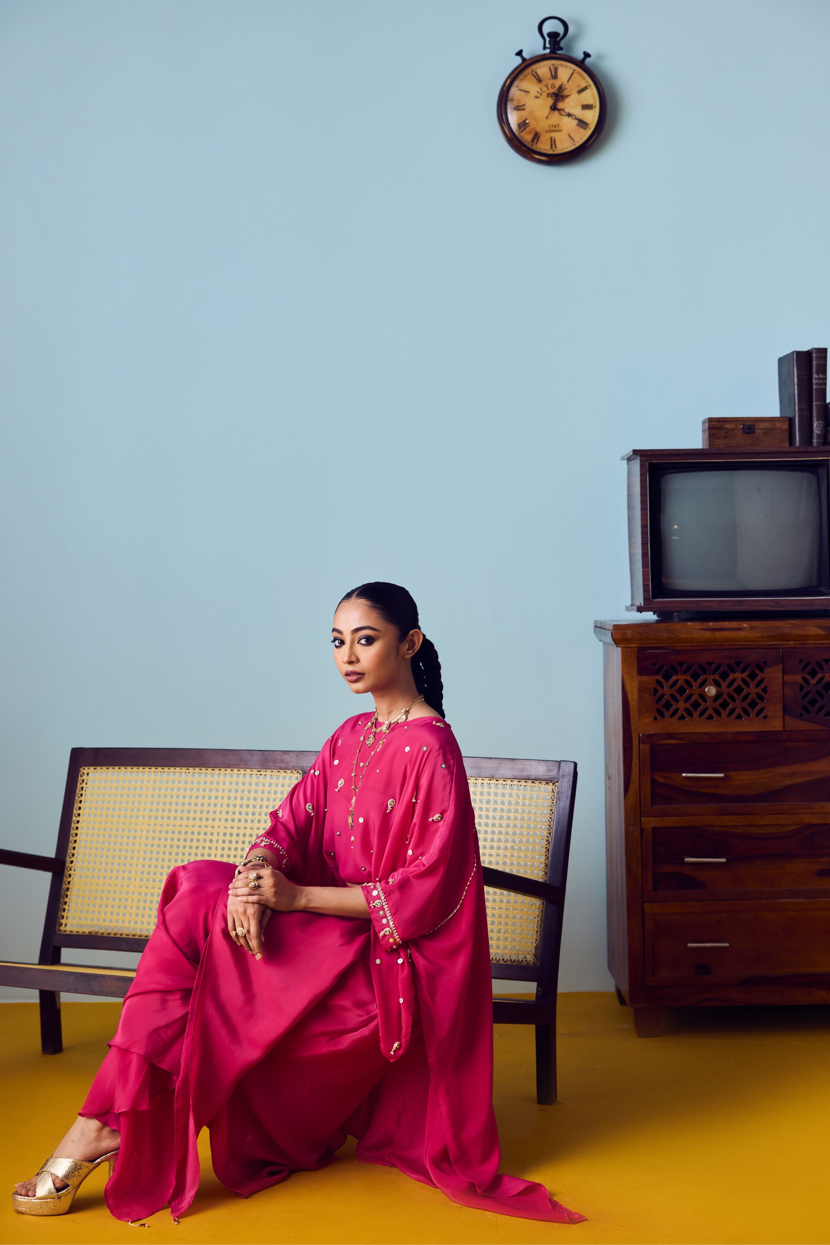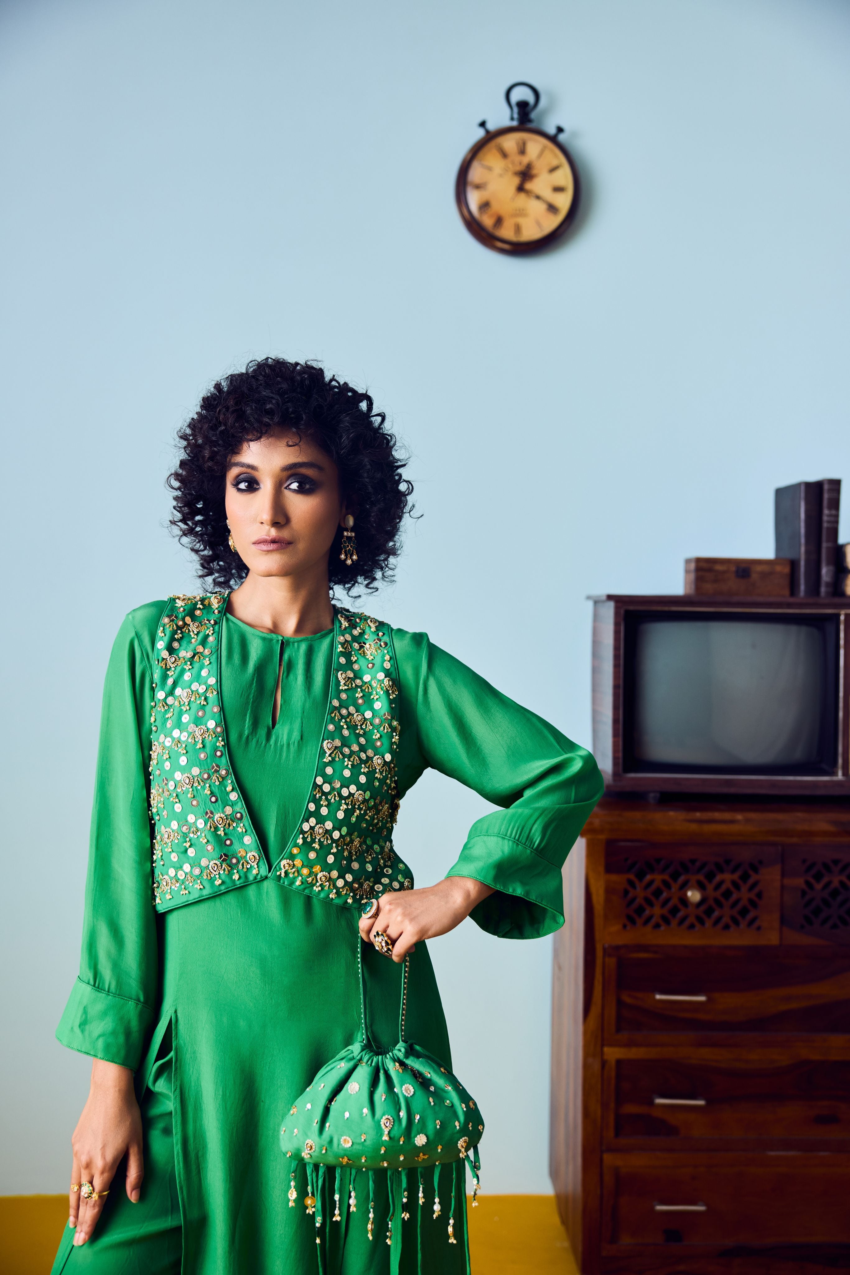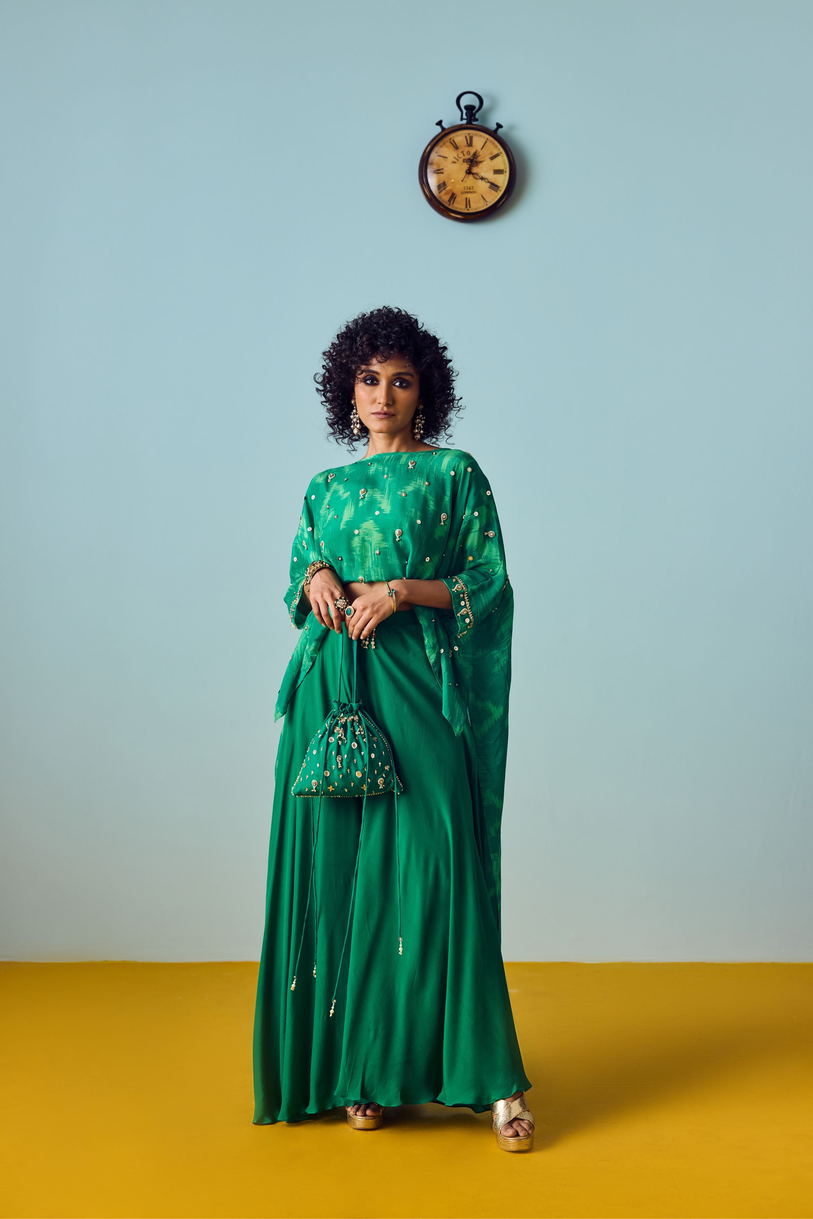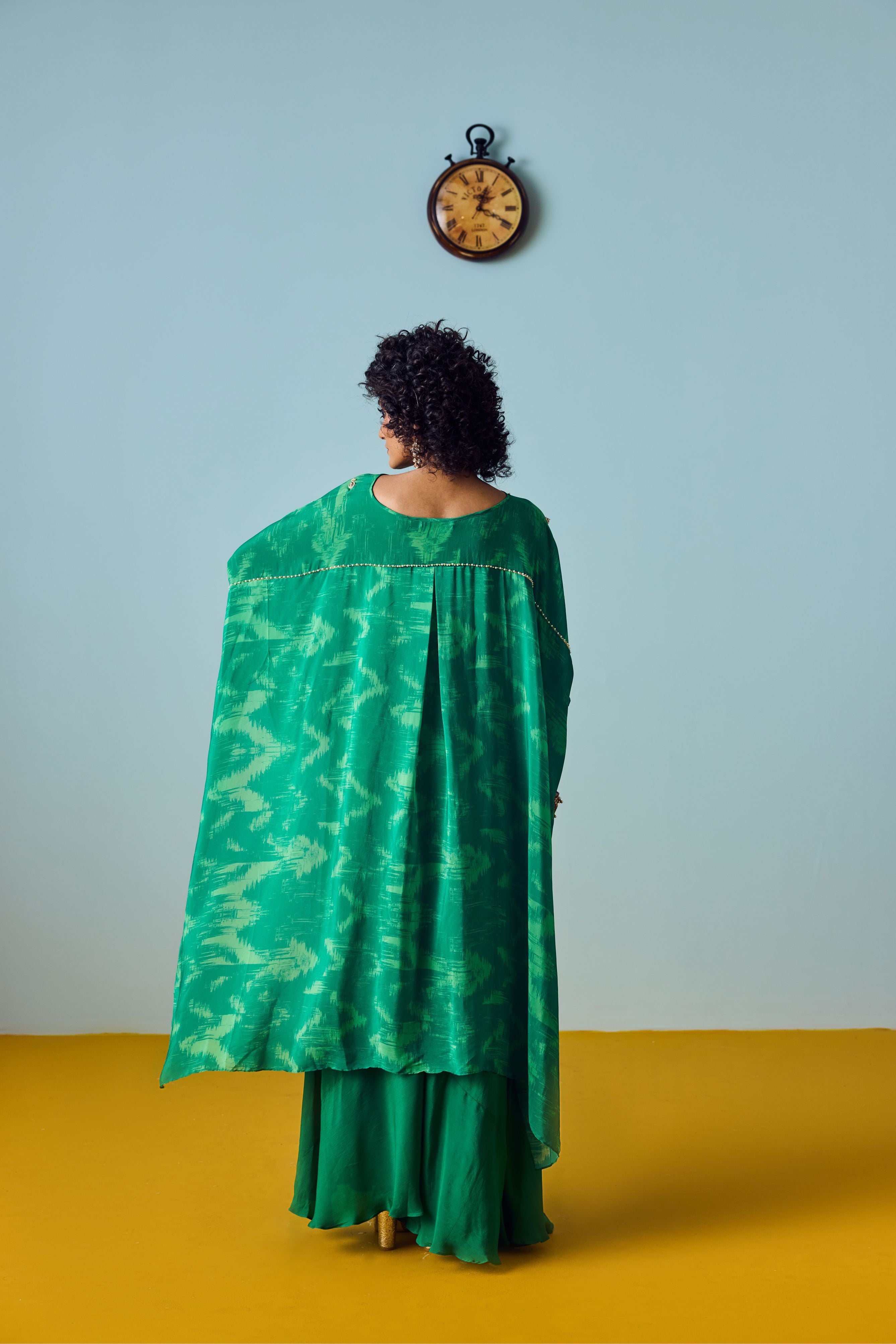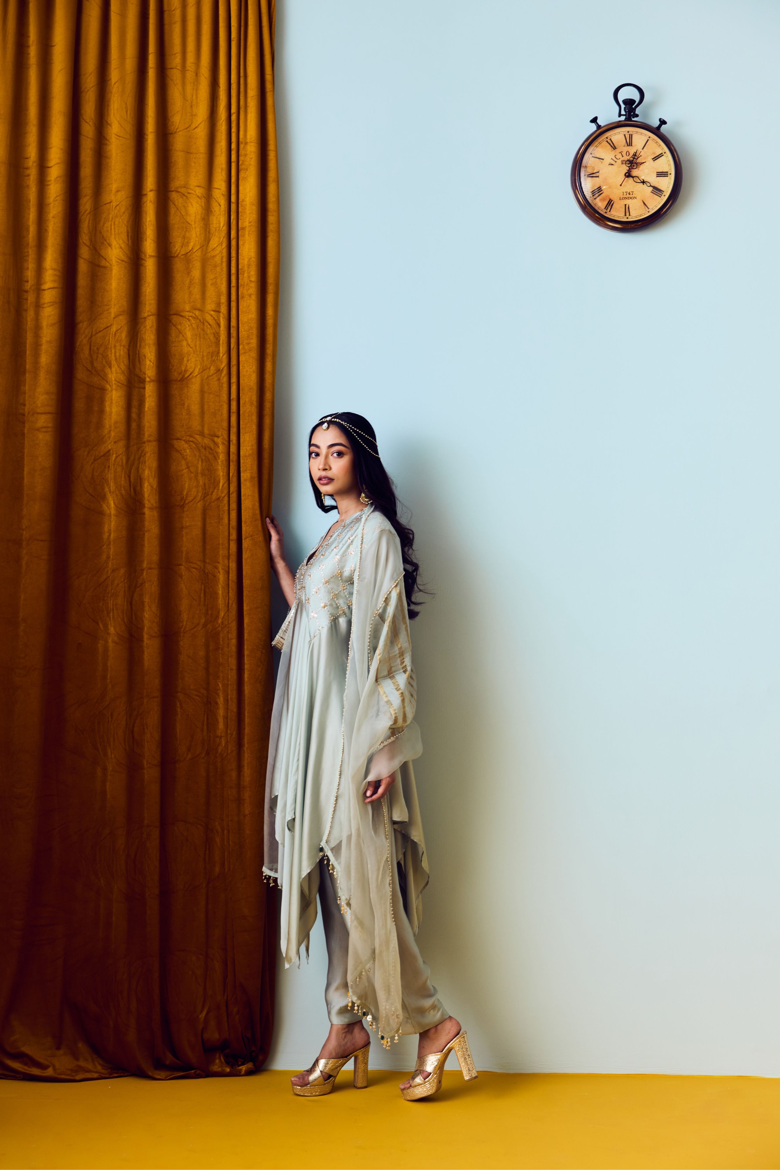 Maia Coral Green Hand-Embroidered Kaftan Kurta with Flared Palazzo Set