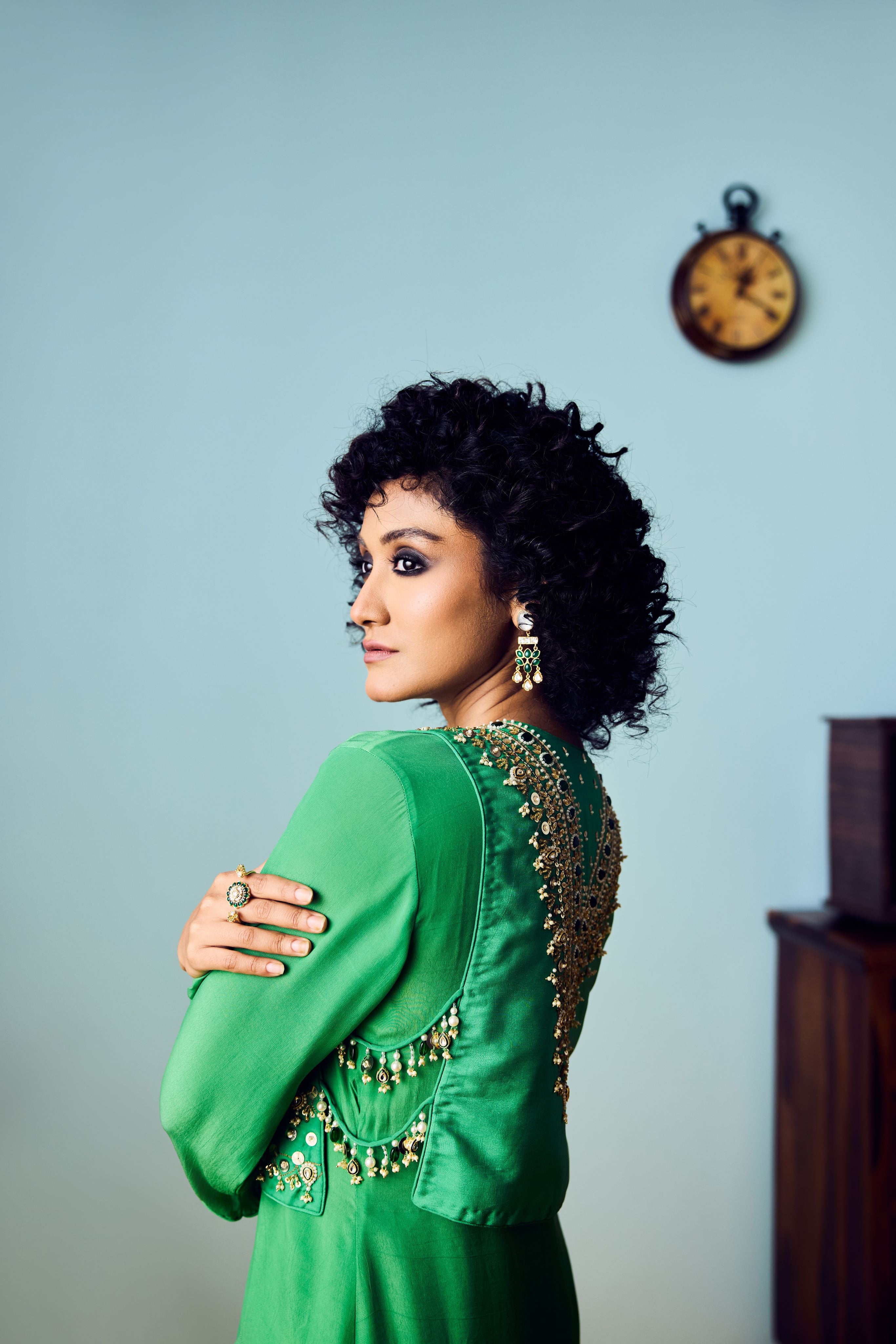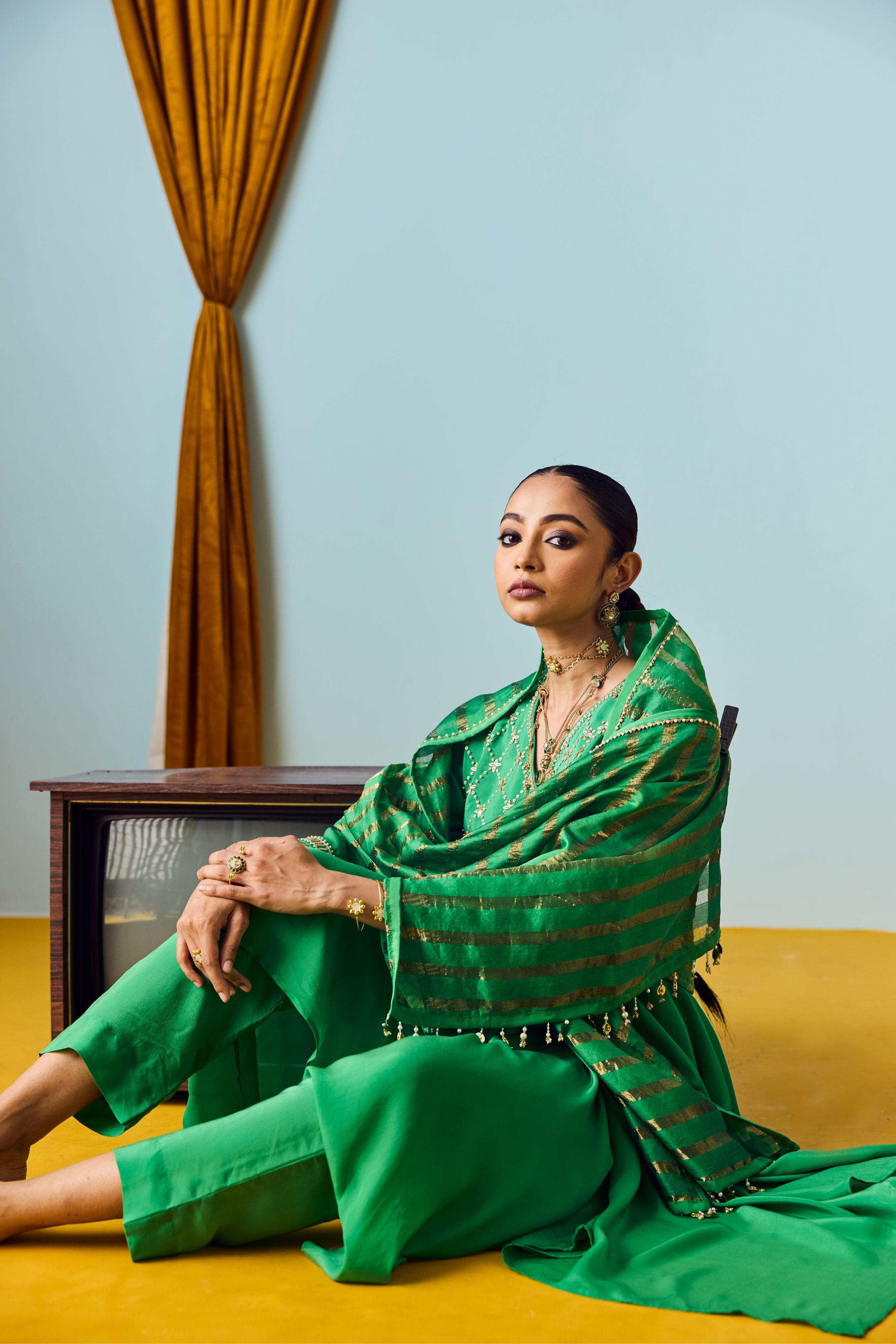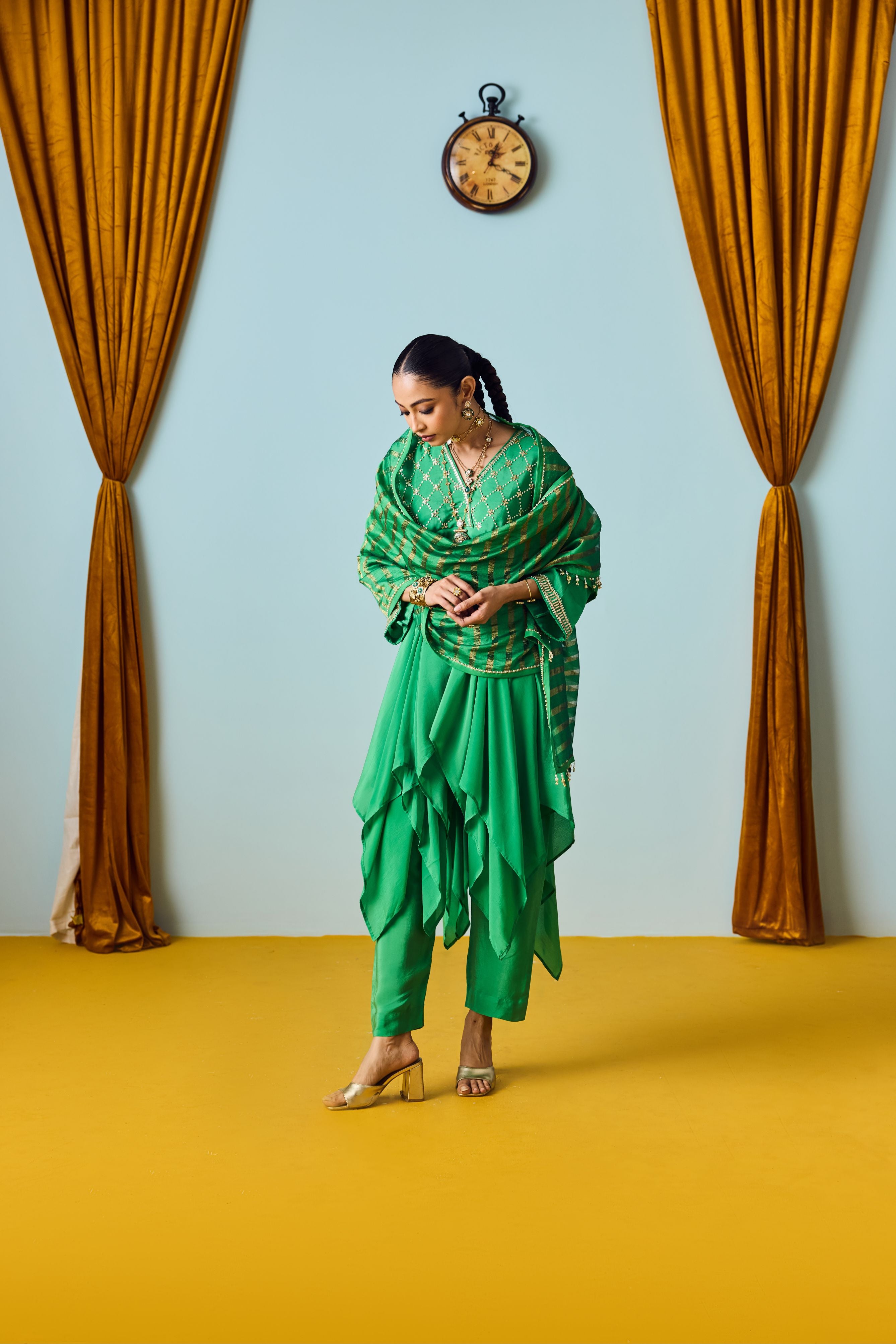 Sureen Green Asymmetric Kurta Set with Silk Tissue Chanderi Dupatta