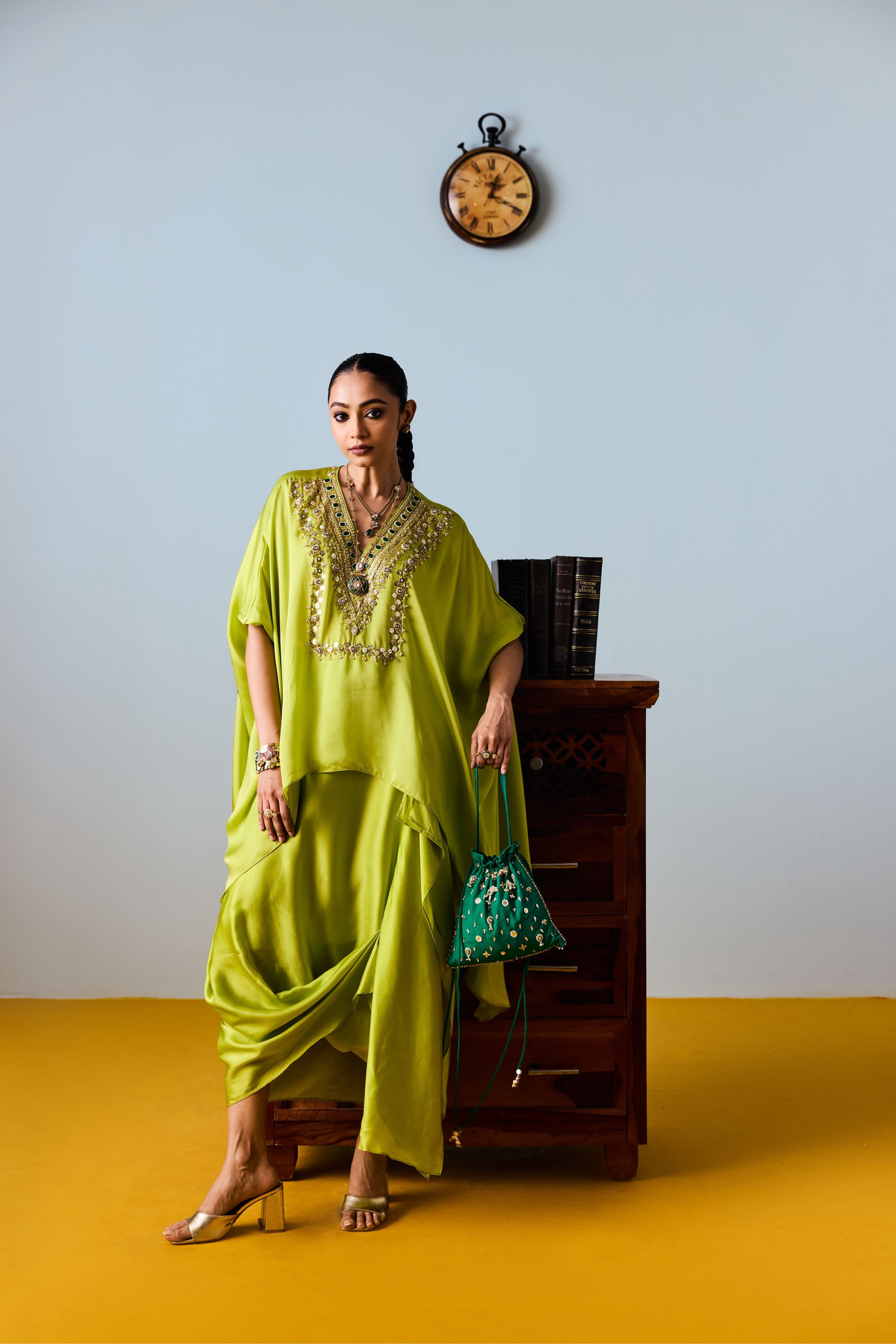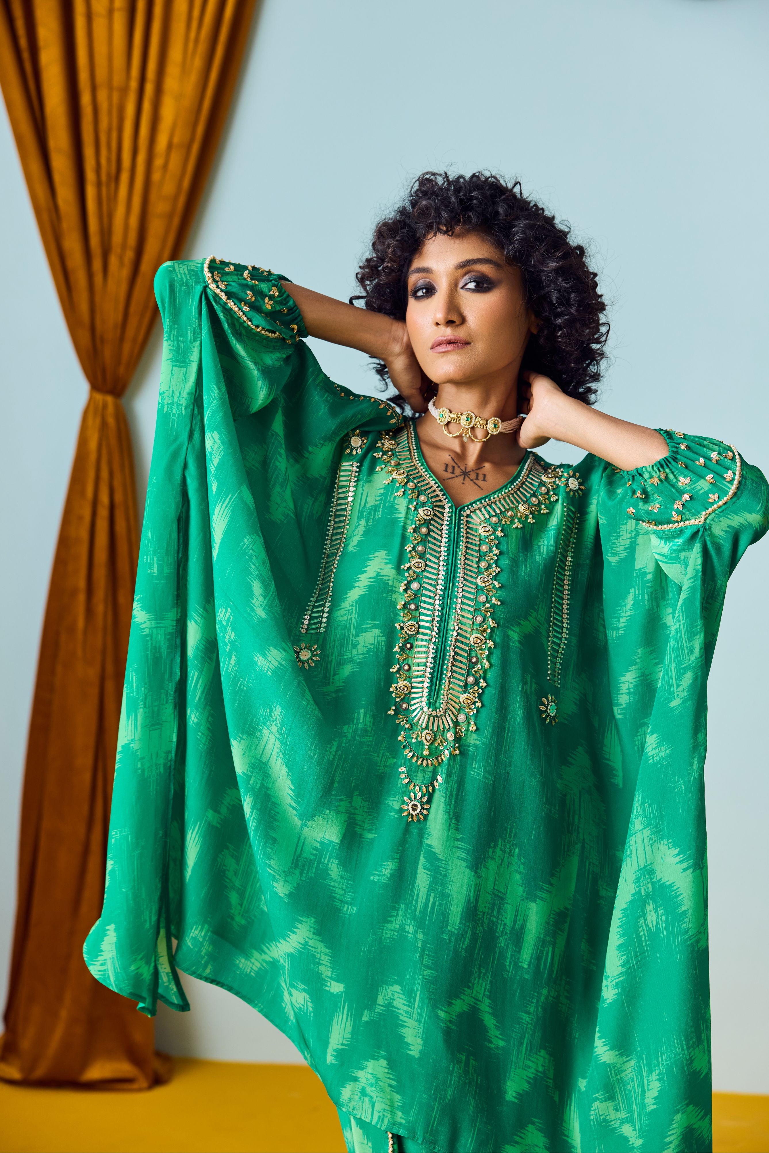 Nourie Coral Green Hand-Embroidered Kaftan Set
