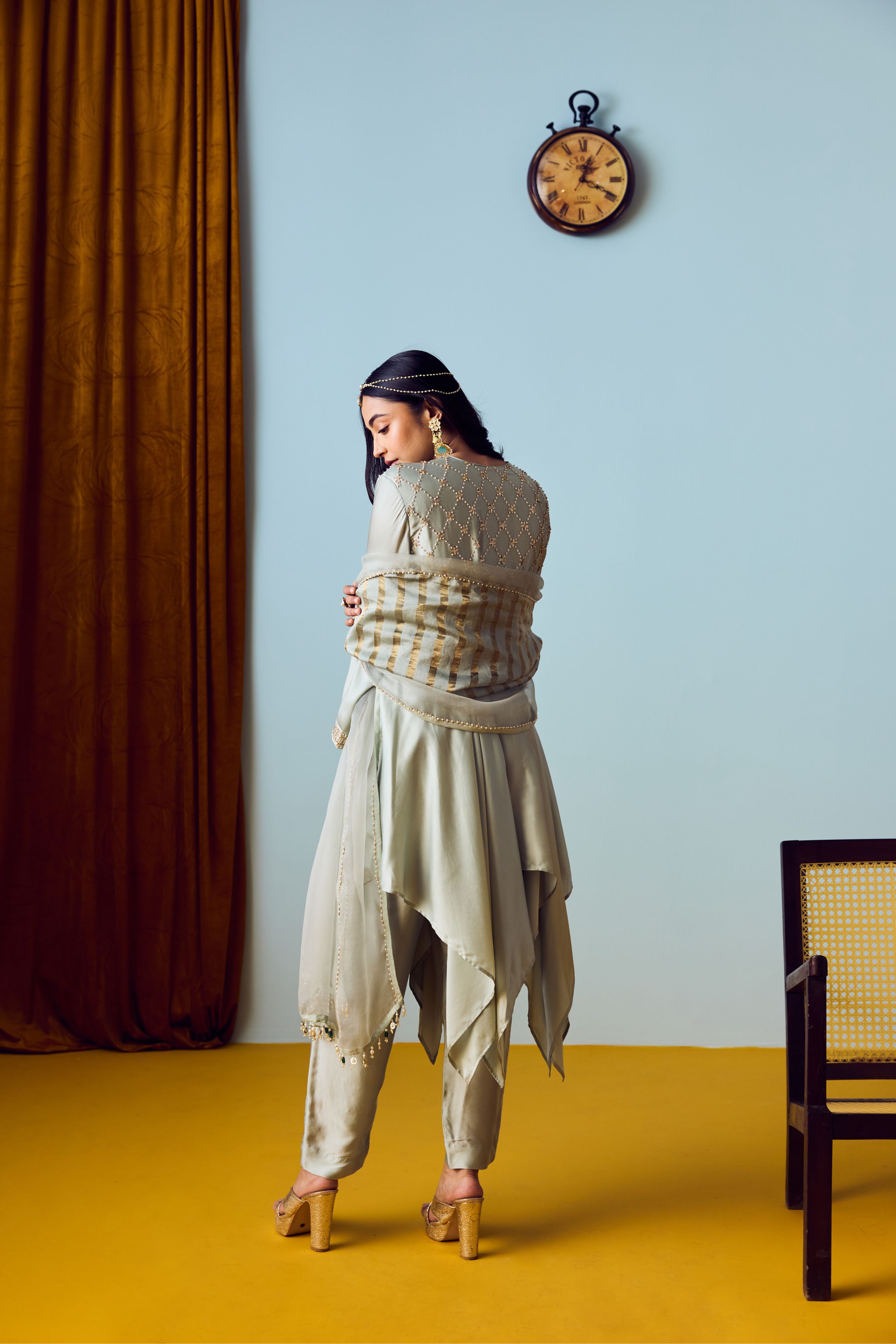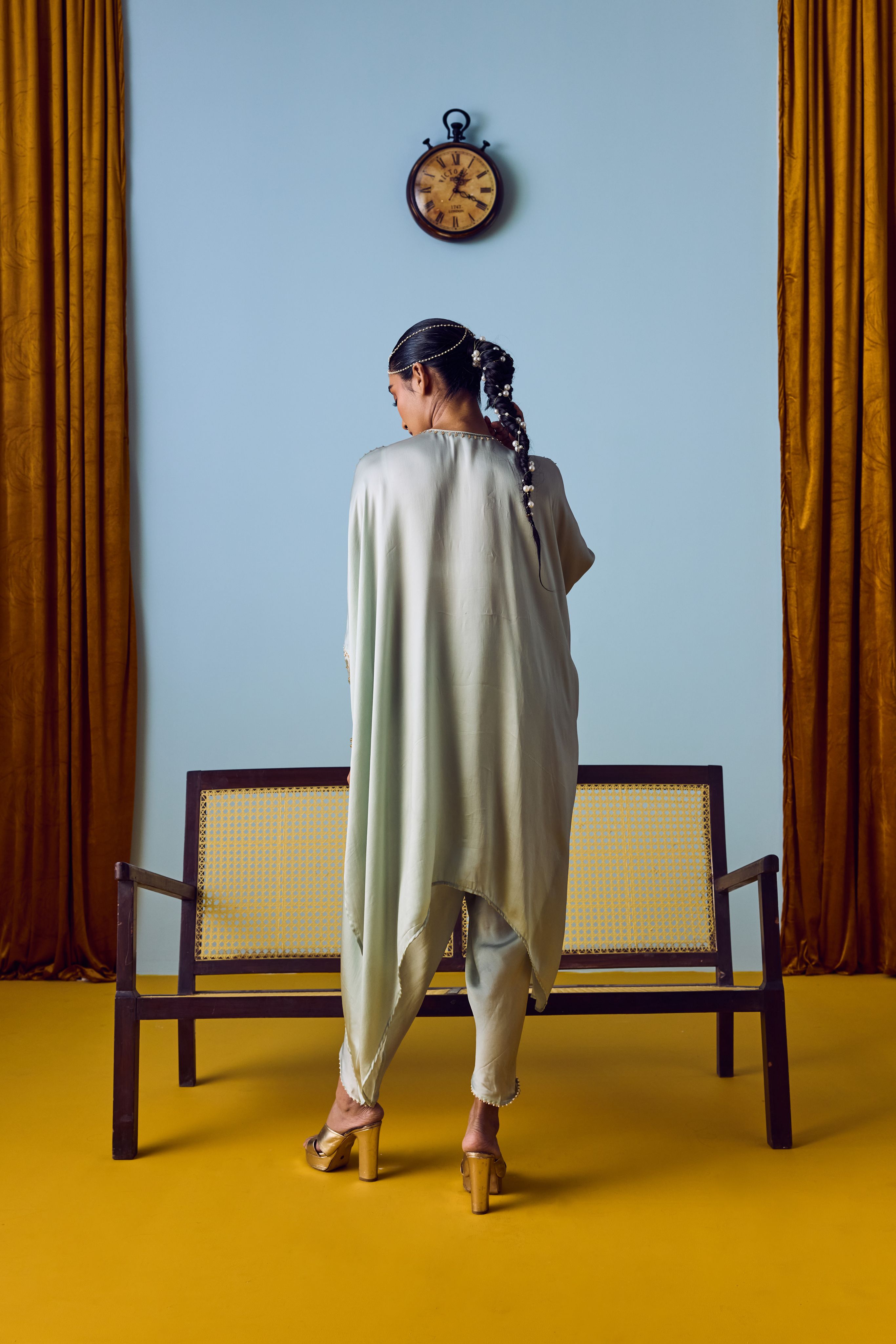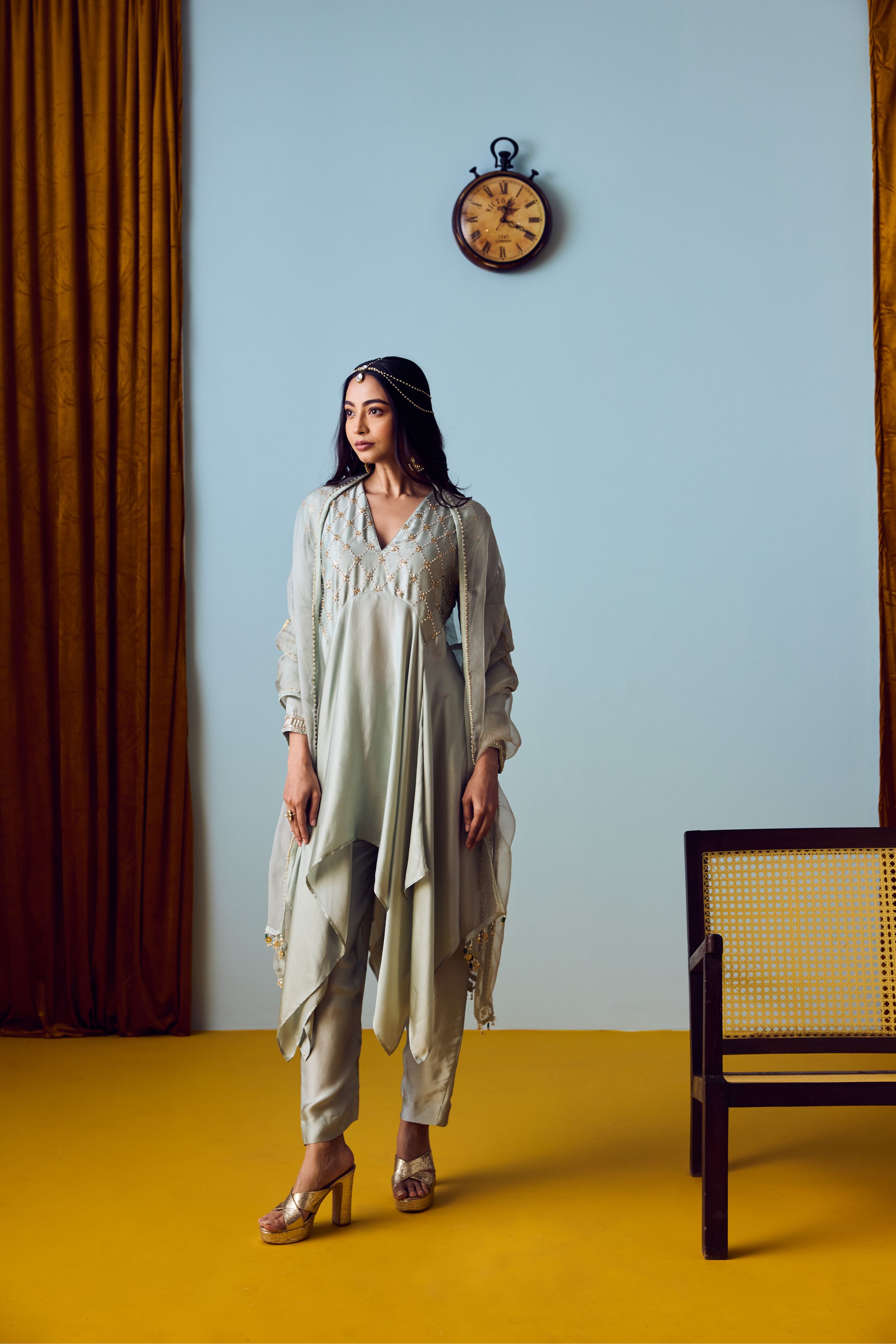 Raso Sage Green Hand-Embroidered Tunic with Tulip Pants