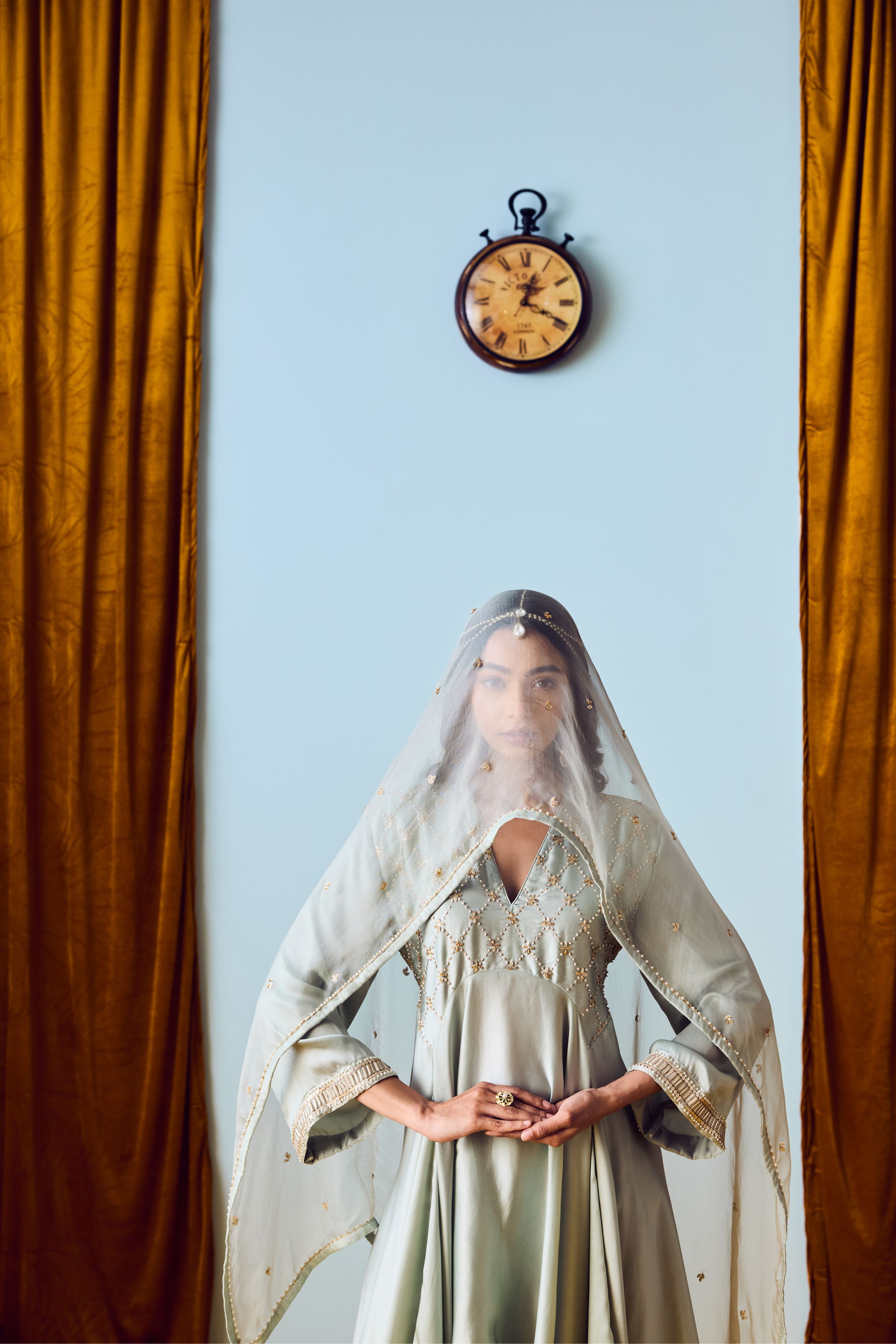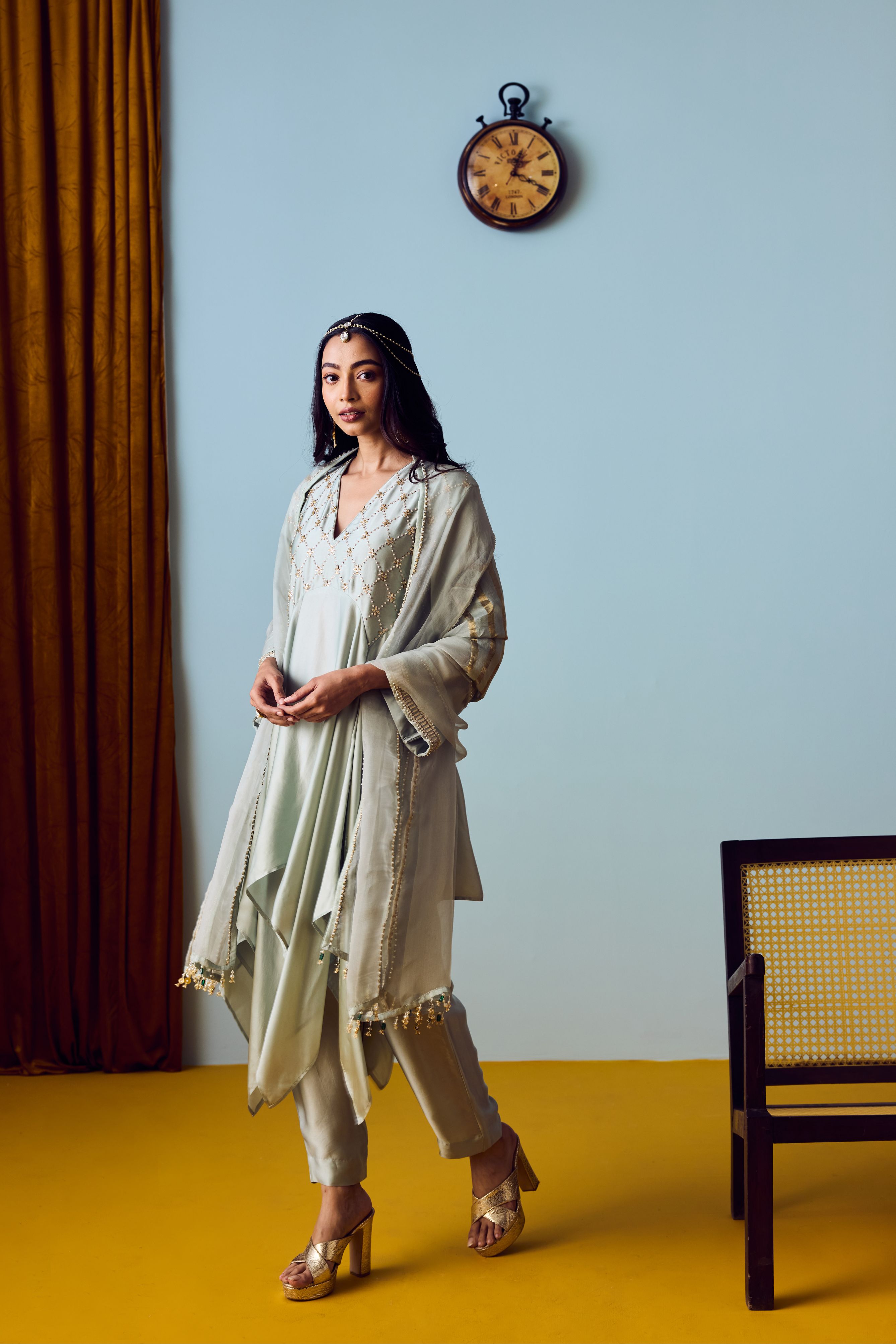 Sureen Festive Asymmetric Sage Green Kurta Set with Dupatta
