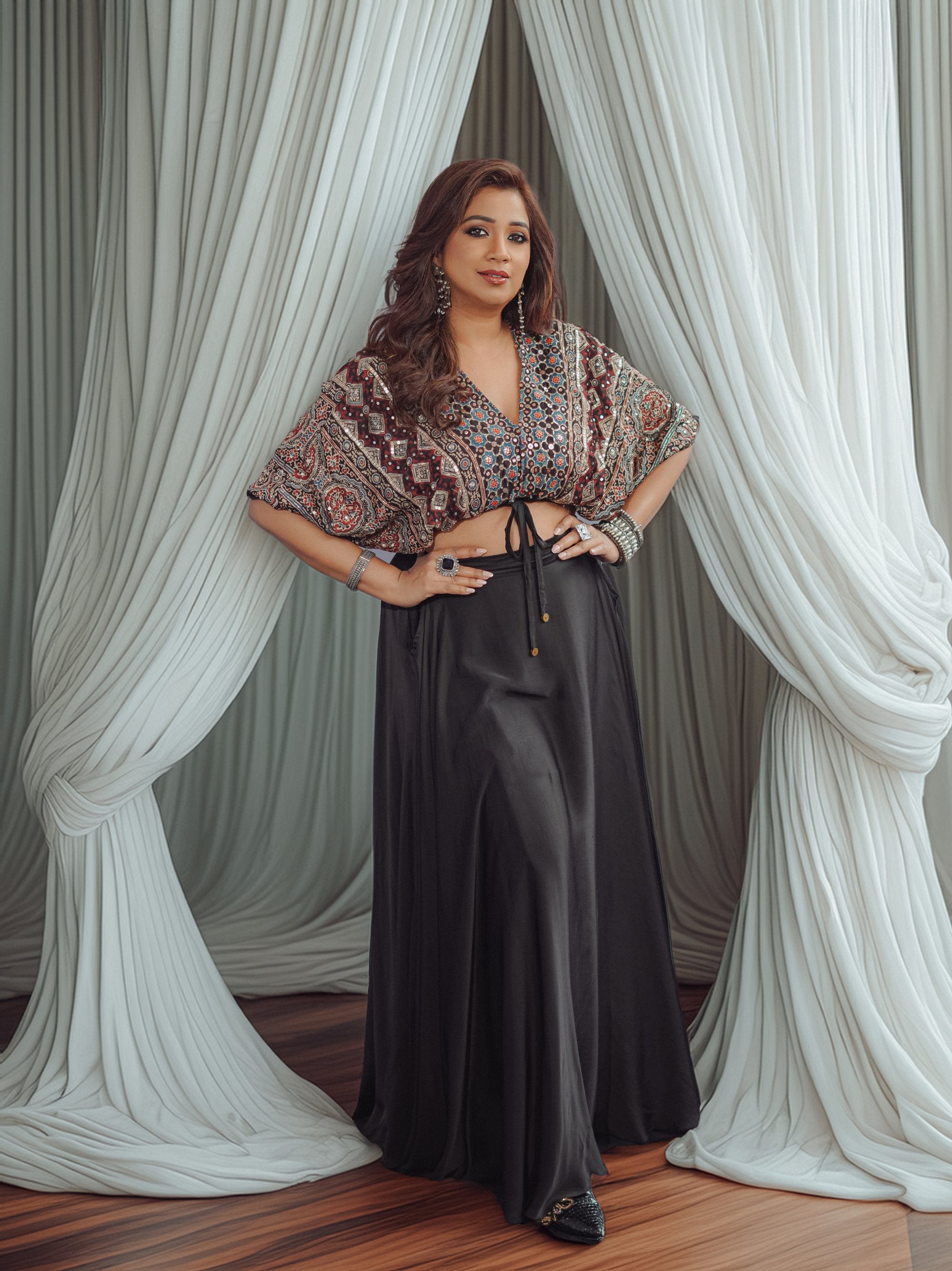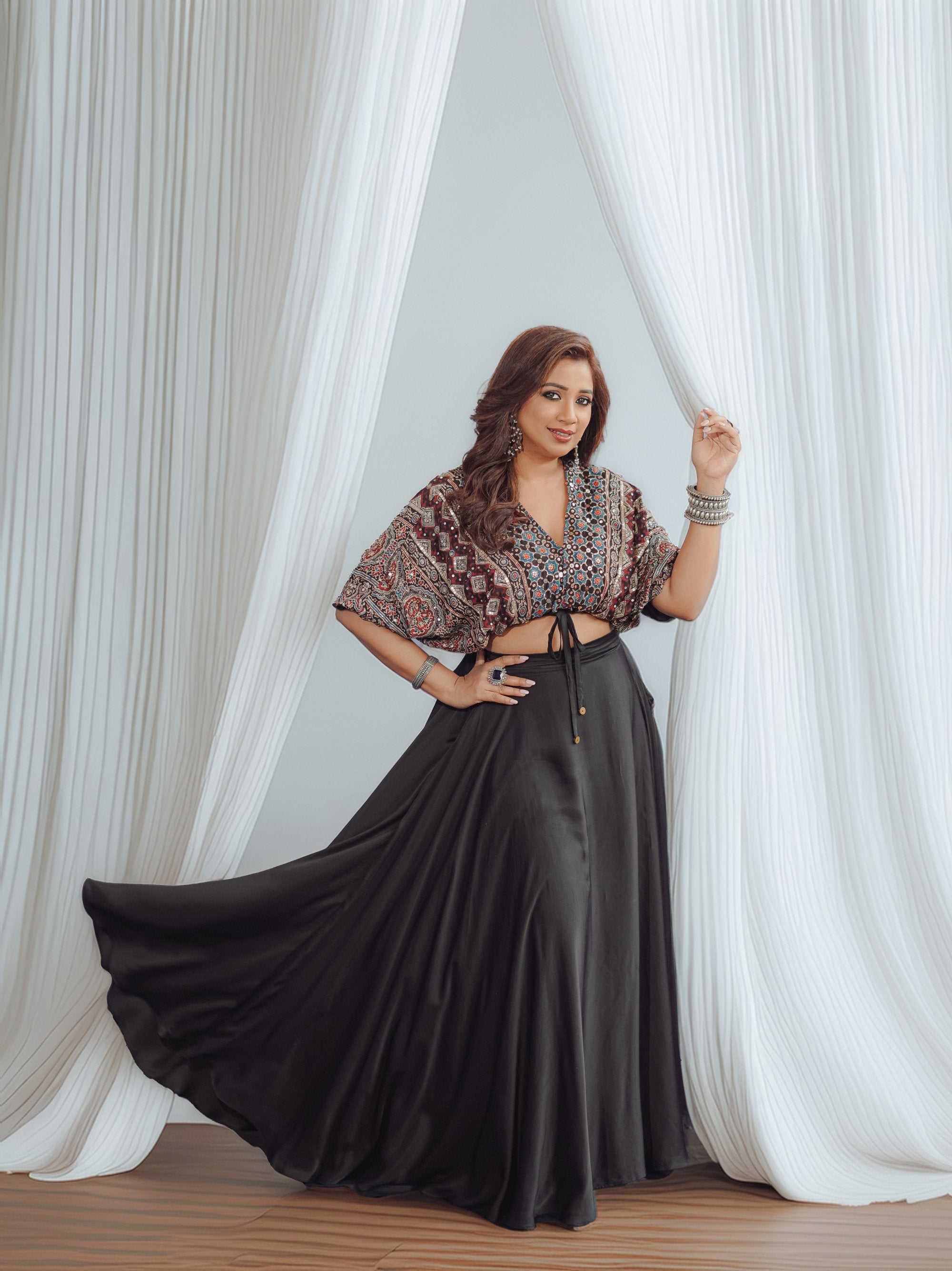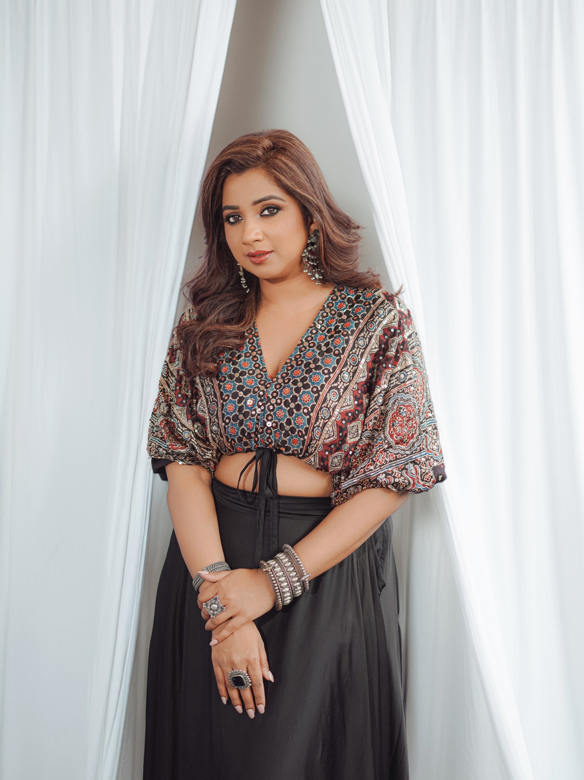 Shreya Ghoshal In Classic Ajrakh Oversize Top + Flair Skirt
