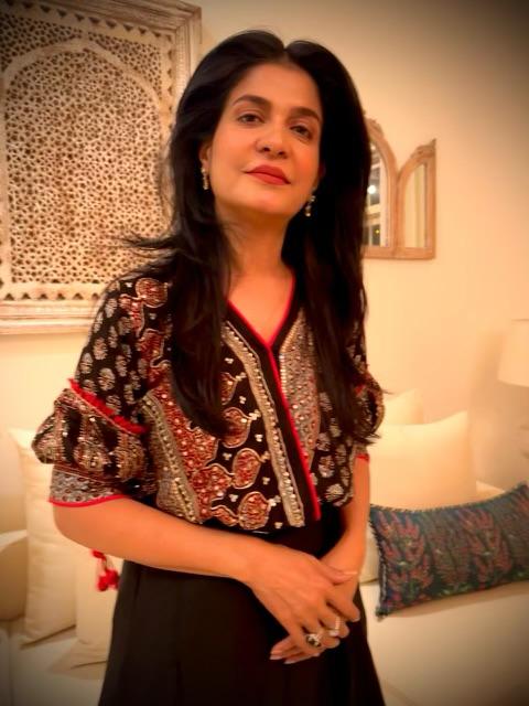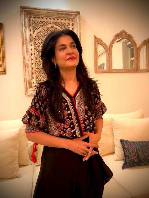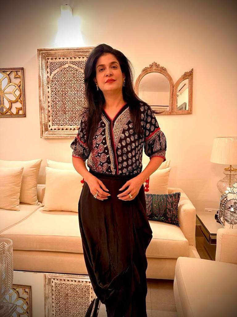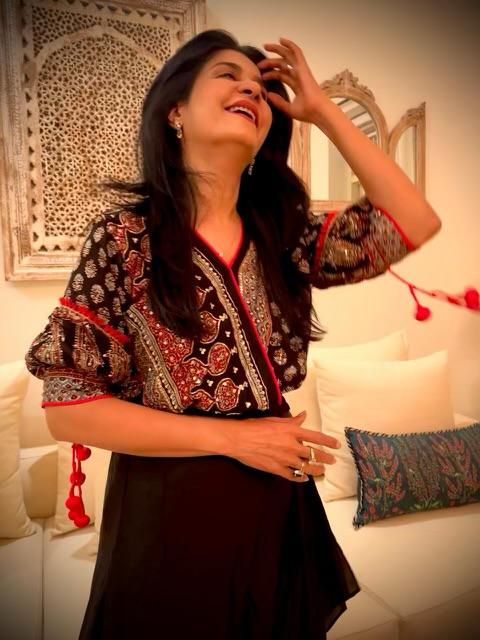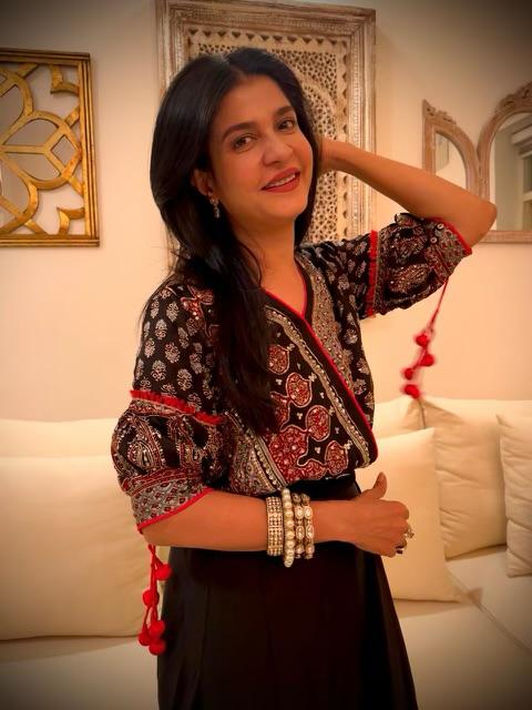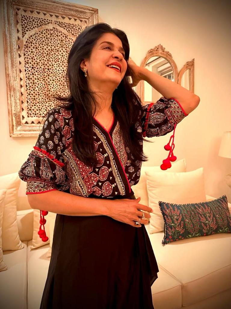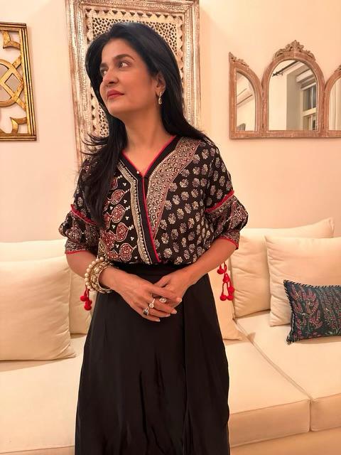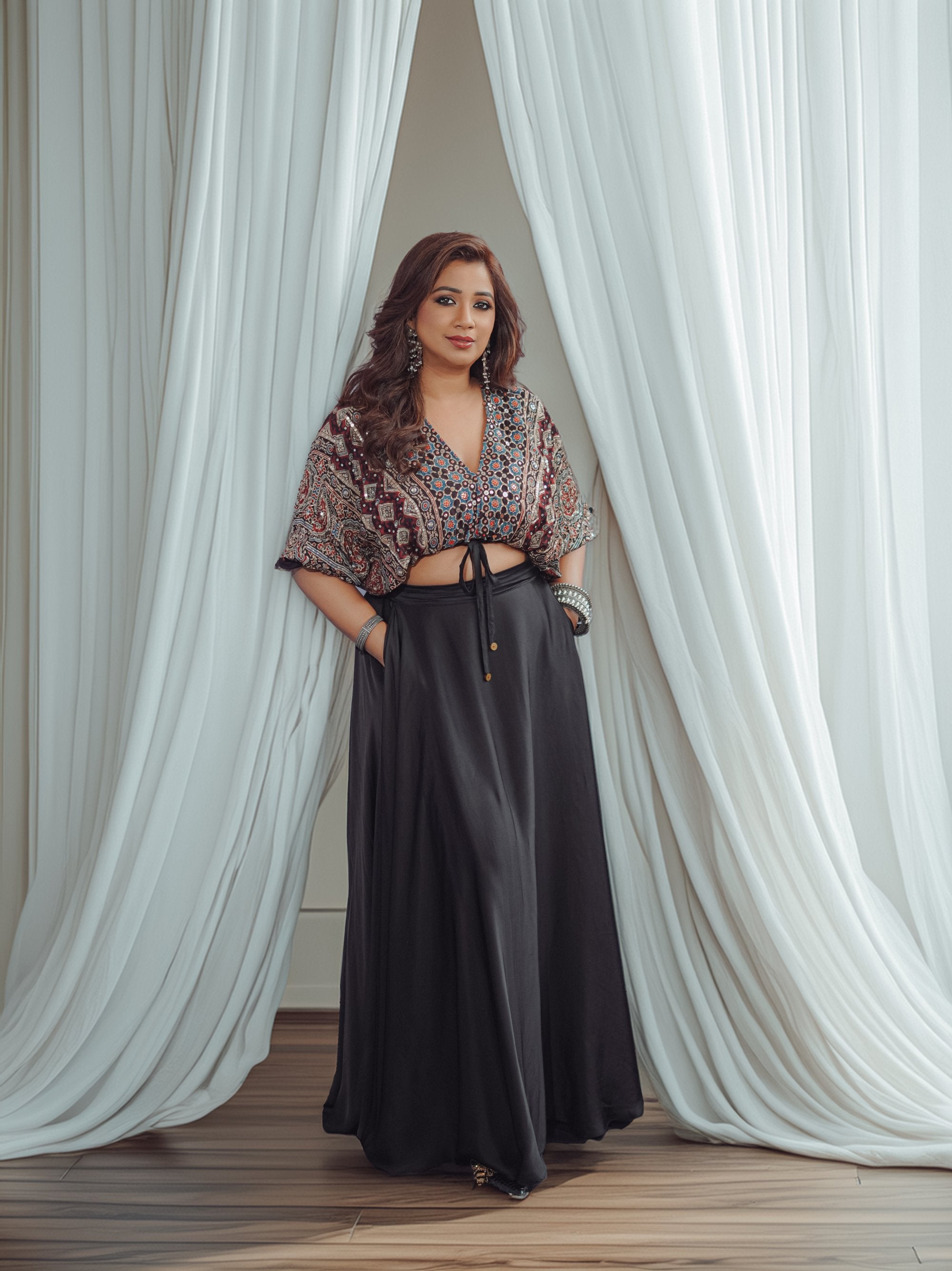 Shreya Ghoshal In Classic Ajrakh Oversize Top + Flair Skirt