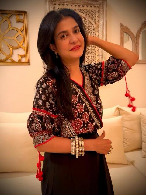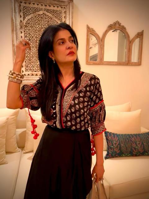 Anjana Om Kashyap in Ajrakh Overlap crop top with Flap Cowl Skirt