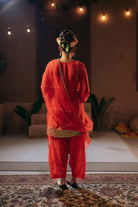 Elevate your festive wardrobe with this wardrobe-essential Salwar Kameez Kurta set featuring vegan leather appliqué in a light gold, gota-inspired design. The relaxed-fit kurta is paired with a coordinating salwar and a delicate dupatta in organza silk. Model wears size S.