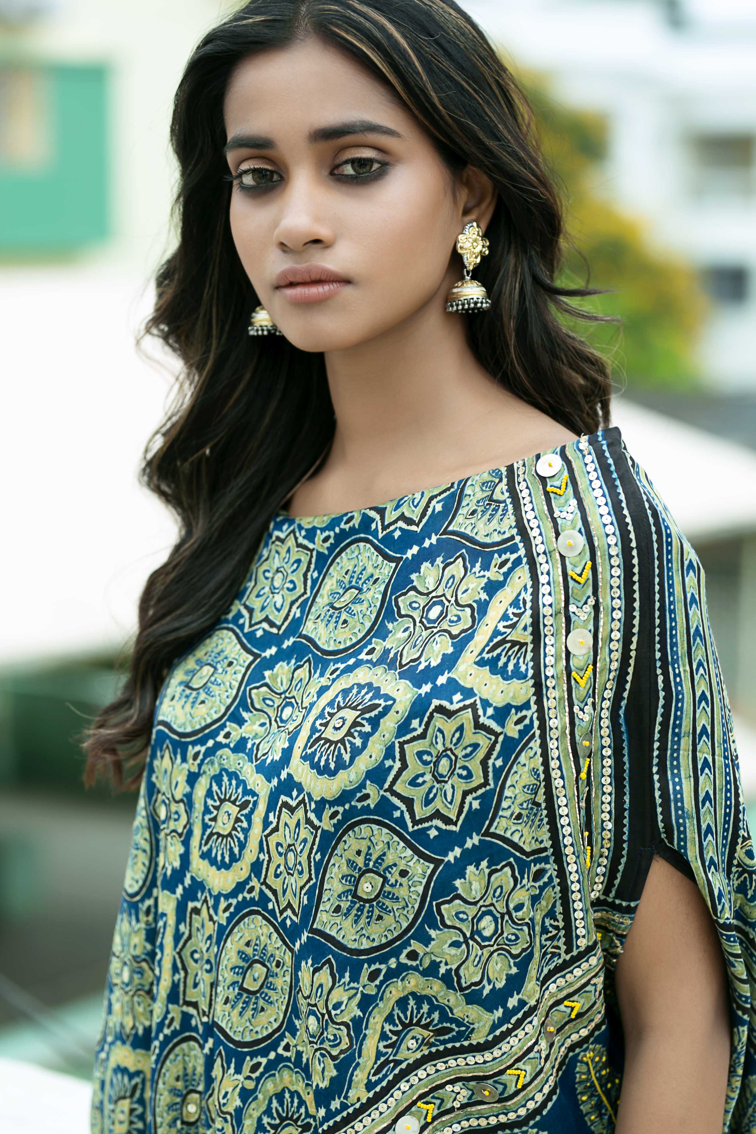 Check out our Hand-Embroidered Ajrak Anti-Fit Asymmetric Dress, a stunning creation dyed in organic indigo colors and crafted through a detailed twenty hand processes. This dress blends traditional Ajrakh techniques with a contemporary anti-fit asymmetric design. Its artisanal elegance, combined with versatility and style, makes it a lasting value for your wardrobe.