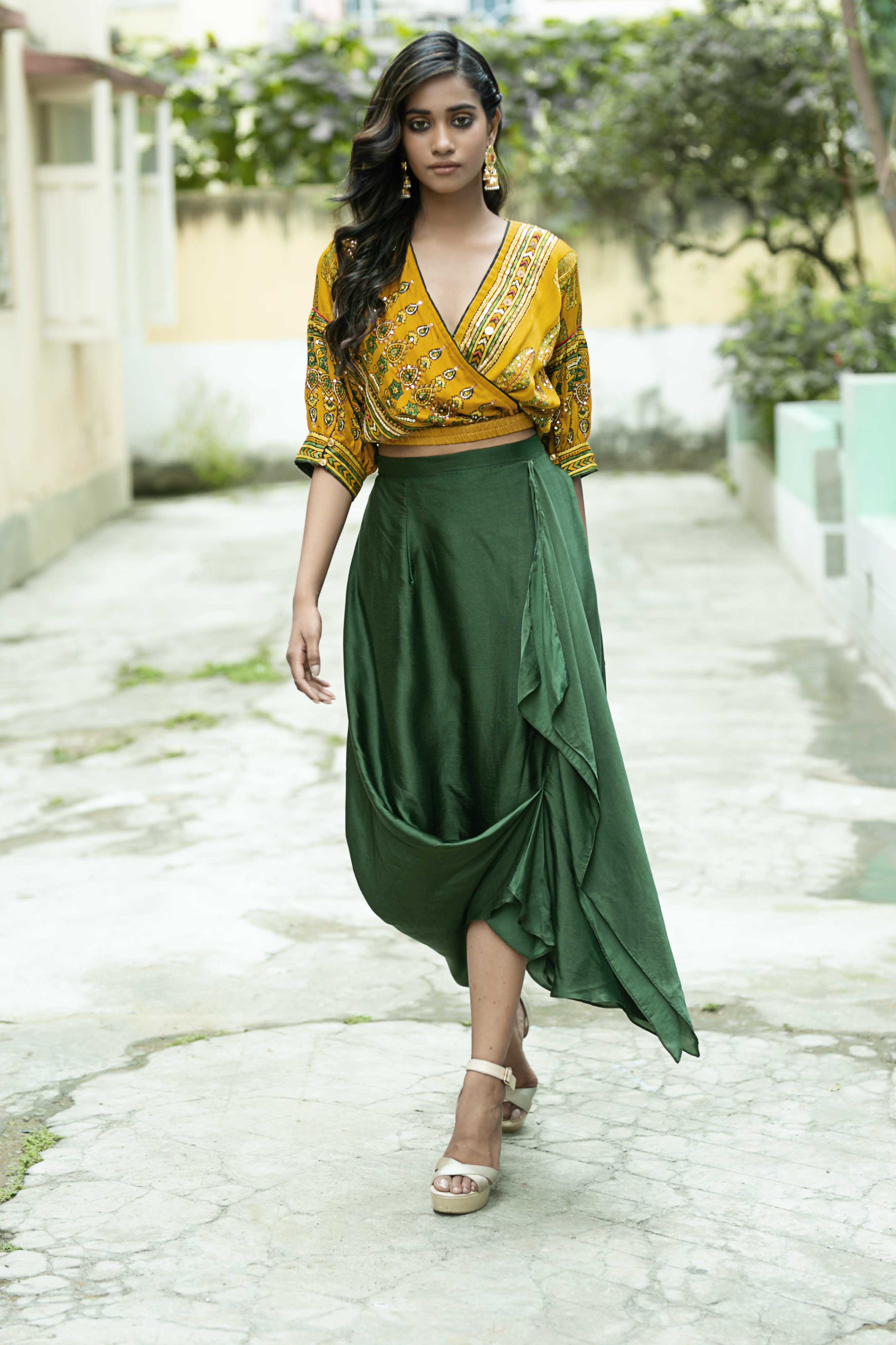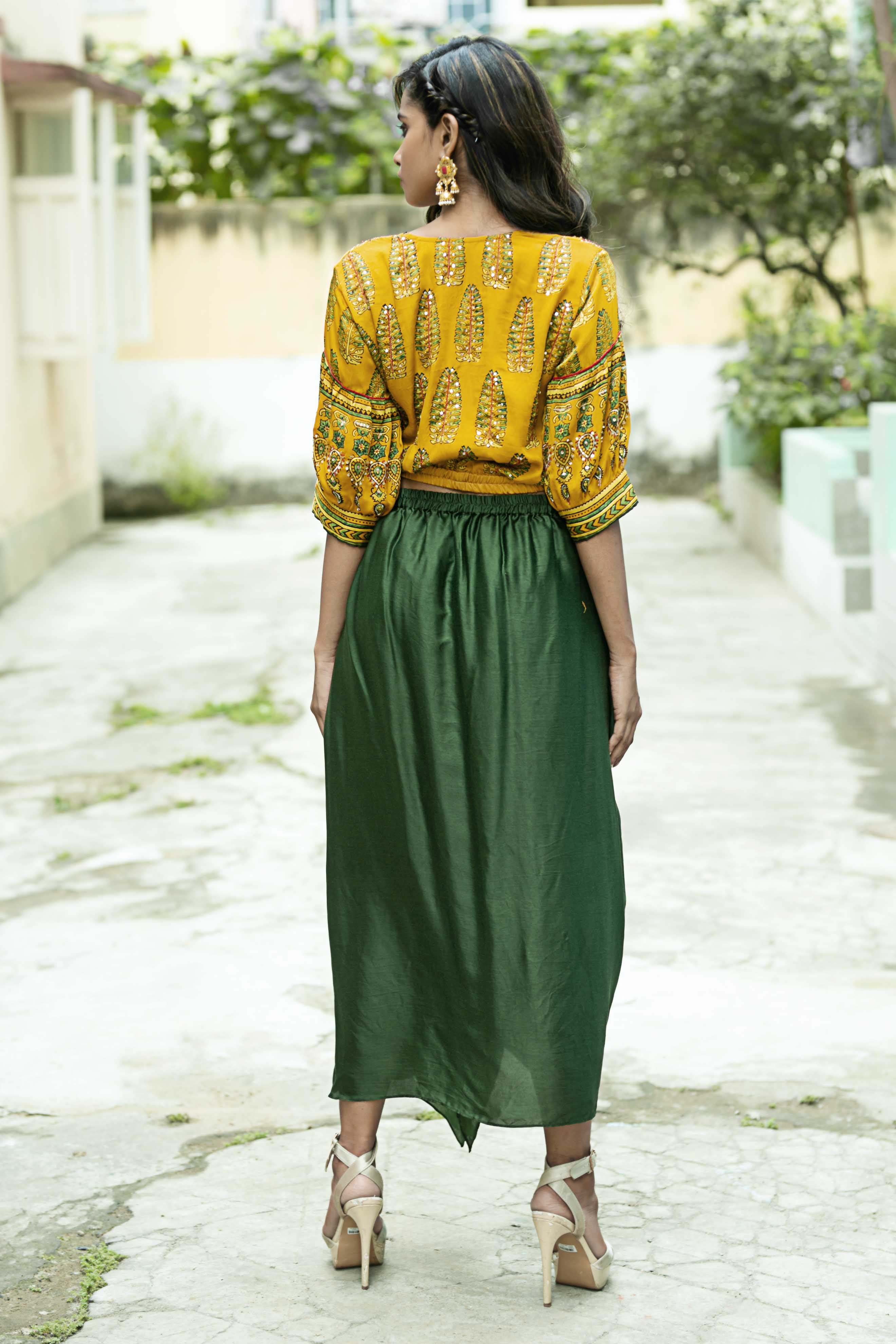 Mustard Ajrakh Overlap crop top with Flap Cowl Skirt
