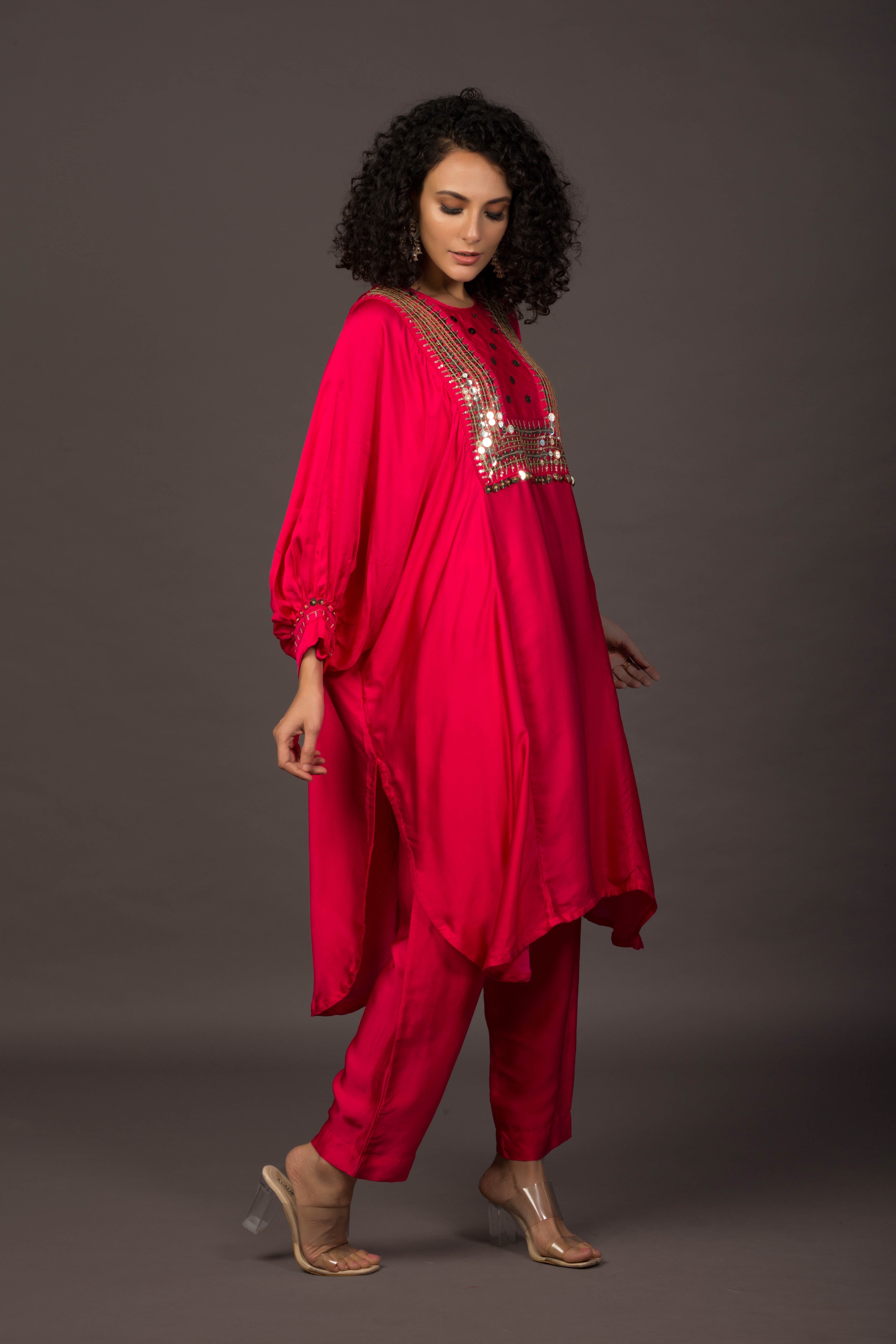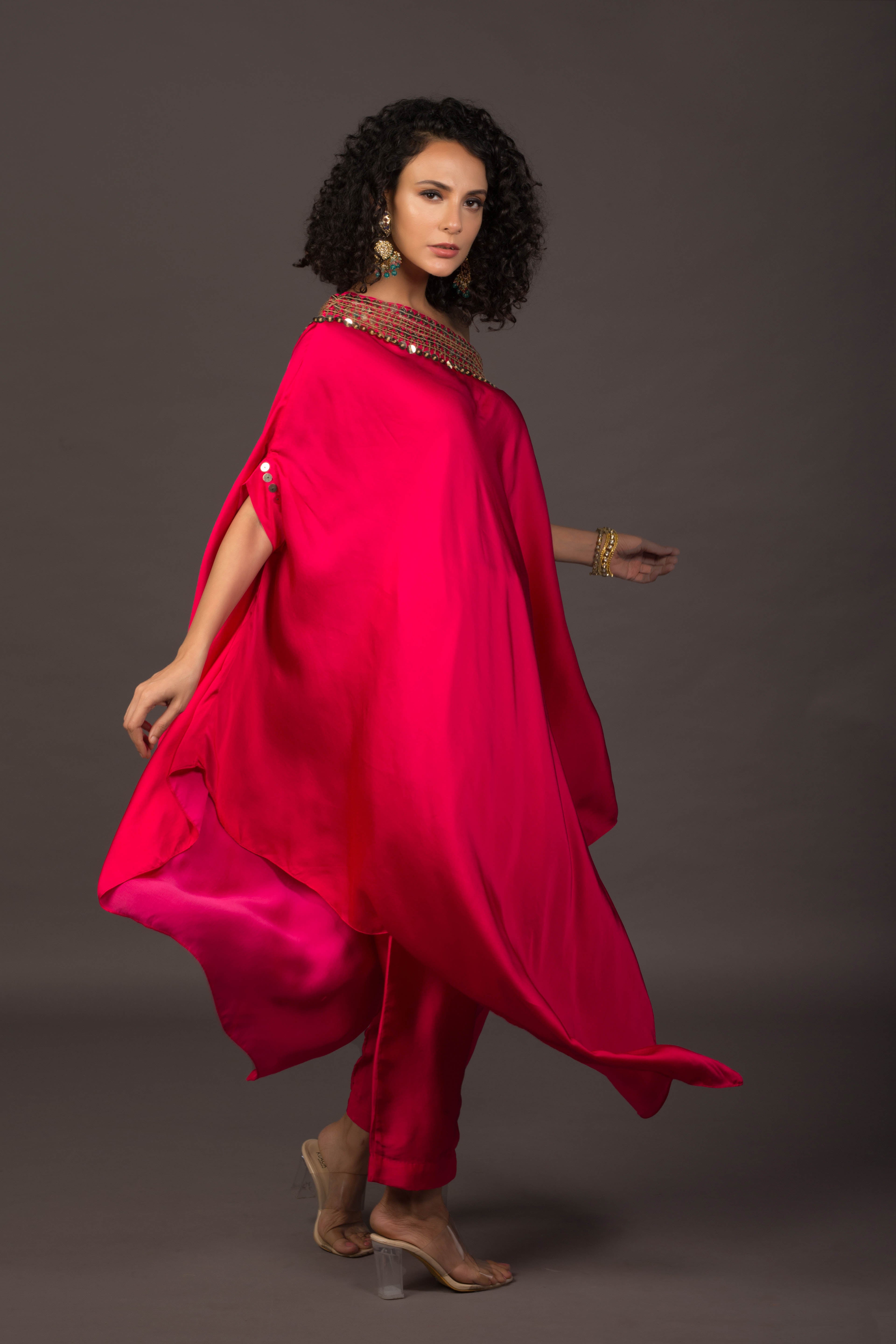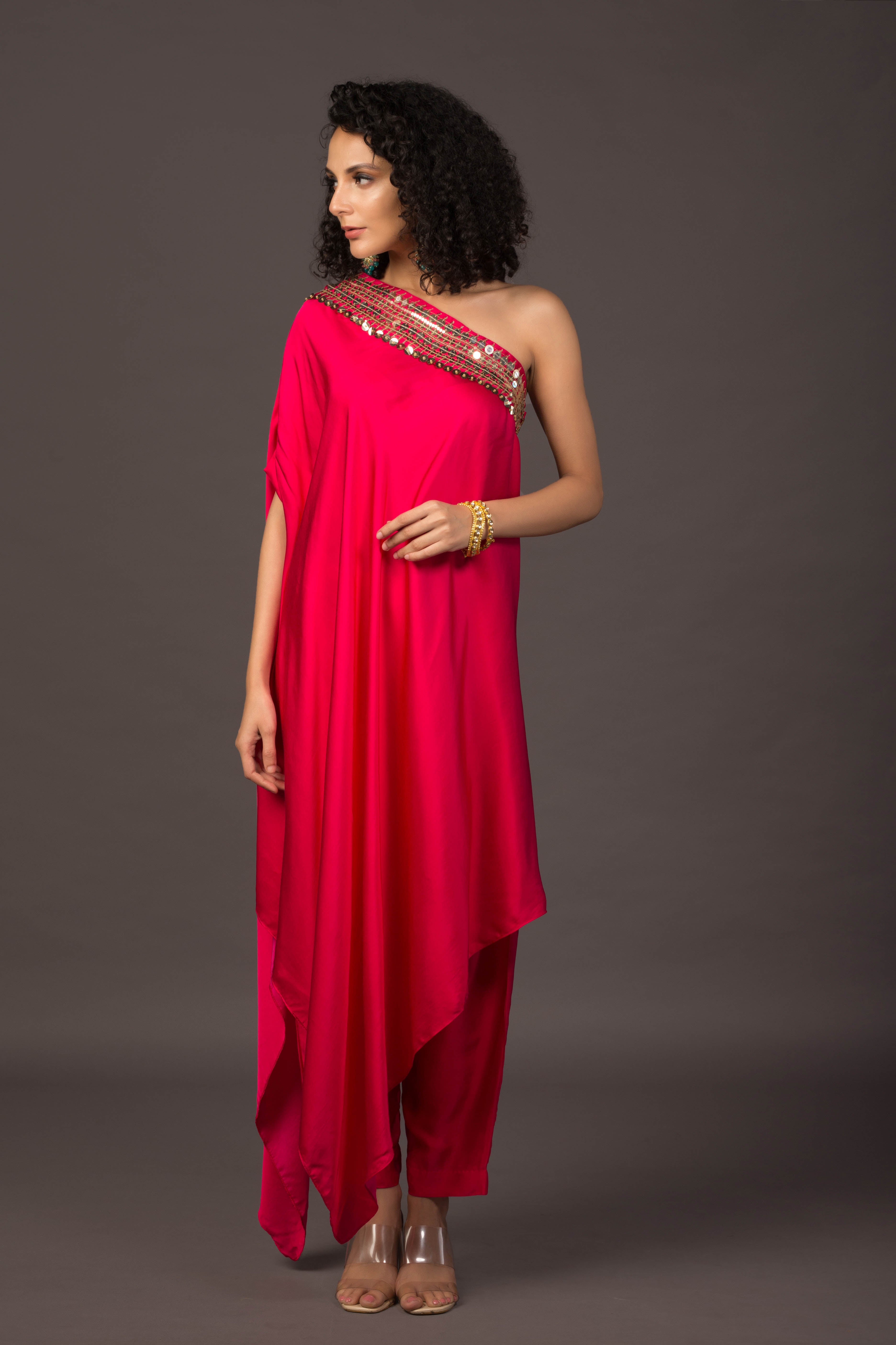 Glow Pink Asymmetric Kaftaan with Pants