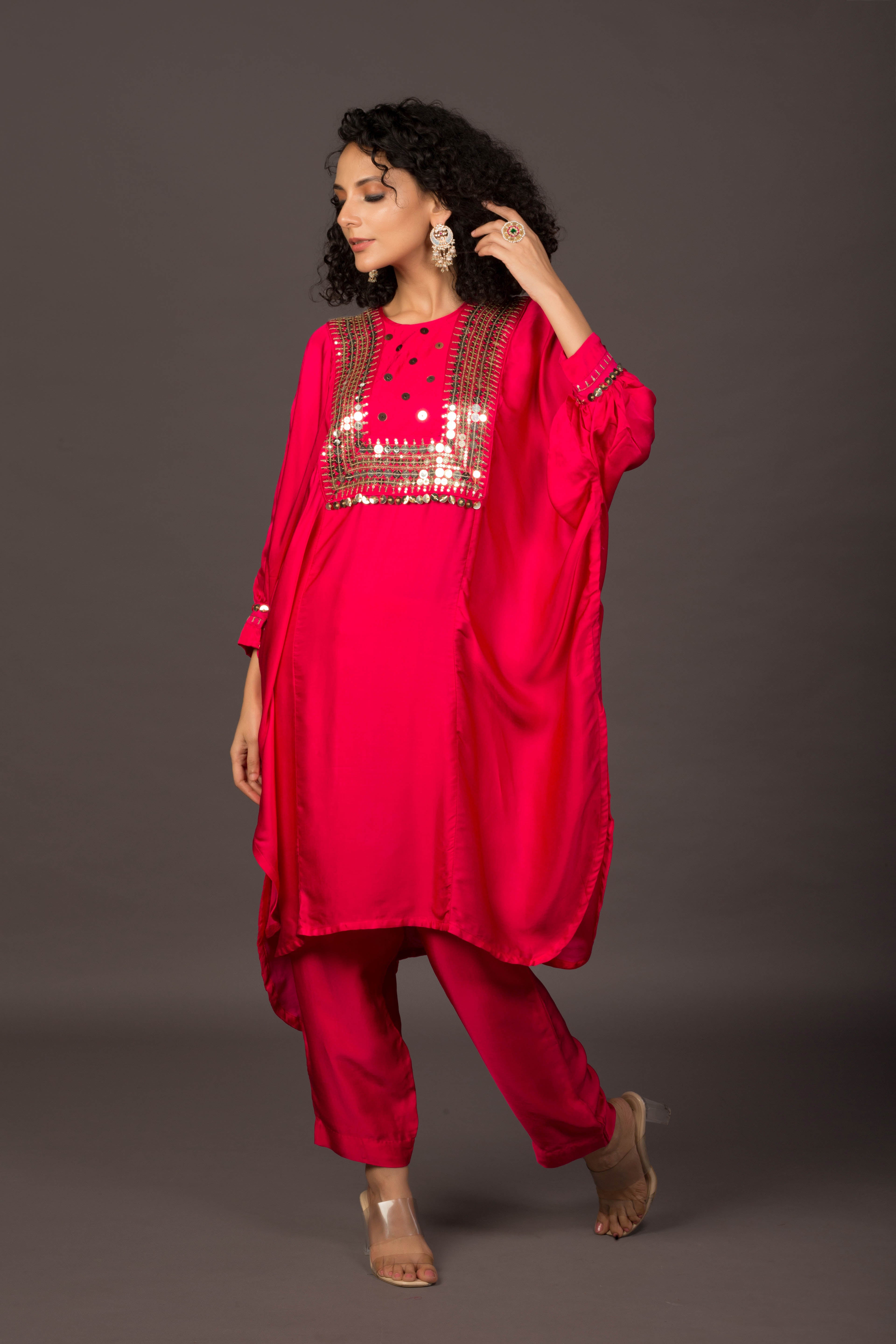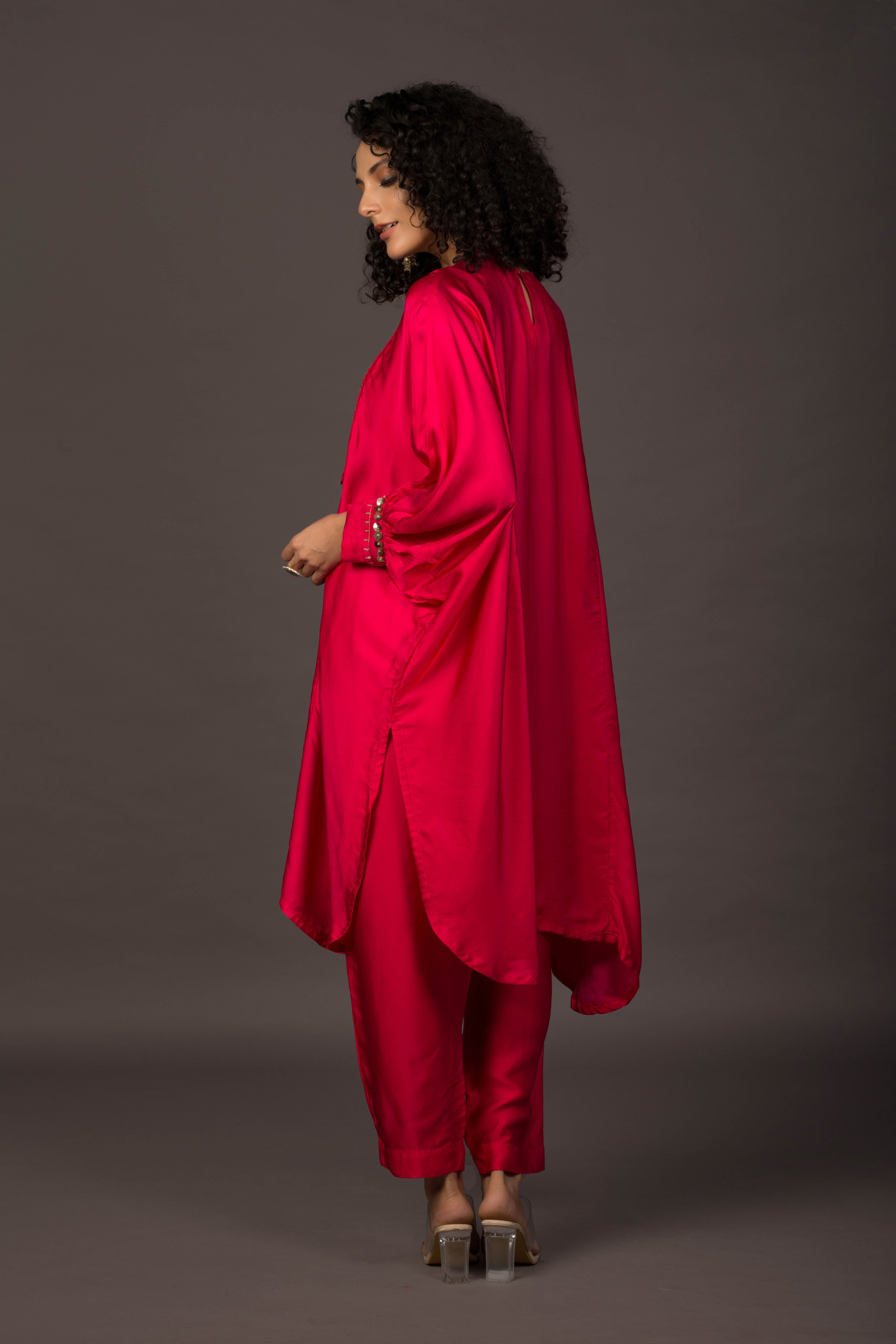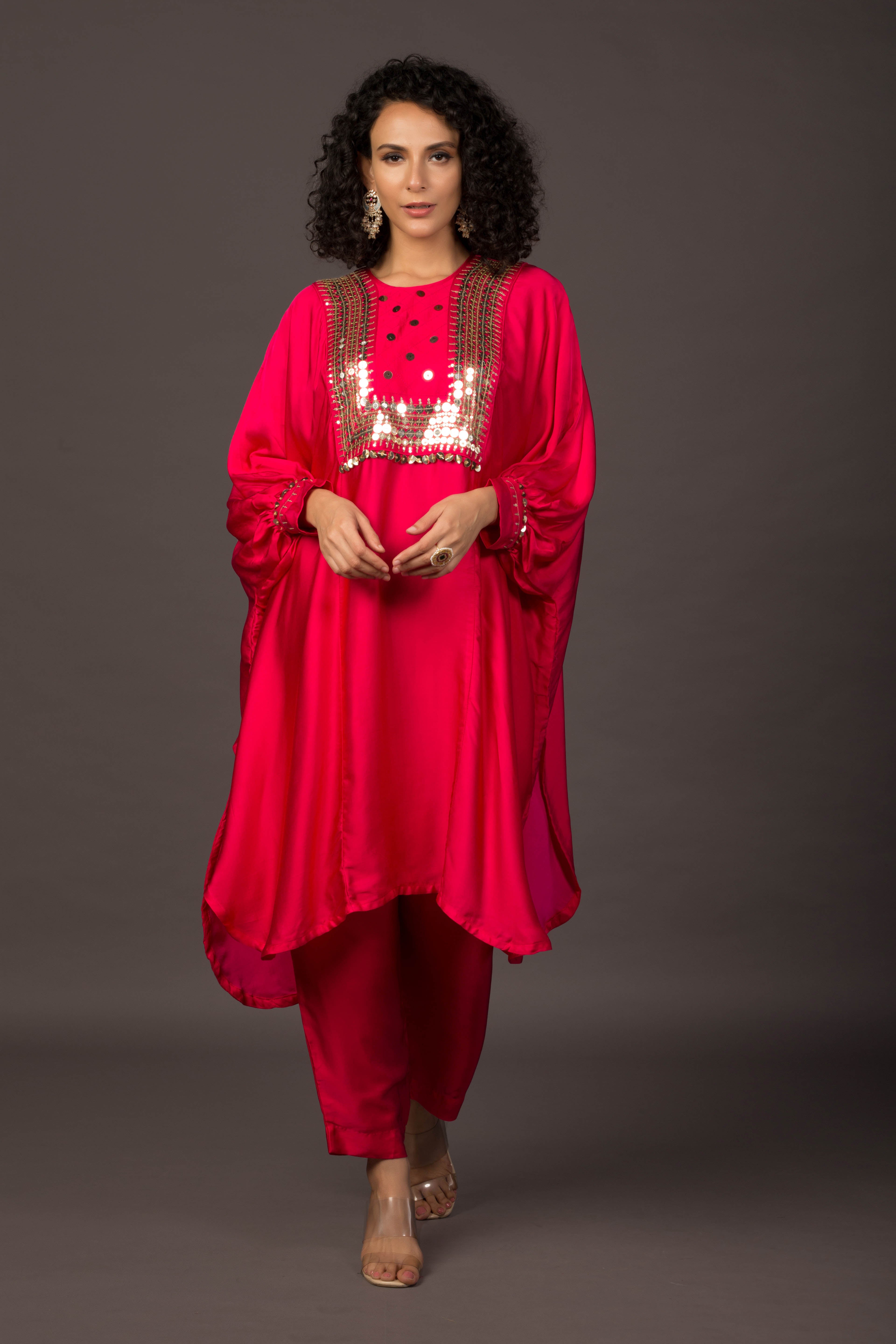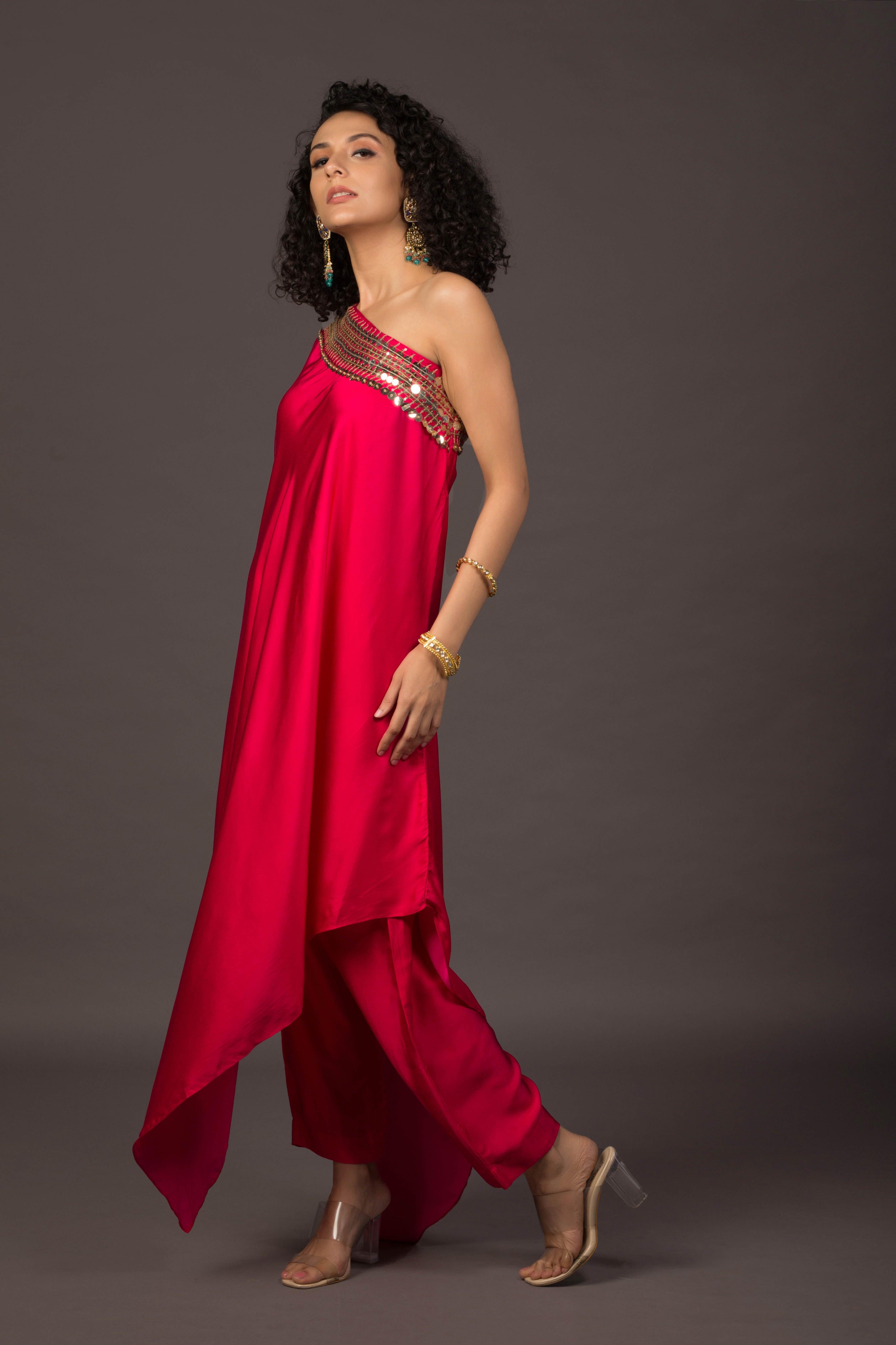Glow Pink Asymmetric Kaftaan with Pants