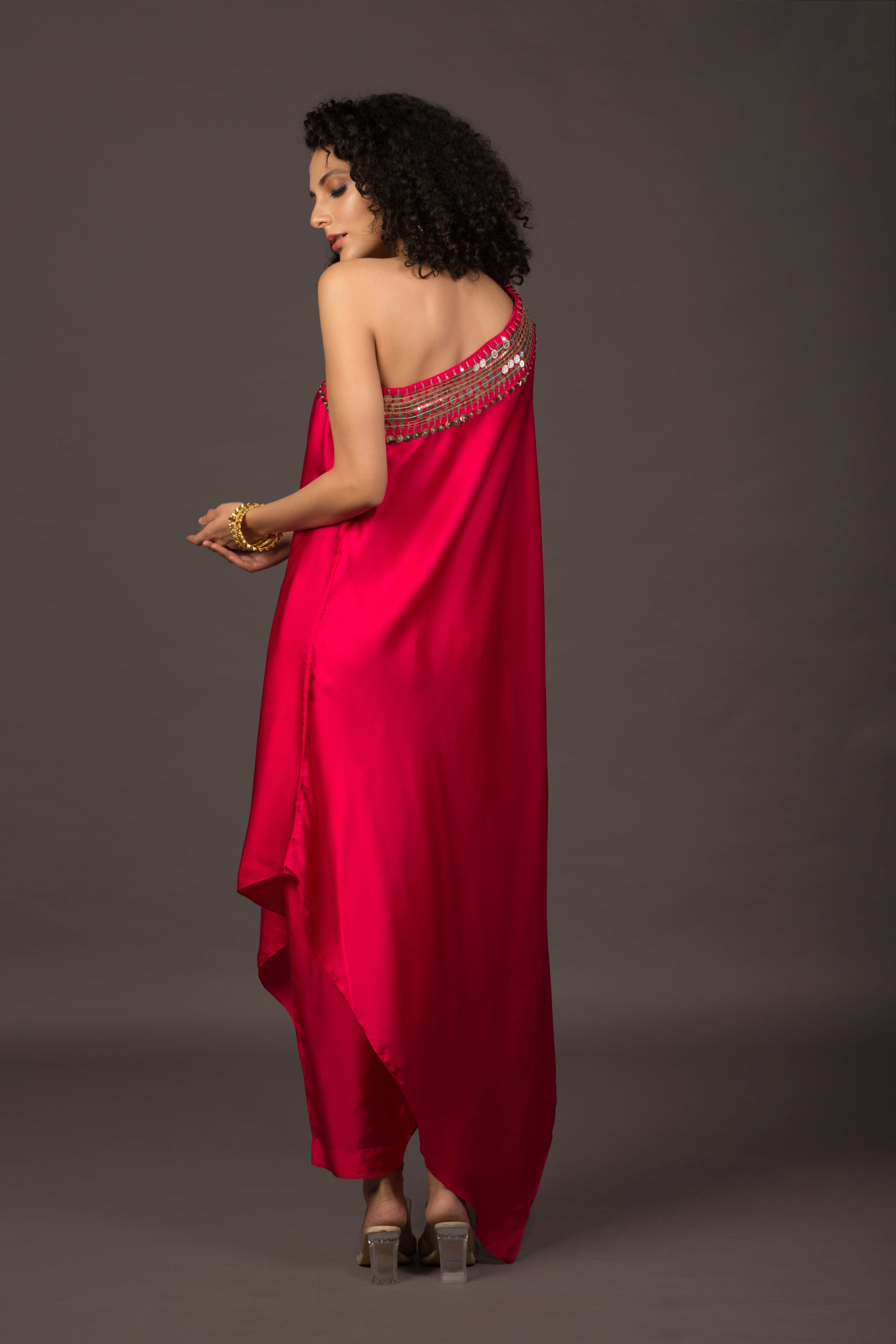 Glow Pink Asymmetric Kaftaan with Sticthed Wrap Skirt