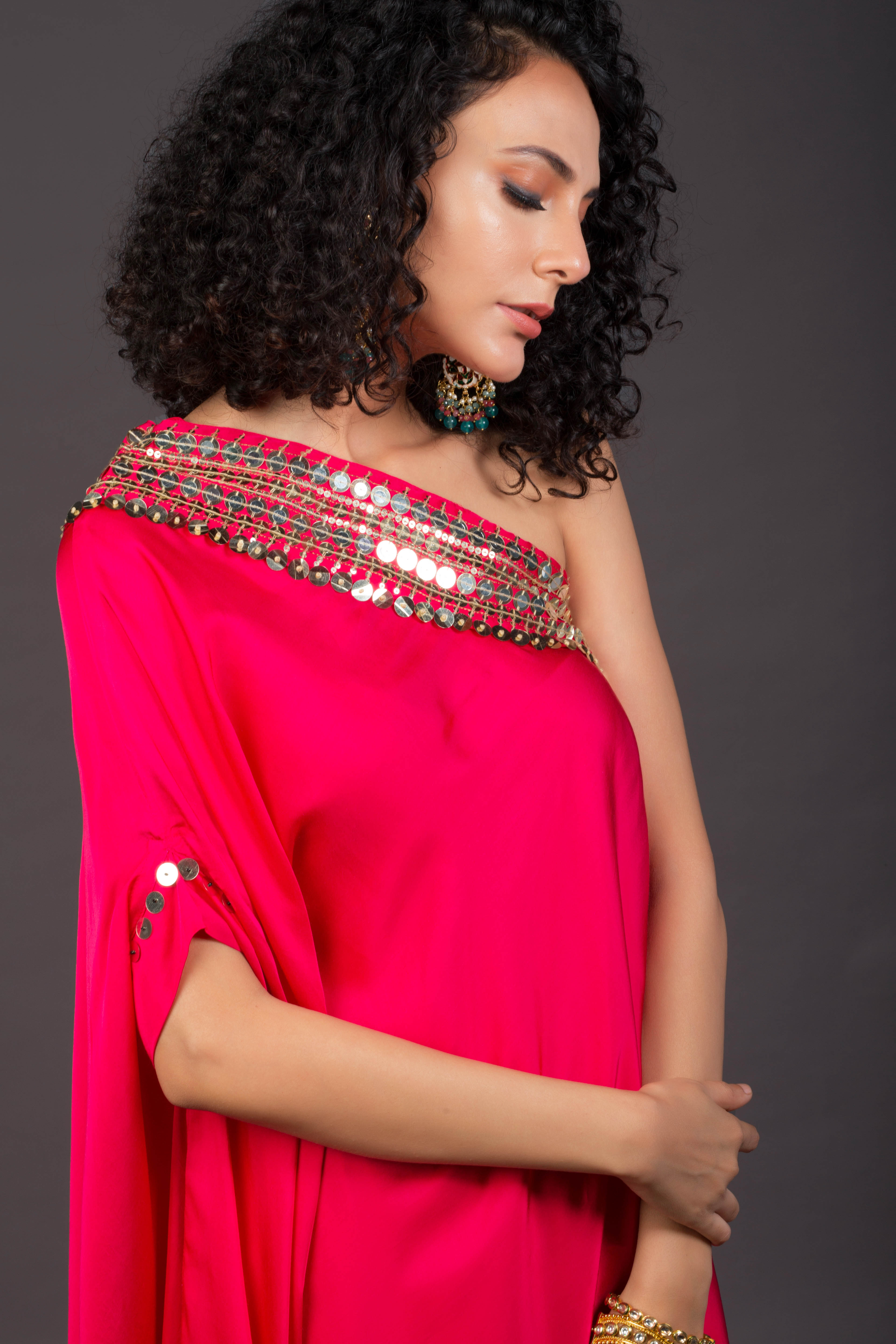 Glow Pink Off Shoulder Asymmetric Kaftaan with Pants