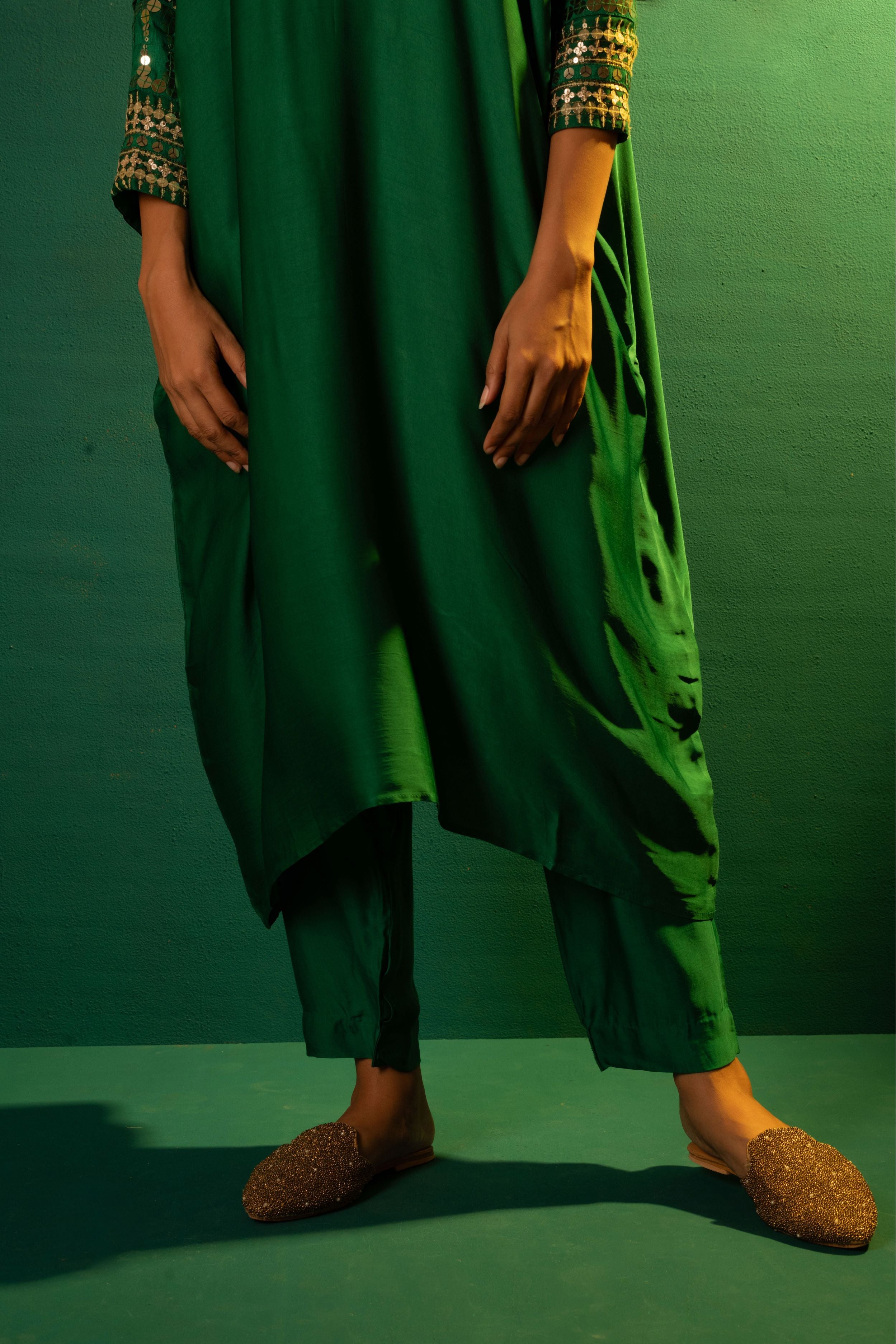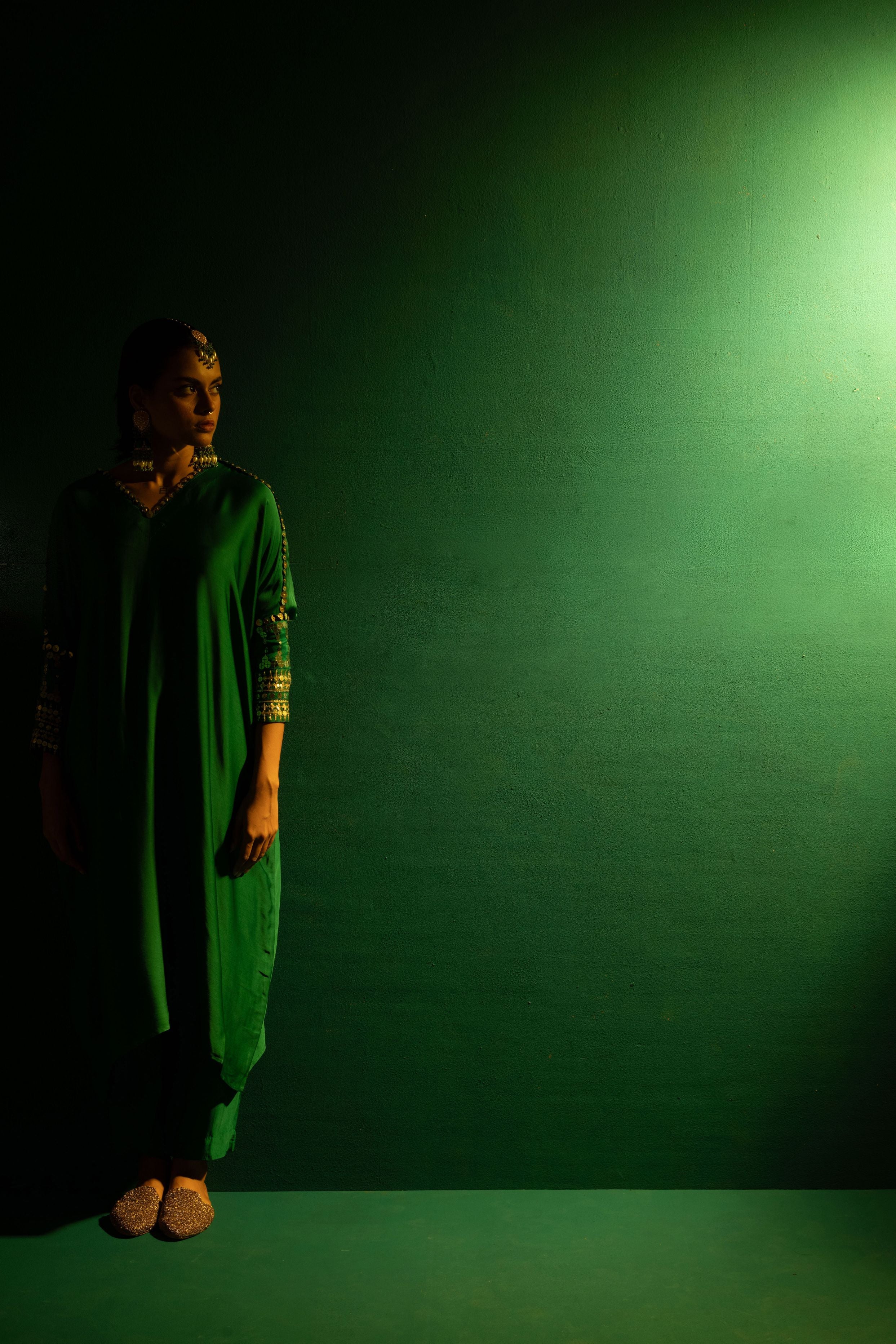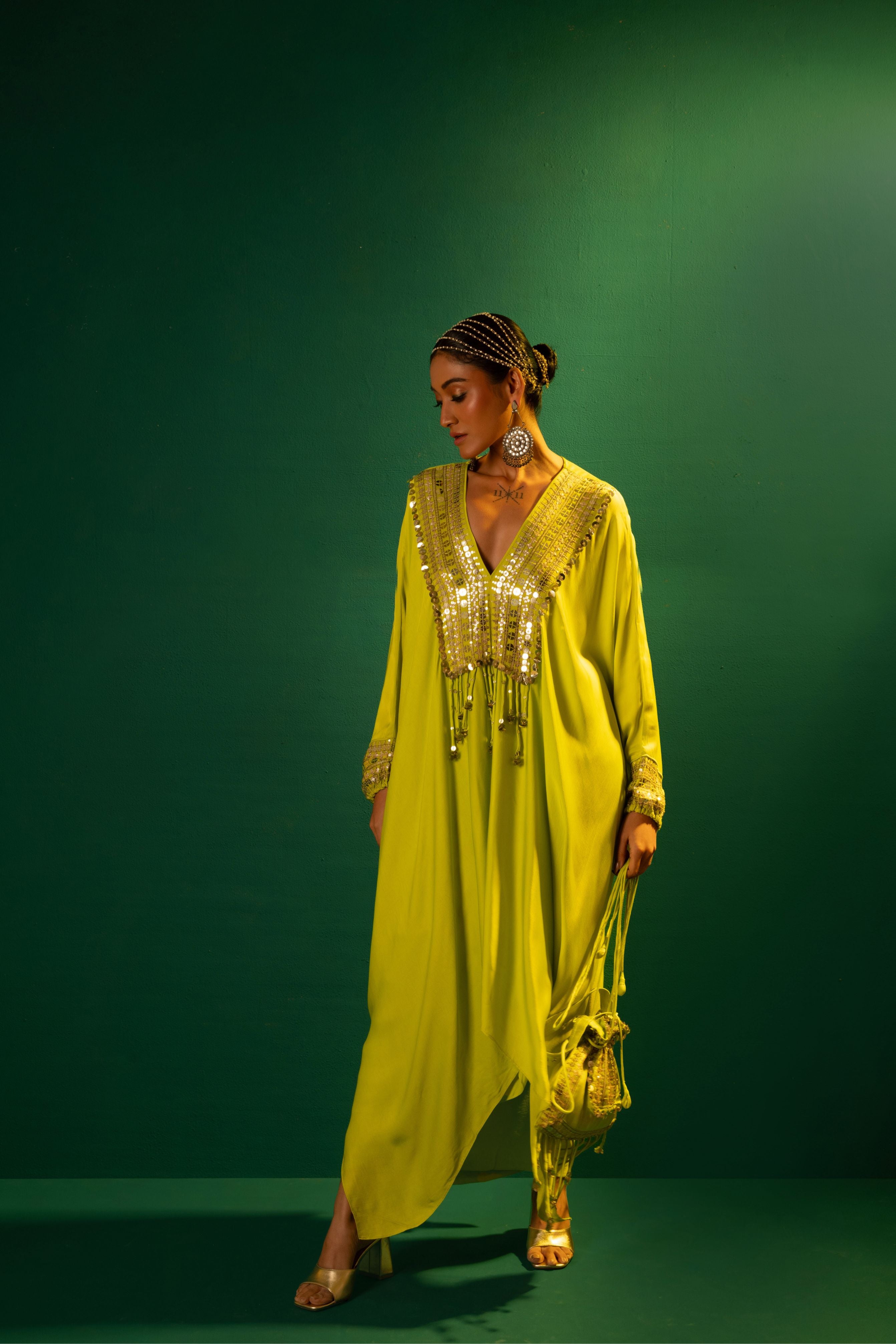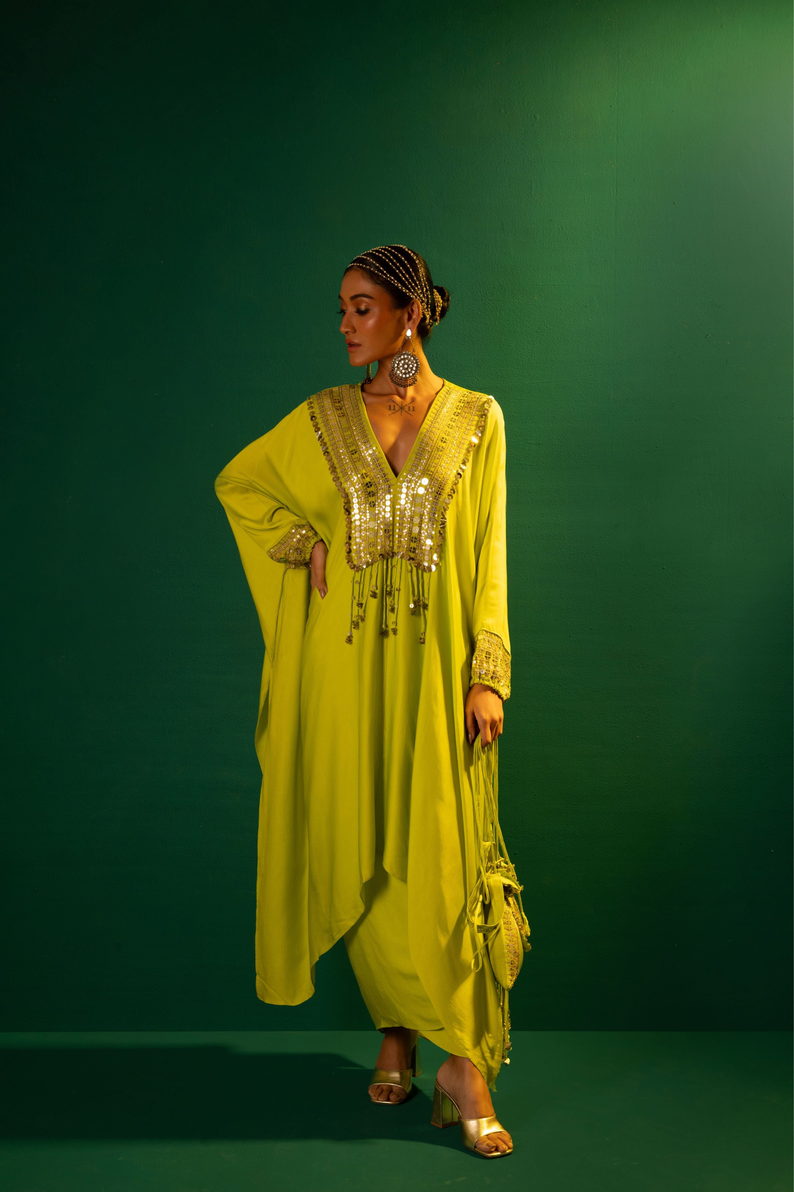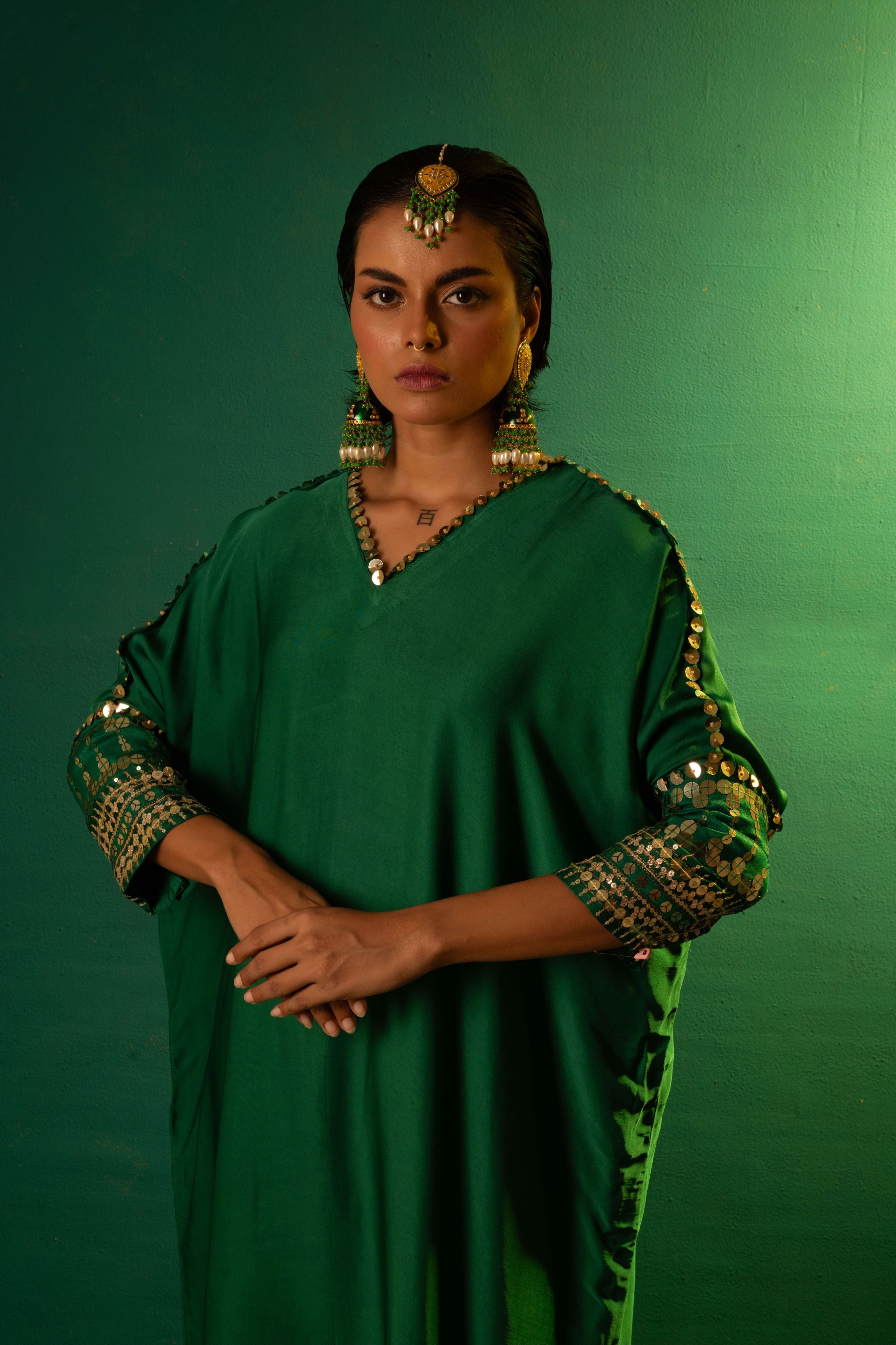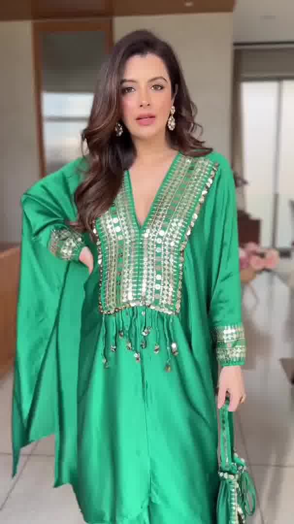 Natsha Luthra in Morrocon Green Kaftaan with Tie Up Wrap Skirt