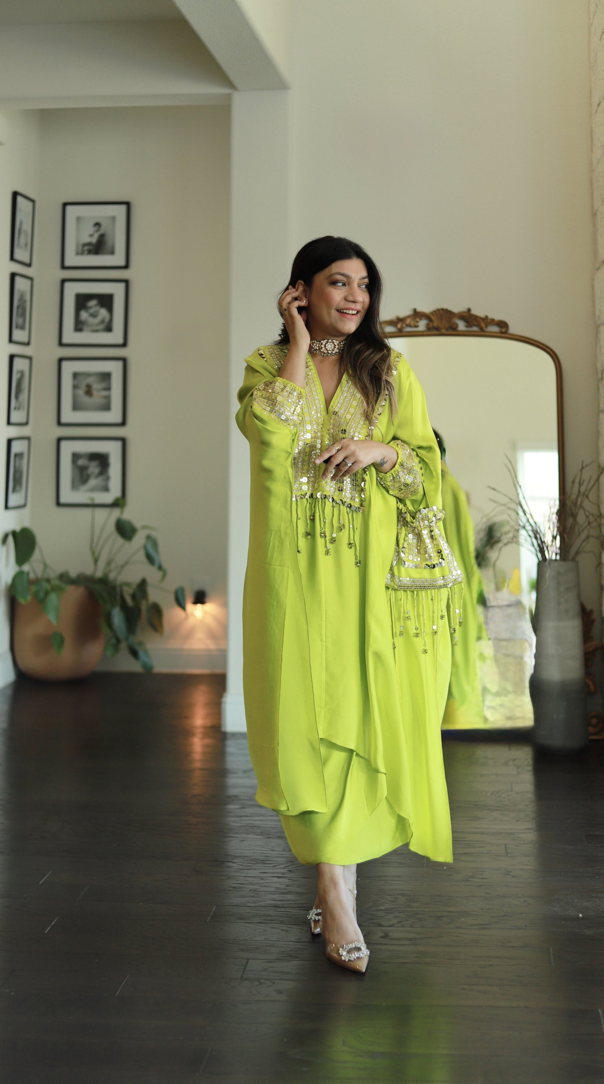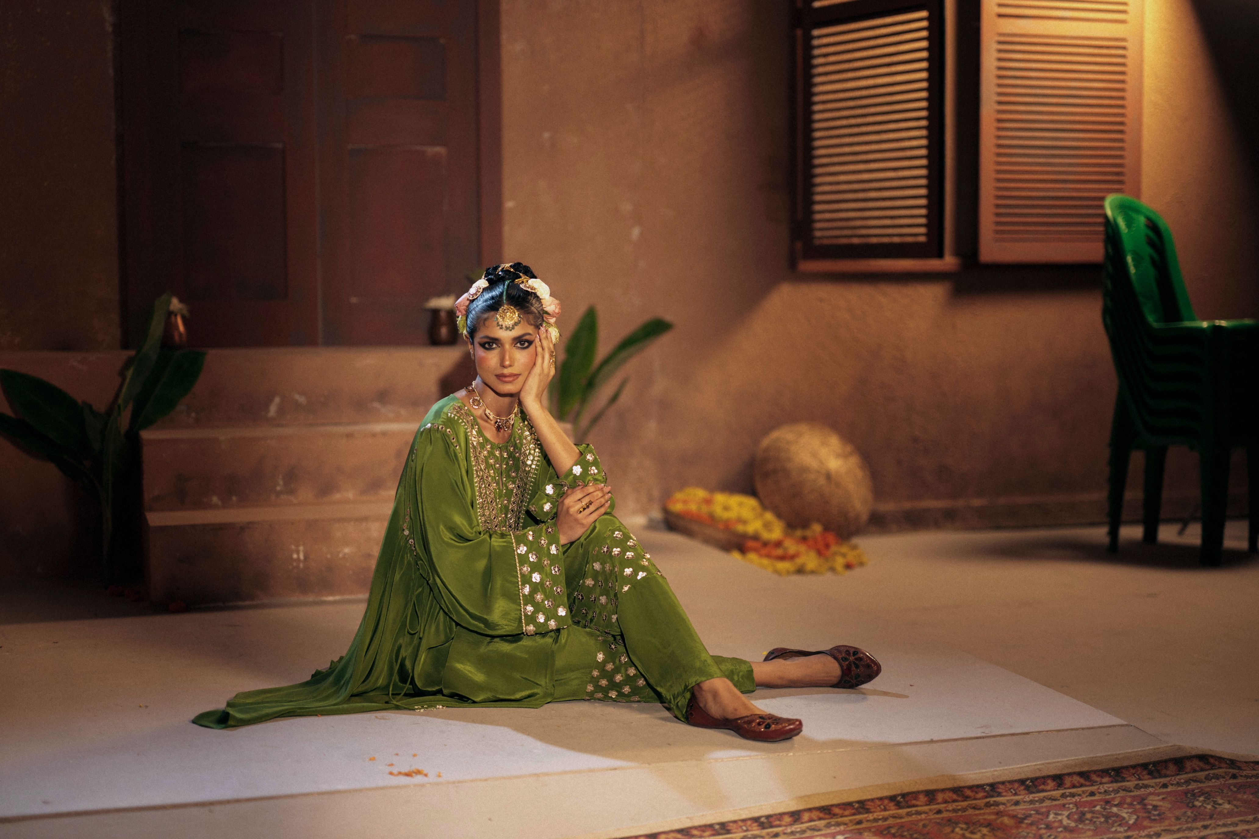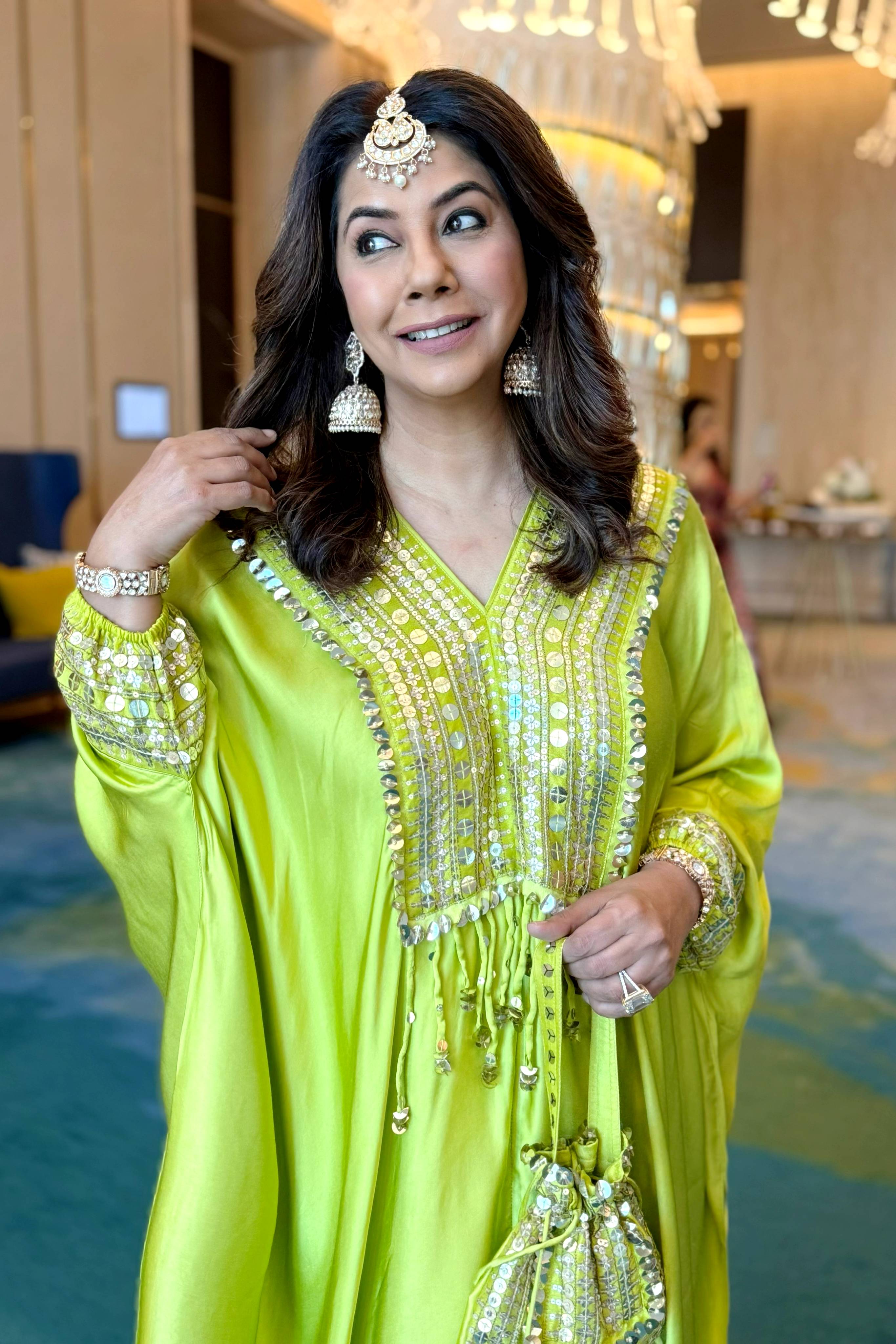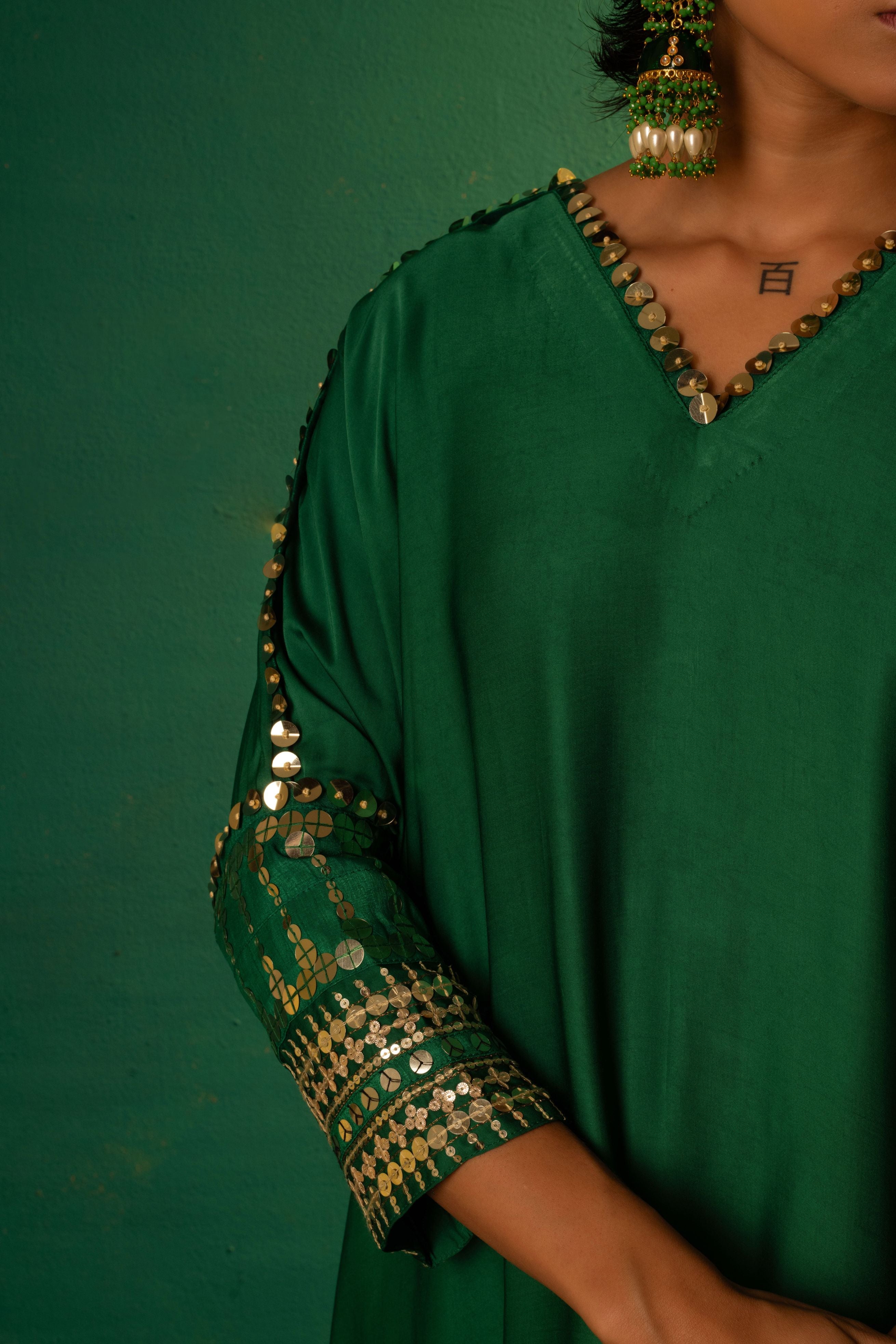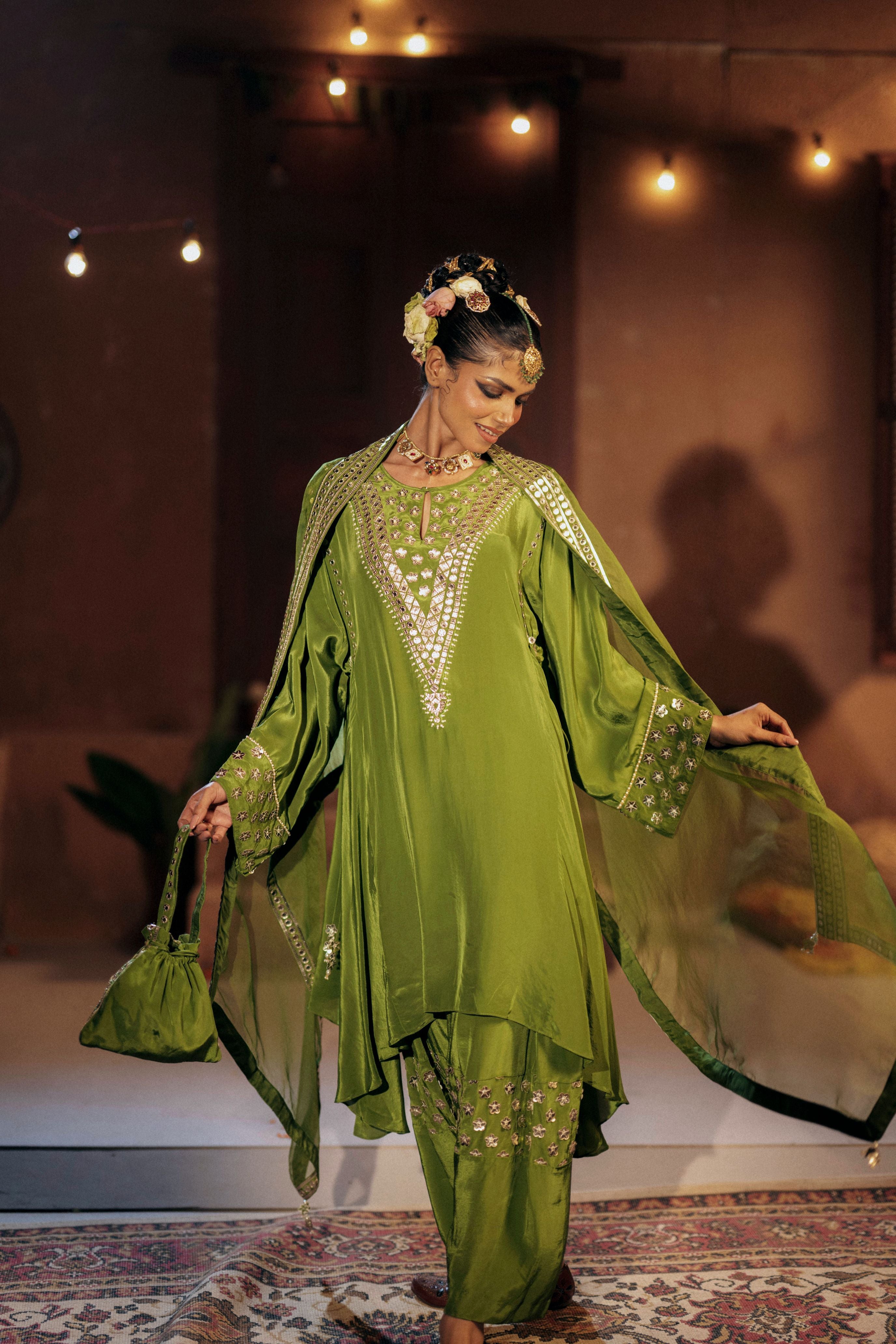 Natsha Luthra in Morrocon Green Kaftaan with Tie Up Wrap Skirt