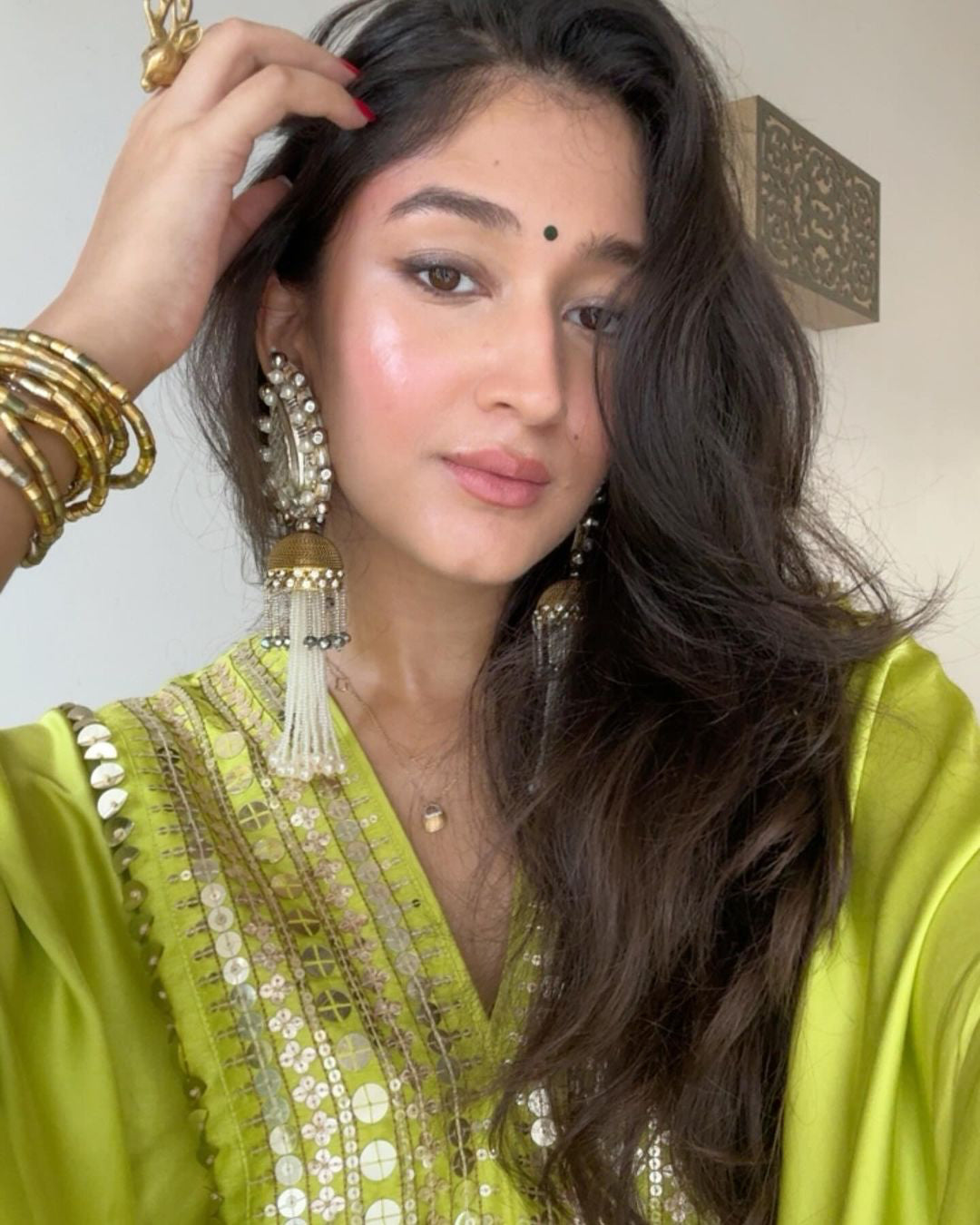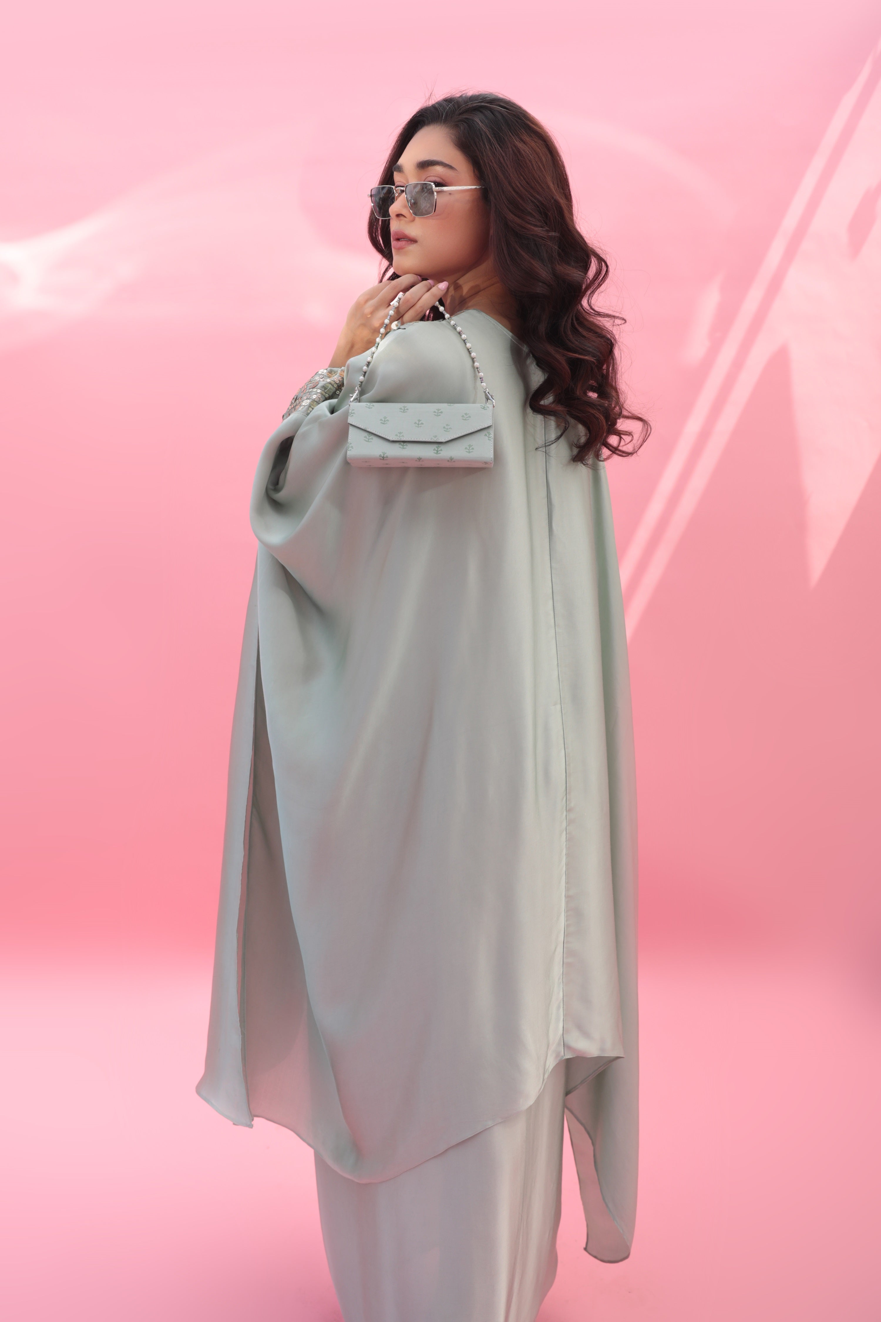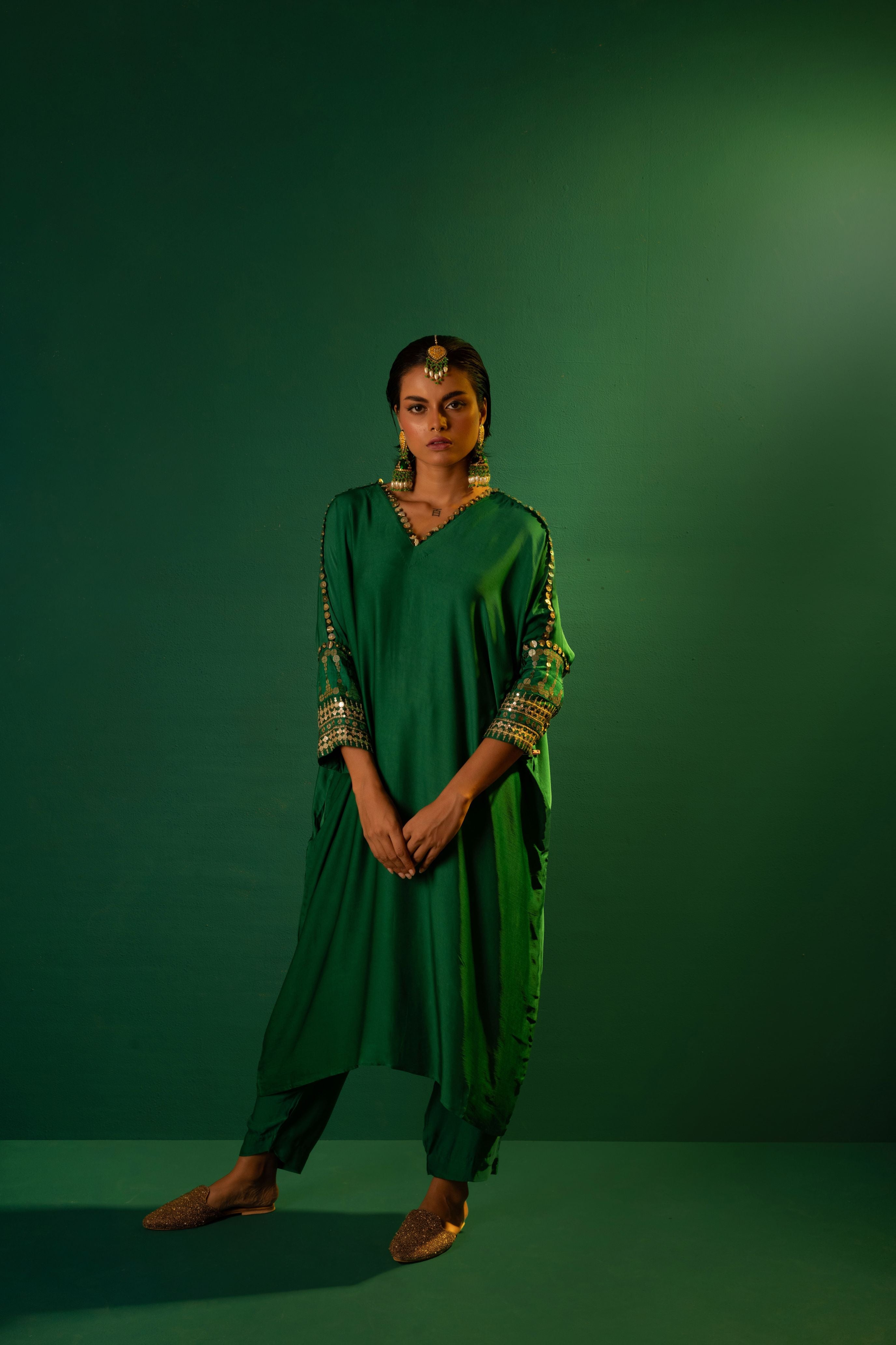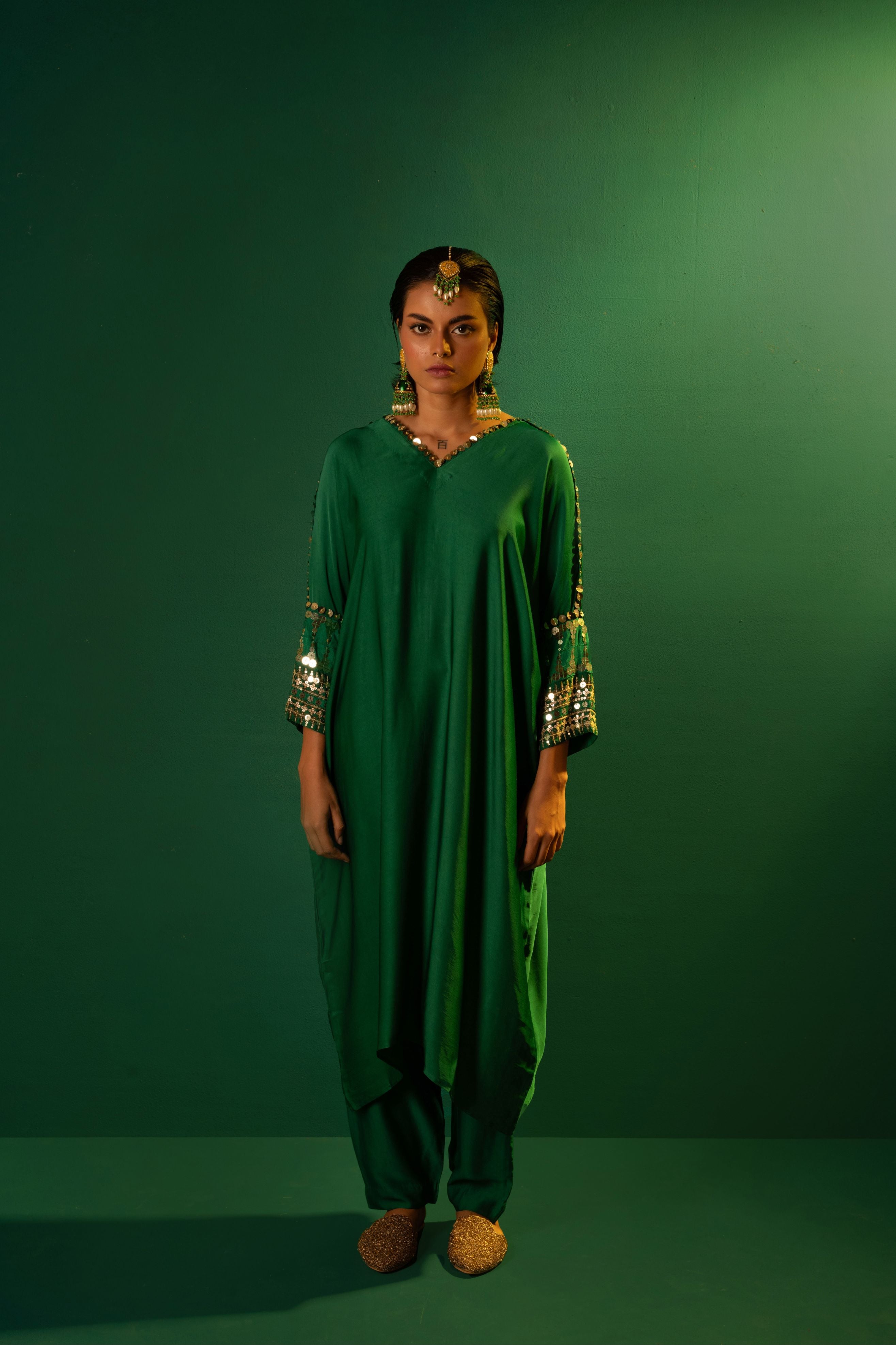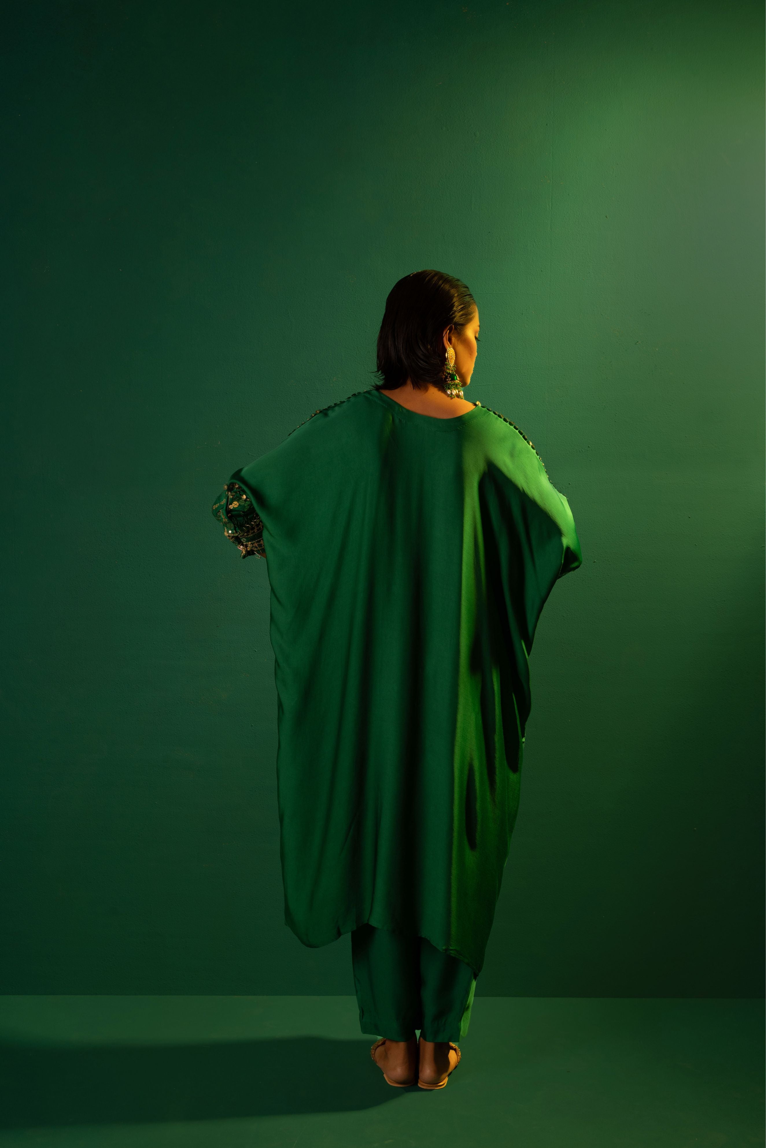 Natsha Luthra in Morrocon Green Kaftaan with Tie Up Wrap Skirt