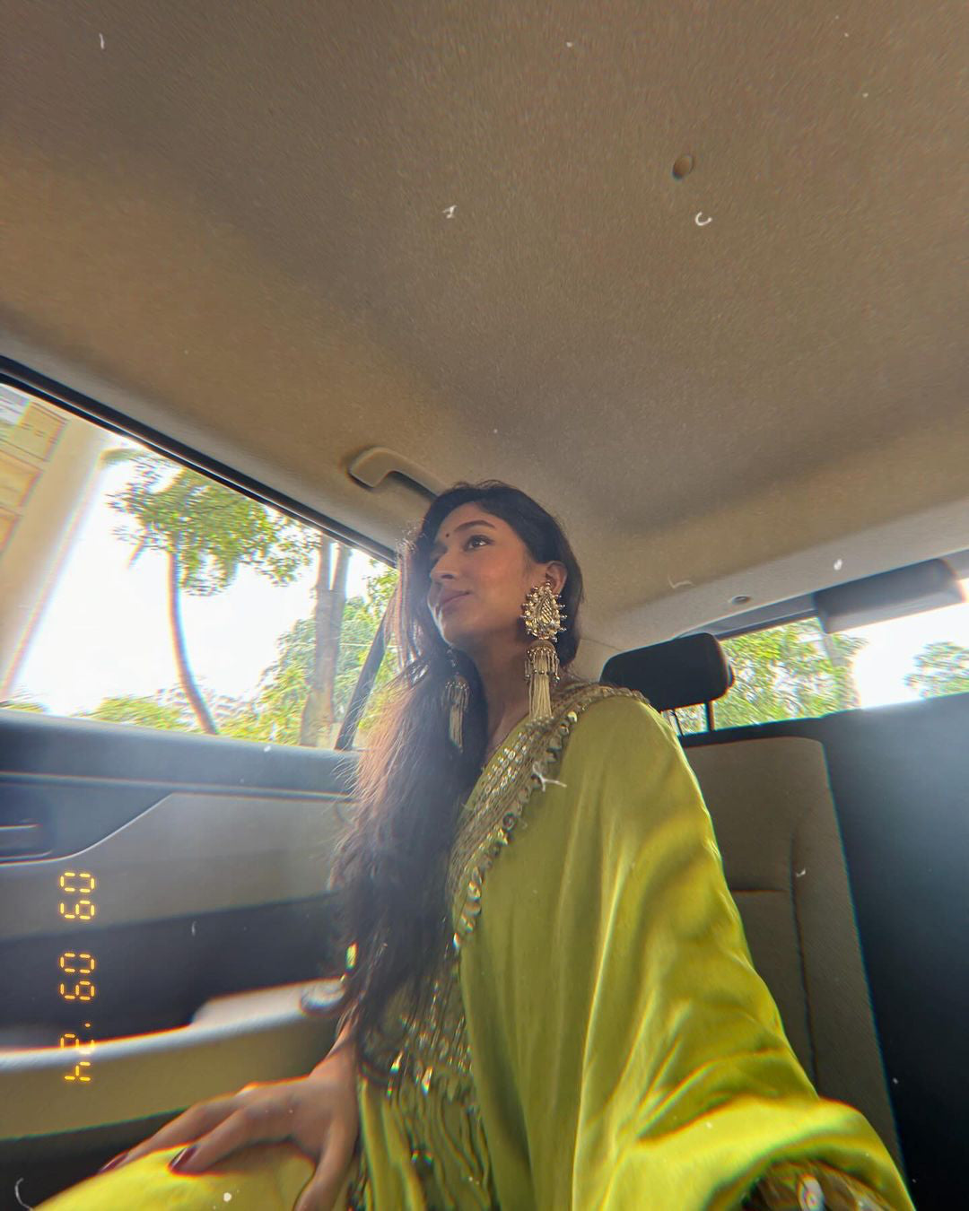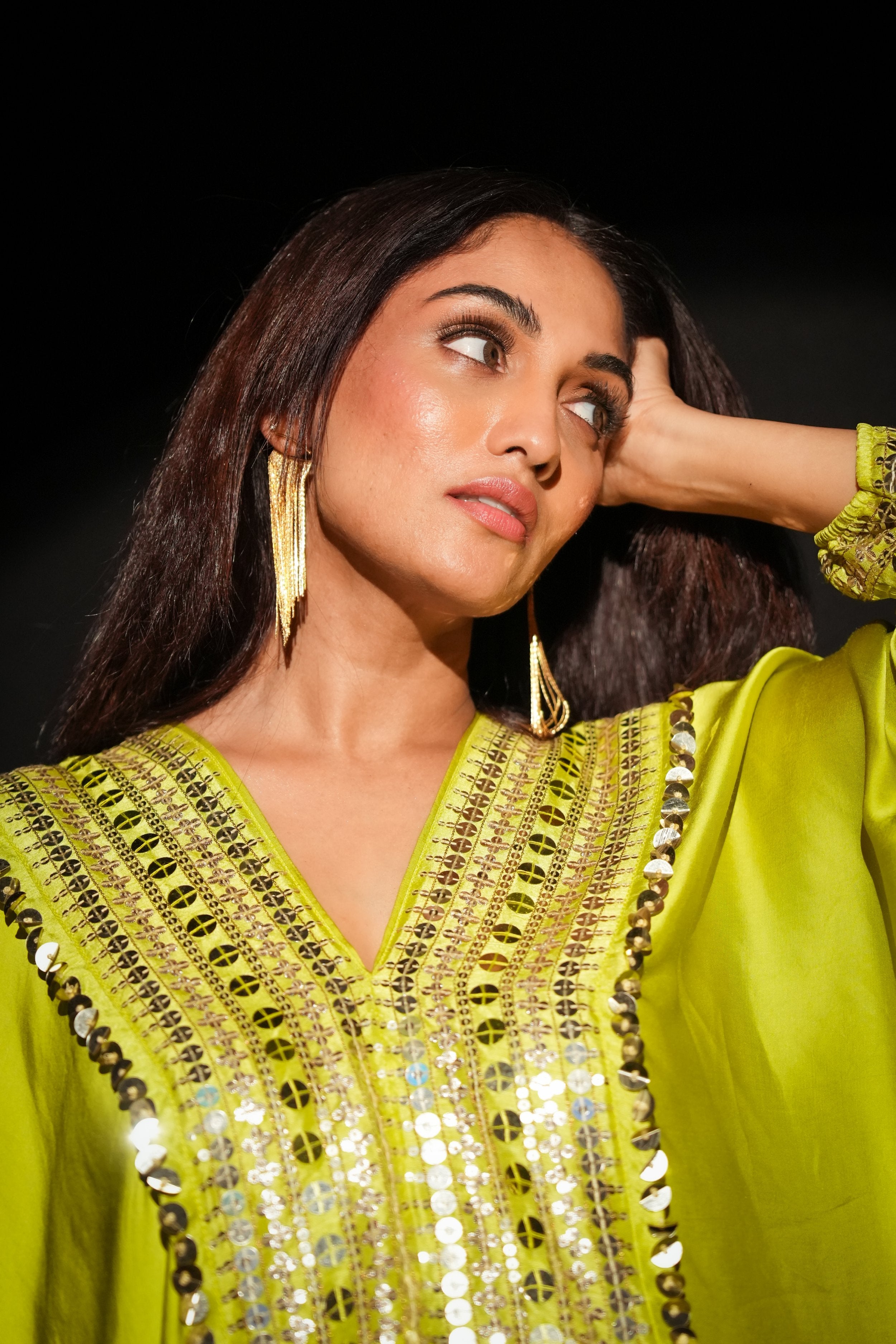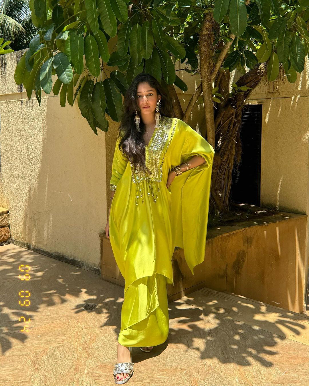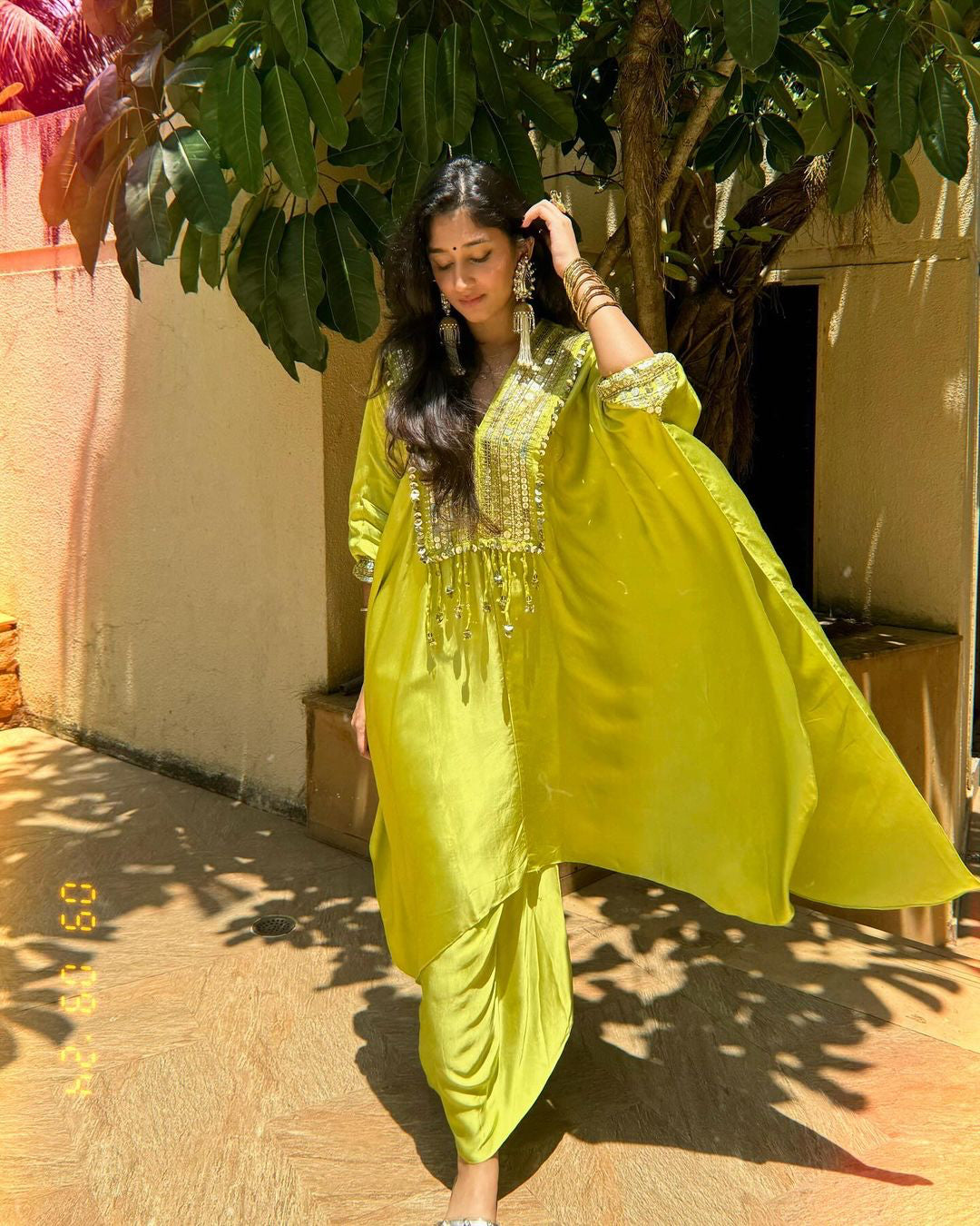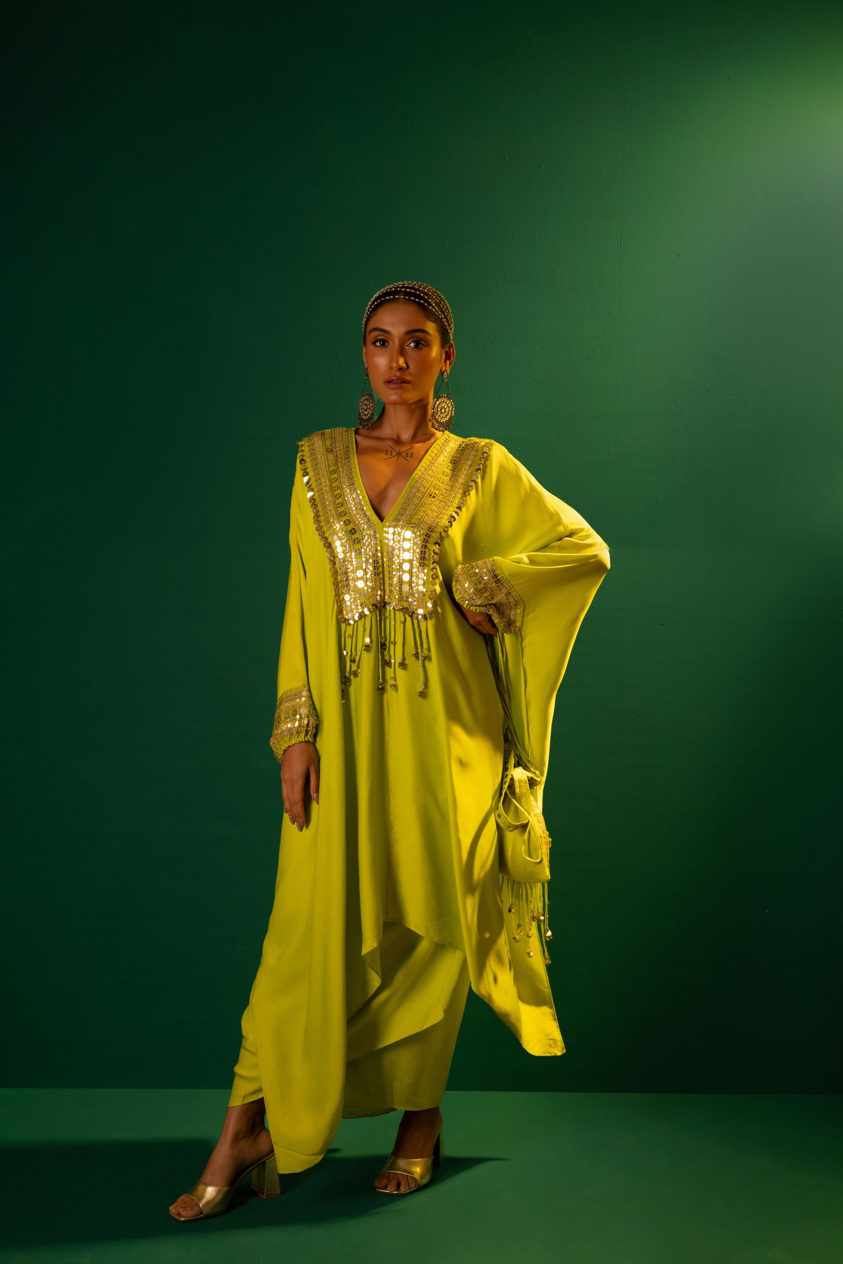 Neha Malhotra in Chamakeen Neon Kaftaan with Wrap Skirt