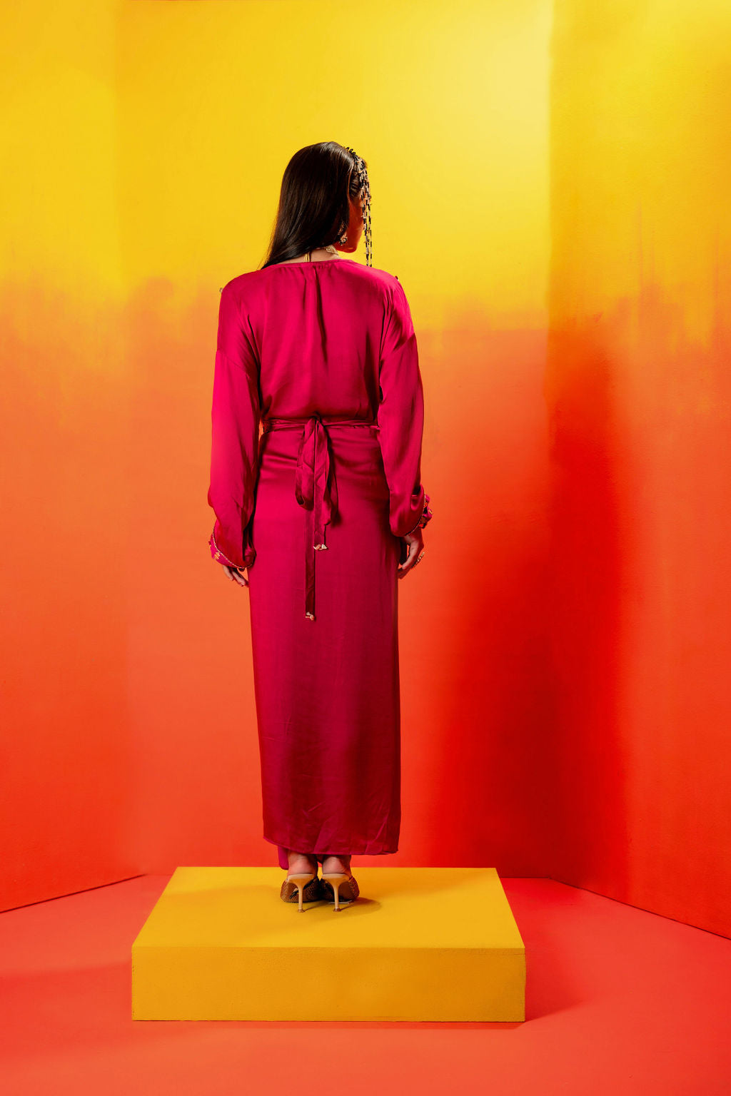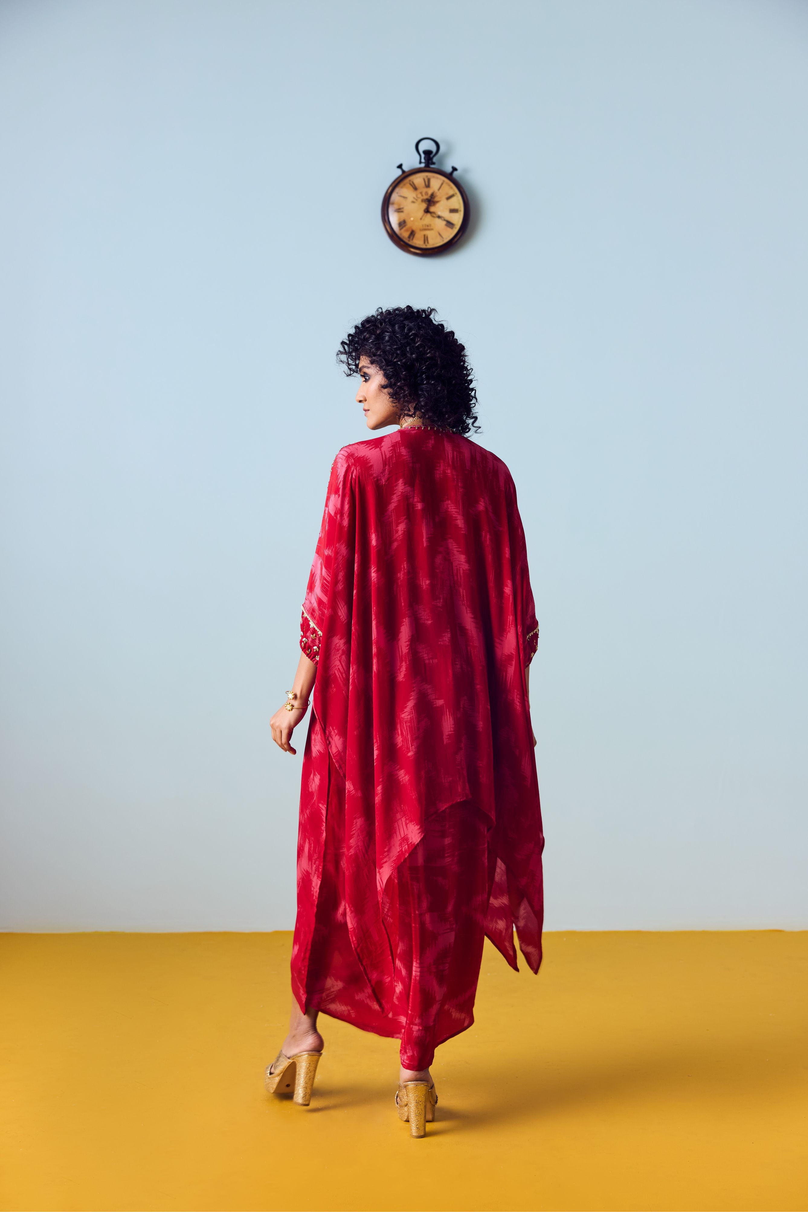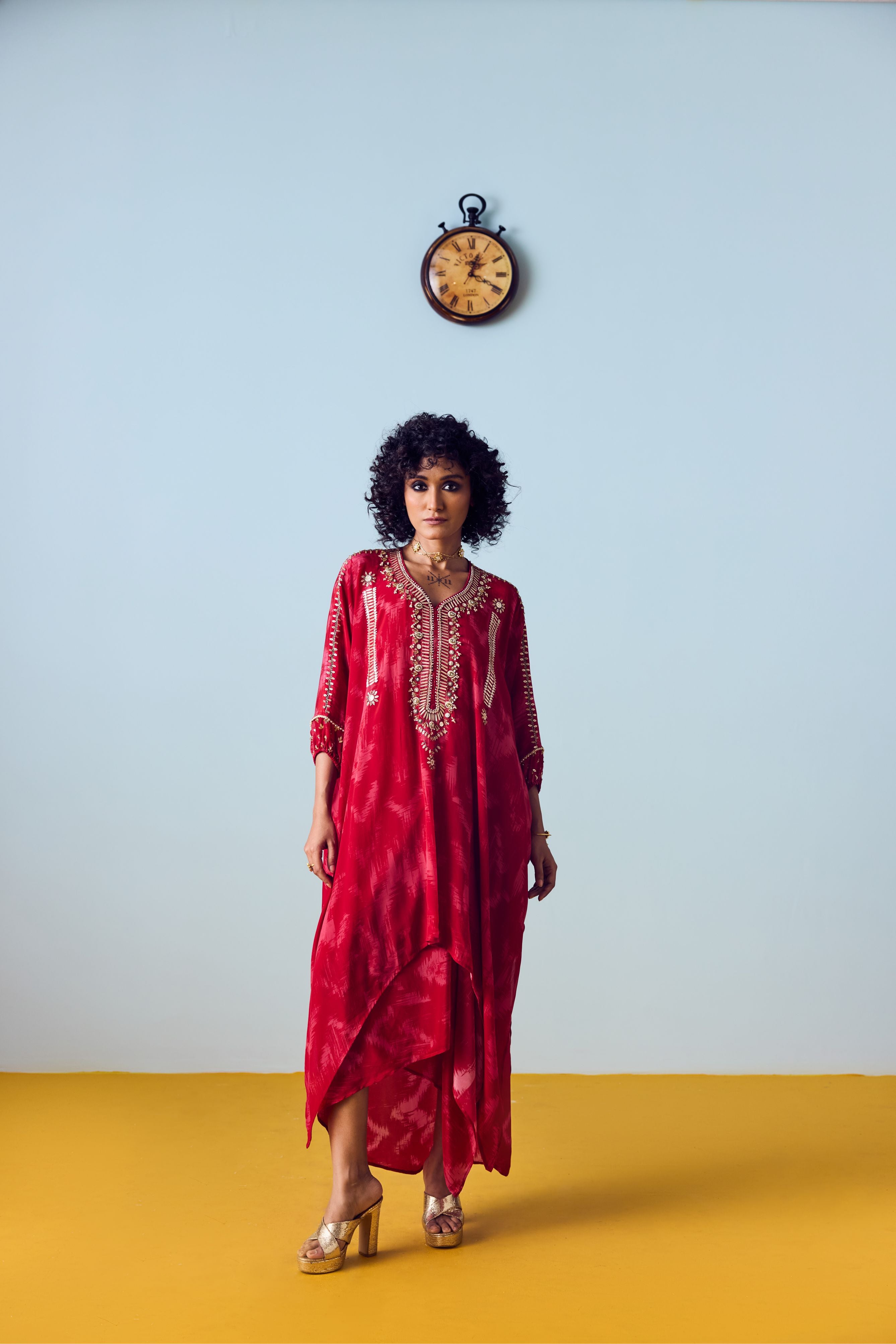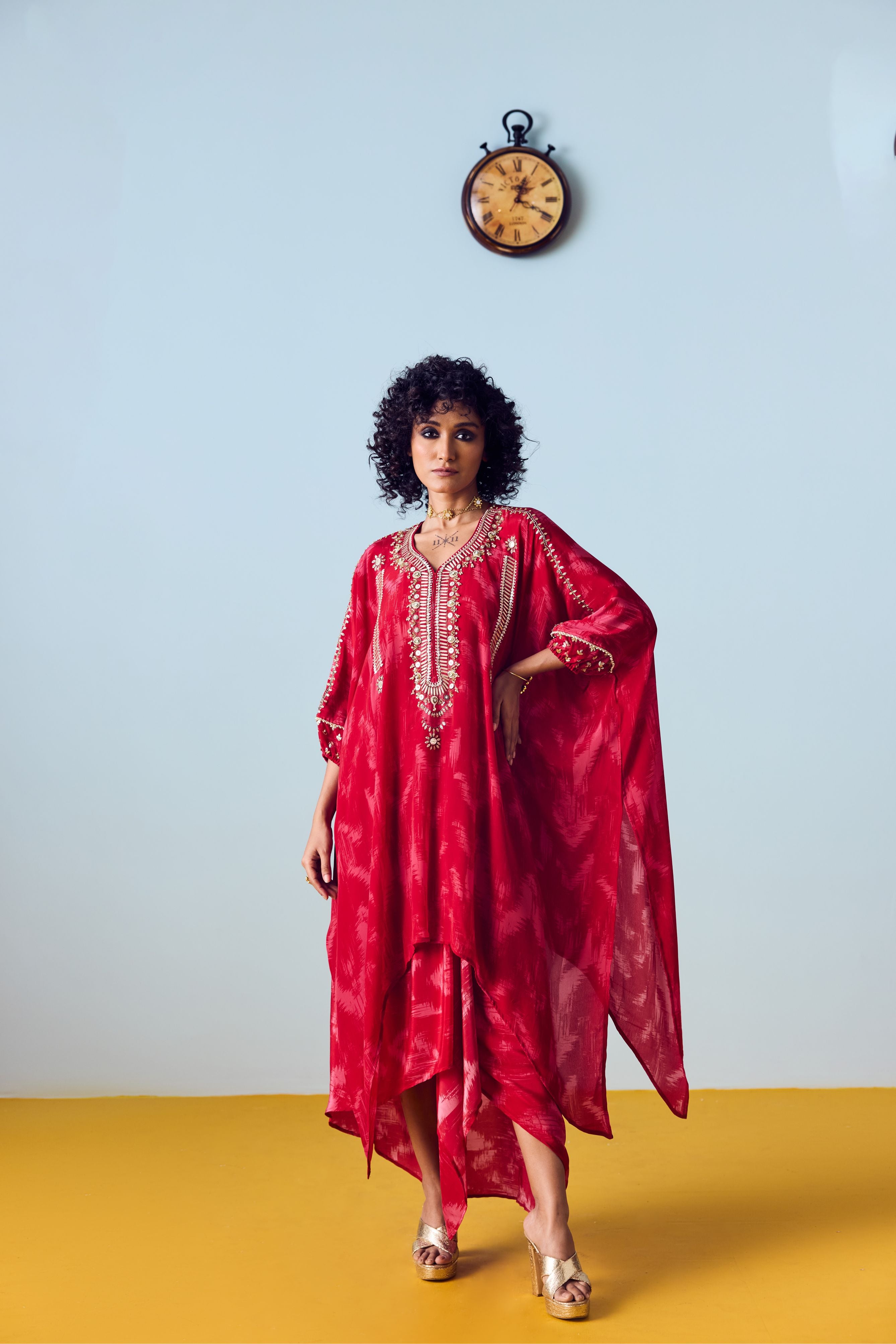 Raso Red Hand-Embroidered Kaftan Tunic with Draped Skirt Set