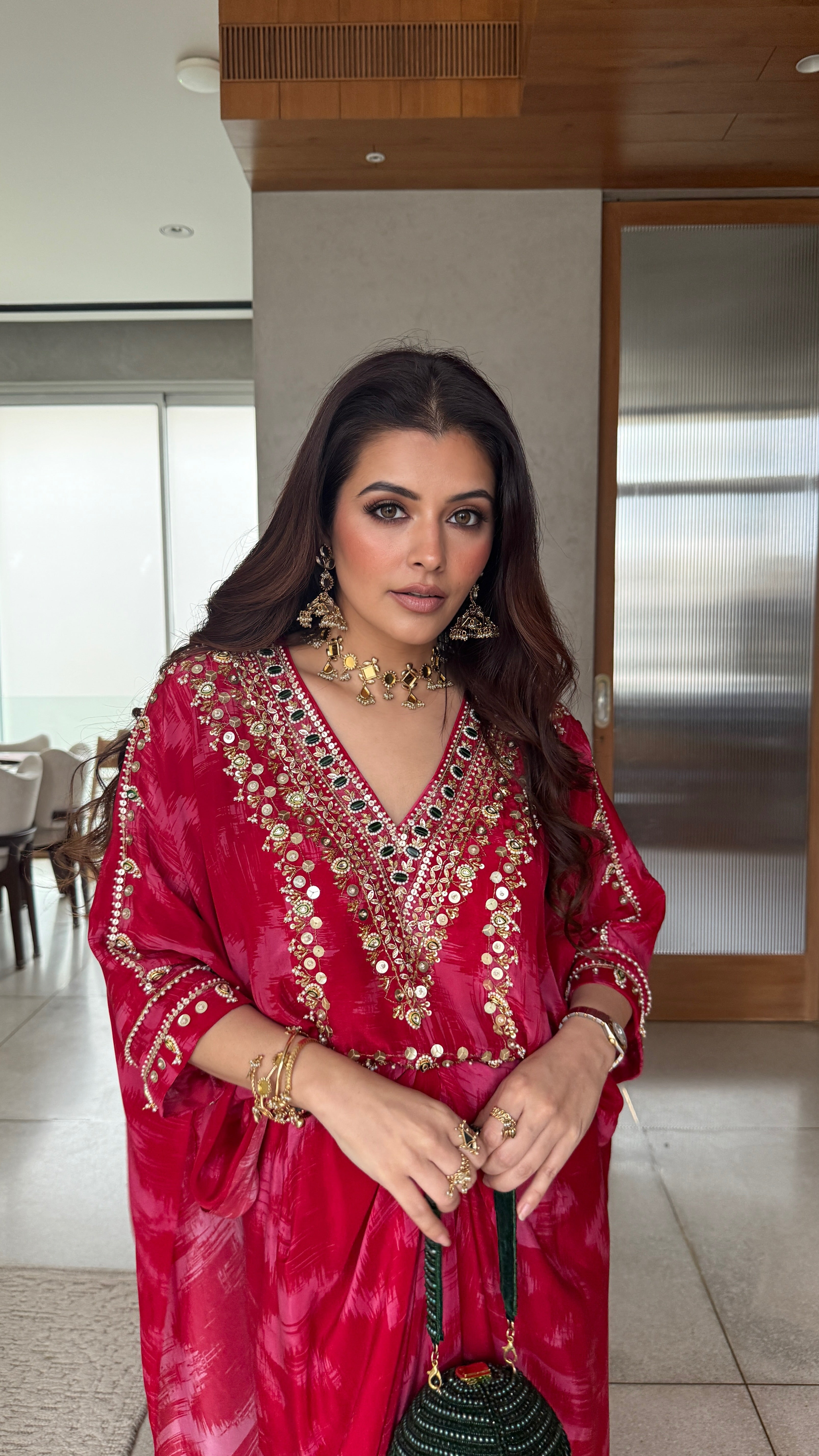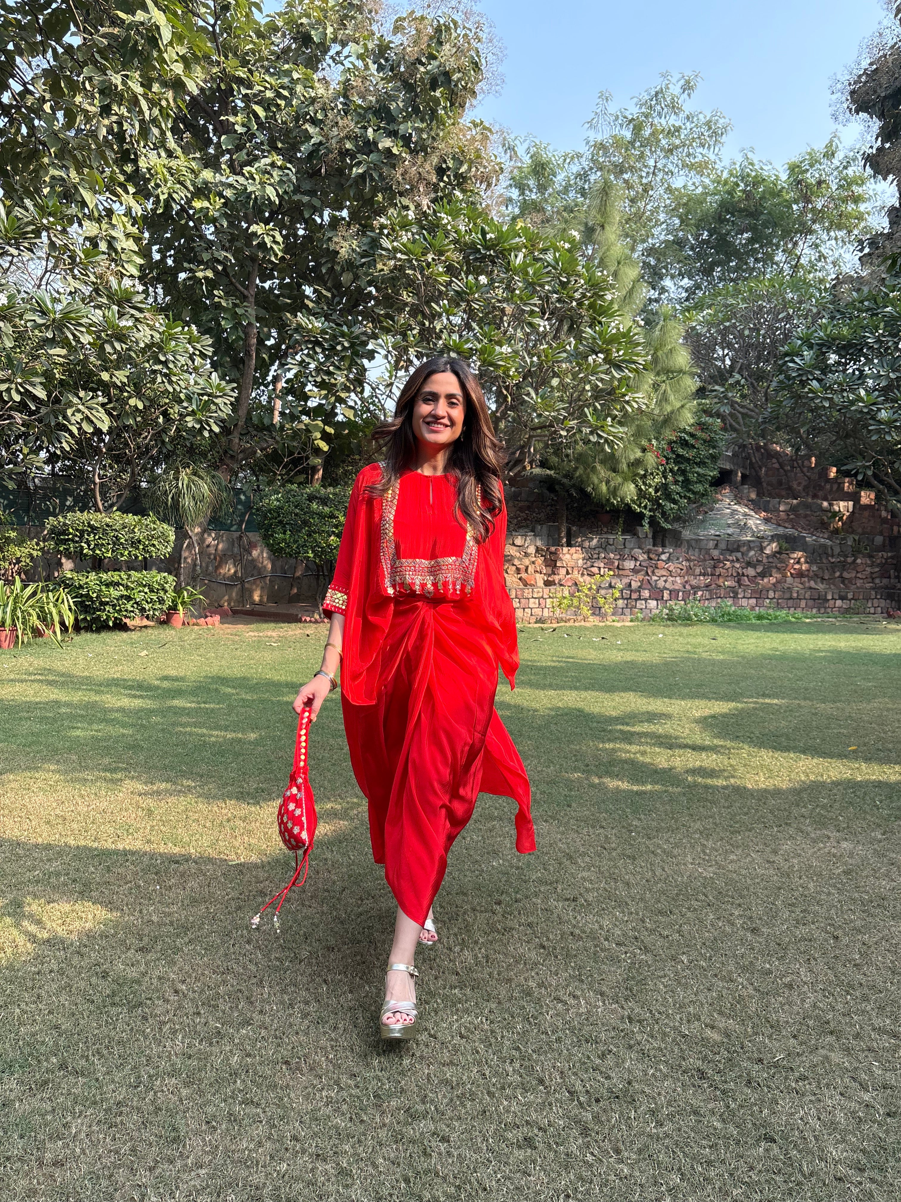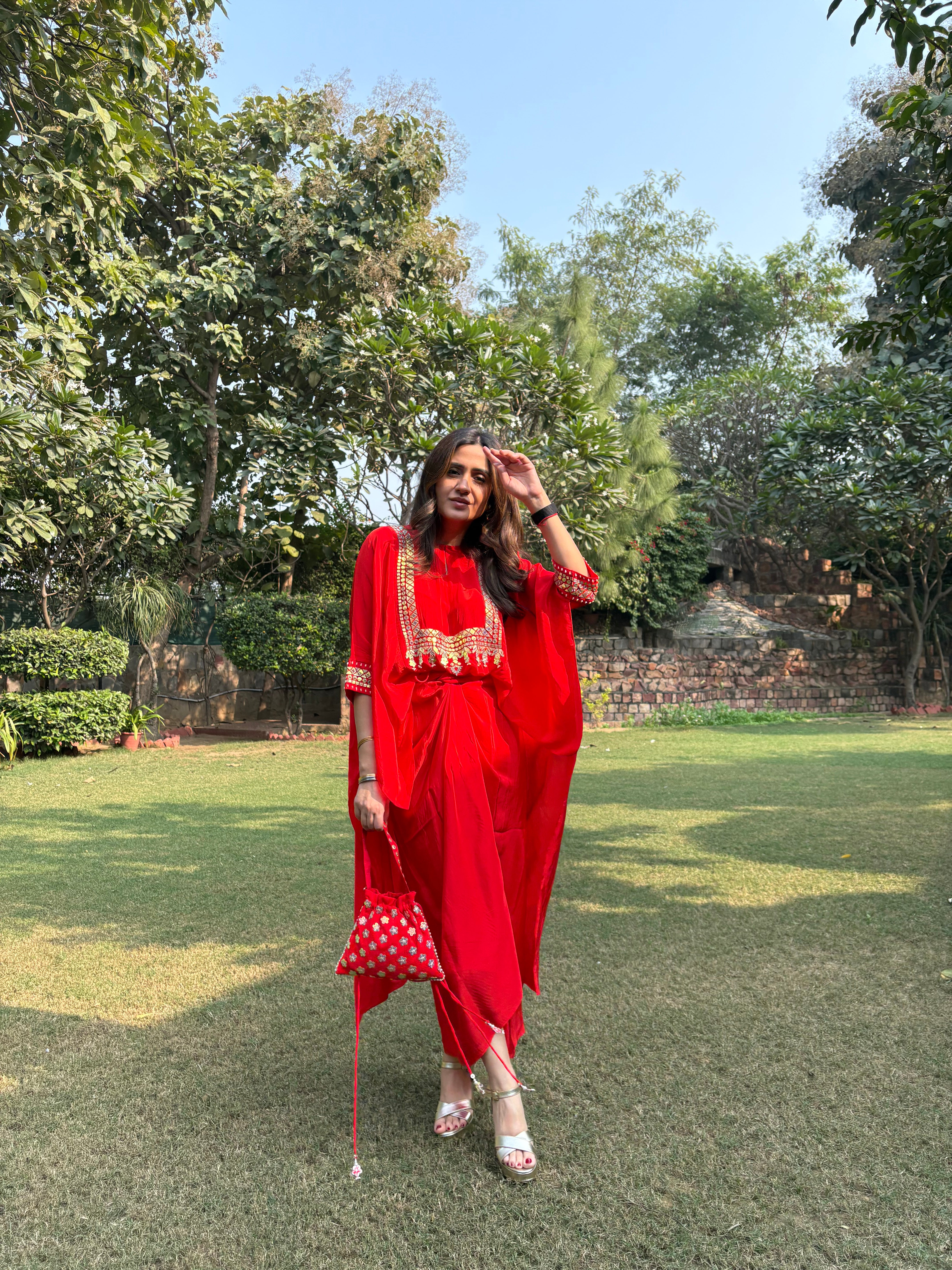 Jainee Gandhi in Raso Red Hand-Embroidered Kaftan Tunic with Wrap Skirt Set