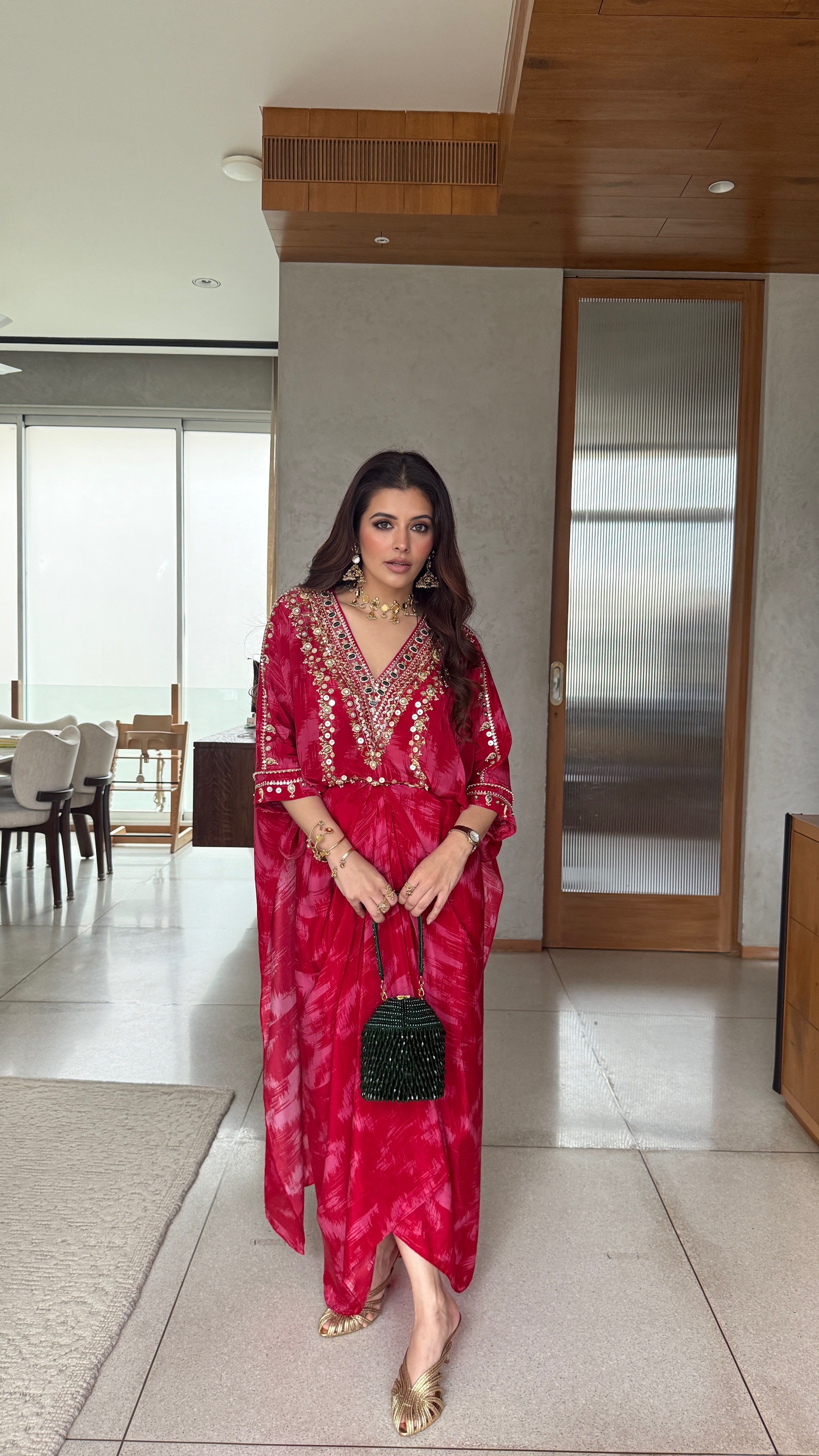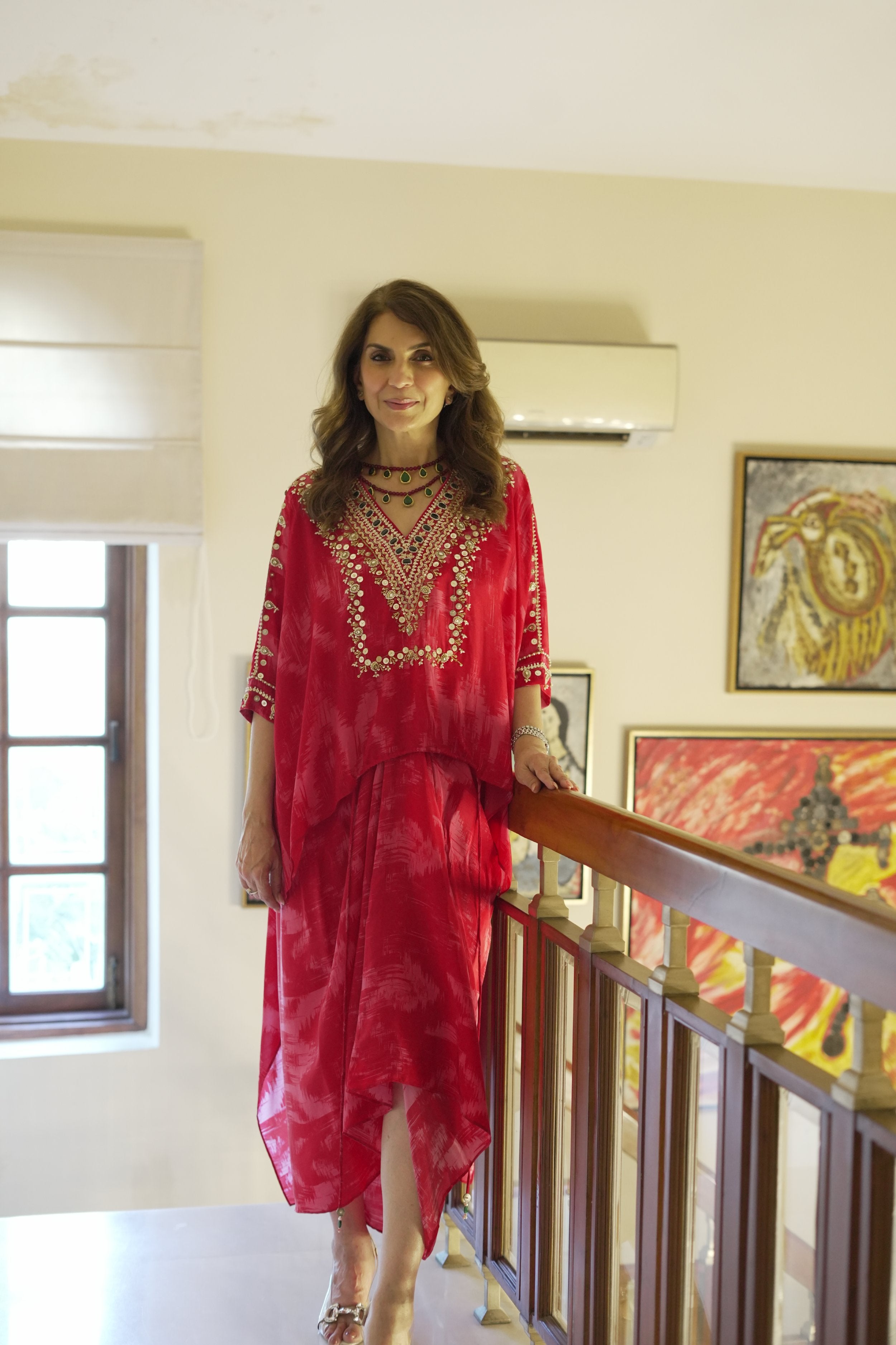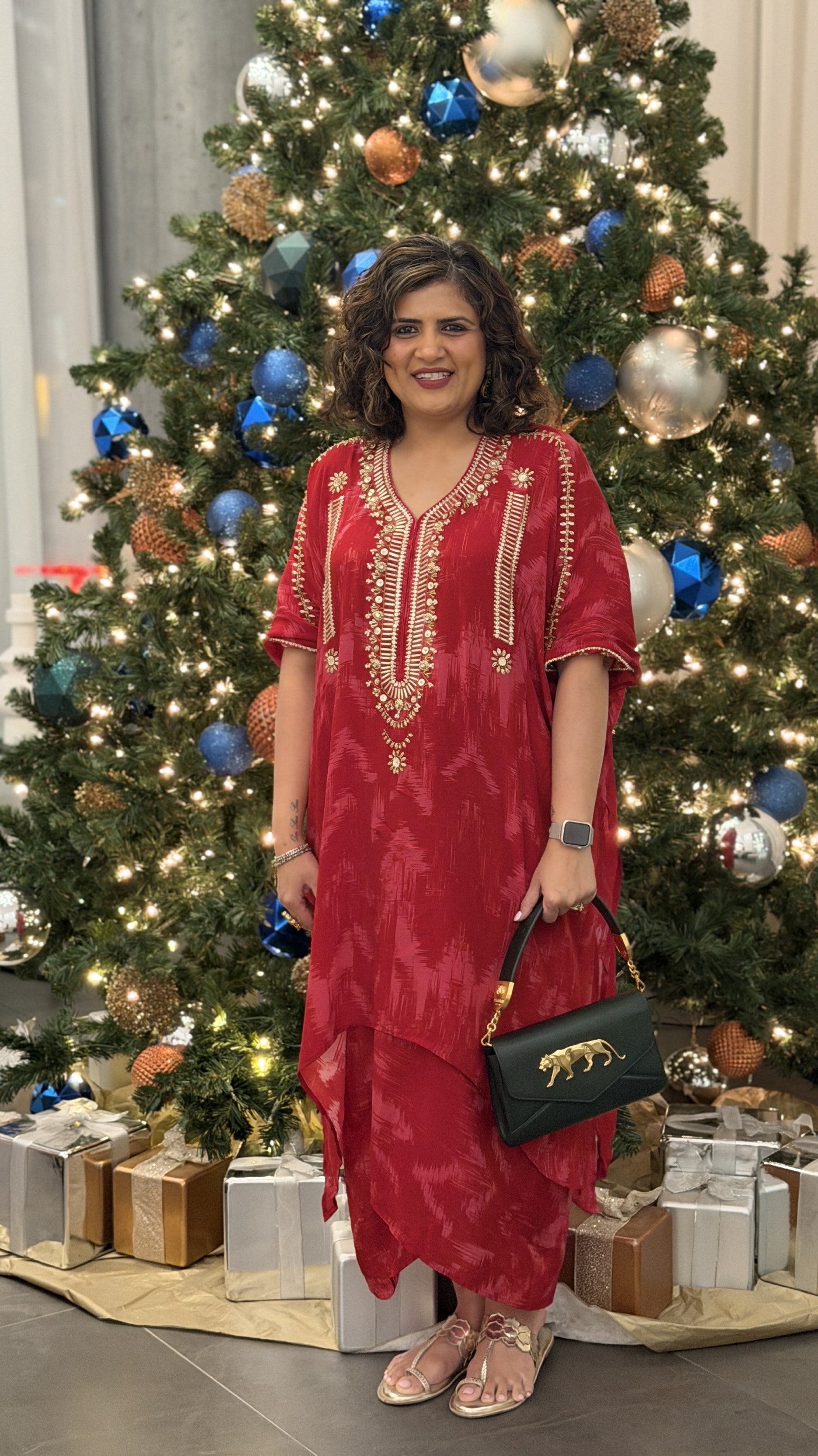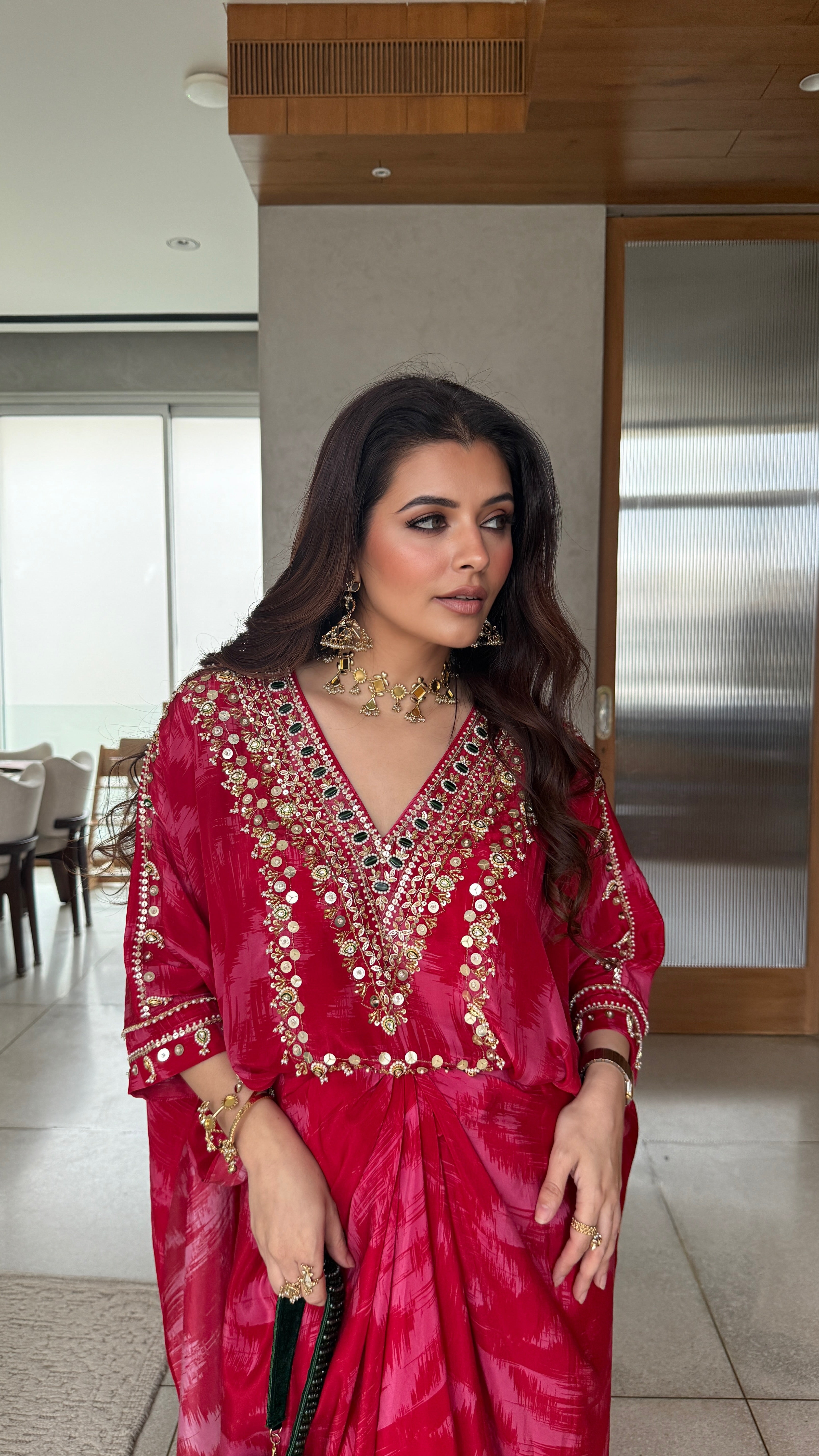 Jainee Gandhi in Raso Red Hand-Embroidered Kaftan Tunic with Wrap Skirt Set