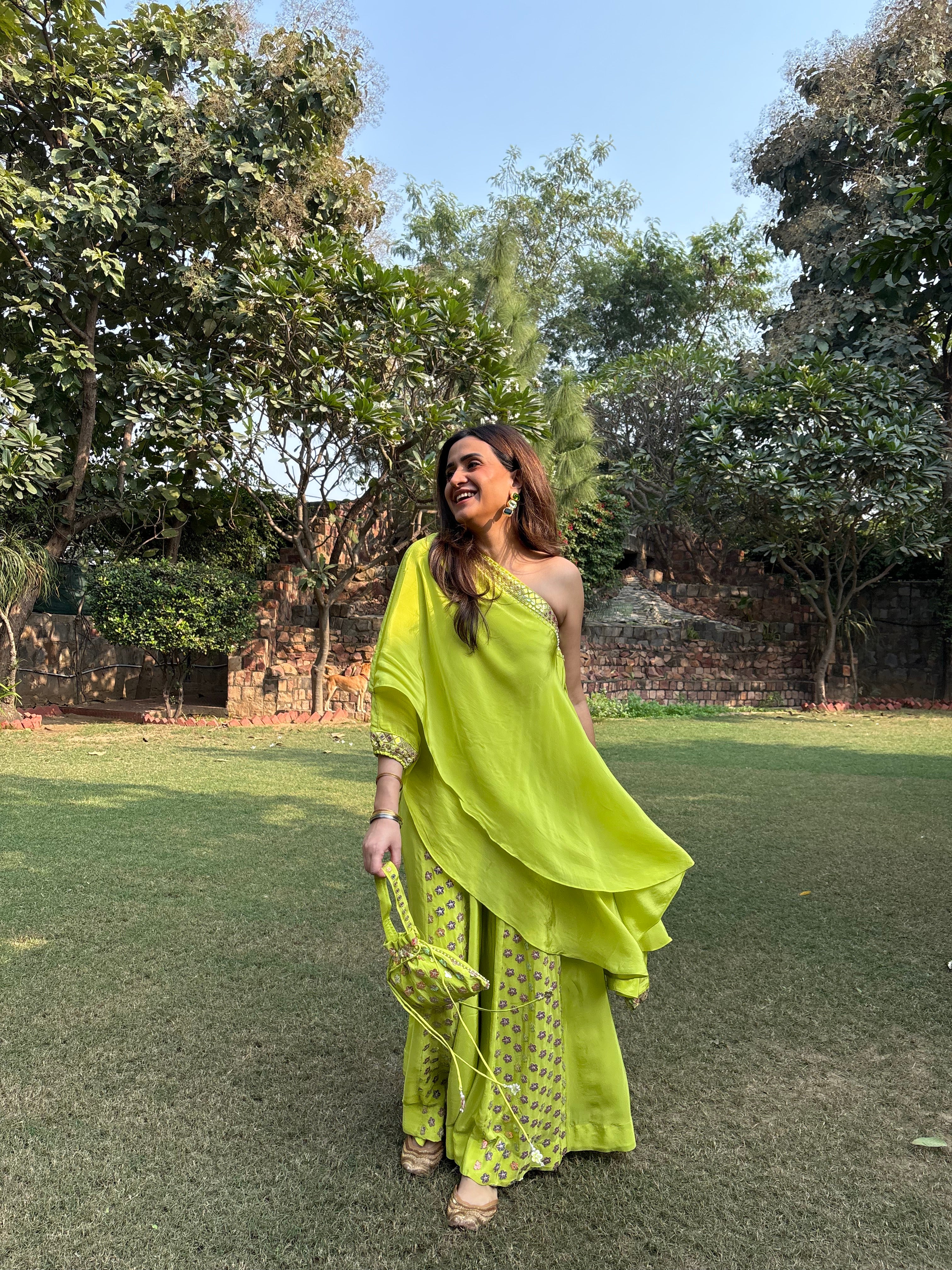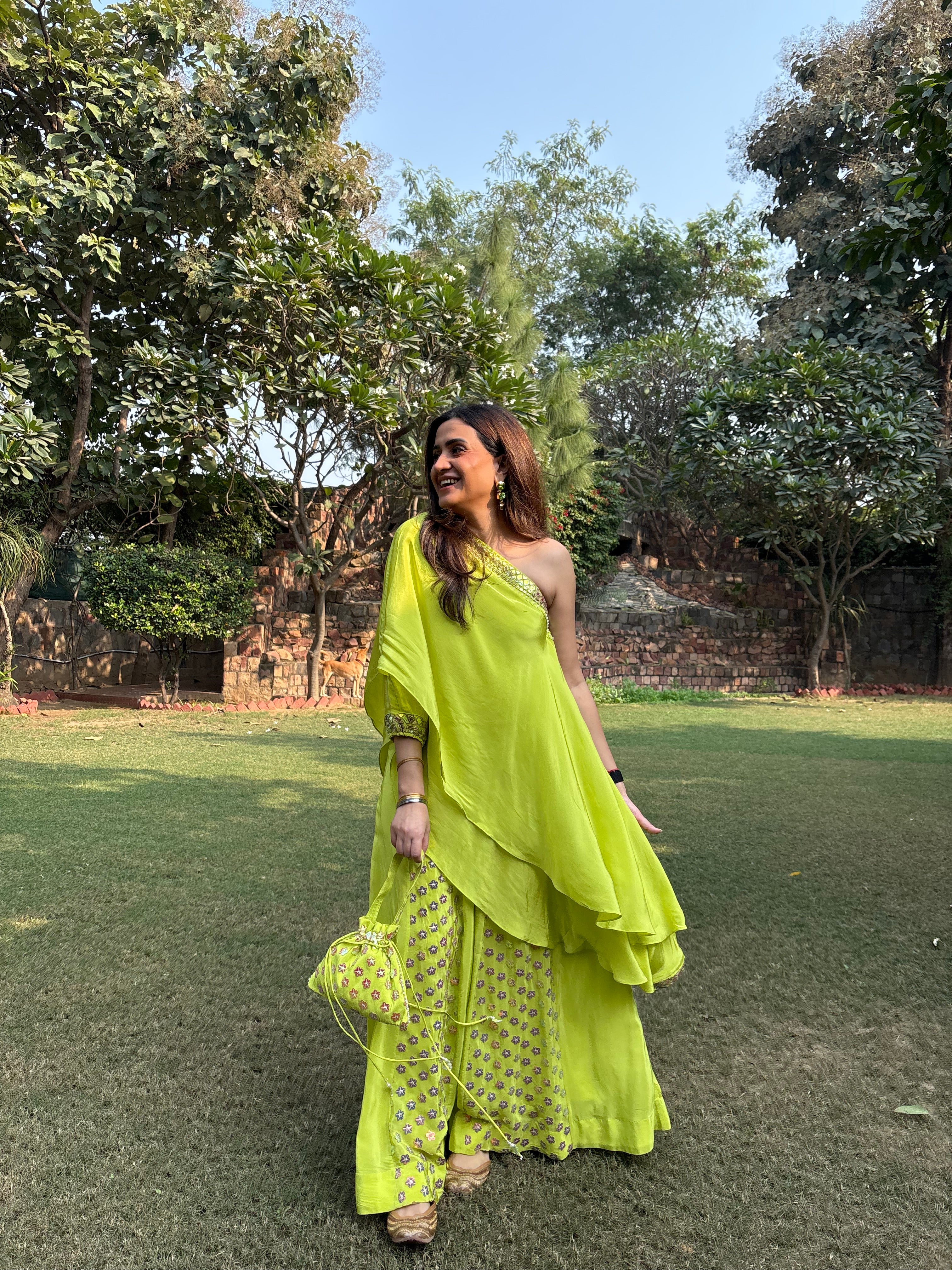 Neha Malhotra in Chamakeen Neon Kaftaan with Wrap Skirt