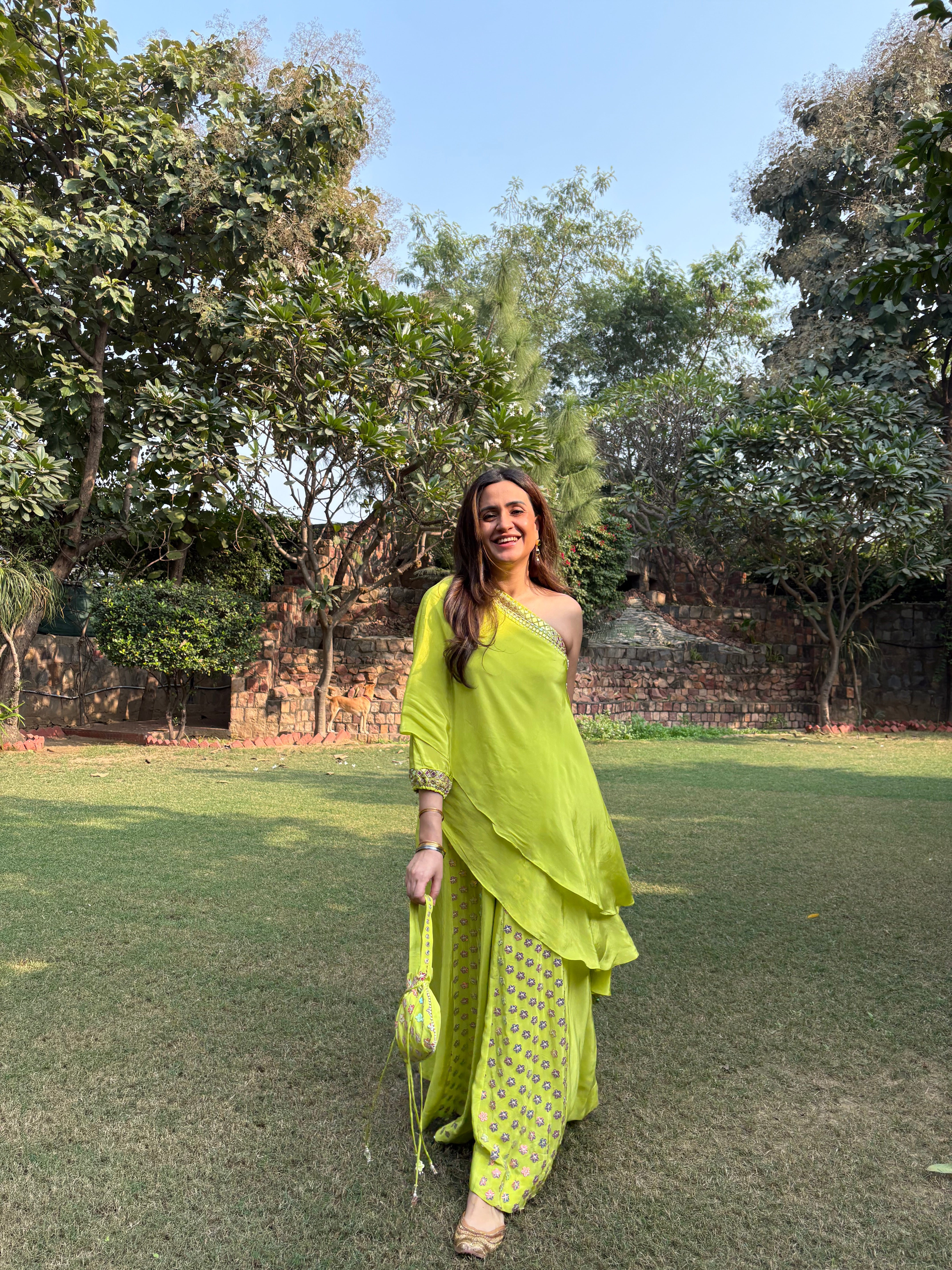 Radha Patel styles Nexa sage Green Hi-Low Top & Wrap Skirt Set
