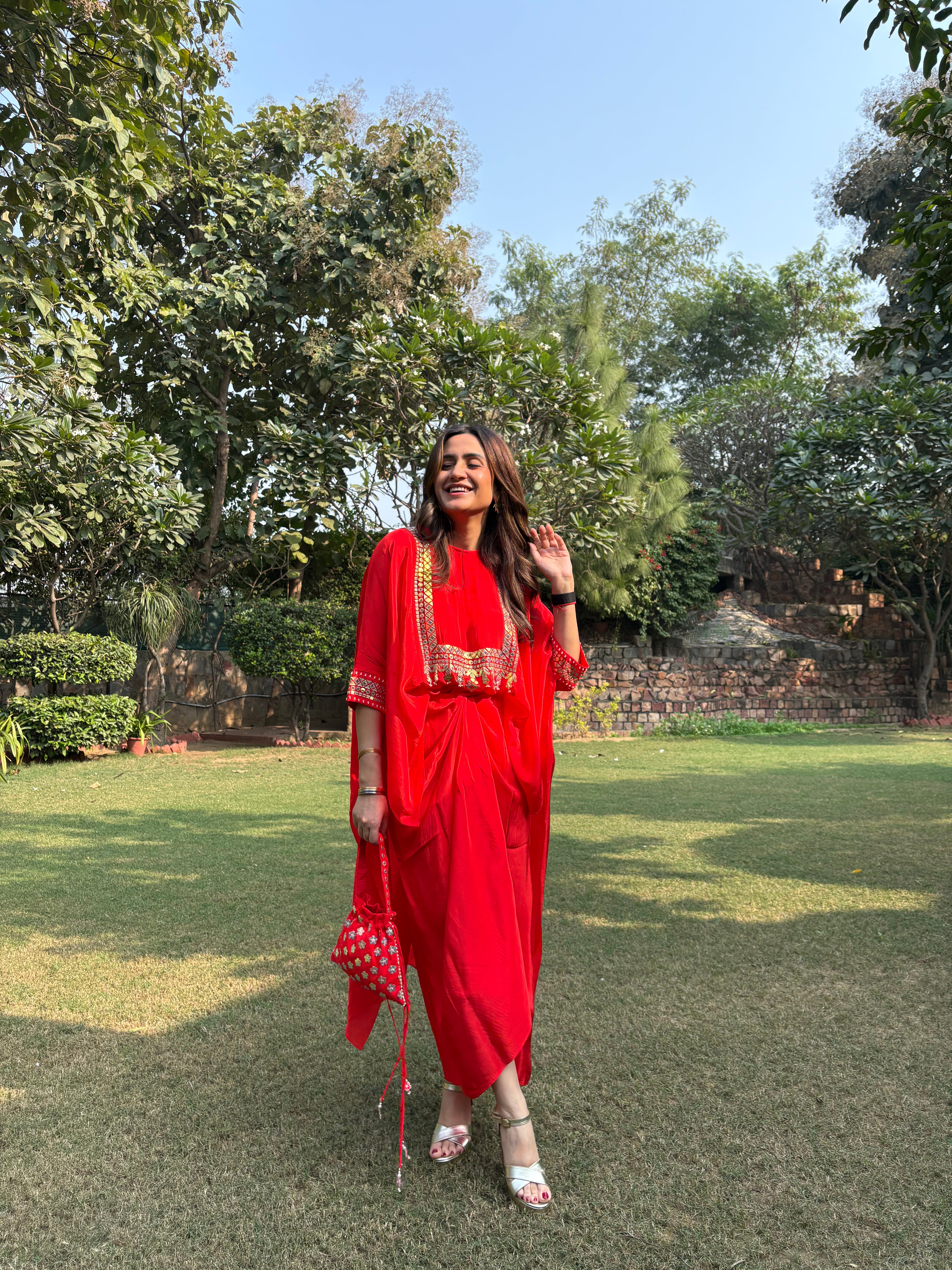 Natasha Luthra in CARAT Red Hi-Low Top and Wrap Skirt Set