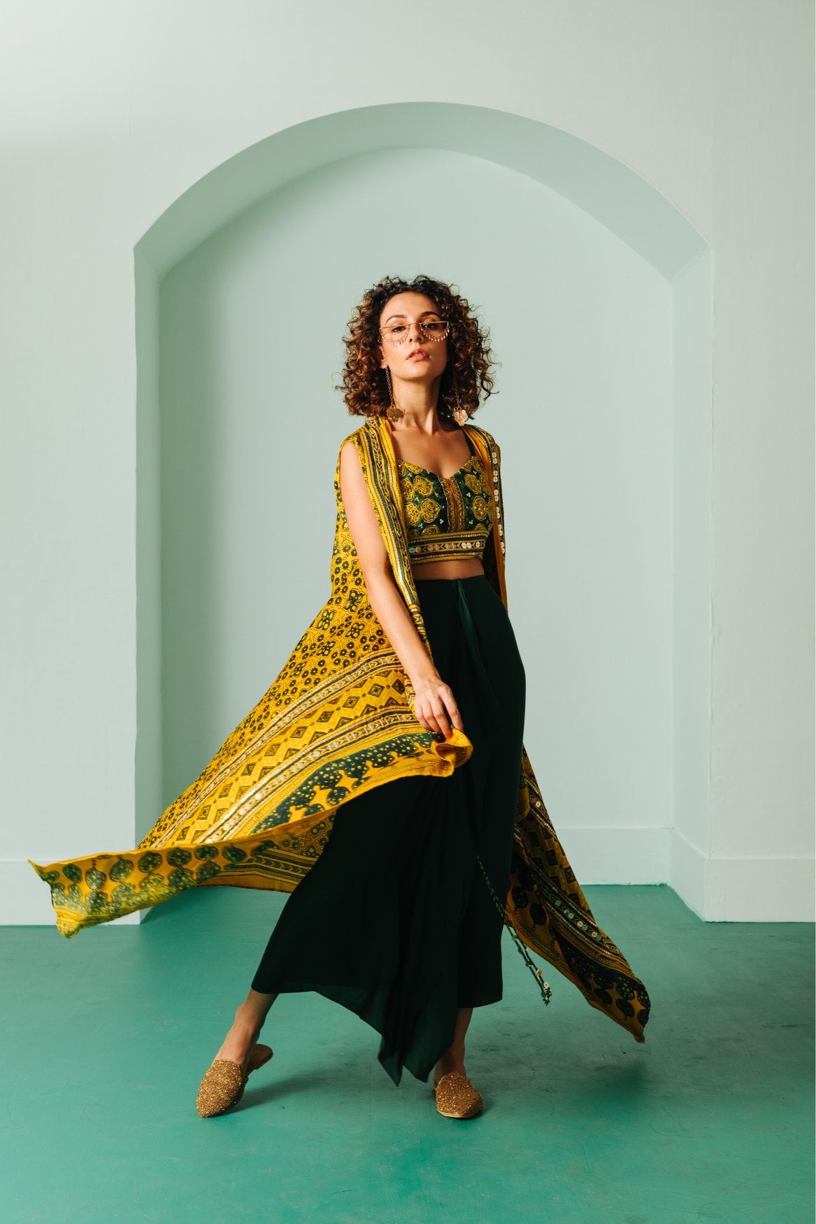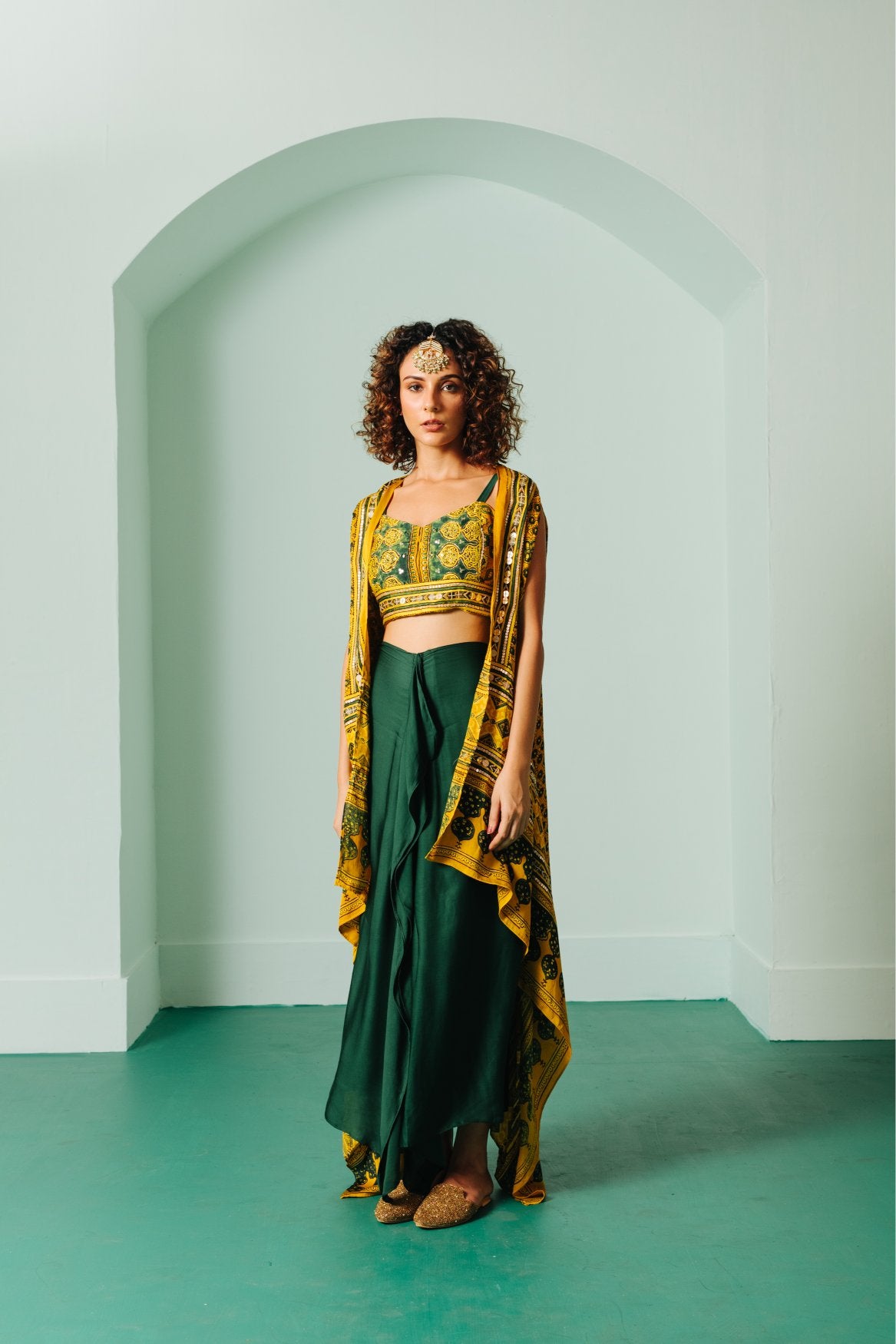 Ajrakh Blouse paired with Drape Skirt and Ajrakh Cape Shrug