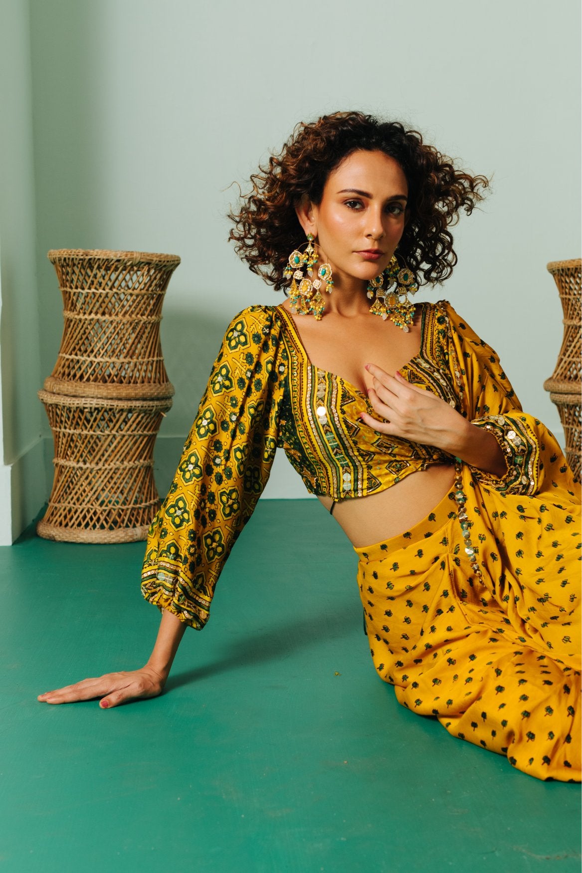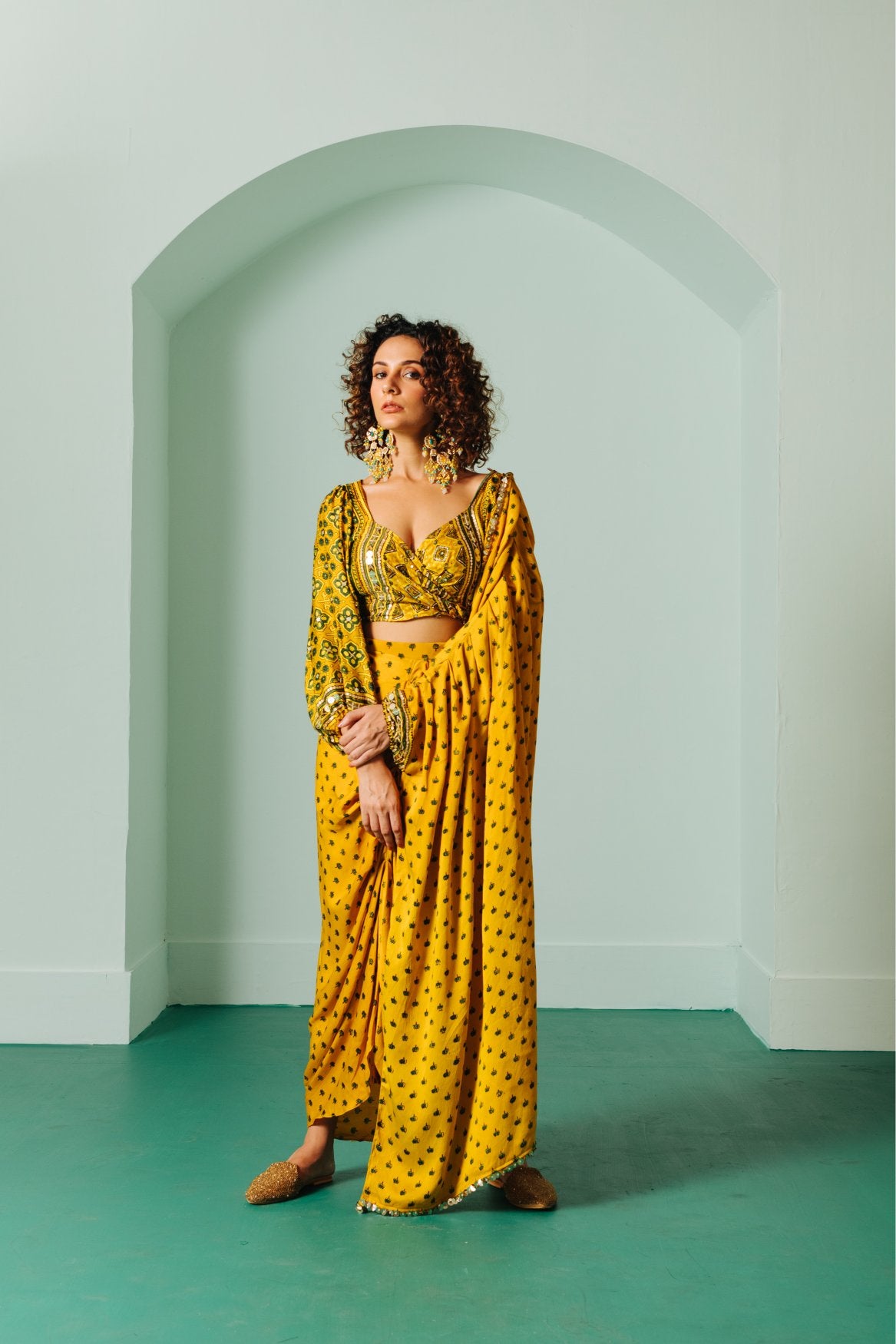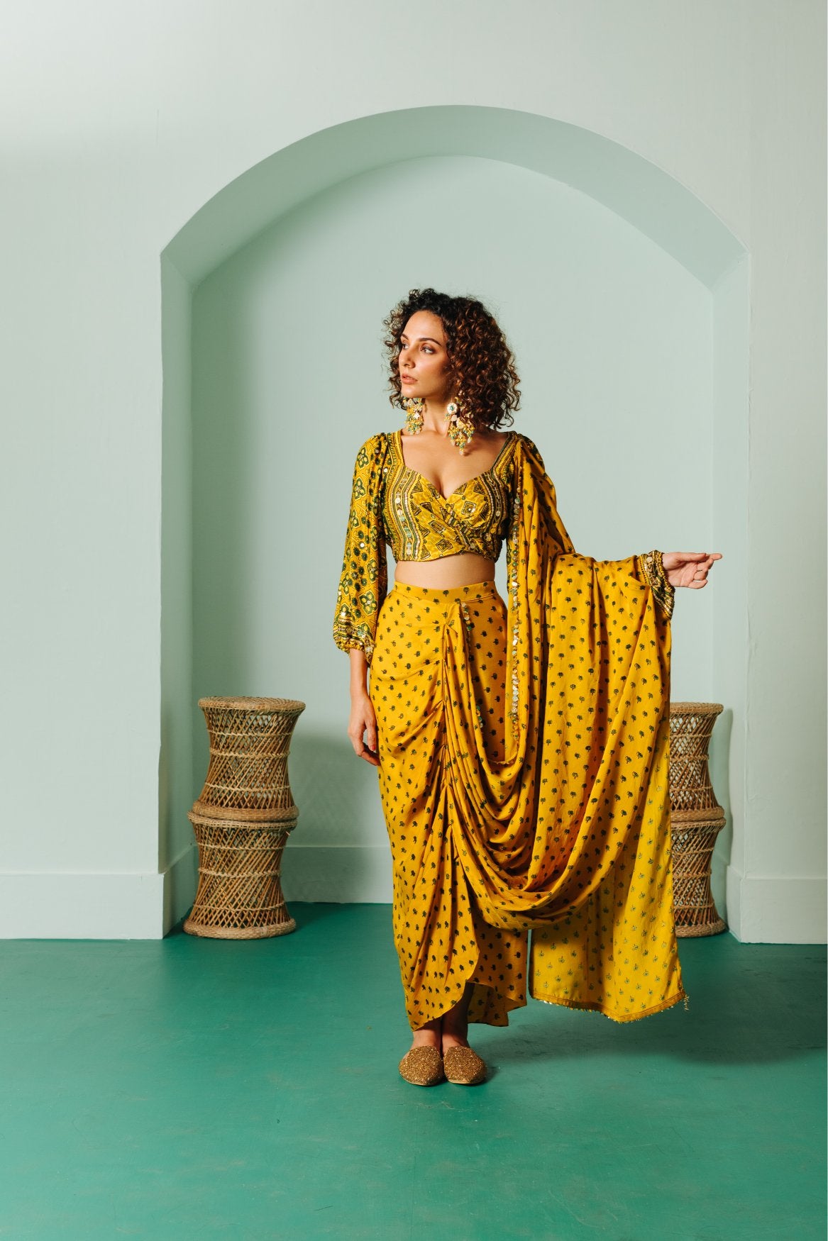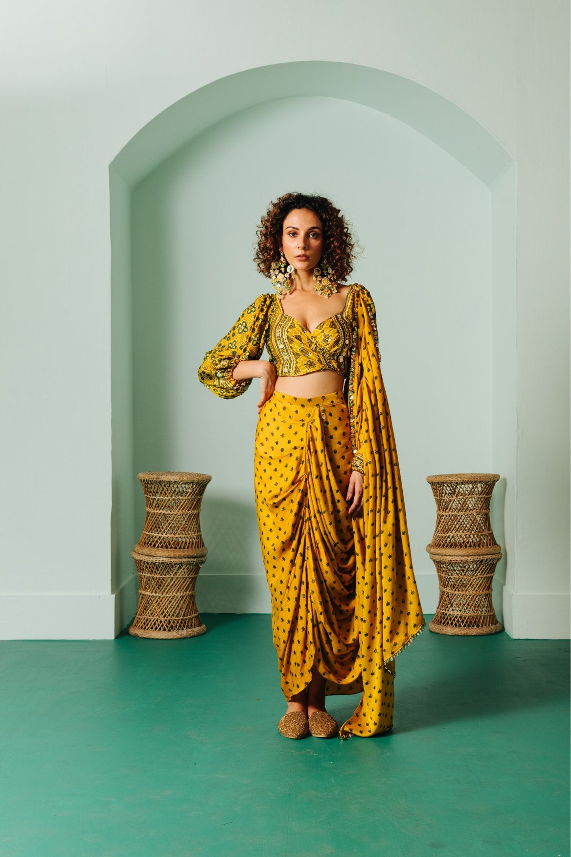 Embroidered blouse top with stitched saree drape kaftaan dress.