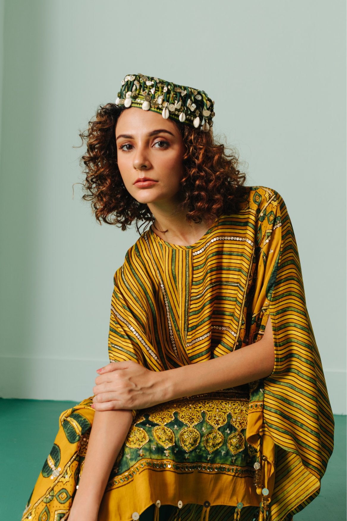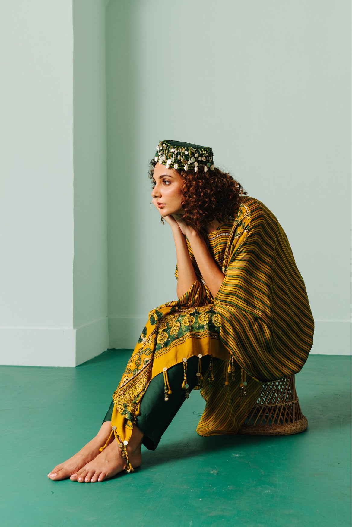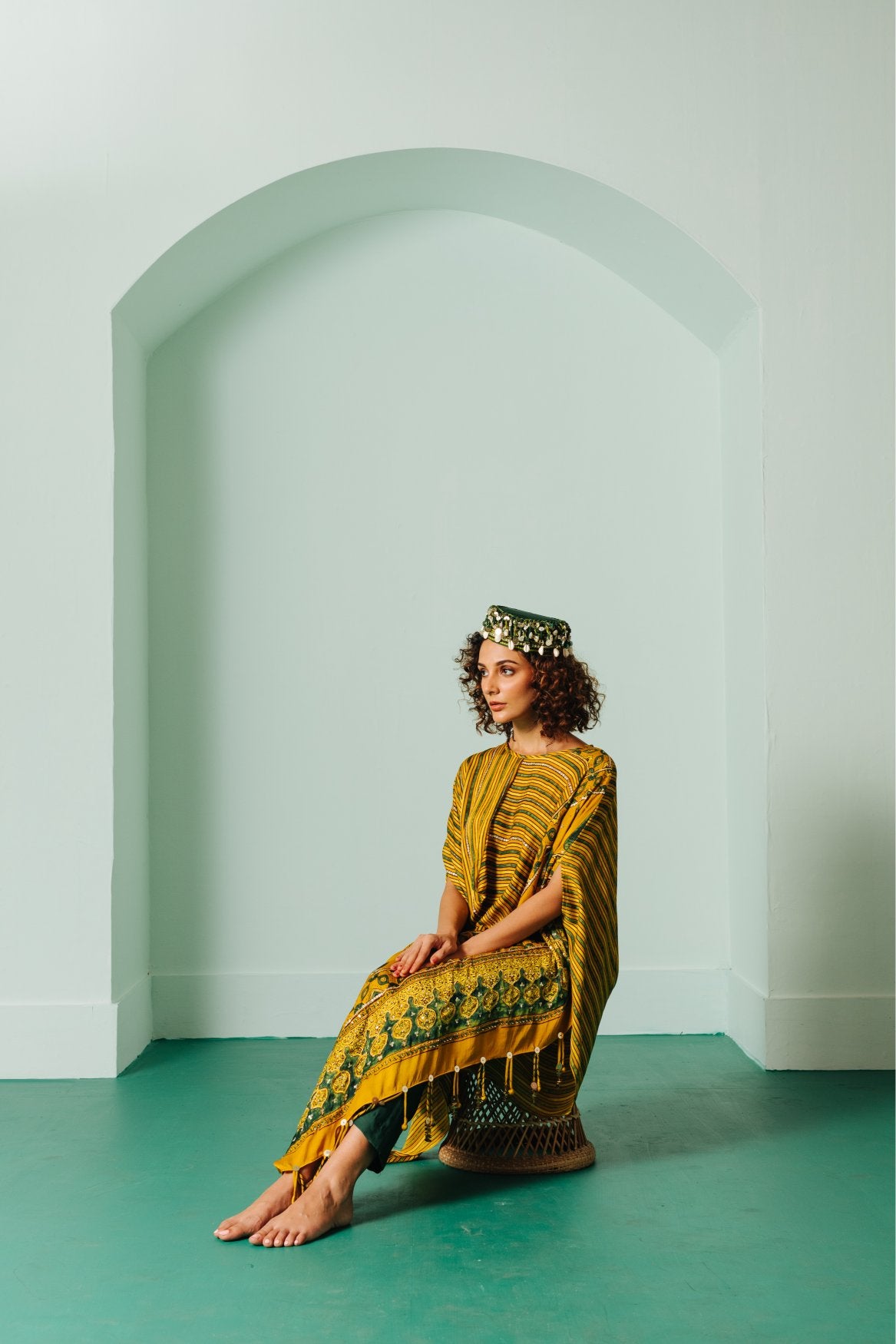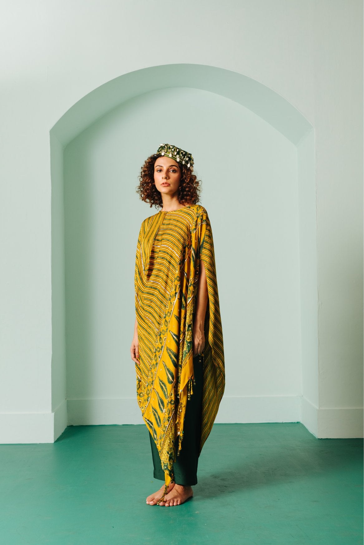 Ajrakh hand-embroidered Asymmetric Kaftaan with Pants