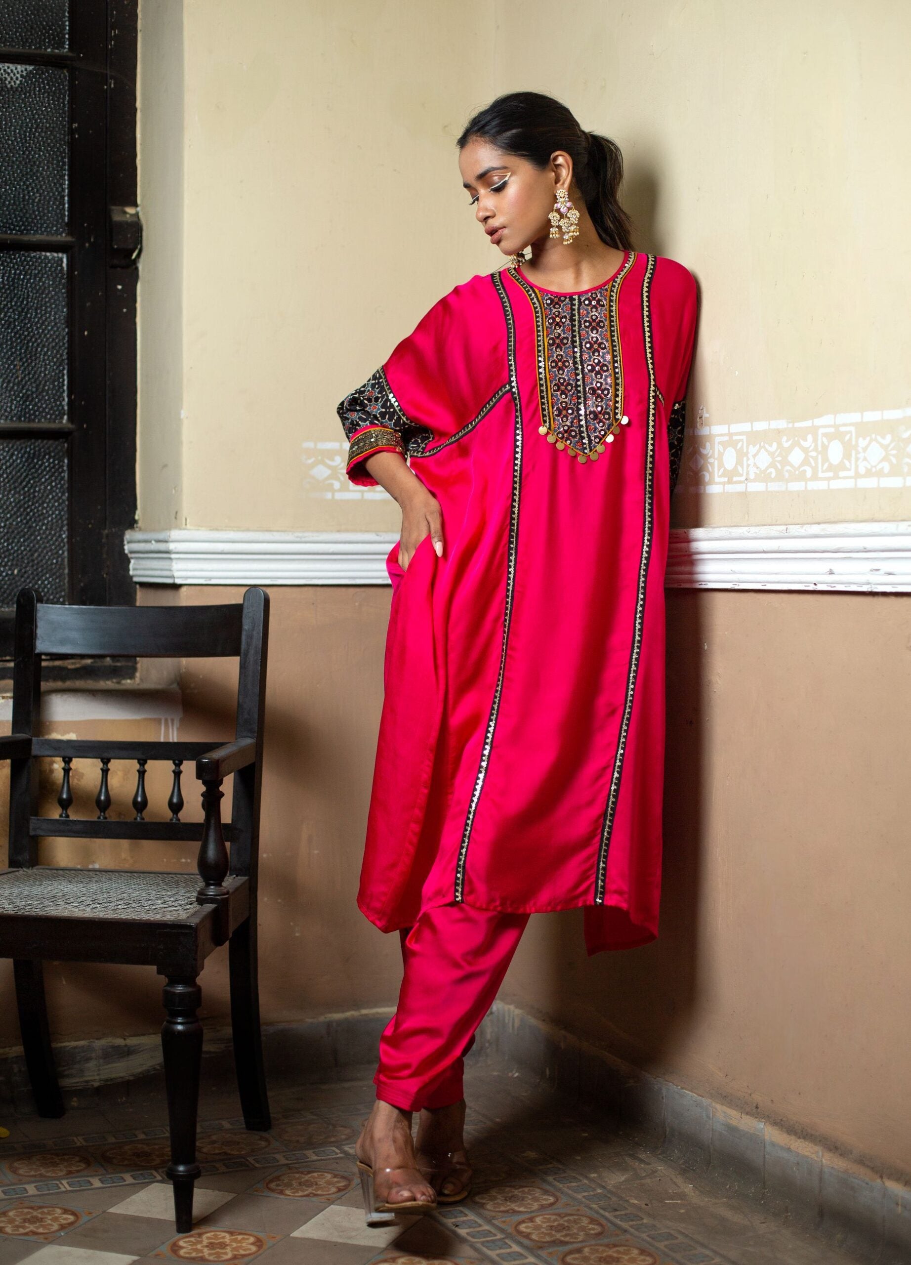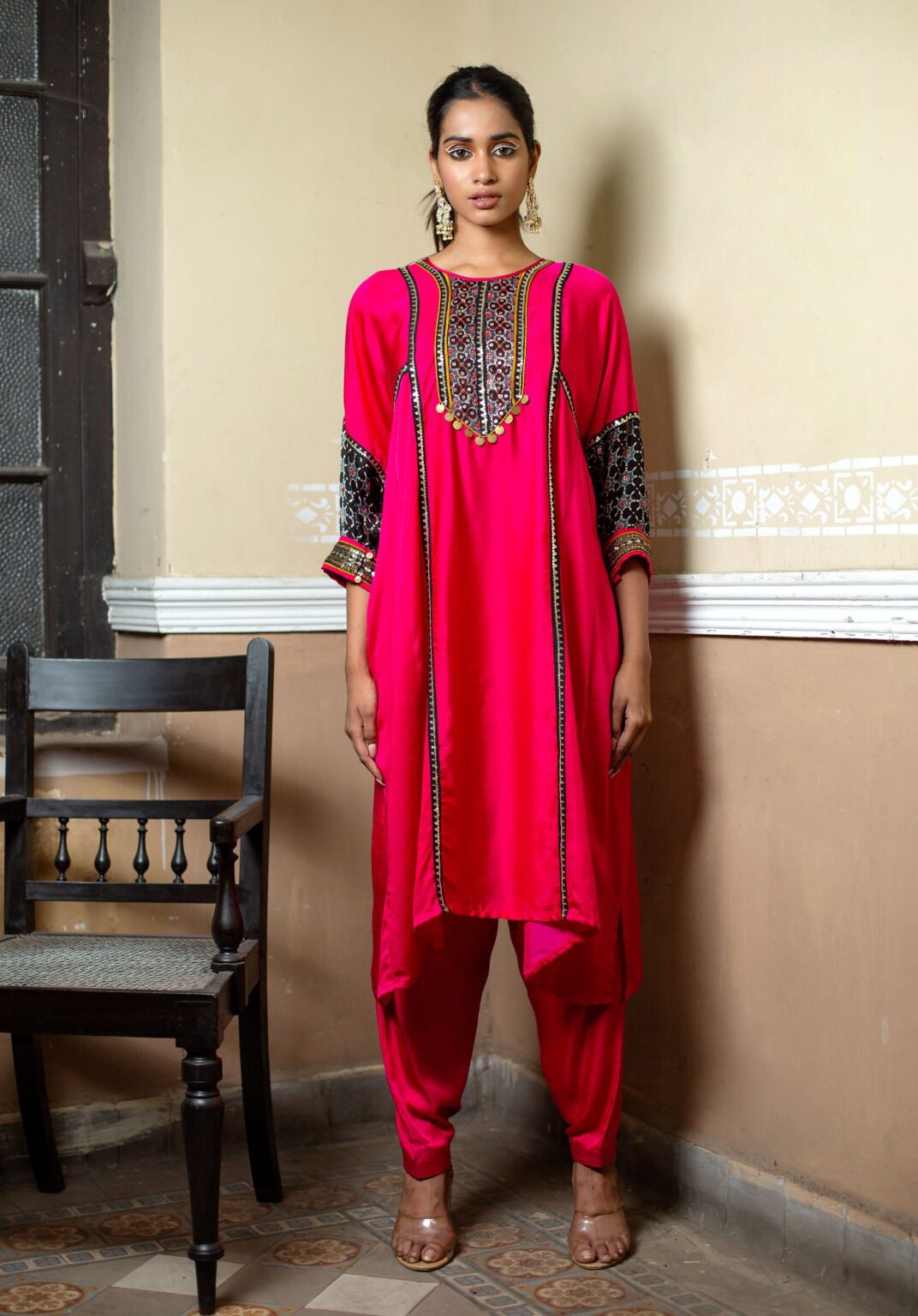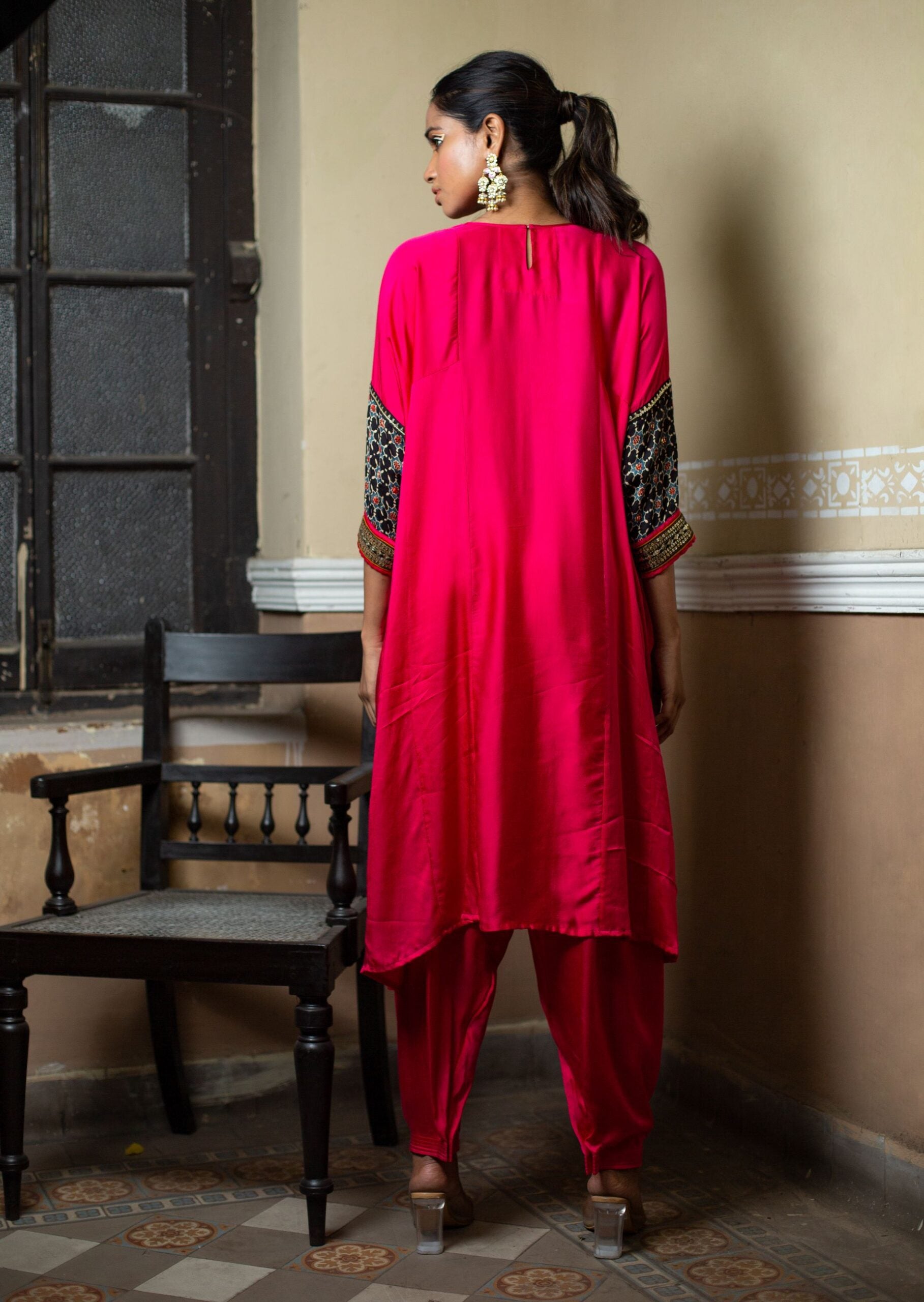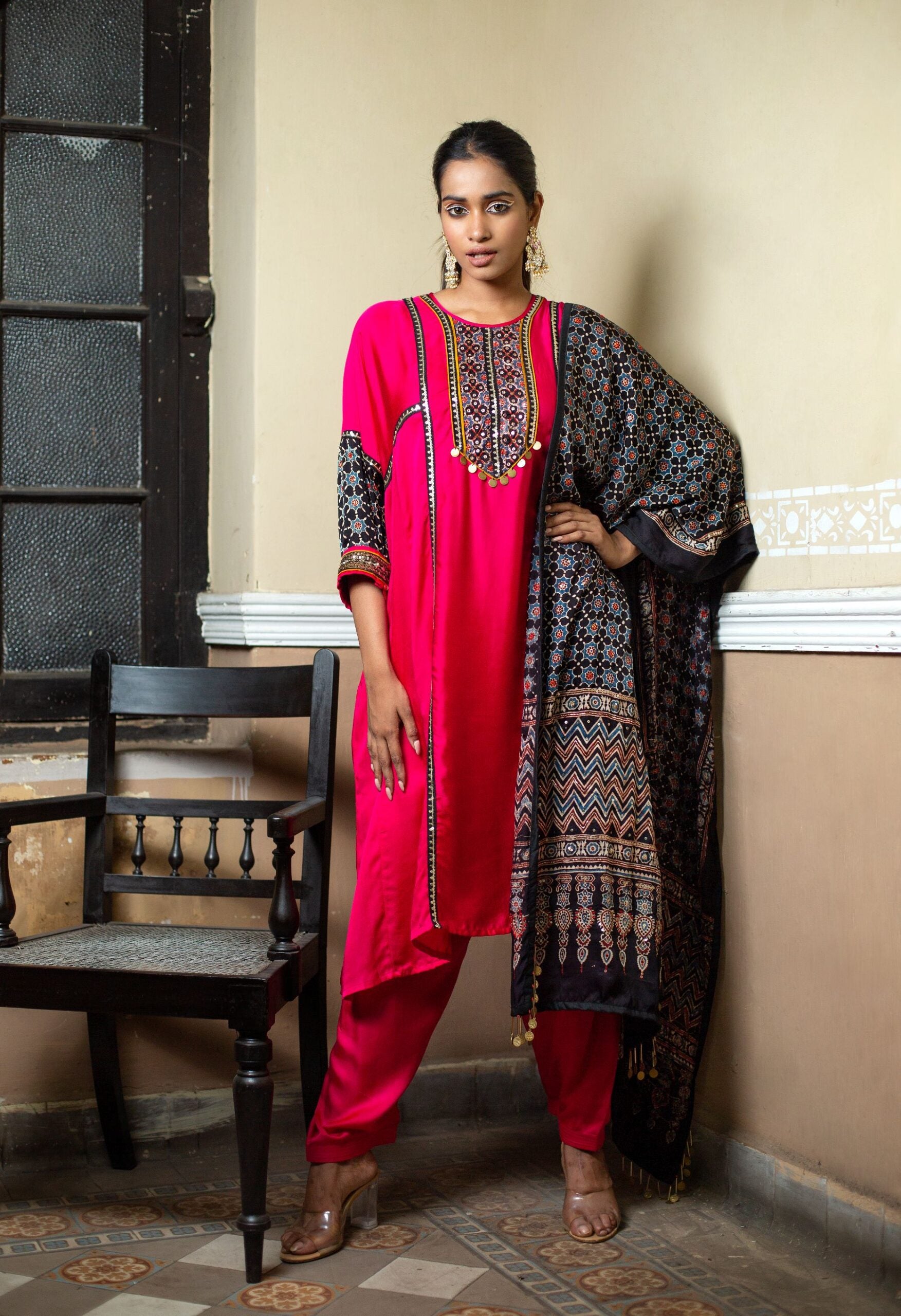 Introducing our Bright Pink Choga-Style Relaxed-Fit Kurta, adorned with a hand-embroidered Ajrak patch in gold sequin and Zari thread. This vibrant ethnic outfit is completed with a hand-embroidered dupatta made from hand-blocked Ajrak satin, paired with a classic salwar.