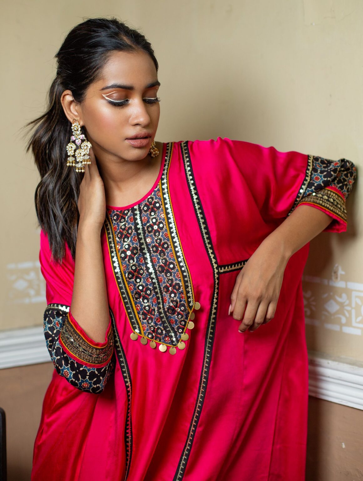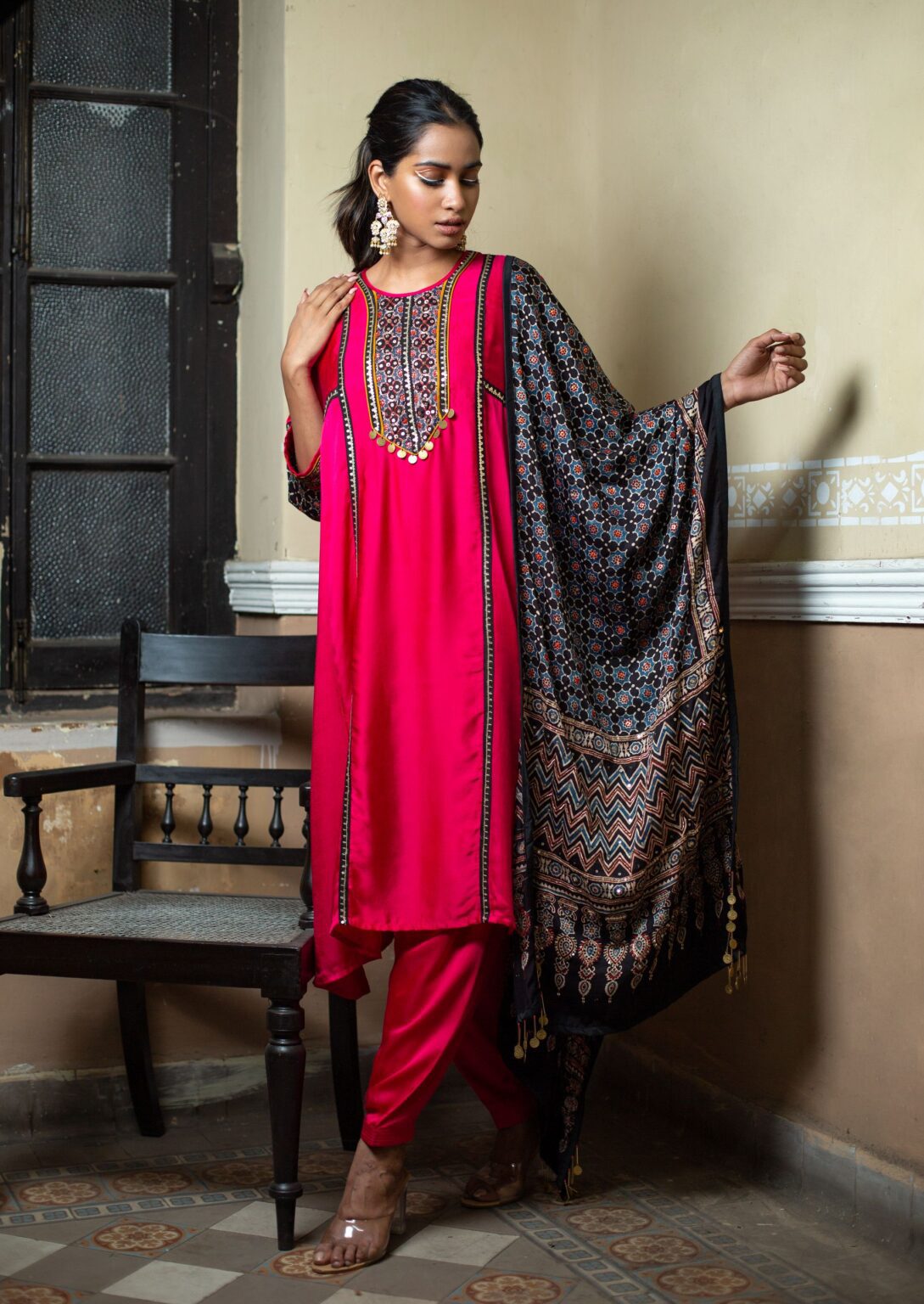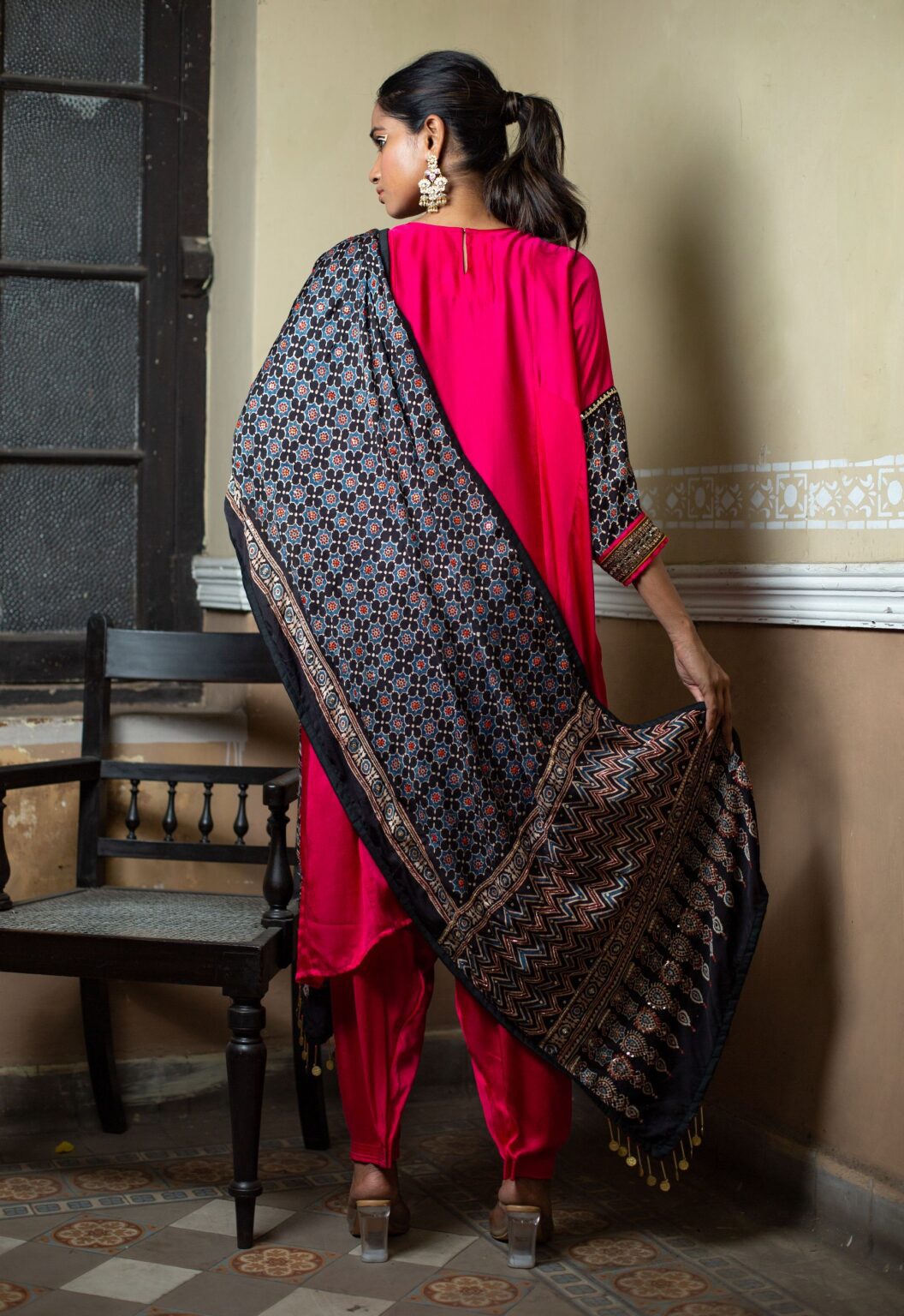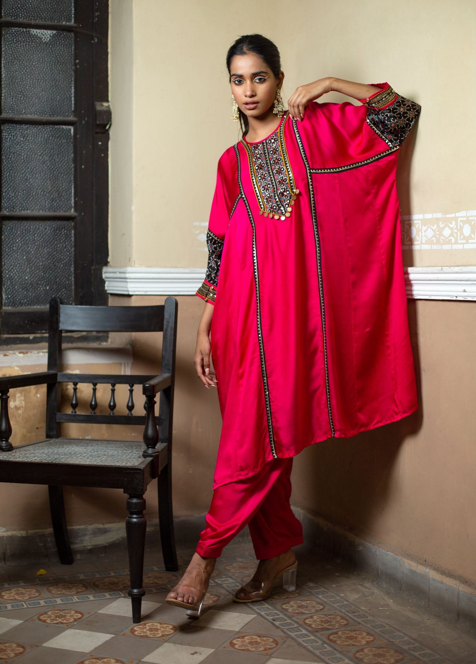 Introducing our Bright Pink Choga-Style Relaxed-Fit Kurta, adorned with a hand-embroidered Ajrak patch in gold sequin and Zari thread. This vibrant ethnic outfit is completed with a hand-embroidered dupatta made from hand-blocked Ajrak satin, paired with a classic salwar.