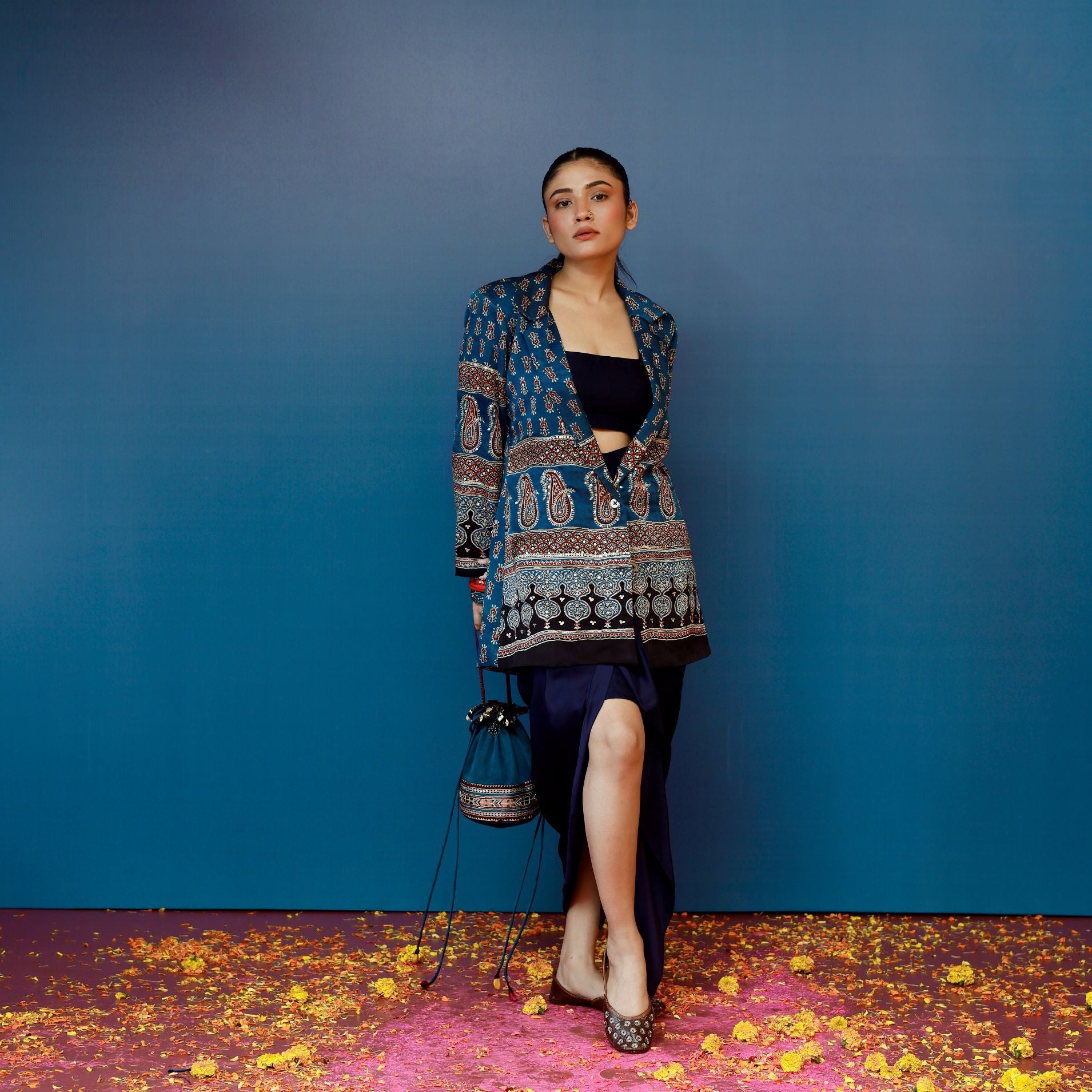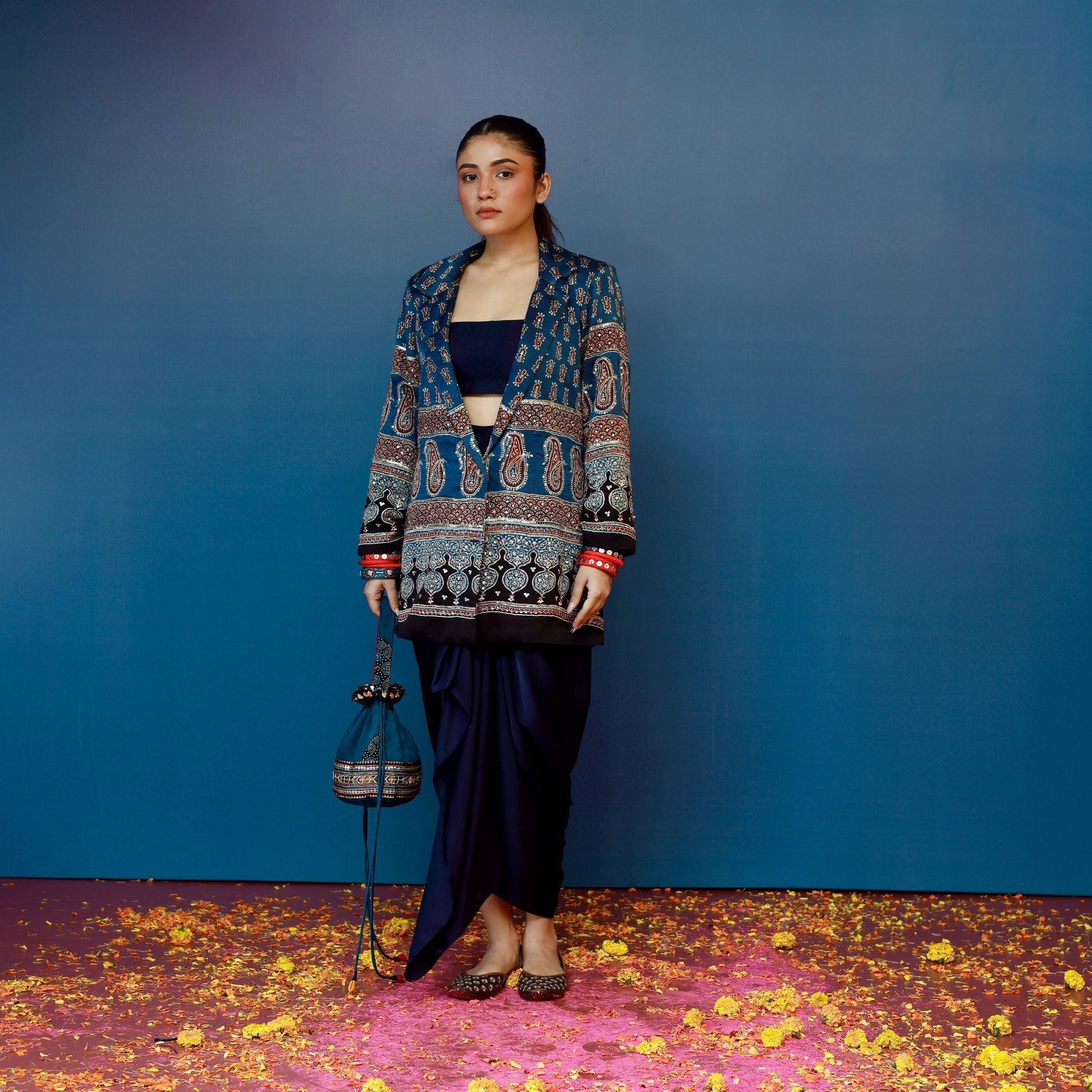 This stunning Ajrakh hand-embroidered jacket, paired with a satin blouse and skirt, is the ultimate Indo-western fusion ensemble. The jacket’s intricate Ajrakh embroidery enhances the luxurious satin fabric, ideal for festive occasions, weddings, or formal gatherings. This outfit offers versatility and style for all your Indo-western fashion needs.