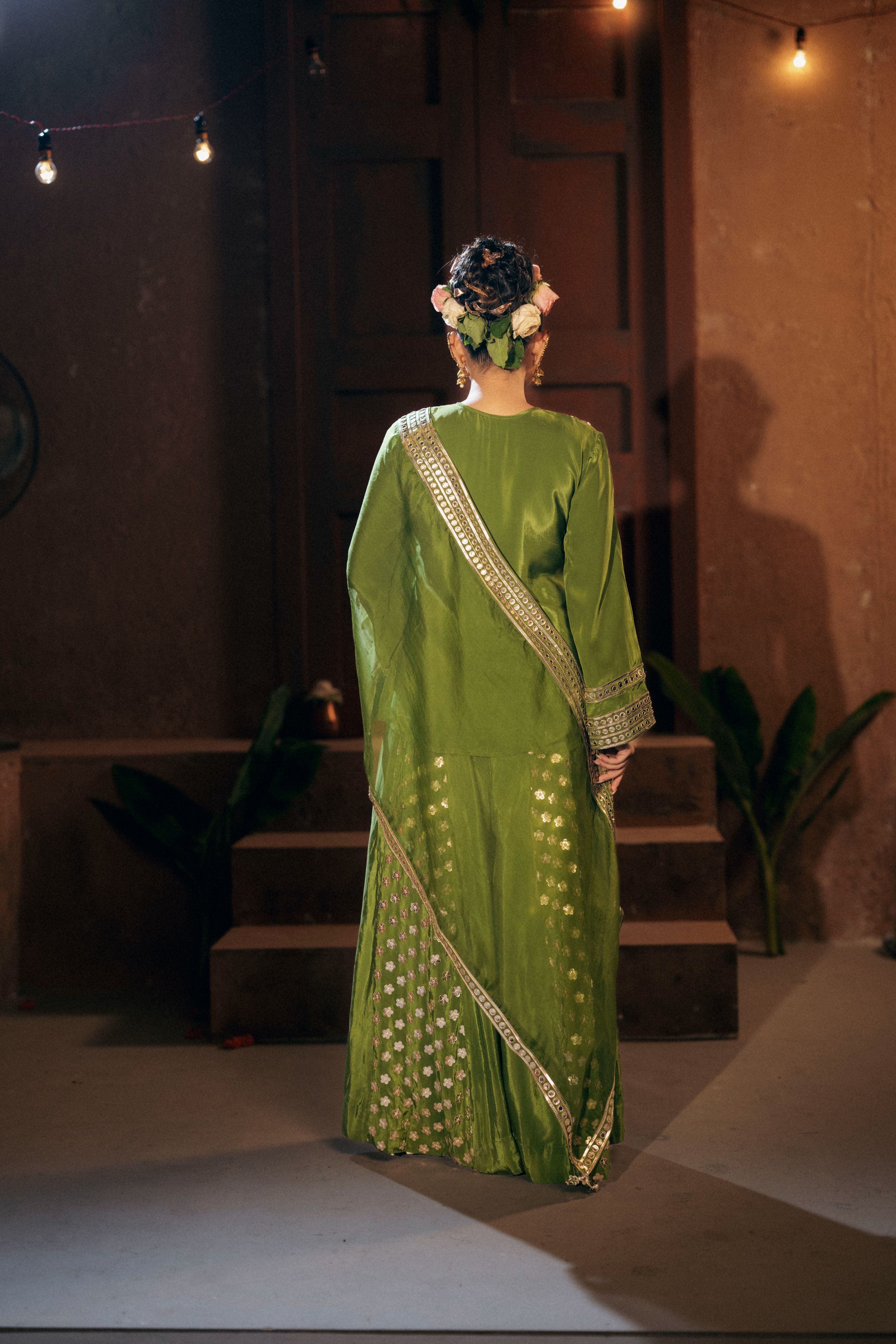 Sunira Green Toga Drape Dress with Tunic and Dhoti Skirt