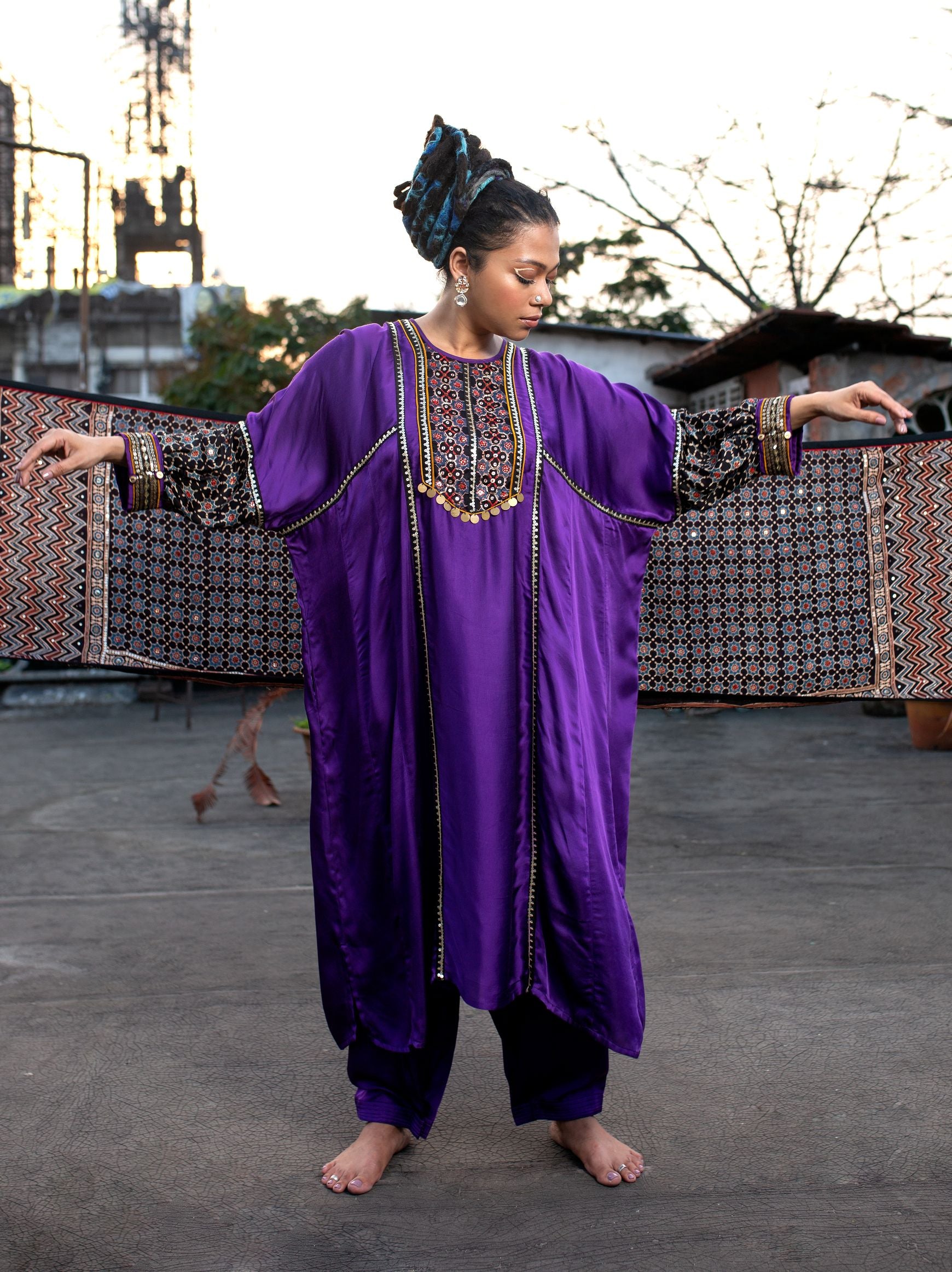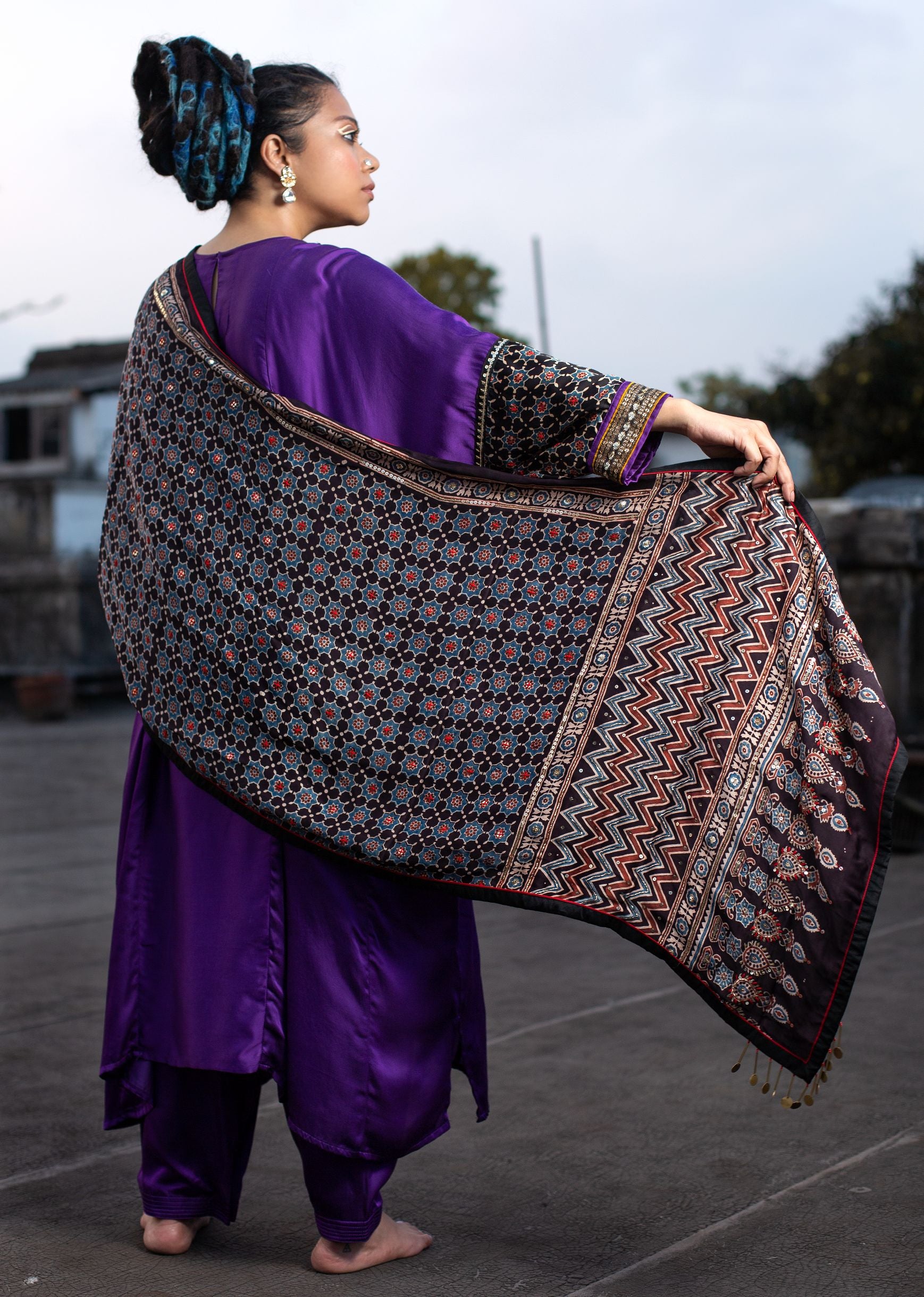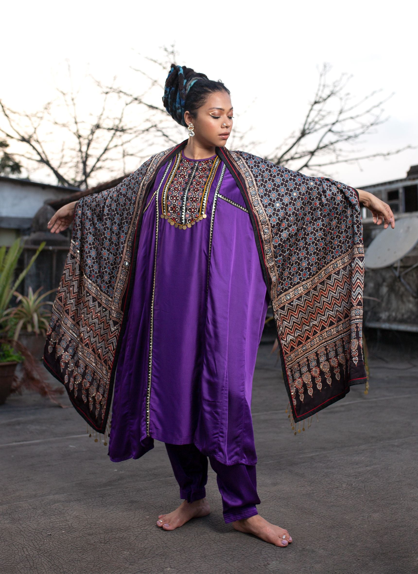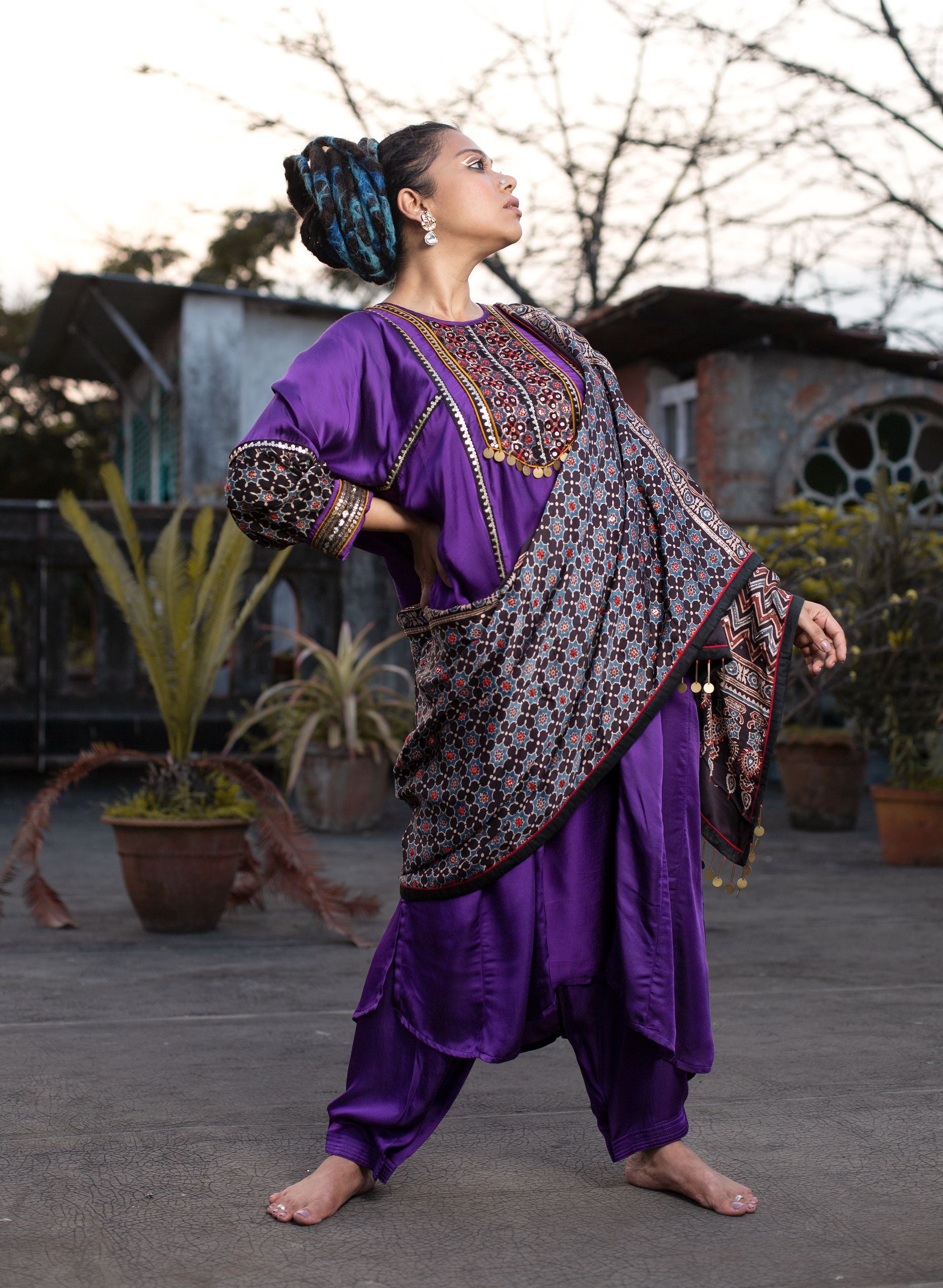 Introducing our Rich Purple  Choga-Style Relaxed-Fit Kurta, adorned with a hand-embroidered Ajrak patch in gold sequin and Zari thread. This vibrant ethnic outfit is completed with a hand-embroidered dupatta made from hand-blocked Ajrak satin, paired with a classic salwar.