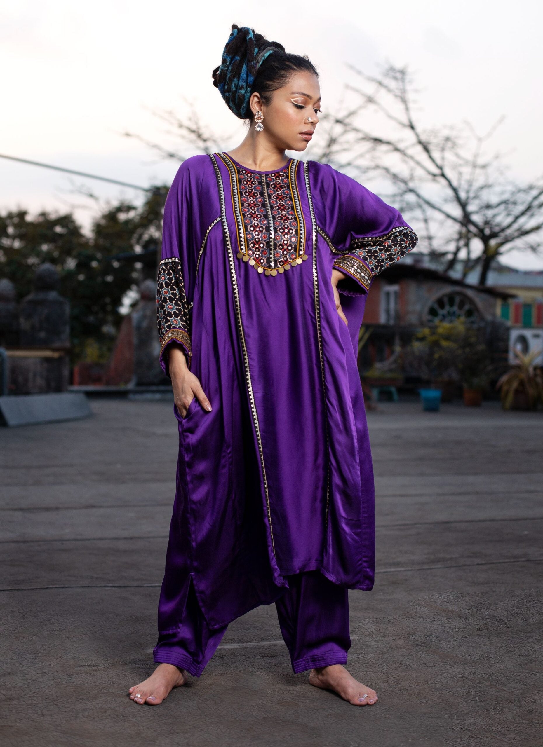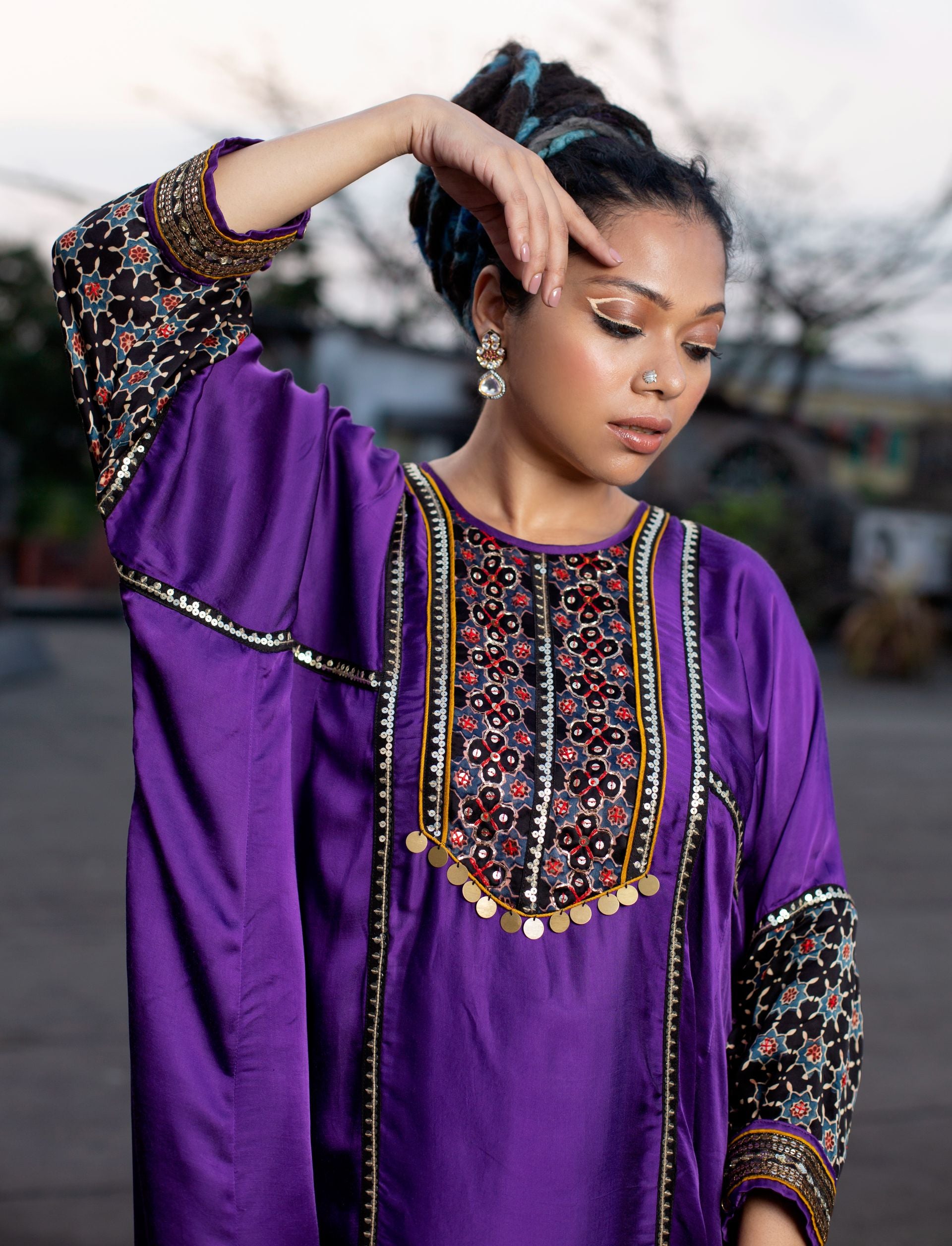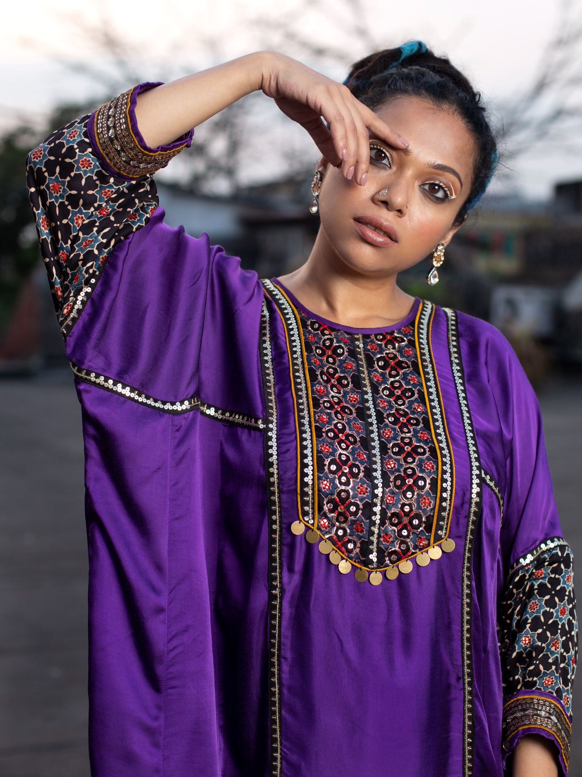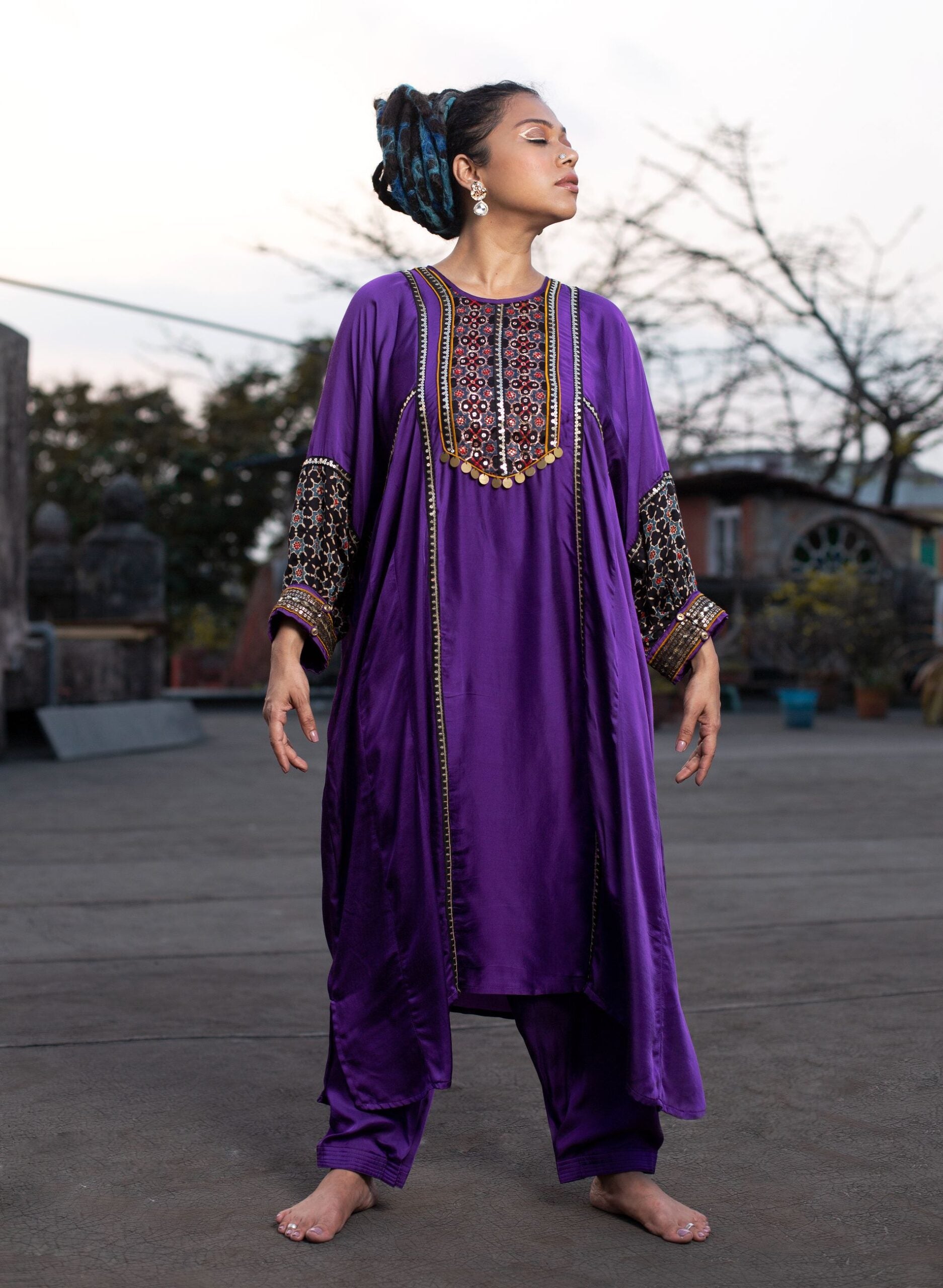 Introducing our Rich Purple  Choga-Style Relaxed-Fit Kurta, adorned with a hand-embroidered Ajrak patch in gold sequin and Zari thread. This vibrant ethnic outfit is completed with a hand-embroidered dupatta made from hand-blocked Ajrak satin, paired with a classic salwar.